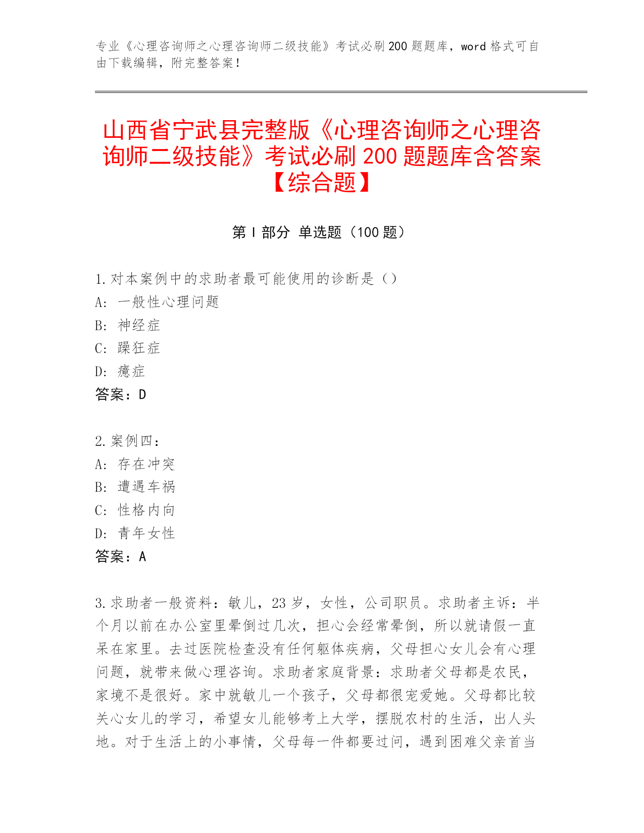 完整版山西省宁武县《心理咨询师之心理咨询师二级技能》考试必刷200题真题题库附答案解析