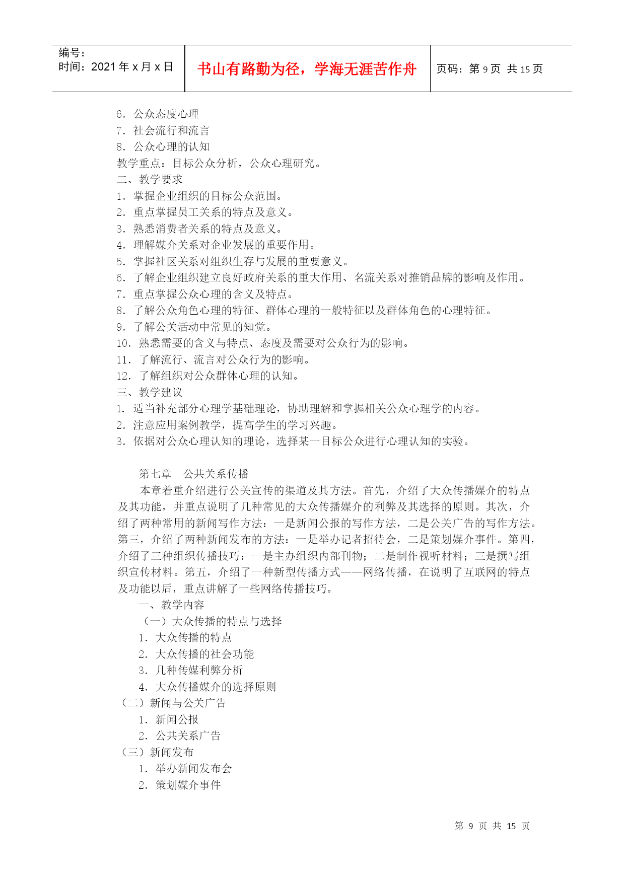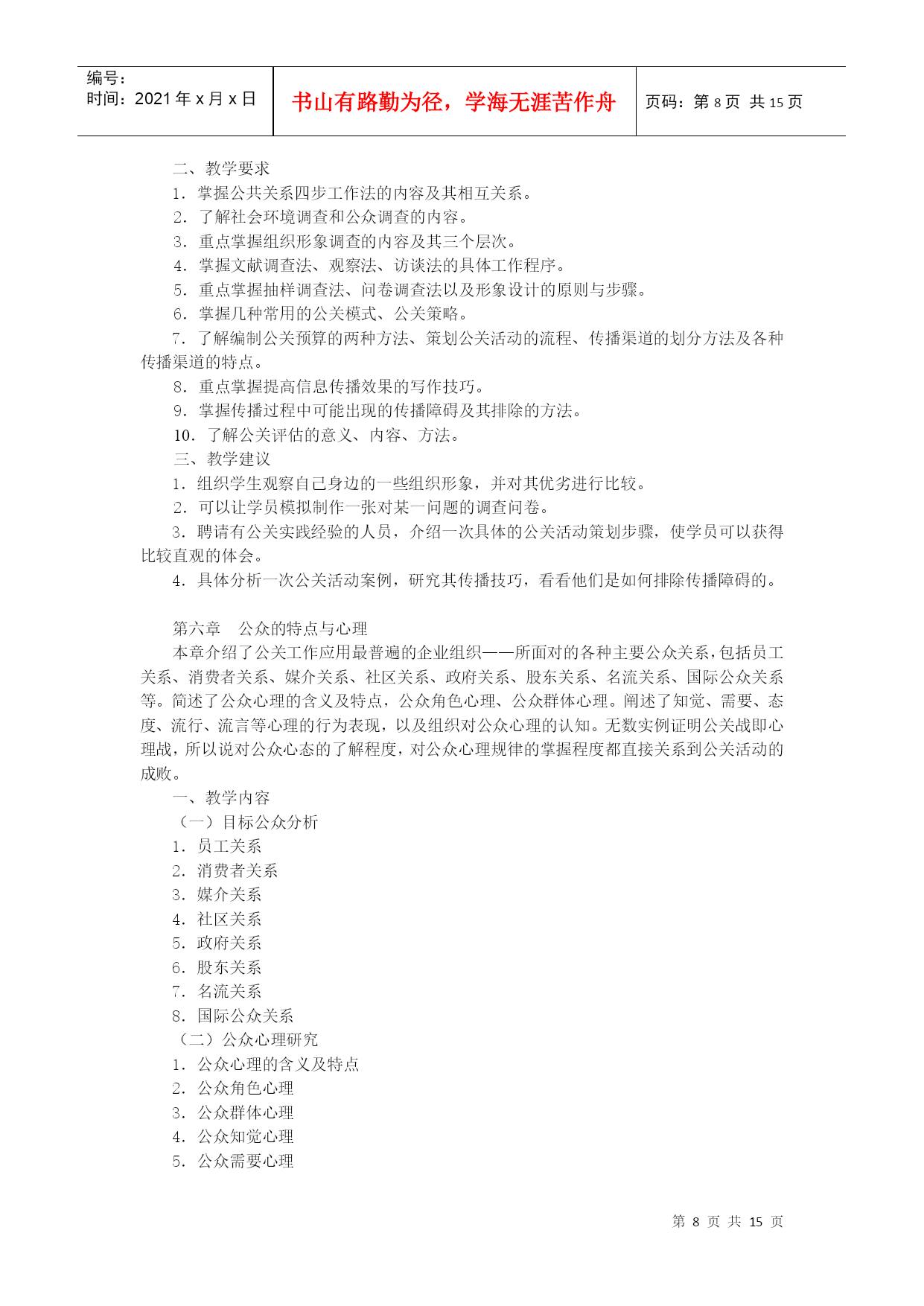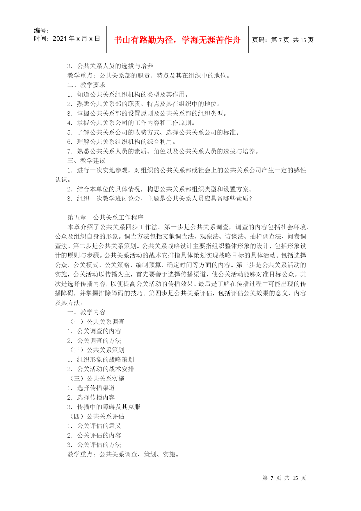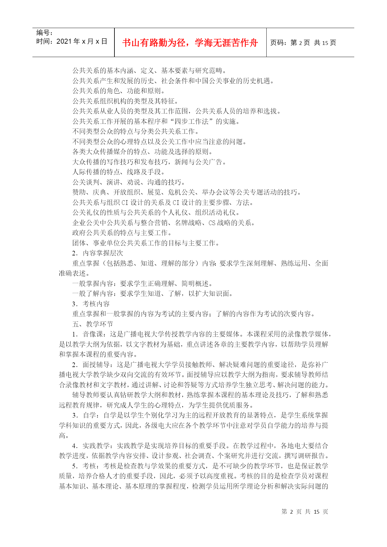 编号:时间:2021年x月x日书山有路勤为径,学海无涯苦作舟页码:第PAGE15页共NUMPAGES15页第PAGE\*MERGEFORMAT15页共NUMPAGES\*MERGEFORMAT15页公共关系学课程教学大纲第一部分大纲说明一、培养目标公共关系学是一门综合性应用科学,学科以建立组织与公众之间良好的沟通关系,在社会上树立组织的良好形象为宗旨。在社会主义市场经济不断发展完善的今天,没有公关意识的企业不是一个好企业,不掌握一定公关知识和技巧的人不是一个好的企业经营者。开设公共关系学的目的就是使学生掌握公共关系的基本理论,熟悉公共关系的主要技巧,成为为社会主义建设事业服务的综合性应用人才。公共关系学是公共关系、工商管理、市场营销、行政管理、公共事业管理(卫生事业)等专业的专业基础必修课程,也是房地产经营管理、国际贸易、计算机应用、乡镇管理、教育管理、新闻传播、广告、秘书等专业的选修课程。二、课程的价值与特点随着社会主义市场经济的发展,公共关系学在市场经济中的作用越来越受到企业界的重视,没有公共关系能力的企业,不可能赢得社会公众的信赖而取得市场竞争的主动权。同时,由于改革的全面深化,公共关系学在理论上的指导原则已经被越来越多的社会组织所接纳。在现代社会中,没有公共关系意识的机构、社团、事业单位不可能成为优秀的组织,政府也不能很好地完成为人民服务的职能。公共关系学在现代社会发展中承担着推动社会进步,完善各类社会组织,为物质文明、精神文明和政治文明建设服务的历史重任。公共关系学这门课程的主要特点是:1.学科新、发展快。公共关系学产生于20世纪20年代的美国,80年代初才传入我国。公共关系学的理论与实践,在世界各国都有不同程度的发展。应该说这是一门比较新的学科,而且还处在不断发展和完善的过程中。2.理论与实践紧密结合。公共关系学有自己独立的学科体系,有自己现实的操作价值。公共关系理论用于指导公共关系实践,并在实践中得到检验、丰富和发展;公共关系实践是在公共关系理论指导下开展的各项公共关系活动,体现了公共关系学的实用性和可操作。3.综合性、多功能融为一体。公共关系学是在众多相关学科的基础之上丰富、发展起来的一门科学。它的主要相关基础学科有:市场营销学、企业管理学、企业文化学、大众传播学、新闻学、广告学、消费心理学等等。同时它所应用的操作方法也广泛而多样。公共关系学作为综合性的应用科学,发挥着多种社会功能。因此,研究公共关系学必须坚持理论和实践相结合的原则,正确认识公共关系学与市场经济的关系,与其它相关科学之间的关系,树立公共关系为市场经济服务、为社会发展服务的观念,以掌握通过公共关系为社会实践服务的本领。三、公共关系与相关课程的关系1.公共关系学与企业管理学、市场营销学、组织行为学、企业文化学、大众传播学、新闻学、广告学、消费心理学等学科联系密切,并应在以上必要课程开设的基础之上来安排公共关系学课程的讲授。2.公共关系学课程的延伸课程主要有:公共关系实务、公共关系礼仪、公共关系写作、公共关系策划、公众心理、CIS战略等课程,如果条件成熟,还应将这些课程作为相关专业的选修课程。四、公共关系学教学要求1.通过公共关系学课程的学习,要求学员掌握以下内容:公共关系的基本内涵、定义、基本要素与研究范畴。公共关系产生和发展的历史、社会条件和中国公关事业的历史机遇。公共关系的角色、功能和原则。公共关系组织机构的类型及其特征。公共关系从业人员的类型及其工作范围,公共关系人员的培养和选拔。公共关系工作开展的基本程序和“四步工作法”的实施。不同类型公众的特点与分类公共关系工作。不同类型公众的心理特点以及公关工作中应当注意的问题。各类大众传播媒介的特点、功能及选择的原则。大众传播的写作技巧和发布技巧,新闻与公关广告。人际传播的特点、线路及手段。公关谈判、演讲、劝说、沟通的技巧。赞助、庆典、开放组织、展览、危机公关、举办会议等公关专题活动的技巧。公共关系与组织CI设计的关系及CI设计的主要步骤、方法。公关礼仪的性质与公共关系的个人礼仪、组织活动礼仪。企业公关中公共关系与整合营销、名牌战略、CS战略的关系。政府公共关系的特点与主要工作。团体、事业单位公共关系工作的目标与主要工作。2.内容掌握层次重点掌握(包括熟悉、知道、理解的部分)内容:要求学生深刻理解、熟练运用、全面准确表述。一般掌握内容:要求学生正确理解、简明概述。一般了解内容:要求学生知道、了解,以扩大知识面。3.考核内容重点掌握和一般掌握的内容为考试的主要内容;了解的内容作为考试的次要内容。五、教学环节1.音像课:这是广播电视大学传授教学内容的主要媒体。本课程采用的录像教学媒体,是
