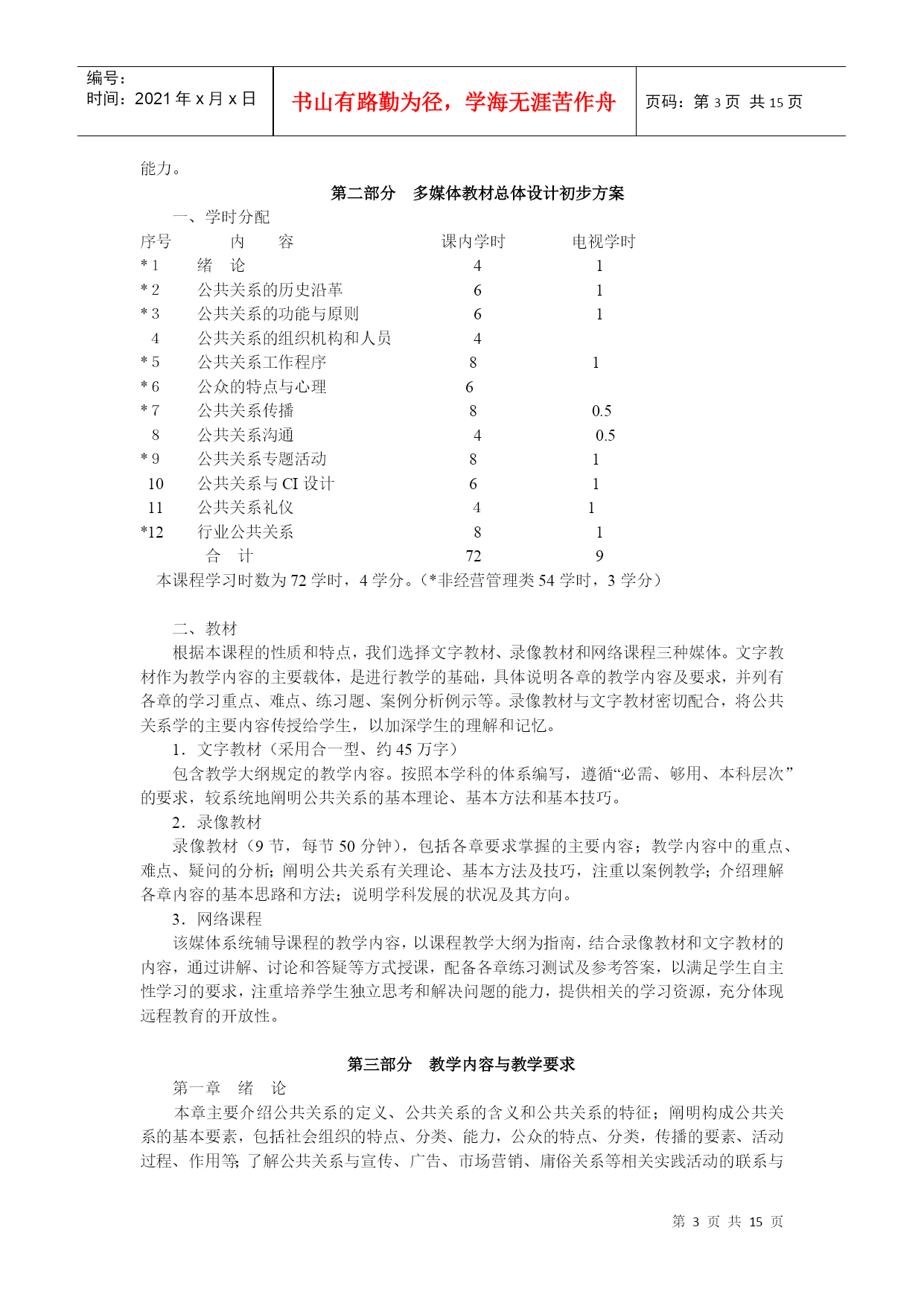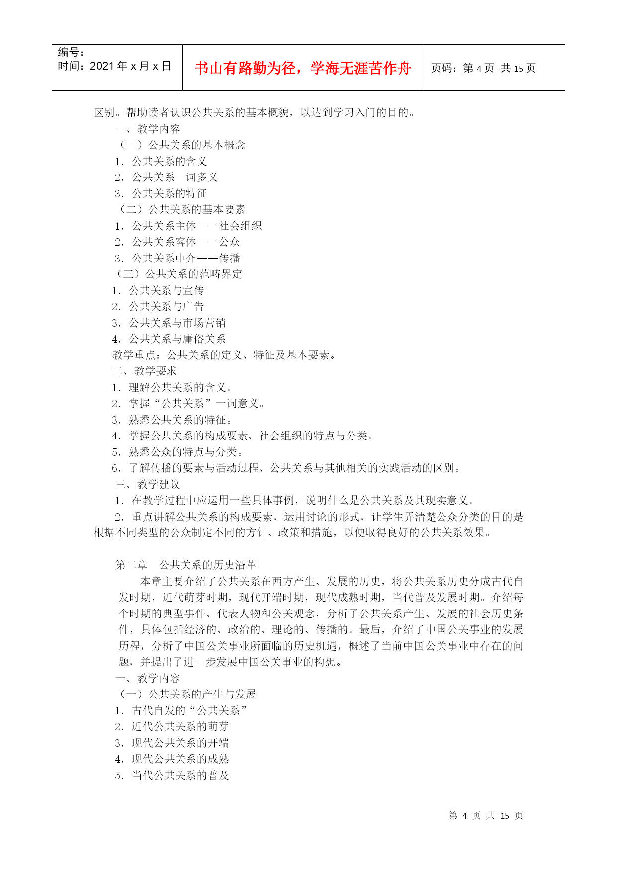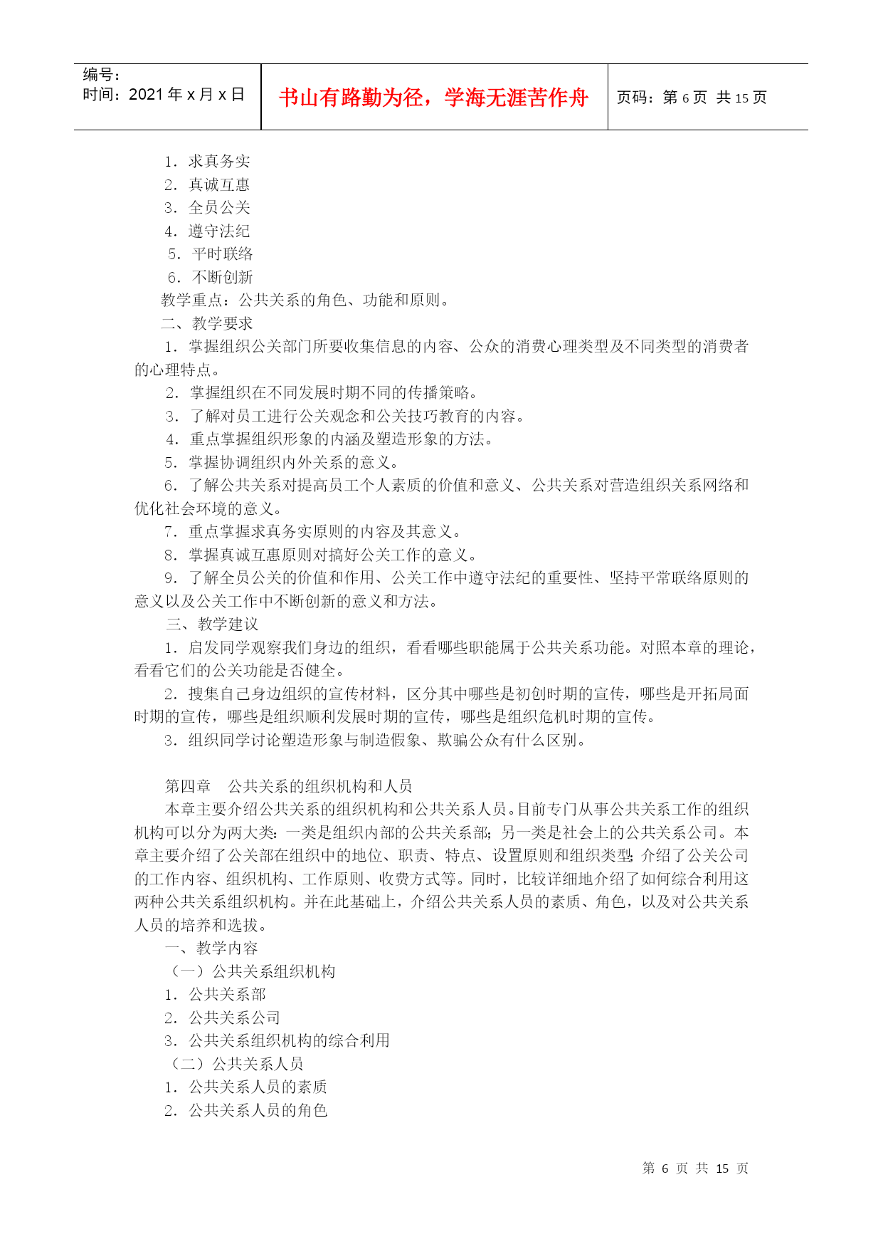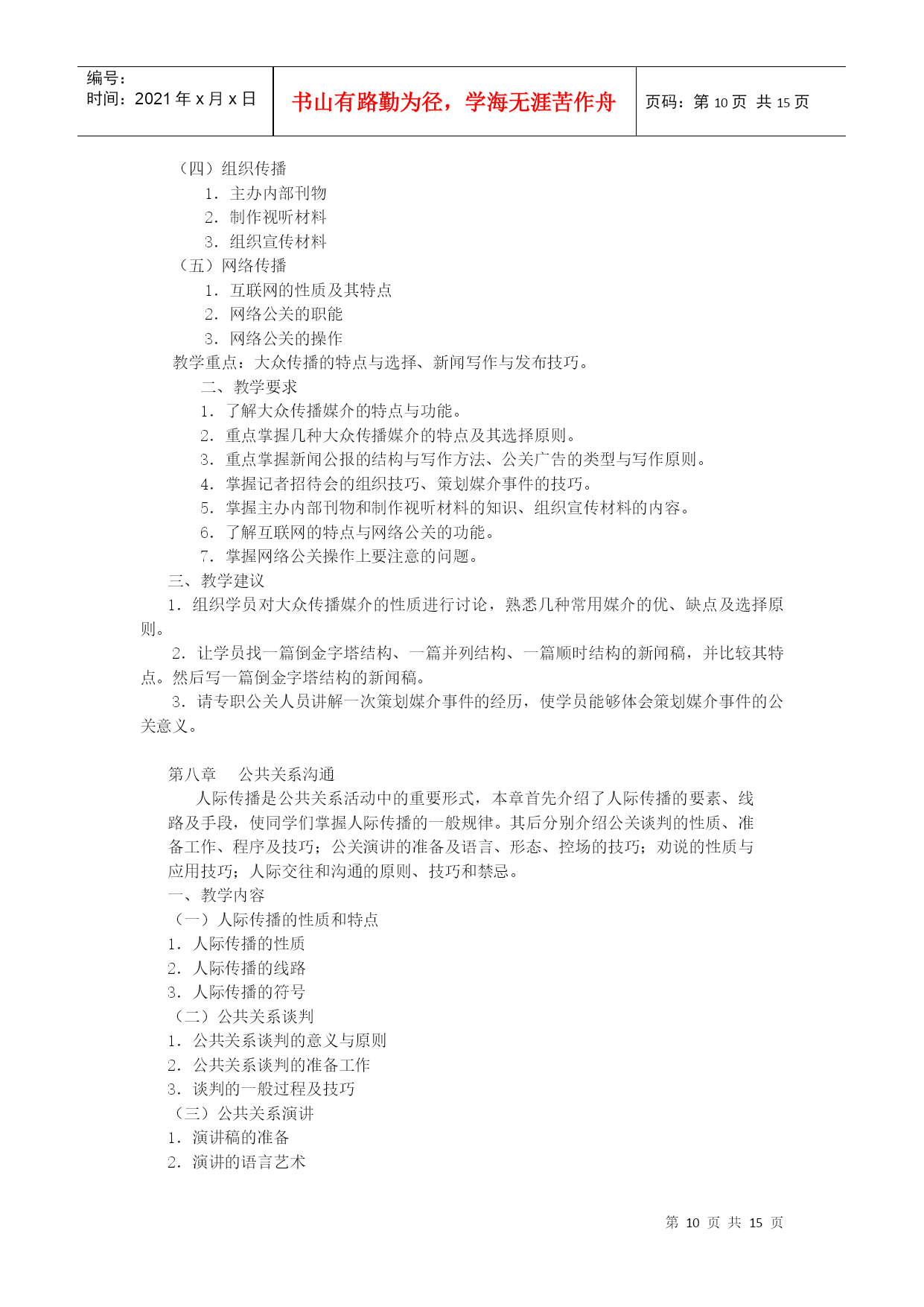编号:时间:2021年x月x日书山有路勤为径,学海无涯苦作舟页码:第PAGE15页共NUMPAGES15页第PAGE\*MERGEFORMAT15页共NUMPAGES\*MERGEFORMAT15页公共关系学课程教学大纲第一部分大纲说明一、培养目标公共关系学是一门综合性应用科学,学科以建立组织与公众之间良好的沟通关系,在社会上树立组织的良好形象为宗旨。在社会主义市场经济不断发展完善的今天,没有公关意识的企业不是一个好企业,不掌握一定公关知识和技巧的人不是一个好的企业经营者。开设公共关系学的目的就是使学生掌握公共关系的基本理论,熟悉公共关系的主要技巧,成为为社会主义建设事业服务的综合性应用人才。公共关系学是公共关系、工商管理、市场营销、行政管理、公共事业管理(卫生事业)等专业的专业基础必修课程,也是房地产经营管理、国际贸易、计算机应用、乡镇管理、教育管理、新闻传播、广告、秘书等专业的选修课程。二、课程的价值与特点随着社会主义市场经济的发展,公共关系学在市场经济中的作用越来越受到企业界的重视,没有公共关系能力的企业,不可能赢得社会公众的信赖而取得市场竞争的主动权。同时,由于改革的全面深化,公共关系学在理论上的指导原则已经被越来越多的社会组织所接纳。在现代社会中,没有公共关系意识的机构、社团、事业单位不可能成为优秀的组织,政府也不能很好地完成为人民服务的职能。公共关系学在现代社会发展中承担着推动社会进步,完善各类社会组织,为物质文明、精神文明和政治文明建设服务的历史重任。公共关系学这门课程的主要特点是:1.学科新、发展快。公共关系学产生于20世纪20年代的美国,80年代初才传入我国。公共关系学的理论与实践,在世界各国都有不同程度的发展。应该说这是一门比较新的学科,而且还处在不断发展和完善的过程中。2.理论与实践紧密结合。公共关系学有自己独立的学科体系,有自己现实的操作价值。公共关系理论用于指导公共关系实践,并在实践中得到检验、丰富和发展;公共关系实践是在公共关系理论指导下开展的各项公共关系活动,体现了公共关系学的实用性和可操作。3.综合性、多功能融为一体。公共关系学是在众多相关学科的基础之上丰富、发展起来的一门科学。它的主要相关基础学科有:市场营销学、企业管理学、企业文化学、大众传播学、新闻学、广告学、消费心理学等等。同时它所应用的操作方法也广泛而多样。公共关系学作为综合性的应用科学,发挥着多种社会功能。因此,研究公共关系学必须坚持理论和实践相结合的原则,正确认识公共关系学与市场经济的关系,与其它相关科学之间的关系,树立公共关系为市场经济服务、为社会发展服务的观念,以掌握通过公共关系为社会实践服务的本领。三、公共关系与相关课程的关系1.公共关系学与企业管理学、市场营销学、组织行为学、企业文化学、大众传播学、新闻学、广告学、消费心理学等学科联系密切,并应在以上必要课程开设的基础之上来安排公共关系学课程的讲授。2.公共关系学课程的延伸课程主要有:公共关系实务、公共关系礼仪、公共关系写作、公共关系策划、公众心理、CIS战略等课程,如果条件成熟,还应将这些课程作为相关专业的选修课程。四、公共关系学教学要求1.通过公共关系学课程的学习,要求学员掌握以下内容:公共关系的基本内涵、定义、基本要素与研究范畴。公共关系产生和发展的历史、社会条件和中国公关事业的历史机遇。公共关系的角色、功能和原则。公共关系组织机构的类型及其特征。公共关系从业人员的类型及其工作范围,公共关系人员的培养和选拔。公共关系工作开展的基本程序和“四步工作法”的实施。不同类型公众的特点与分类公共关系工作。不同类型公众的心理特点以及公关工作中应当注意的问题。各类大众传播媒介的特点、功能及选择的原则。大众传播的写作技巧和发布技巧,新闻与公关广告。人际传播的特点、线路及手段。公关谈判、演讲、劝说、沟通的技巧。赞助、庆典、开放组织、展览、危机公关、举办会议等公关专题活动的技巧。公共关系与组织CI设计的关系及CI设计的主要步骤、方法。公关礼仪的性质与公共关系的个人礼仪、组织活动礼仪。企业公关中公共关系与整合营销、名牌战略、CS战略的关系。政府公共关系的特点与主要工作。团体、事业单位公共关系工作的目标与主要工作。2.内容掌握层次重点掌握(包括熟悉、知道、理解的部分)内容:要求学生深刻理解、熟练运用、全面准确表述。一般掌握内容:要求学生正确理解、简明概述。一般了解内容:要求学生知道、了解,以扩大知识面。3.考核内容重点掌握和一般掌握的内容为考试的主要内容;了解的内容作为考试的次要内容。五、教学环节1.音像课:这是广播电视大学传授教学内容的主要媒体。本课程采用的录像教学媒体,是