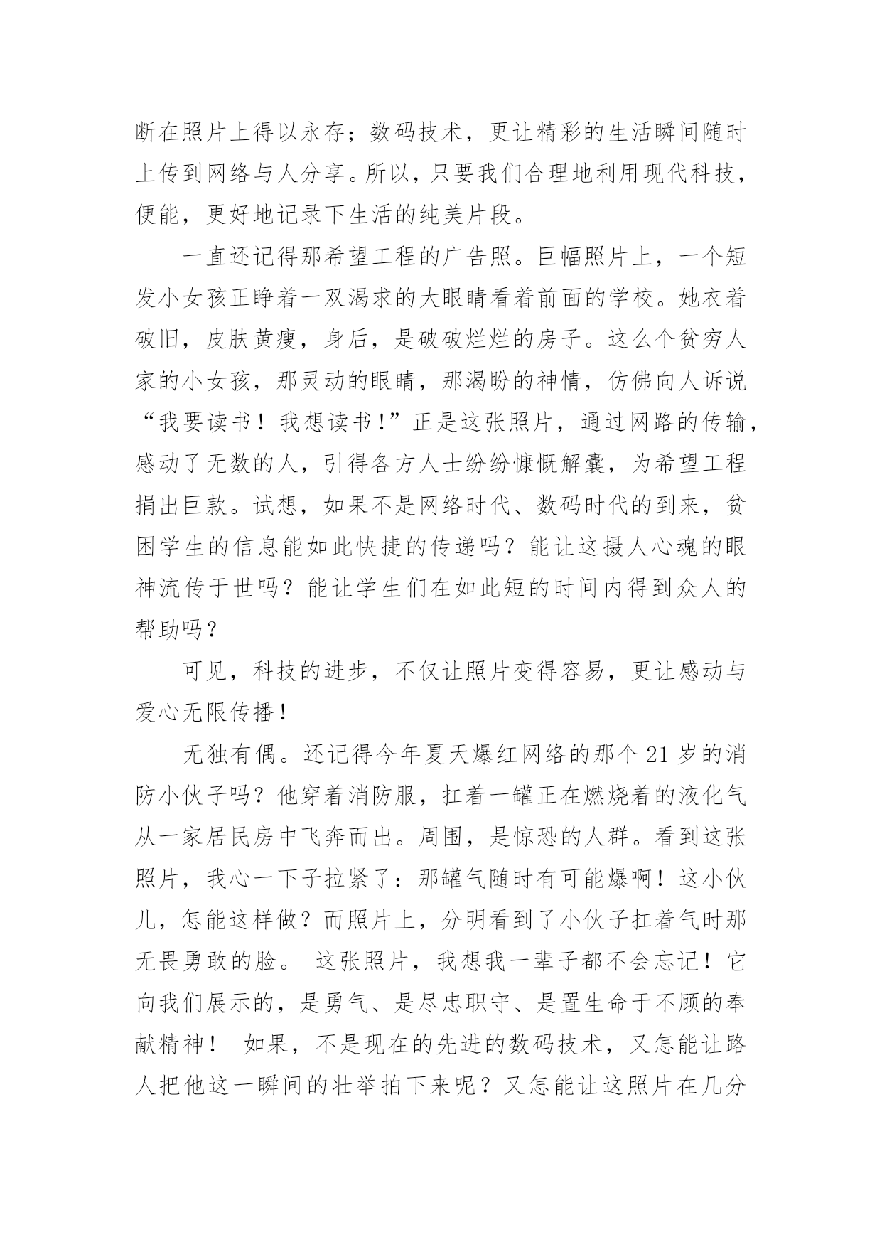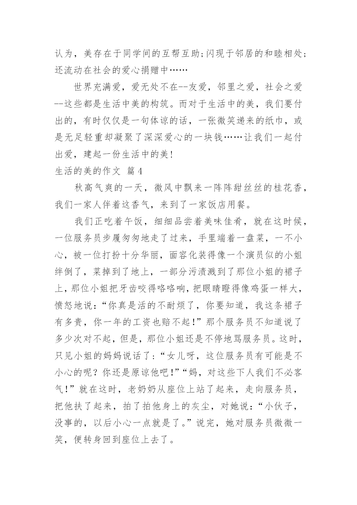 生活的美的作文【精华】生活的美的作文4篇无论是在学校还是在社会中,大家对作文都不陌生吧,借助作文人们可以实现文化交流的目的。作文的注意事项有许多,你确定会写吗?以下是小编为大家收集的生活的美的作文4篇,欢迎大家借鉴与参考,希望对大家有所帮助。生活的美的作文篇1黑白胶片的时代,照片很少,只记录下人生的几个瞬间,在家人一次次的翻看中,它能唤起许多永不褪色的记忆。但照片渐渐泛黄,日益模糊。数码技术的时代,照片很多,记录着日常生活的点点滴滴,可以随时上传到网络与人分享。它从不泛黄,永不模糊,但在快速浏览与频繁更新中,值得珍惜的“点滴”也可能被稀释。科技,留住生活的纯美材料中说:“数码技术的时代,照片很多,可以随时上传到网络与人分享。但在快速浏览与频繁更新中,值得珍惜的“点滴”也可能被稀释。”这话是在说,随着科技的发展,照片的随手可拍,但其中的珍贵与回味正慢慢消失。这句话说得有道理,但反过来想,科技时代,只要好好利用数码技术,何尝不能更好更多地记下生活中值得珍惜的点滴?科技进步,让照片不再泛黄模糊;数码技术,让生活片断在照片上得以永存;数码技术,更让精彩的生活瞬间随时上传到网络与人分享。所以,只要我们合理地利用现代科技,便能,更好地记录下生活的纯美片段。一直还记得那希望工程的广告照。巨幅照片上,一个短发小女孩正睁着一双渴求的大眼睛看着前面的学校。她衣着破旧,皮肤黄瘦,身后,是破破烂烂的房子。这么个贫穷人家的小女孩,那灵动的眼睛,那渴盼的神情,仿佛向人诉说“我要读书!我想读书!”正是这张照片,通过网路的传输,感动了无数的人,引得各方人士纷纷慷慨解囊,为希望工程捐出巨款。试想,如果不是网络时代、数码时代的到来,贫困学生的信息能如此快捷的传递吗?能让这摄人心魂的眼神流传于世吗?能让学生们在如此短的时间内得到众人的帮助吗?可见,科技的进步,不仅让照片变得容易,更让感动与爱心无限传播!无独有偶。还记得今年夏天爆红网络的那个21岁的消防小伙子吗?他穿着消防服,扛着一罐正在燃烧着的液化气从一家居民房中飞奔而出。周围,是惊恐的人群。看到这张照片,我心一下子拉紧了:那罐气随时有可能爆啊!这小伙儿,怎能这样做?而照片上,分明看到了小伙子扛着气时那无畏勇敢的脸。这张照片,我想我一辈子都不会忘记!它向我们展示的,是勇气、是尽忠职守、是置生命于不顾的奉献精神!如果,不是现在的先进的数码技术,又怎能让路人把他这一瞬间的壮举拍下来呢?又怎能让这照片在几分钟内就红遍网络,感动国人呢?可见,科技的进步,不仅方便了生活,更即时地记下了生活的纯美片段,发扬了大爱的精神!材料中说,数码技术的时代,照片很多,可以随时上传到网络与人分享。但在快速浏览与频繁更新中,值得珍惜的“点滴”也可能被稀释。是的,我们生活中,的确无所事事的人喜欢在网上发大量的无聊自拍,让照片变得又多又俗,让人反感。但是,我们也不要忘了,正是这些快捷的数码照片,才能即时记录下玉树地震时人们救灾时的众志成城,即时记录下民警斗歹徒的神勇无畏;即时记录下双十一购物狂欢时各色人们的张张笑脸————科技的发展,数码时代的到来,不仅仅是为我们营造了方便的生活环境,更是,为我们记下了一个又一个值得回味的生活片段啊!而我们,作为高中生,数码科技,在我们的生活中,也是利大于弊的!它可以随时拍下我们在教室里挥汗如雨,奋斗拼博场面;可以上传我们在运动会时团结互助,挥汗如雨的场面;可以分享我们学习生活中每一个欢笑快乐的片段;它可以让我们与远方的父母亲人毫无阻挡地联系;更可以让我们把生活中珍贵的片段随时拍下、上传,汇成一本厚厚的青春记录作为珍贵的回忆。有人说“黑白胶片的时代,照片虽少,却能唤起许多永不褪色忆。”但我要说:黑白照片会渐渐泛黄,日益模糊。而数码技术的时代,只要用心记录生活的点滴,同样值得珍惜,值得回味!生活的美的作文篇2美,无处不在。只要你细心观察就可以发现。你看那天上的白云,飞翔的小鸟;你看那绿树和红花;你再看那满含生机的小草。这一切不都是美的象征吗?你看那闪着银光的湖面,长出嫩芽的柳条。古人说得好:“碧玉妆成一树高,万条垂下绿丝绦。”是啊,千条柳,万条柳,条条都垂到了湖面上方。你看那五彩斑斓的彩虹和萤火虫。你再看那绣上星星的'夜空。这景象怎能不叫人着迷?我敬仰“最美乡村教师”和“最美女孩”,也敬佩为救治乡村老农,不惜翻山越岭的“最美医生”,他们的美是心灵的美,美得高尚,美得值得我们学习。你看那优美的诗句和语句;你看那郁郁葱葱的森林;你看那在清澈见底的小溪里自由自在游动的鱼群和虾群……这一切都美得叫人移不开眼球。你看那五颜六色的毛巾;你看那各式各样的衣服和裤子;你看那花花绿绿的被子……这些美都出自于能工巧匠之手。离我最近的美要数我家的两只小鹦鹉了,它们唱起歌来“叽叽喳喳”,背上的羽毛五彩缤纷……美啊!真美!生活中的美无