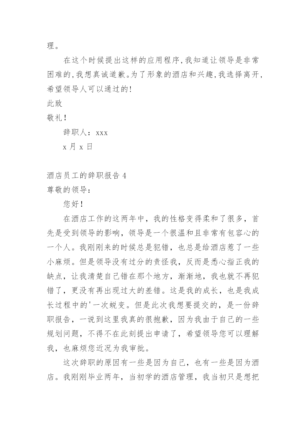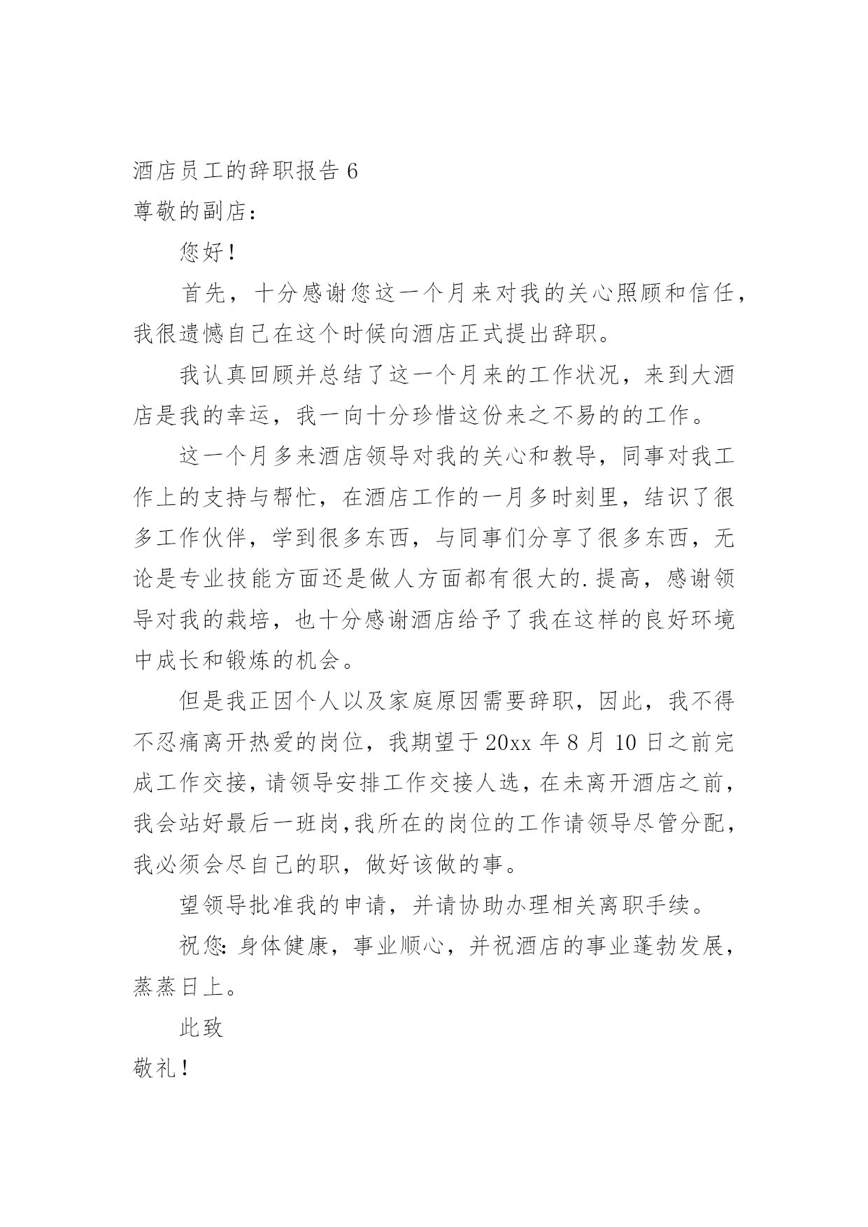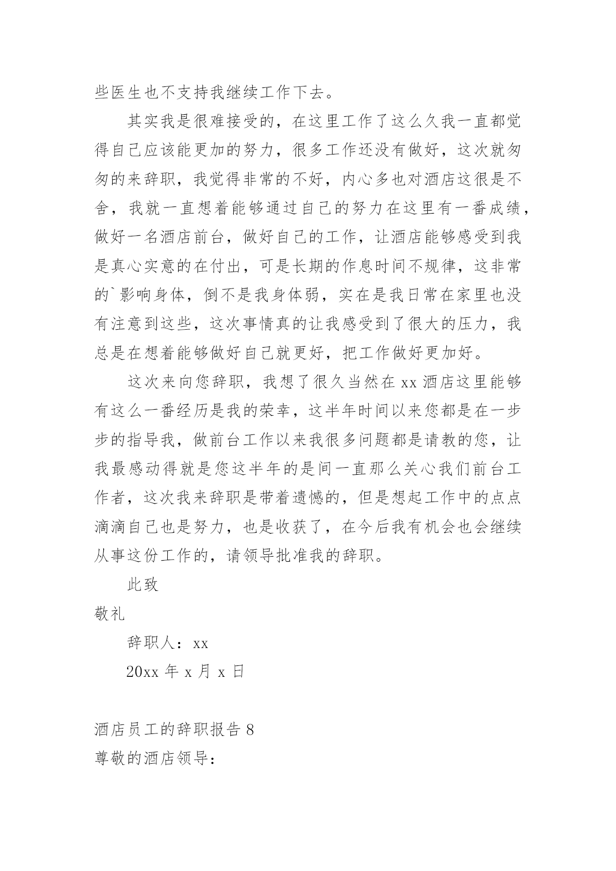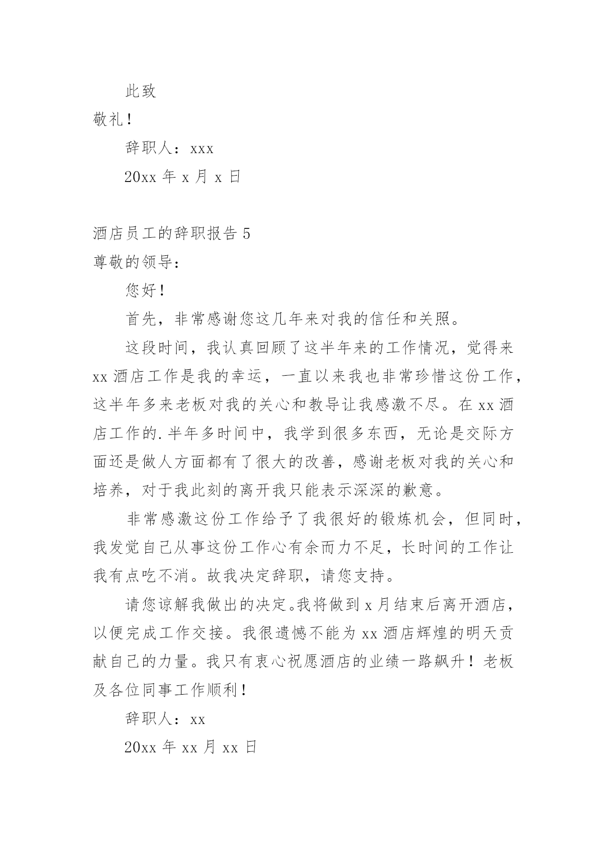 酒店员工的辞职报告在人们越来越注重自身素养的今天,报告十分的重要,我们在写报告的时候要避免篇幅过长。其实写报告并没有想象中那么难,以下是小编帮大家整理的酒店员工的辞职报告,希望能够帮助到大家。酒店员工的辞职报告1尊敬的酒店及部门领导:首先感谢在百忙之中抽空看我的辞职报告。我非常重视在**公司内这段经历,也很荣幸成为**的一员,特别是**的处事风范及素质使我倍感钦佩。在**这几个月所学到的知识也是我一生宝贵的财富。也祝所有**成员在工作和活动中取得更大的成绩及收益!经过几周的慎重考虑和内心挣扎我决定无奈的上交这封辞职信,和能辉一起走过四年的风雨路,这份感情不是用言语可以表达的。再次衷心的感谢各位酒店和部门领导在过去的四年里对我的关怀和帮助,以及同事对我的关心与支持,当我还是小毛孩的时候就进入这个大家庭,在这个温室中,我茁壮成长,学会了怎么做人做事,当然我也尽力去完成了各项本职和领导安排的工作。很开心我的第一份工作是在“能辉”我会永远记得,我很抱歉在部门人员紧缺的时候提出离职,诚然,由于个人原因不得不申请离职,盼原谅。请公司于20xx年5月25日前安排好合适人员接手我的工作并批准我于当日离职为谢。我还很想继续为银行努力,我还想在这里继续成长,我还想与我们敬爱的领导们齐头并进,共同致于人类最伟大的事业。我考虑在此辞呈递交之后尽快离开公司,并渴望有新人尽快选来填补因我离职而造成的空缺,同时我也能够协助您对新人进行入职培训,使他尽快熟悉工作。公司业务部近期人员变动较大,因此交接工作可能需要一个时期。我希望在10/24左右完成工作交接。这个时间也许比较紧,如果实施上有太多困难,我同意适当延迟一周。但是我还是希望副理理解,现临近年底,如果能给予我支配更多的时间来找工作我将感激不尽!来到公司也已经两个多月了,在这两个多月的时间里,得到了公司各位同事的多方帮助,我非常感谢公司各位同事。正是在这里我有过欢笑,也有过苦恼,更有过收获。公司平等的人际关系和开明的.工作作风,一度让我有着找到了依靠的感觉,在这里我能开心的工作,开心的学习。或许这真是对的,由此我开始了思索,认真的思考。我很赞同刘经理所说的适应不了工作就自己走人的说法,我适应不了这样的传统管理模式,反过来说,强制性的管理手段并不能给我提供一个自由成长的环境,这对我来说是一种损失,所以我主动提出离职。在剩余的日子我会依然用心工作,上好最后一个班,站好最后一班岗。并做好离职前的交接工作。最后祝愿能辉继续辉煌、商祺。房务部员工xxx敬上。酒店员工的辞职报告2尊敬的领导:您好!首先非常感谢这一年来您们对我的关心及照顾,让我学到很多也体会很多。由于本人能力有限,很多工作上的疏忽和缺陷您们都能宽容我并时时教导我前进,更是让我由衷的感激。我在前台服务的岗位上,所做的'一举一动都代表着酒店,但是在这一年里,我在思想认识还有实际工作中并没有尽到这个责任。通过认真反思,主要原因有以下几点:一、工作时工作怠慢,热情度不高。在服务上缺乏灵活性和主动性。二、对自己的本职工作操作机械化,不创新求异。三、缺乏交流和沟通,信息反馈不及时,导致工作不协调。四、缺乏销售意识和销售技巧,客房出租率低。五、微机改革之后,缺乏责任心,没有及时的数据统计和管理。六、自身调节力差,情绪化严重。七、服务意识淡薄,没有真正的把客人的需求放在第一位。在这个时候提出这样的申请,我知道让领导非常的为难,我要表示深深的歉意。为了酒店的形象及利益,我选择了离开,希望领导能够予以批准!此致敬礼!辞职人:xxx20xx年xx月xx日酒店员工的辞职报告3尊敬的领导:您好,感谢你的第一年,你对我的关心和照顾,让我学到很多东西,有多少。由于本人能力有限,大量的工作,忽视,缺陷可以宽容我,你总是教我前进,是让我由衷的.感激。我在前台工作,一举一动代表一个酒店,但在今年,我知道在思想上和实际工作和不履行责任。通过仔细的反射,辞职信主要原因有以下几点:一,机械化操作自身的本职工作,不要问创新。二、工作,而你的工作的一种怠慢,激情程度不高。在服务、以及缺乏灵活性和主动性。三、自身的调节力差,情绪严重。四、缺乏销售意识和销售技巧,客房出租率v低。五、服务意识,没有真正的客人的需要放在第一位。六、缺乏沟通和交流、信息反馈,并导致工作不协调。七、微机改革后,缺乏责任感,没有及时的数据统计和管理。在这个时候提出这样的应用程序,我知道让领导是非常困难的,我想真诚道歉。为了形象的酒店和兴趣,我选择离开,希望领导人可以通过的!此致敬礼!辞职人:xxxx月x日酒店员工的辞职报告4尊敬的领导:您好!在酒店工作的这两年中,我的性格变得柔和了很多,首先是受到领导的影响,领导是一个很温和且非常有包容心的一个人。我刚刚来的时候总是犯错,也总是给酒店惹了一些小麻烦。但是领导没有过分的责怪我