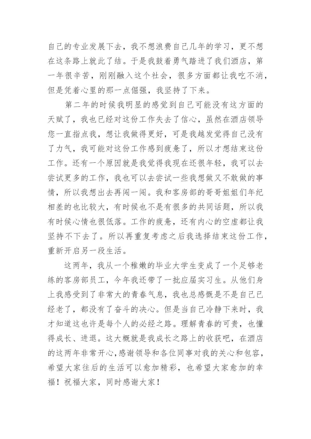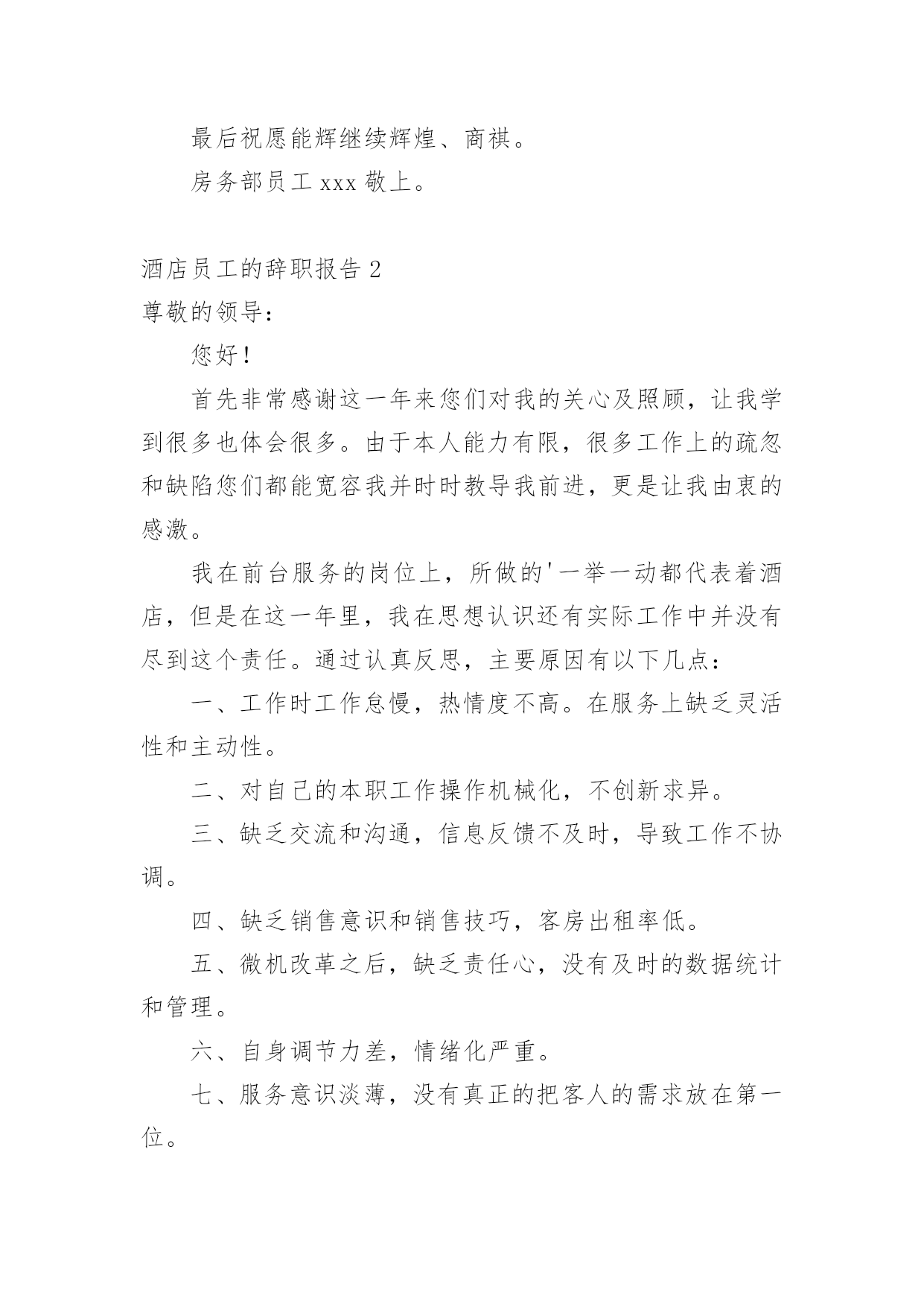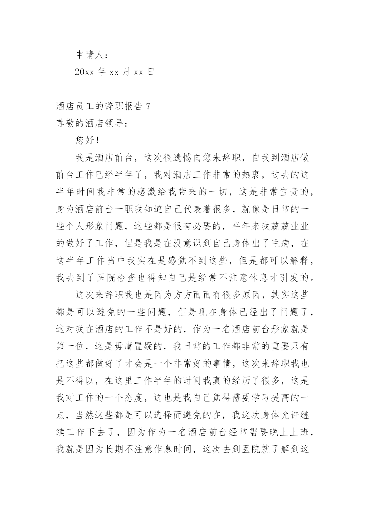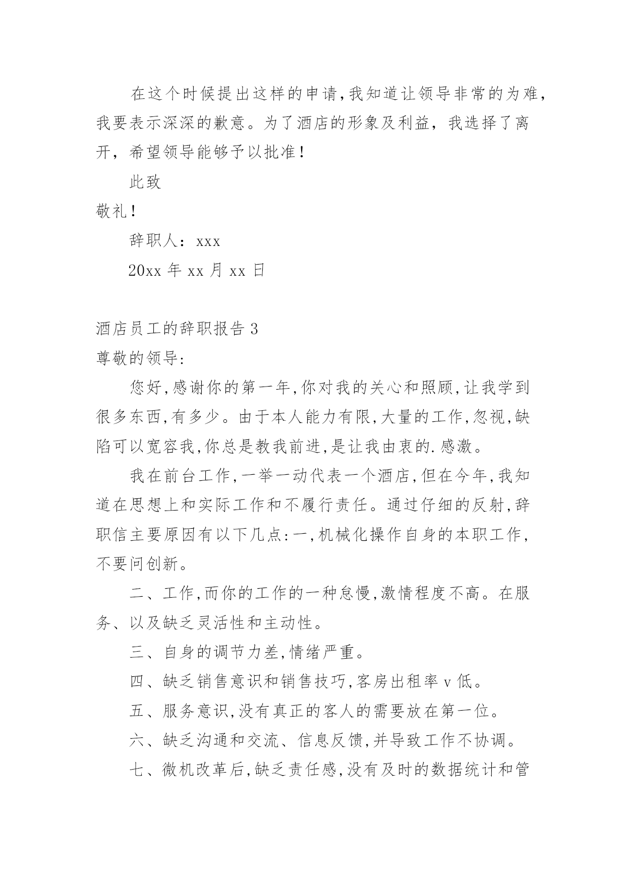 酒店员工的辞职报告在人们越来越注重自身素养的今天,报告十分的重要,我们在写报告的时候要避免篇幅过长。其实写报告并没有想象中那么难,以下是小编帮大家整理的酒店员工的辞职报告,希望能够帮助到大家。酒店员工的辞职报告1尊敬的酒店及部门领导:首先感谢在百忙之中抽空看我的辞职报告。我非常重视在**公司内这段经历,也很荣幸成为**的一员,特别是**的处事风范及素质使我倍感钦佩。在**这几个月所学到的知识也是我一生宝贵的财富。也祝所有**成员在工作和活动中取得更大的成绩及收益!经过几周的慎重考虑和内心挣扎我决定无奈的上交这封辞职信,和能辉一起走过四年的风雨路,这份感情不是用言语可以表达的。再次衷心的感谢各位酒店和部门领导在过去的四年里对我的关怀和帮助,以及同事对我的关心与支持,当我还是小毛孩的时候就进入这个大家庭,在这个温室中,我茁壮成长,学会了怎么做人做事,当然我也尽力去完成了各项本职和领导安排的工作。很开心我的第一份工作是在“能辉”我会永远记得,我很抱歉在部门人员紧缺的时候提出离职,诚然,由于个人原因不得不申请离职,盼原谅。请公司于20xx年5月25日前安排好合适人员接手我的工作并批准我于当日离职为谢。我还很想继续为银行努力,我还想在这里继续成长,我还想与我们敬爱的领导们齐头并进,共同致于人类最伟大的事业。我考虑在此辞呈递交之后尽快离开公司,并渴望有新人尽快选来填补因我离职而造成的空缺,同时我也能够协助您对新人进行入职培训,使他尽快熟悉工作。公司业务部近期人员变动较大,因此交接工作可能需要一个时期。我希望在10/24左右完成工作交接。这个时间也许比较紧,如果实施上有太多困难,我同意适当延迟一周。但是我还是希望副理理解,现临近年底,如果能给予我支配更多的时间来找工作我将感激不尽!来到公司也已经两个多月了,在这两个多月的时间里,得到了公司各位同事的多方帮助,我非常感谢公司各位同事。正是在这里我有过欢笑,也有过苦恼,更有过收获。公司平等的人际关系和开明的.工作作风,一度让我有着找到了依靠的感觉,在这里我能开心的工作,开心的学习。或许这真是对的,由此我开始了思索,认真的思考。我很赞同刘经理所说的适应不了工作就自己走人的说法,我适应不了这样的传统管理模式,反过来说,强制性的管理手段并不能给我提供一个自由成长的环境,这对我来说是一种损失,所以我主动提出离职。在剩余的日子我会依然用心工作,上好最后一个班,站好最后一班岗。并做好离职前的交接工作。最后祝愿能辉继续辉煌、商祺。房务部员工xxx敬上。酒店员工的辞职报告2尊敬的领导:您好!首先非常感谢这一年来您们对我的关心及照顾,让我学到很多也体会很多。由于本人能力有限,很多工作上的疏忽和缺陷您们都能宽容我并时时教导我前进,更是让我由衷的感激。我在前台服务的岗位上,所做的'一举一动都代表着酒店,但是在这一年里,我在思想认识还有实际工作中并没有尽到这个责任。通过认真反思,主要原因有以下几点:一、工作时工作怠慢,热情度不高。在服务上缺乏灵活性和主动性。二、对自己的本职工作操作机械化,不创新求异。三、缺乏交流和沟通,信息反馈不及时,导致工作不协调。四、缺乏销售意识和销售技巧,客房出租率低。五、微机改革之后,缺乏责任心,没有及时的数据统计和管理。六、自身调节力差,情绪化严重。七、服务意识淡薄,没有真正的把客人的需求放在第一位。在这个时候提出这样的申请,我知道让领导非常的为难,我要表示深深的歉意。为了酒店的形象及利益,我选择了离开,希望领导能够予以批准!此致敬礼!辞职人:xxx20xx年xx月xx日酒店员工的辞职报告3尊敬的领导:您好,感谢你的第一年,你对我的关心和照顾,让我学到很多东西,有多少。由于本人能力有限,大量的工作,忽视,缺陷可以宽容我,你总是教我前进,是让我由衷的.感激。我在前台工作,一举一动代表一个酒店,但在今年,我知道在思想上和实际工作和不履行责任。通过仔细的反射,辞职信主要原因有以下几点:一,机械化操作自身的本职工作,不要问创新。二、工作,而你的工作的一种怠慢,激情程度不高。在服务、以及缺乏灵活性和主动性。三、自身的调节力差,情绪严重。四、缺乏销售意识和销售技巧,客房出租率v低。五、服务意识,没有真正的客人的需要放在第一位。六、缺乏沟通和交流、信息反馈,并导致工作不协调。七、微机改革后,缺乏责任感,没有及时的数据统计和管理。在这个时候提出这样的应用程序,我知道让领导是非常困难的,我想真诚道歉。为了形象的酒店和兴趣,我选择离开,希望领导人可以通过的!此致敬礼!辞职人:xxxx月x日酒店员工的辞职报告4尊敬的领导:您好!在酒店工作的这两年中,我的性格变得柔和了很多,首先是受到领导的影响,领导是一个很温和且非常有包容心的一个人。我刚刚来的时候总是犯错,也总是给酒店惹了一些小麻烦。但是领导没有过分的责怪我