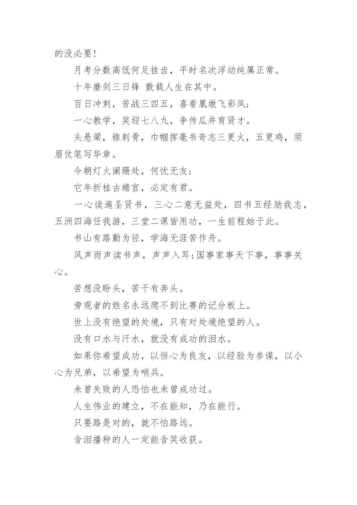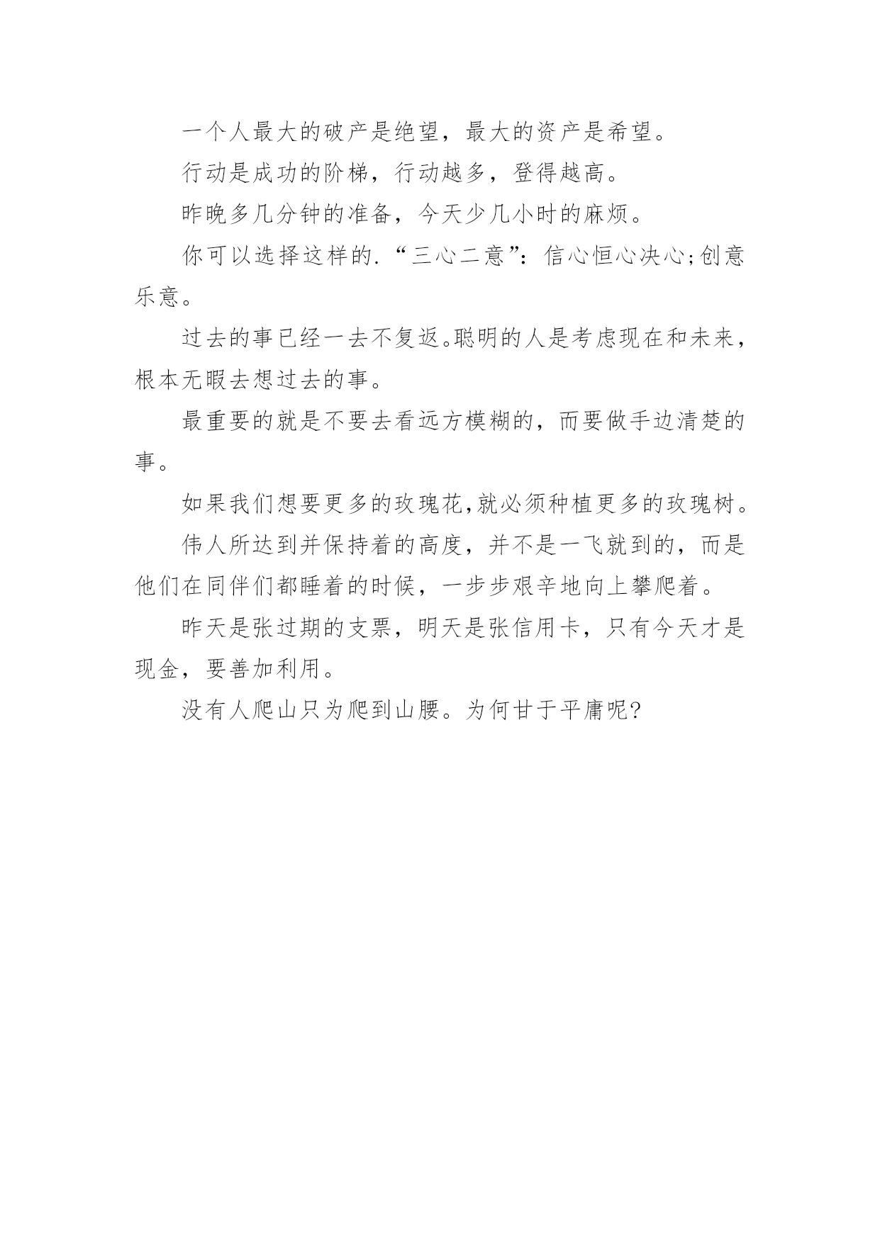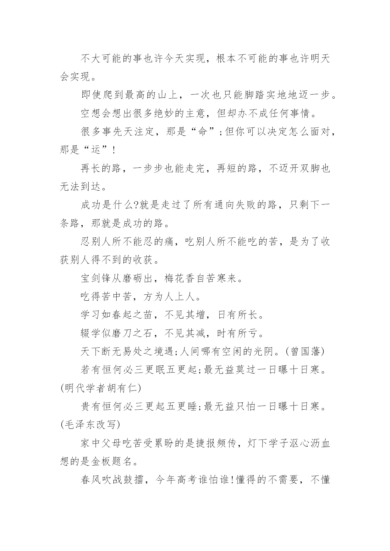 高考冲刺励志名言名句高考冲刺励志名言名句每年都会有高考,每年我们高三学生都需要一些励志的名言名句来激励自己,鼓励他人。下面是小编搜集整理的高考冲刺励志名言名句,欢迎阅读。更多资讯请继续关注励志名言栏目!预祝各位学子金榜题名!百尺高梧,撑得起一轮月色;数椽矮屋,锁不住五夜书声。有两种人是没有什么价值可言的;一种人无法做被吩咐去做的事,另一种人只能做被吩咐去做的事。不为失败找理由,要为成功找方法。没有一种不通过蔑视忍受和奋斗就可以征服的命运。成功需要成本,时间也是一种成本,对时间的珍惜就是对成本的节约。只有强者才懂得斗争;弱者甚至失败都不够资格,而是生来就是被征服的。只有一条路不能选择——那就是放弃的路;只有一条路不能拒绝——那就是坚持的路。凡事要三思,但比三思更重要的是三思而行。世上最重要的事,不在于我们在何处,而在于我们朝着什么方向走。让我们将事前的考虑,换为事前的思考和计划吧。不大可能的事也许今天实现,根本不可能的事也许明天会实现。即使爬到最高的山上,一次也只能脚踏实地地迈一步。空想会想出很多绝妙的主意,但却办不成任何事情。很多事先天注定,那是“命”;但你可以决定怎么面对,那是“运”!再长的路,一步步也能走完,再短的路,不迈开双脚也无法到达。成功是什么?就是走过了所有通向失败的路,只剩下一条路,那就是成功的路。忍别人所不能忍的痛,吃别人所不能吃的苦,是为了收获别人得不到的收获。宝剑锋从磨砺出,梅花香自苦寒来。吃得苦中苦,方为人上人。学习如春起之苗,不见其增,日有所长。辍学似磨刀之石,不见其减,时有所亏。天下断无易处之境遇;人间哪有空闲的光阴。(曾国藩)若有恒何必三更眠五更起;最无益莫过一日曝十日寒。(明代学者胡有仁)贵有恒何必三更起五更睡;最无益只怕一日曝十日寒。(毛泽东改写)家中父母吃苦受累盼的是捷报频传,灯下学子沤心沥血想的是金板题名。春风吹战鼓擂,今年高考谁怕谁!懂得的不需要,不懂的没必要!月考分数高低何足挂齿,平时名次浮动纯属正常。十年磨剑三日锋数载人生在其中。百日冲刺,苦战三四五,喜看凰墩飞彩凤;一心教学,笑迎七八九,争传瓜井育贤才。头悬梁,锥刺骨,巾帼挥毫书奇志三更火,五更鸡,须眉仗笔写华章。今朝灯火阑珊处,何忧无友;它年折桂古蟾宫,必定有君。一心读遍圣贤书,三心二意无益处,四书五经励我志,五洲四海任我游,三堂二课皆用功,一生前程始于此。书山有路勤为径,学海无涯苦作舟。风声雨声读书声,声声入耳;国事家事天下事,事事关心。苦想没盼头,苦干有奔头。旁观者的姓名永远爬不到比赛的记分板上。世上没有绝望的处境,只有对处境绝望的人。没有口水与汗水,就没有成功的泪水。如果你希望成功,以恒心为良友,以经验为参谋,以小心为兄弟,以希望为哨兵。未曾失败的人恐怕也未曾成功过。人生伟业的建立,不在能知,乃在能行。只要路是对的,就不怕路远。含泪播种的人一定能含笑收获。一个人最大的破产是绝望,最大的资产是希望。行动是成功的阶梯,行动越多,登得越高。昨晚多几分钟的准备,今天少几小时的麻烦。你可以选择这样的.“三心二意”:信心恒心决心;创意乐意。过去的事已经一去不复返。聪明的人是考虑现在和未来,根本无暇去想过去的事。最重要的就是不要去看远方模糊的,而要做手边清楚的事。如果我们想要更多的玫瑰花,就必须种植更多的玫瑰树。伟人所达到并保持着的高度,并不是一飞就到的,而是他们在同伴们都睡着的时候,一步步艰辛地向上攀爬着。昨天是张过期的支票,明天是张信用卡,只有今天才是现金,要善加利用。没有人爬山只为爬到山腰。为何甘于平庸呢?