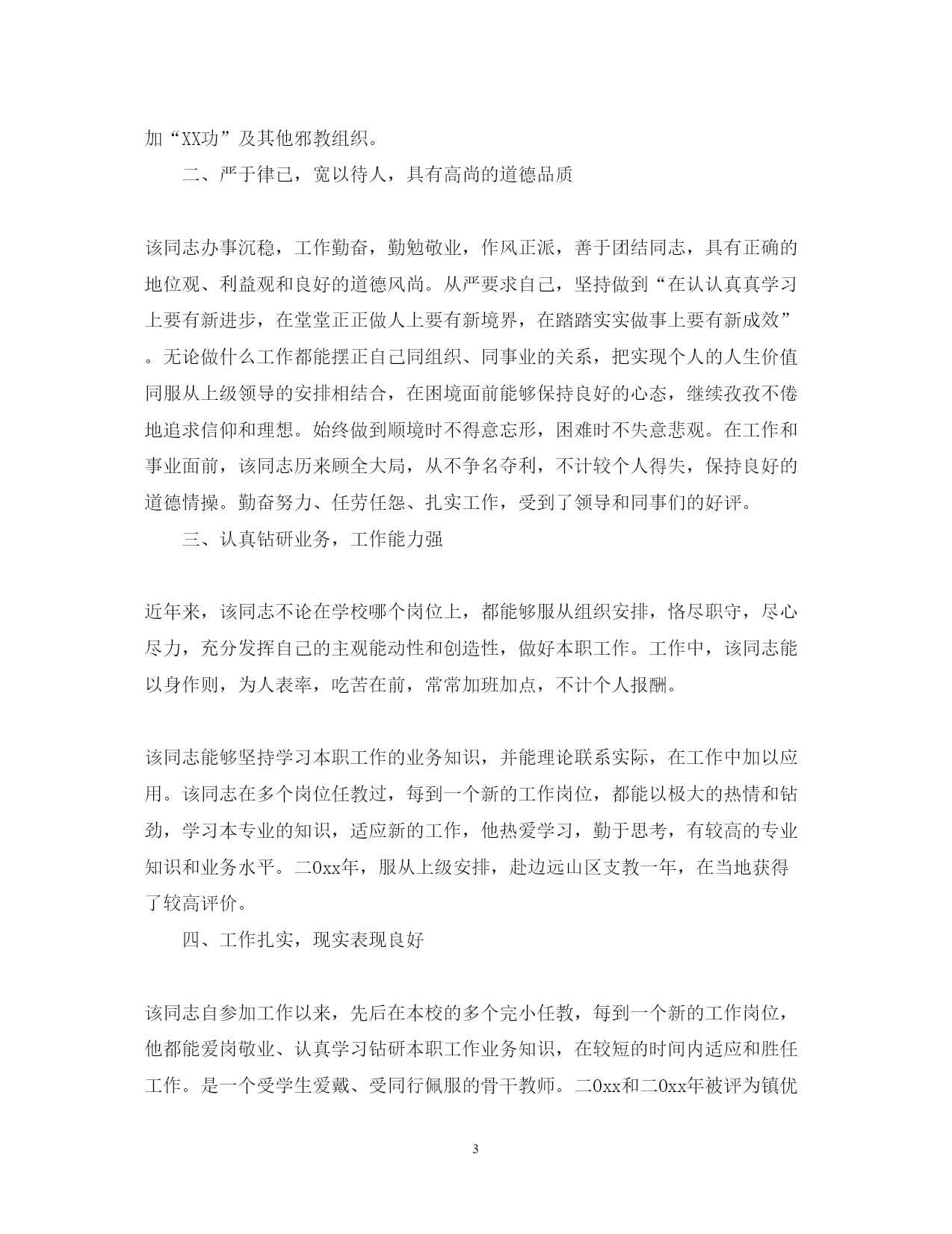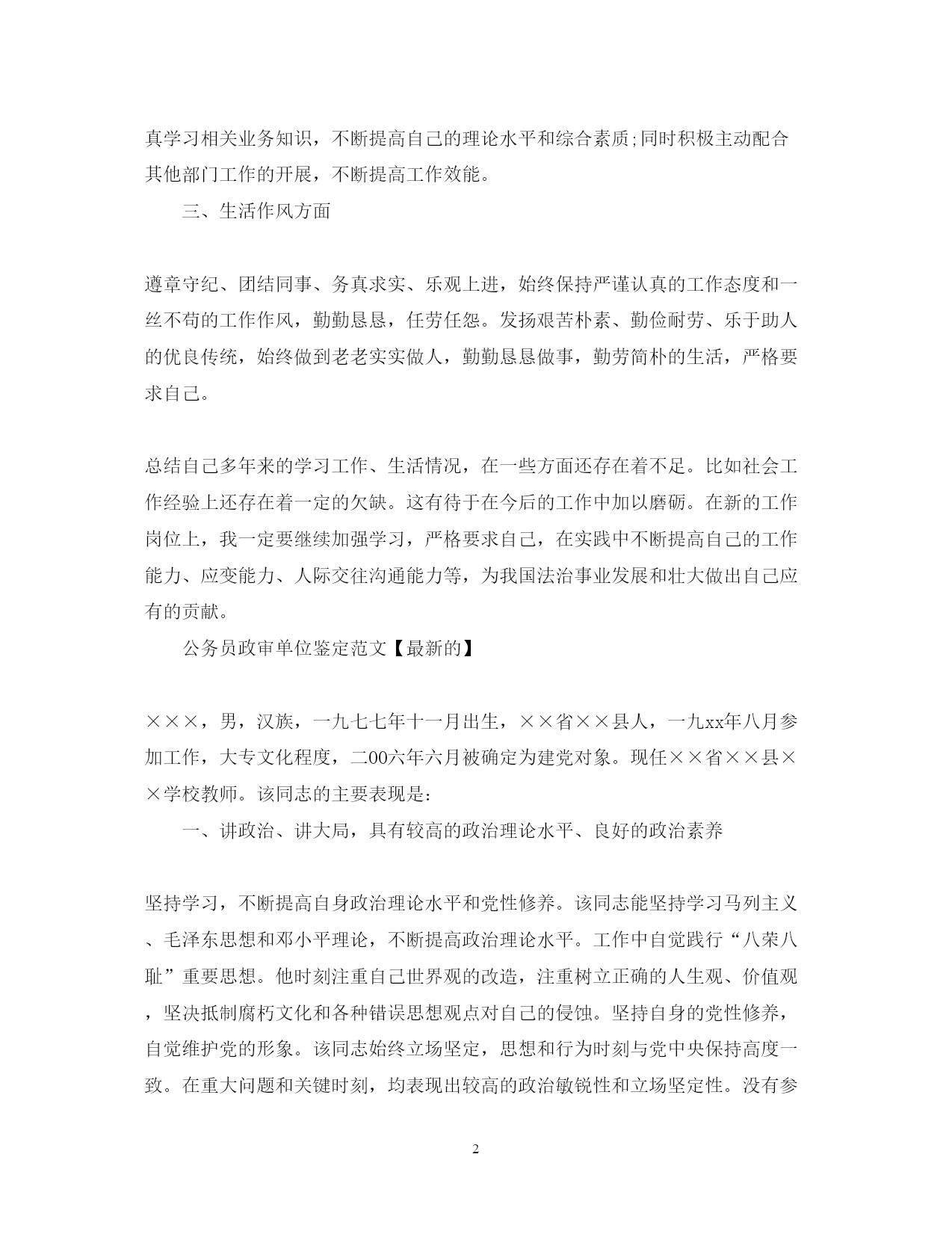 此资料由网络收集而来,如有侵权请告知上传者立即删除。资料共分享,我们负责传递知识。PAGEPAGE4公务员政审自我鉴定【标准】如果你还在为公务员政审自我鉴定怎么写烦恼,快来看看吧!下面是整理的关于公务员政审自我鉴定范文,欢迎阅读!公务员政审自我鉴定【标准】我叫xxx,性别男,于19xx年x月出生于xx省xx县,x族。XX年x月进入xxxx学校文学专业学习,XX年x月毕业,大学本科学历,党员。毕业至今在xxx单位任职。XX年x月,参加了公务员考试,有幸以优异的成绩成为拟录用人员,现在逐步完成从事业单位到机关公务员的转变和适应。为了能更好的走向工作岗位,让领导对我有更深的了解,现对自己以往的思想、工作学习、生活情况做如下小结。一、思想政治方面本人认真领会党的路线方针政策精神,时刻牢记为人民服务的宗旨,明白自己所肩负的责任;积极参加党支部组织的各种政治学习及教育活动;利用电视、电脑、报纸、杂志等媒体关注国内国际形势,学习党的基本知识和有关政治思想文件、书籍,并把它作为思想的纲领,行动的指南;积极向党组织靠拢,在工作、学习和生活中增强自身的党性原则,按照新党章规定的党员标准来要求自己,虚心向身边的党员学习。二、学习工作方面参加工作以来,围绕本职中心工作,对照相关标准,严以律己,较好的完成各项工作任务;严格遵守单位制定的各项工作制度,积极参加单位组织的各项活动,虚心向有经验的同志请教工作上的问题,学习他们的先进经验和知识;同时,认真学习相关业务知识,不断提高自己的理论水平和综合素质;同时积极主动配合其他部门工作的开展,不断提高工作效能。三、生活作风方面遵章守纪、团结同事、务真求实、乐观上进,始终保持严谨认真的工作态度和一丝不苟的工作作风,勤勤恳恳,任劳任怨。发扬艰苦朴素、勤俭耐劳、乐于助人的优良传统,始终做到老老实实做人,勤勤恳恳做事,勤劳简朴的生活,严格要求自己。总结自己多年来的学习工作、生活情况,在一些方面还存在着不足。比如社会工作经验上还存在着一定的欠缺。这有待于在今后的工作中加以磨砺。在新的工作岗位上,我一定要继续加强学习,严格要求自己,在实践中不断提高自己的工作能力、应变能力、人际交往沟通能力等,为我国法治事业发展和壮大做出自己应有的贡献。公务员政审单位鉴定范文【最新的】×××,男,汉族,一九七七年十一月出生,××省××县人,一九xx年八月参加工作,大专文化程度,二OO六年六月被确定为建党对象。现任××省××县××学校教师。该同志的主要表现是:一、讲政治、讲大局,具有较高的政治理论水平、良好的政治素养坚持学习,不断提高自身政治理论水平和党性修养。该同志能坚持学习马列主义、毛泽东思想和邓小平理论,不断提高政治理论水平。工作中自觉践行“八荣八耻”重要思想。他时刻注重自己世界观的改造,注重树立正确的人生观、价值观,坚决抵制腐朽文化和各种错误思想观点对自己的侵蚀。坚持自身的党性修养,自觉维护党的形象。该同志始终立场坚定,思想和行为时刻与党中央保持高度一致。在重大问题和关键时刻,均表现出较高的政治敏锐性和立场坚定性。没有参加“XX功”及其他邪教组织。二、严于律已,宽以待人,具有高尚的道德品质该同志办事沉稳,工作勤奋,勤勉敬业,作风正派,善于团结同志,具有正确的地位观、利益观和良好的道德风尚。从严要求自己,坚持做到“在认认真真学习上要有新进步,在堂堂正正做人上要有新境界,在踏踏实实做事上要有新成效”。无论做什么工作都能摆正自己同组织、同事业的关系,把实现个人的人生价值同服从上级领导的安排相结合,在困境面前能够保持良好的心态,继续孜孜不倦地追求信仰和理想。始终做到顺境时不得意忘形,困难时不失意悲观。在工作和事业面前,该同志历来顾全大局,从不争名夺利,不计较个人得失,保持良好的道德情操。勤奋努力、任劳任怨、扎实工作,受到了领导和同事们的好评。三、认真钻研业务,工作能力强近年来,该同志不论在学校哪个岗位上,都能够服从组织安排,恪尽职守,尽心尽力,充分发挥自己的主观能动性和创造性,做好本职工作。工作中,该同志能以身作则,为人表率,吃苦在前,常常加班加点,不计个人报酬。该同志能够坚持学习本职工作的业务知识,并能理论联系实际,在工作中加以应用。该同志在多个岗位任教过,每到一个新的工作岗位,都能以极大的热情和钻劲,学习本专业的知识,适应新的工作,他热爱学习,勤于思考,有较高的专业知识和业务水平。二Oxx年,服从上级安排,赴边远山区支教一年,在当地获得了较高评价。四、工作扎实,现实表现良好该同志自参加工作以来,先后在本校的多个完小任教,每到一个新的工作岗位,他都能爱岗敬业、认真学习钻研本职工作业务知识,在较短的时间内适应和胜任工作。是一个受学生爱戴、受同行佩服的骨干教师。二Oxx和二Oxx