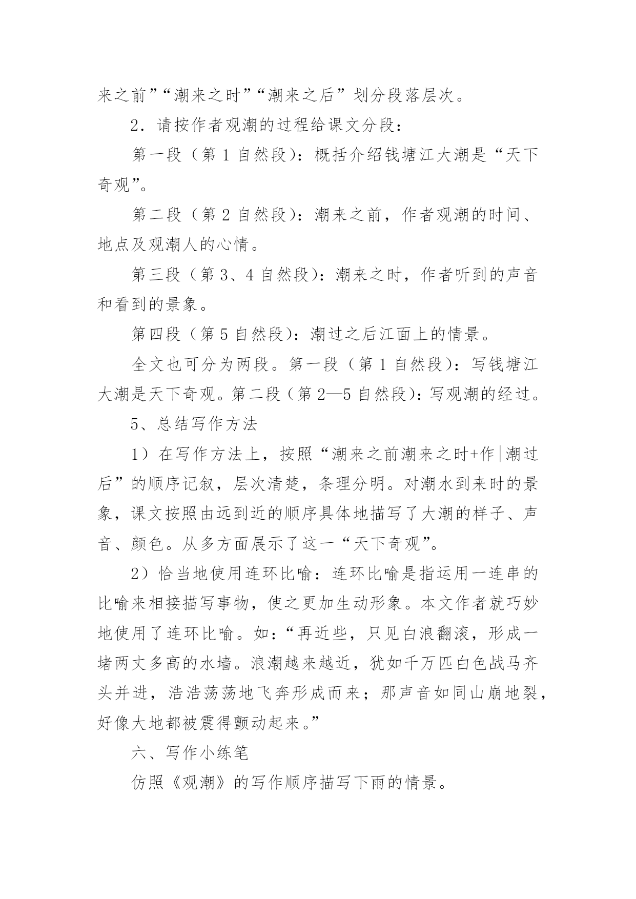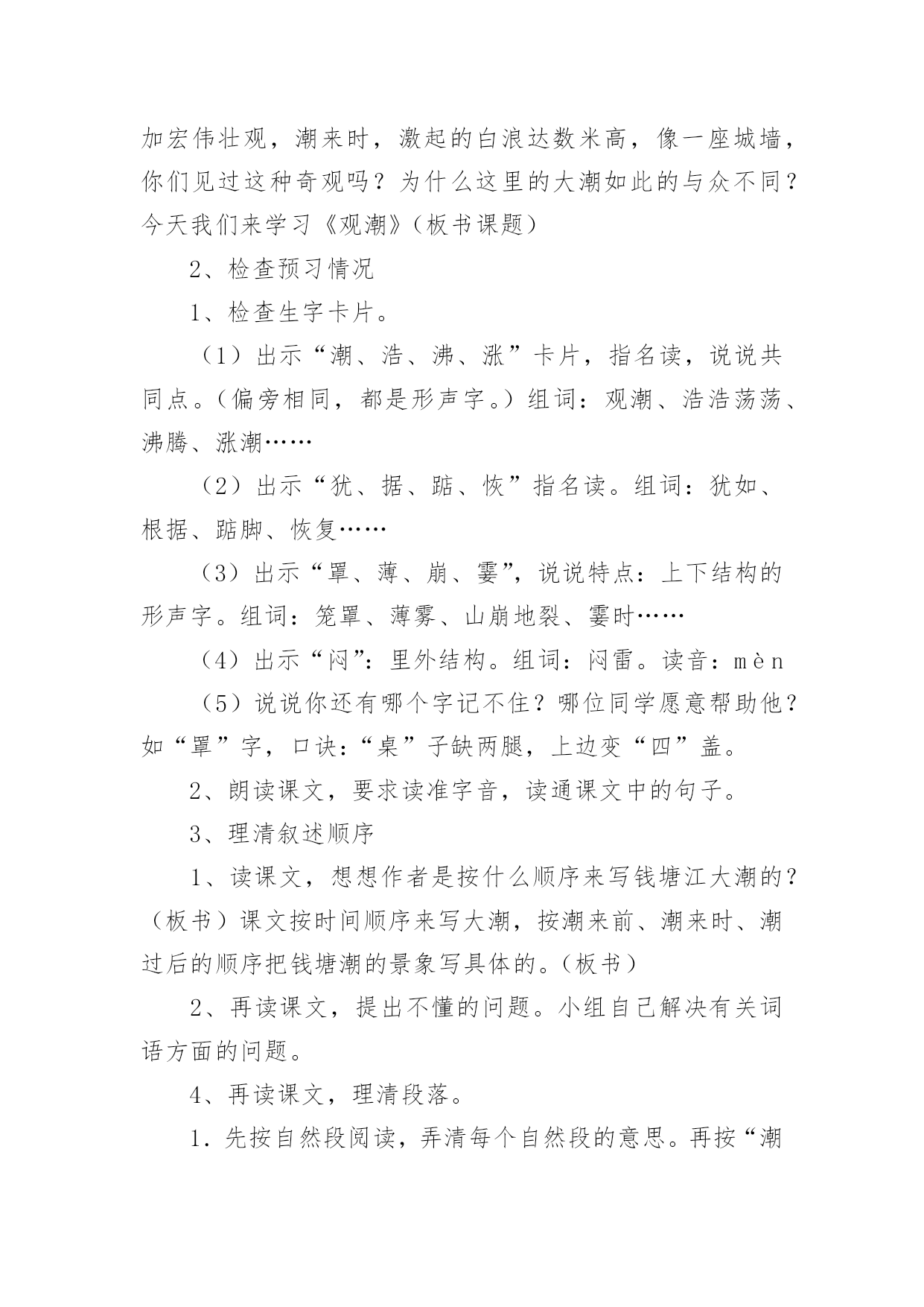课文《观潮》教学设计课文《观潮》教学设计作为一名老师,总不可避免地需要编写教学设计,借助教学设计可以提高教学质量,收到预期的教学效果。那么优秀的教学设计是什么样的呢?下面是小编收集整理的课文《观潮》教学设计,仅供参考,欢迎大家阅读。教学目标1、正确拼读12个会认字,书写15个会写字,理解“笼罩、人声鼎沸、水天相接、横贯”等词语。2、正确朗读课文,理清文章结构。教学重点感受钱塘潮来时的神奇壮观,能够根据语言描写想象画面。教学难点想象课文描绘的大潮景象,引导学生体会作者怎样既生动又有层次地描述钱塘江大潮雄奇景象的。教学设计1、谈话引入同学们,你们到过海边,看过海水涨潮吗?说说海潮什么样?(江海涨潮,气势宏伟,令人震撼。)我国的钱塘江大潮自古以来被称为“天下奇观”。这里的潮比别处的潮更加宏伟壮观,潮来时,激起的白浪达数米高,像一座城墙,你们见过这种奇观吗?为什么这里的大潮如此的与众不同?今天我们来学习《观潮》(板书课题)2、检查预习情况1、检查生字卡片。(1)出示“潮、浩、沸、涨”卡片,指名读,说说共同点。(偏旁相同,都是形声字。)组词:观潮、浩浩荡荡、沸腾、涨潮……(2)出示“犹、据、踮、恢”指名读。组词:犹如、根据、踮脚、恢复……(3)出示“罩、薄、崩、霎”,说说特点:上下结构的形声字。组词:笼罩、薄雾、山崩地裂、霎时……(4)出示“闷”:里外结构。组词:闷雷。读音:mèn(5)说说你还有哪个字记不住?哪位同学愿意帮助他?如“罩”字,口诀:“桌”子缺两腿,上边变“四”盖。2、朗读课文,要求读准字音,读通课文中的句子。3、理清叙述顺序1、读课文,想想作者是按什么顺序来写钱塘江大潮的?(板书)课文按时间顺序来写大潮,按潮来前、潮来时、潮过后的顺序把钱塘潮的景象写具体的。(板书)2、再读课文,提出不懂的问题。小组自己解决有关词语方面的问题。4、再读课文,理清段落。1.先按自然段阅读,弄清每个自然段的意思。再按“潮来之前”“潮来之时”“潮来之后”划分段落层次。2.请按作者观潮的过程给课文分段:第一段(第1自然段):概括介绍钱塘江大潮是“天下奇观”。第二段(第2自然段):潮来之前,作者观潮的时间、地点及观潮人的心情。第三段(第3、4自然段):潮来之时,作者听到的声音和看到的景象。第四段(第5自然段):潮过之后江面上的情景。全文也可分为两段。第一段(第1自然段):写钱塘江大潮是天下奇观。第二段(第2—5自然段):写观潮的经过。5、总结写作方法1)在写作方法上,按照“潮来之前潮来之时+作|潮过后”的顺序记叙,层次清楚,条理分明。对潮水到来时的景象,课文按照由远到近的顺序具体地描写了大潮的样子、声音、颜色。从多方面展示了这一“天下奇观”。2)恰当地使用连环比喻:连环比喻是指运用一连串的比喻来相接描写事物,使之更加生动形象。本文作者就巧妙地使用了连环比喻。如:“再近些,只见白浪翻滚,形成一堵两丈多高的水墙。浪潮越来越近,犹如千万匹白色战马齐头并进,浩浩荡荡地飞奔形成而来;那声音如同山崩地裂,好像大地都被震得颤动起来。”六、写作小练笔仿照《观潮》的写作顺序描写下雨的情景。