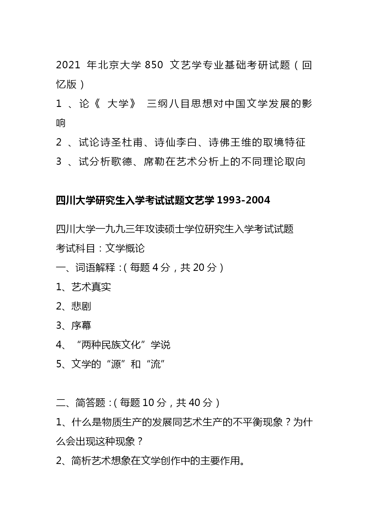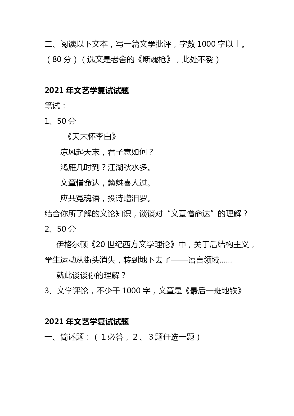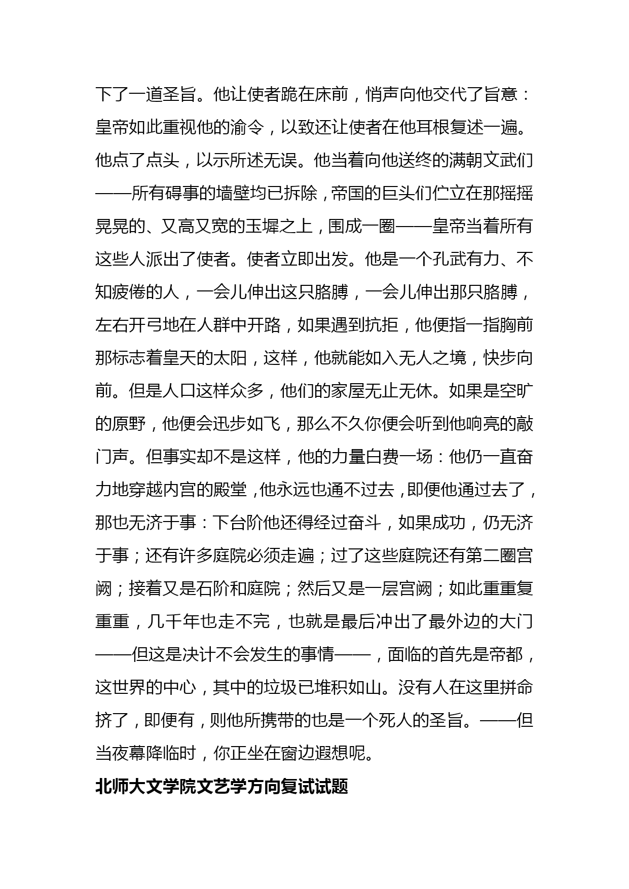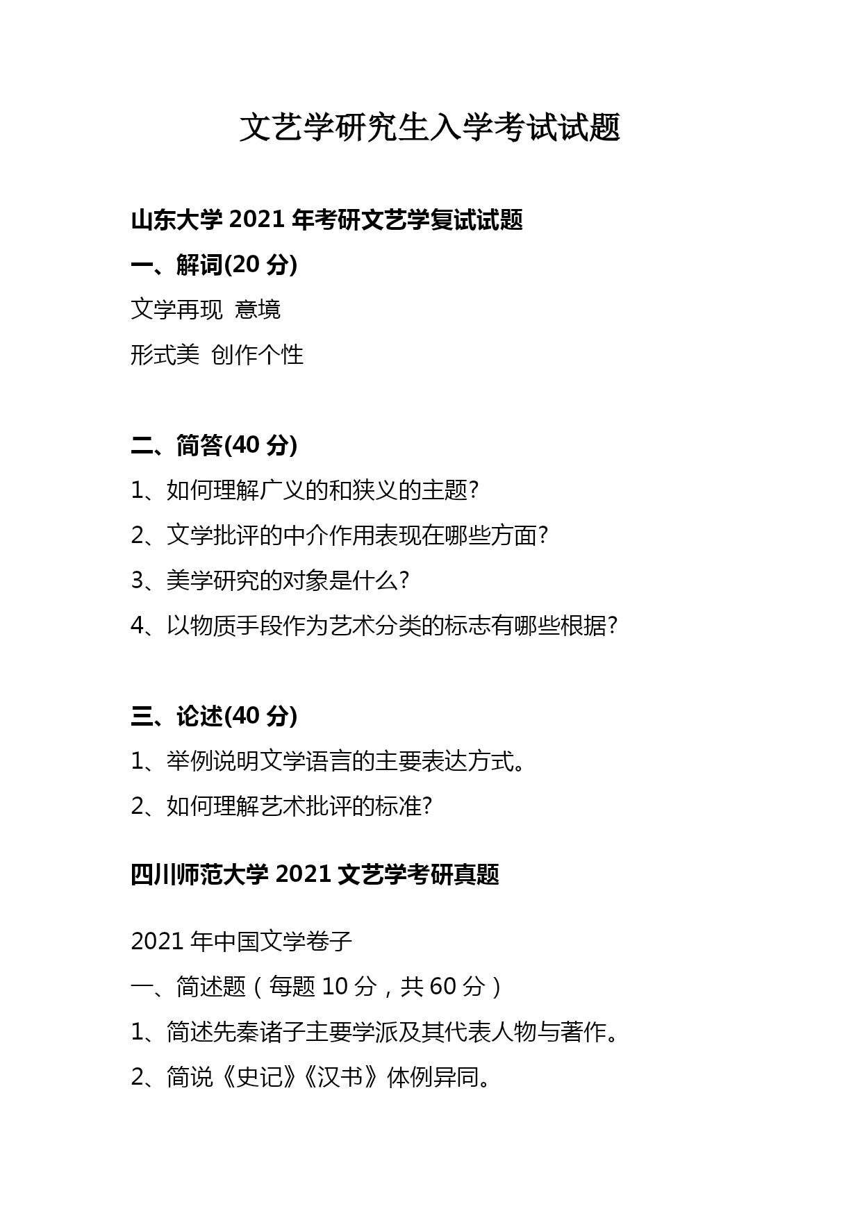 文艺学研究生入学考试试题(完整版)资料(可以直接使用,可编辑优秀版资料,欢迎下载)文艺学研究生入学考试试题山东大学2021年考研文艺学复试试题一、解词(20分)文学再现意境形式美创作个性二、简答(40分)1、如何理解广义的和狭义的主题?2、文学批评的中介作用表现在哪些方面?3、美学研究的对象是什么?4、以物质手段作为艺术分类的标志有哪些根据?三、论述(40分)1、举例说明文学语言的主要表达方式。2、如何理解艺术批评的标准?四川师范大学2021文艺学考研真题2021年中国文学卷子一、简述题(每题10分,共60分)1、简述先秦诸子主要学派及其代表人物与著作。2、简说《史记》《汉书》体例异同。3、简评王国维“诗中有画”。4、简述关汉卿的杂剧创作。5、简论徐志摩诗歌的艺术特色。6、简论《雷雨》的多重主题意蕴。二、论述题(前三题各25分,三个小题中任选二个,多做不加分;后三题各20分,第4小题必做,5和6题任选其一。总分90分)1、举例分析《诗经》的艺术成就。2、试述韩、柳古文运动。3、怎样理解《四库全书总目》评价《稼轩词》“慷慨纵横”,“屹然别立一宗”。4、结合作品论述《呐喊》、《彷徨》的思想内容。5、试论新时期王萌小说的意识流倾向与西方现代派意识流小说的区别。6、试论《白鹿原》的文学与文化意义。2021年文学评论写作请仔细阅读下面这篇小说,然后就此写一篇文学评论,写作要符合文学评论文章的写作规范。写在答题纸上。(150分)一道圣旨有一个传说描述说,皇帝向你这位臣民,在皇天的阳光下逃避到最远的阴影下的卑微之辈,他在弥留之际恰恰向你下了一道圣旨。他让使者跪在床前,悄声向他交代了旨意:皇帝如此重视他的渝令,以致还让使者在他耳根复述一遍。他点了点头,以示所述无误。他当着向他送终的满朝文武们——所有碍事的墙壁均已拆除,帝国的巨头们伫立在那摇摇晃晃的、又高又宽的玉墀之上,围成一圈——皇帝当着所有这些人派出了使者。使者立即出发。他是一个孔武有力、不知疲倦的人,一会儿伸出这只胳膊,一会儿伸出那只胳膊,左右开弓地在人群中开路,如果遇到抗拒,他便指一指胸前那标志着皇天的太阳,这样,他就能如入无人之境,快步向前。但是人口这样众多,他们的家屋无止无休。如果是空旷的原野,他便会迅步如飞,那么不久你便会听到他响亮的敲门声。但事实却不是这样,他的力量白费一场:他仍一直奋力地穿越内宫的殿堂,他永远也通不过去,即便他通过去了,那也无济于事:下台阶他还得经过奋斗,如果成功,仍无济于事;还有许多庭院必须走遍;过了这些庭院还有第二圈宫阙;接着又是石阶和庭院;然后又是一层宫阙;如此重重复重重,几千年也走不完,也就是最后冲出了最外边的大门——但这是决计不会发生的事情——,面临的首先是帝都,这世界的中心,其中的垃圾已堆积如山。没有人在这里拼命挤了,即便有,则他所携带的也是一个死人的圣旨。——但当夜幕降临时,你正坐在窗边遐想呢。北师大文学院文艺学方向复试试题2021年文艺学复试试题笔试共180分一、简答(100分)1:苏辙说:“辙生好为文,思之至深。以为文者气之所形;然文不可以学而能,气可以养而致。孟子曰:“我善养吾浩然之气。”今观其文章,宽厚宏博,充乎天地之间,称其气之小大。太史公行天下,环游四海名山大川,与燕赵间豪俊交游,故其文疏荡,颇有奇气。此二子者,岂尝执笔学为如此之文哉?其气充乎其中而溢乎其貌,动乎其言而见乎其文,而不自知也。”结合古代文论的知识谈谈你对这段话的认识。2:法郎士说:“……好的批评家就是要叙述他的灵魂在杰作之间的奇遇……那些说文字中没有自己的人都在说谎……没有能自己存在的文学作品,也没有能自己存在的文学批评……人们试图探寻自己,认识自我,可是他们永远做不到这一点……他们永远不能用苍蝇的复眼观察大地,也不能像XXX那样在做男人的同时记得自己的前世是女人……我在读莎士比亚、拉辛、歌德等时,读到的都是我自己”(这一段话我记得不准确,在网上也搜索不到原文,只能先试着回忆一下了,希望有人读到原文后能帮我订正补足)结合西方文论的知识谈谈你对这段话的理解。二、阅读以下文本,写一篇文学批评,字数1000字以上。(80分)(选文是老舍的《断魂枪》,此处不赘)2021年文艺学复试试题笔试:1、50分《天末怀李白》凉风起天末,君子意如何?鸿雁几时到?江湖秋水多。文章憎命达,魑魅喜人过。应共冤魂语,投诗赠汨罗。结合你所了解的文论知识,谈谈对“文章憎命达”的理解?2、50分伊格尔顿《20世纪西方文学理论》中,关于后结构主义,学生运动从街头消失,转到地下去了——语言领域……就此谈谈你的理解?3、文学评论,不少于1000字,文章是《最后一班地铁》2021年文艺学复试试题一、简述题