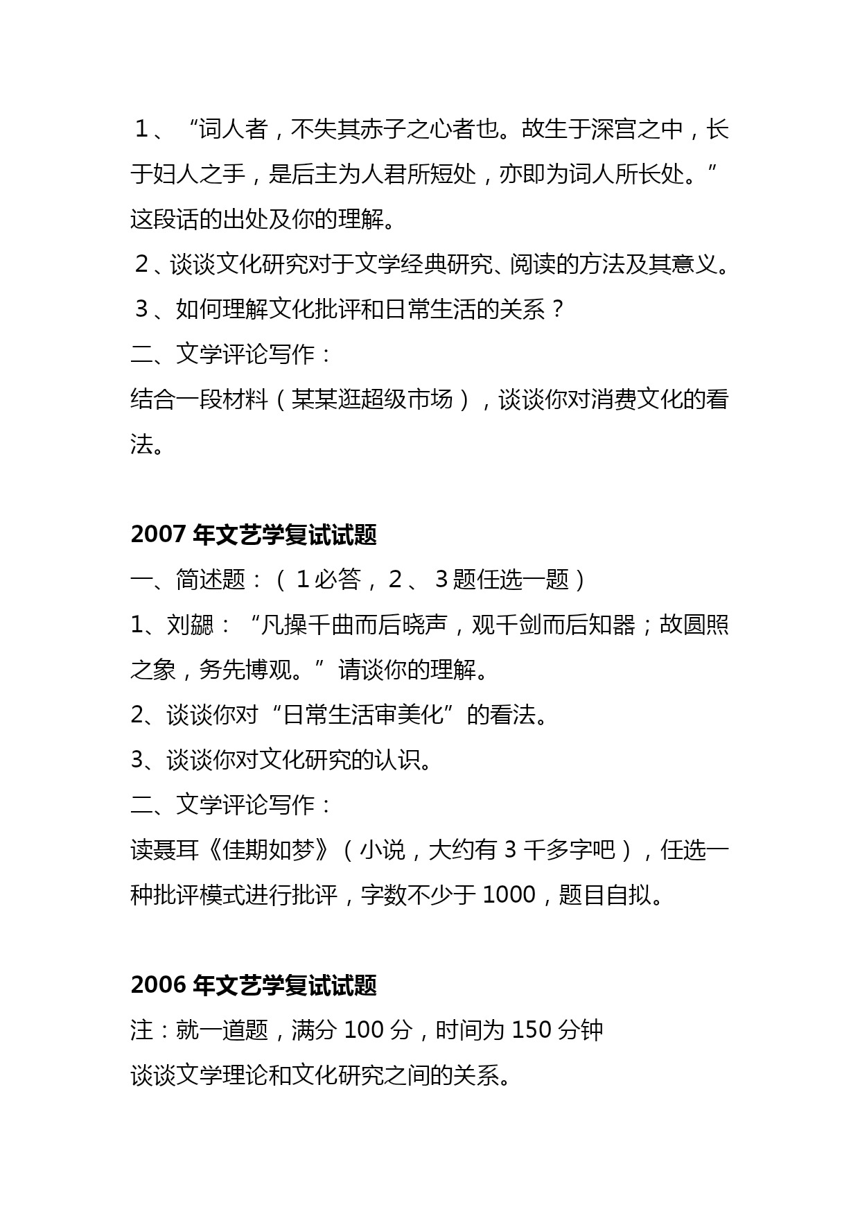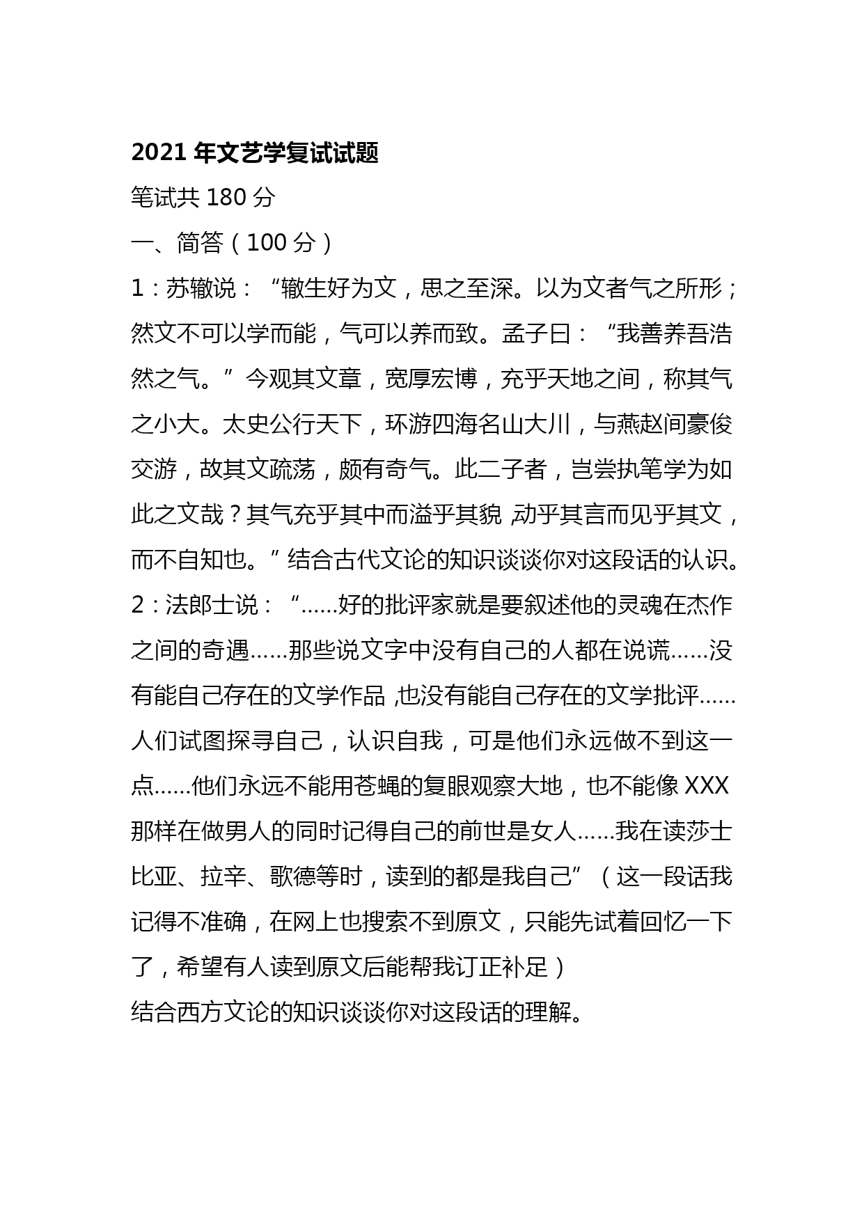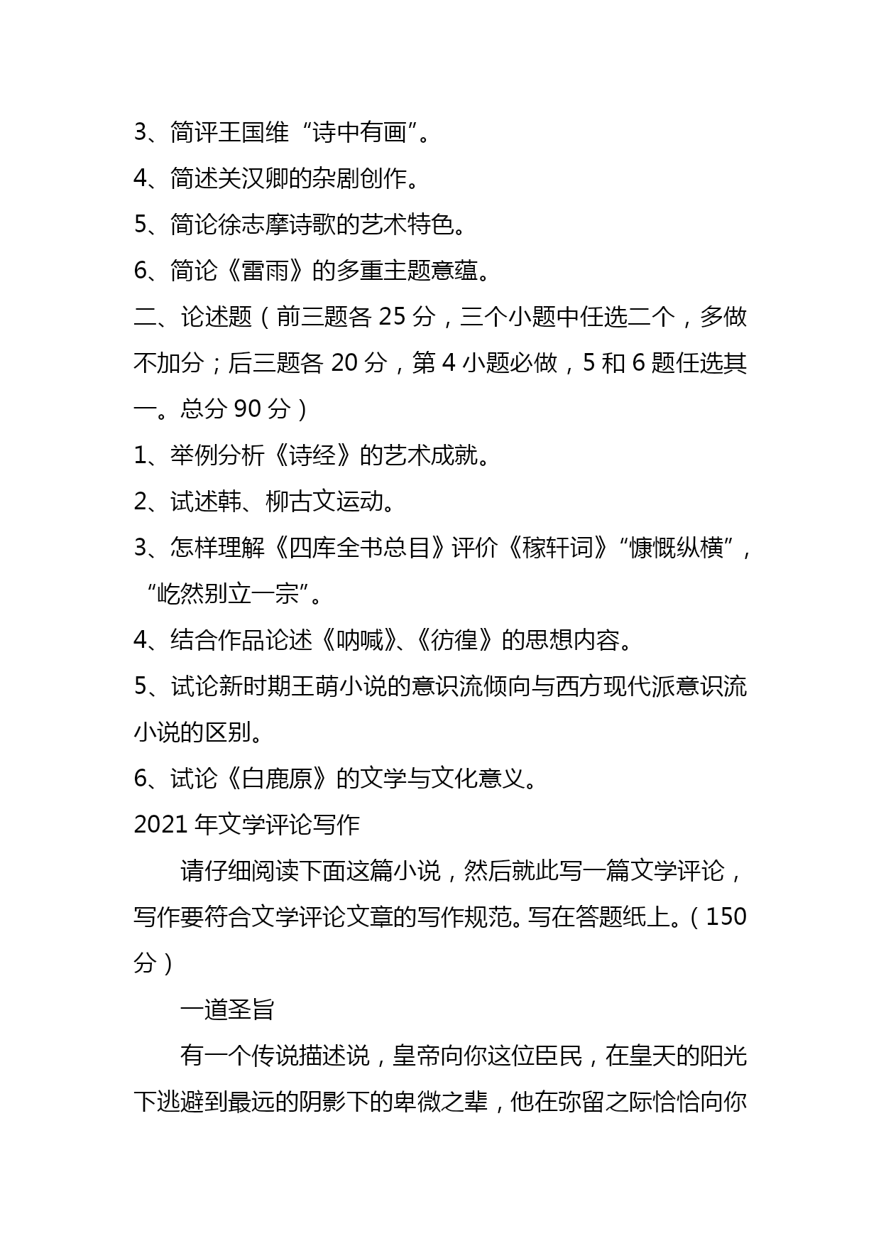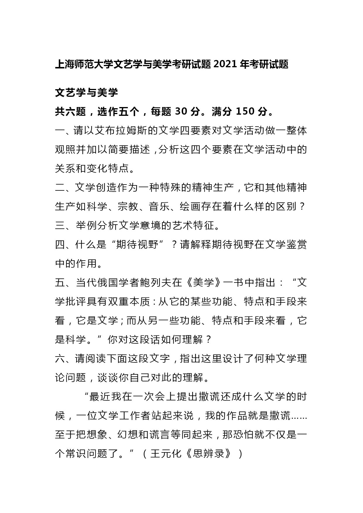 文艺学研究生入学考试试题(完整版)资料(可以直接使用,可编辑优秀版资料,欢迎下载)文艺学研究生入学考试试题山东大学2021年考研文艺学复试试题一、解词(20分)文学再现意境形式美创作个性二、简答(40分)1、如何理解广义的和狭义的主题?2、文学批评的中介作用表现在哪些方面?3、美学研究的对象是什么?4、以物质手段作为艺术分类的标志有哪些根据?三、论述(40分)1、举例说明文学语言的主要表达方式。2、如何理解艺术批评的标准?四川师范大学2021文艺学考研真题2021年中国文学卷子一、简述题(每题10分,共60分)1、简述先秦诸子主要学派及其代表人物与著作。2、简说《史记》《汉书》体例异同。3、简评王国维“诗中有画”。4、简述关汉卿的杂剧创作。5、简论徐志摩诗歌的艺术特色。6、简论《雷雨》的多重主题意蕴。二、论述题(前三题各25分,三个小题中任选二个,多做不加分;后三题各20分,第4小题必做,5和6题任选其一。总分90分)1、举例分析《诗经》的艺术成就。2、试述韩、柳古文运动。3、怎样理解《四库全书总目》评价《稼轩词》“慷慨纵横”,“屹然别立一宗”。4、结合作品论述《呐喊》、《彷徨》的思想内容。5、试论新时期王萌小说的意识流倾向与西方现代派意识流小说的区别。6、试论《白鹿原》的文学与文化意义。2021年文学评论写作请仔细阅读下面这篇小说,然后就此写一篇文学评论,写作要符合文学评论文章的写作规范。写在答题纸上。(150分)一道圣旨有一个传说描述说,皇帝向你这位臣民,在皇天的阳光下逃避到最远的阴影下的卑微之辈,他在弥留之际恰恰向你下了一道圣旨。他让使者跪在床前,悄声向他交代了旨意:皇帝如此重视他的渝令,以致还让使者在他耳根复述一遍。他点了点头,以示所述无误。他当着向他送终的满朝文武们——所有碍事的墙壁均已拆除,帝国的巨头们伫立在那摇摇晃晃的、又高又宽的玉墀之上,围成一圈——皇帝当着所有这些人派出了使者。使者立即出发。他是一个孔武有力、不知疲倦的人,一会儿伸出这只胳膊,一会儿伸出那只胳膊,左右开弓地在人群中开路,如果遇到抗拒,他便指一指胸前那标志着皇天的太阳,这样,他就能如入无人之境,快步向前。但是人口这样众多,他们的家屋无止无休。如果是空旷的原野,他便会迅步如飞,那么不久你便会听到他响亮的敲门声。但事实却不是这样,他的力量白费一场:他仍一直奋力地穿越内宫的殿堂,他永远也通不过去,即便他通过去了,那也无济于事:下台阶他还得经过奋斗,如果成功,仍无济于事;还有许多庭院必须走遍;过了这些庭院还有第二圈宫阙;接着又是石阶和庭院;然后又是一层宫阙;如此重重复重重,几千年也走不完,也就是最后冲出了最外边的大门——但这是决计不会发生的事情——,面临的首先是帝都,这世界的中心,其中的垃圾已堆积如山。没有人在这里拼命挤了,即便有,则他所携带的也是一个死人的圣旨。——但当夜幕降临时,你正坐在窗边遐想呢。北师大文学院文艺学方向复试试题2021年文艺学复试试题笔试共180分一、简答(100分)1:苏辙说:“辙生好为文,思之至深。以为文者气之所形;然文不可以学而能,气可以养而致。孟子曰:“我善养吾浩然之气。”今观其文章,宽厚宏博,充乎天地之间,称其气之小大。太史公行天下,环游四海名山大川,与燕赵间豪俊交游,故其文疏荡,颇有奇气。此二子者,岂尝执笔学为如此之文哉?其气充乎其中而溢乎其貌,动乎其言而见乎其文,而不自知也。”结合古代文论的知识谈谈你对这段话的认识。2:法郎士说:“……好的批评家就是要叙述他的灵魂在杰作之间的奇遇……那些说文字中没有自己的人都在说谎……没有能自己存在的文学作品,也没有能自己存在的文学批评……人们试图探寻自己,认识自我,可是他们永远做不到这一点……他们永远不能用苍蝇的复眼观察大地,也不能像XXX那样在做男人的同时记得自己的前世是女人……我在读莎士比亚、拉辛、歌德等时,读到的都是我自己”(这一段话我记得不准确,在网上也搜索不到原文,只能先试着回忆一下了,希望有人读到原文后能帮我订正补足)结合西方文论的知识谈谈你对这段话的理解。二、阅读以下文本,写一篇文学批评,字数1000字以上。(80分)(选文是老舍的《断魂枪》,此处不赘)2021年文艺学复试试题笔试:1、50分《天末怀李白》凉风起天末,君子意如何?鸿雁几时到?江湖秋水多。文章憎命达,魑魅喜人过。应共冤魂语,投诗赠汨罗。结合你所了解的文论知识,谈谈对“文章憎命达”的理解?2、50分伊格尔顿《20世纪西方文学理论》中,关于后结构主义,学生运动从街头消失,转到地下去了——语言领域……就此谈谈你的理解?3、文学评论,不少于1000字,文章是《最后一班地铁》2021年文艺学复试试题一、简述题