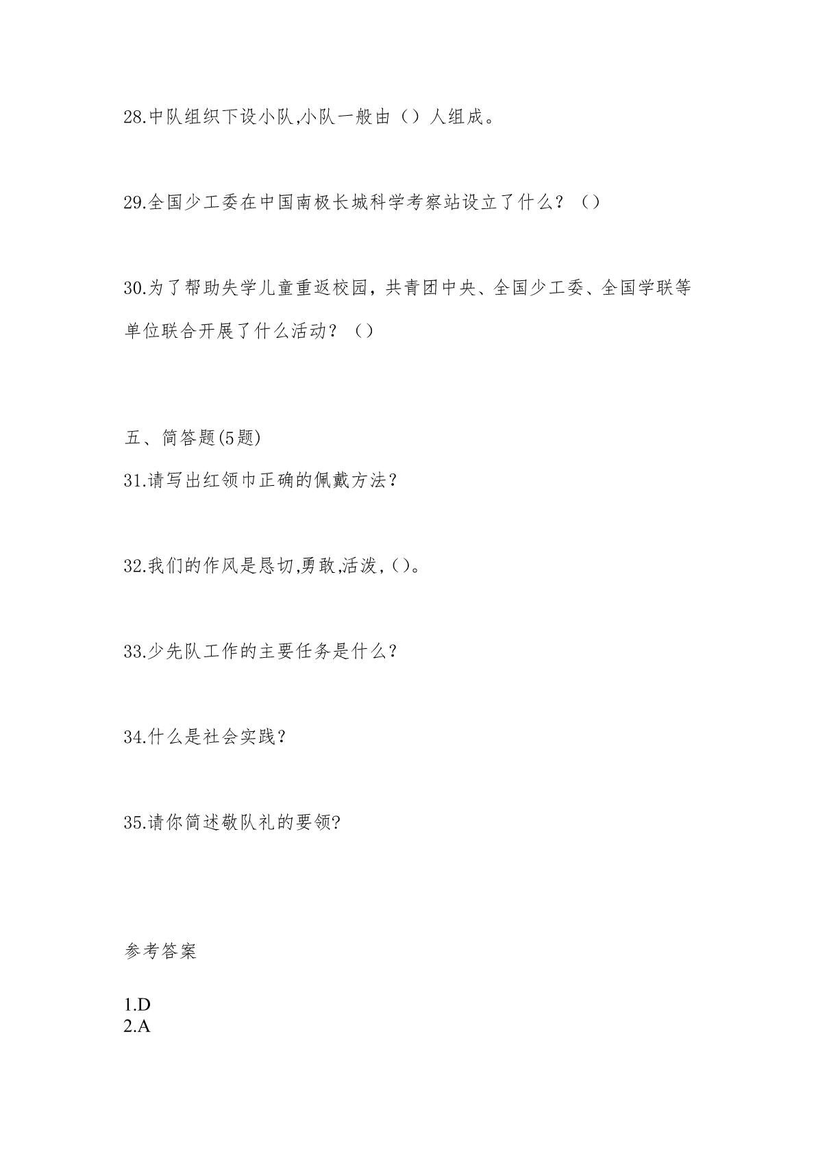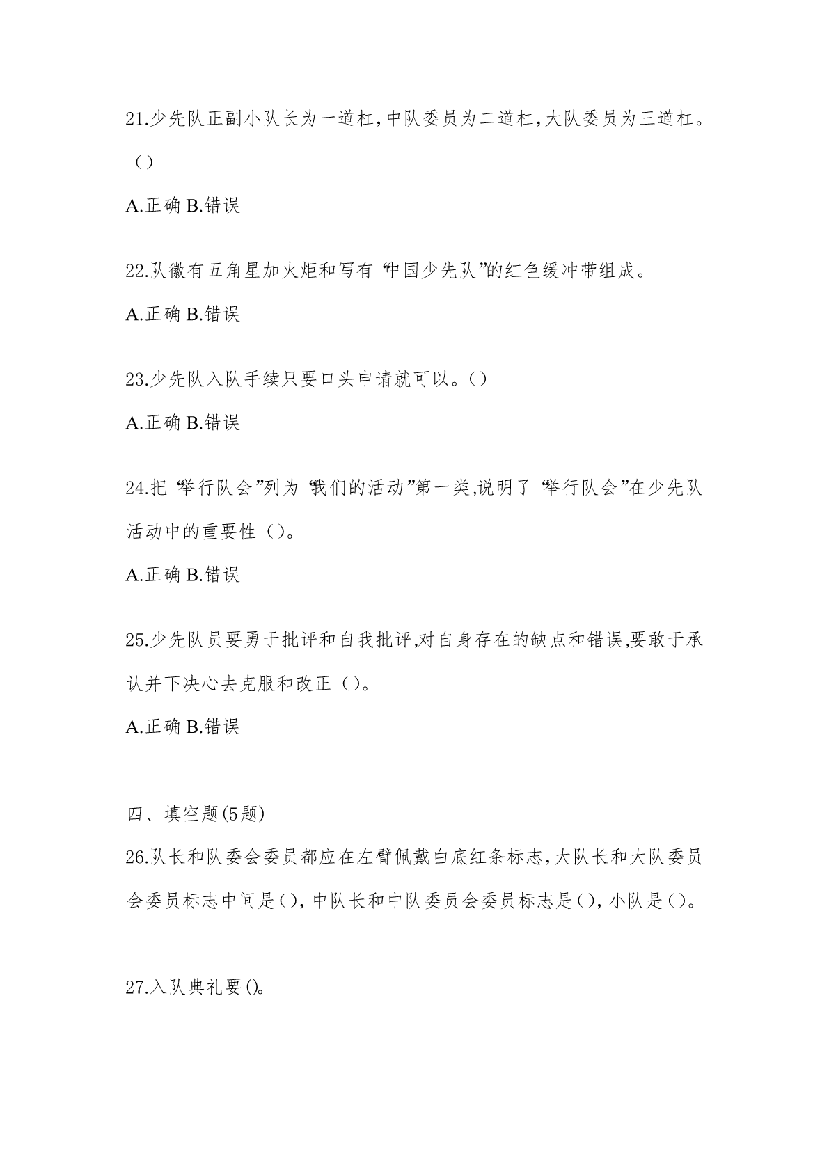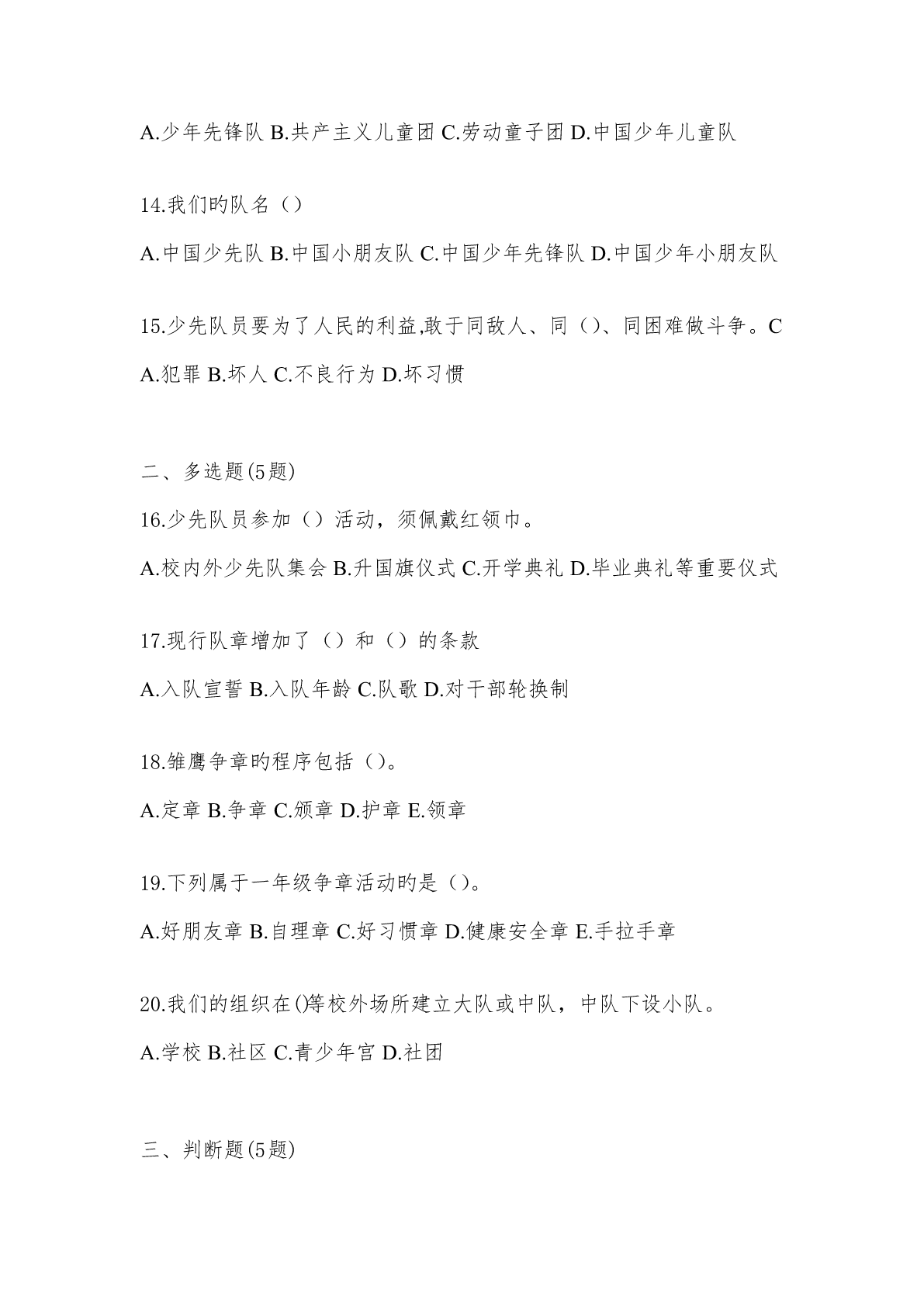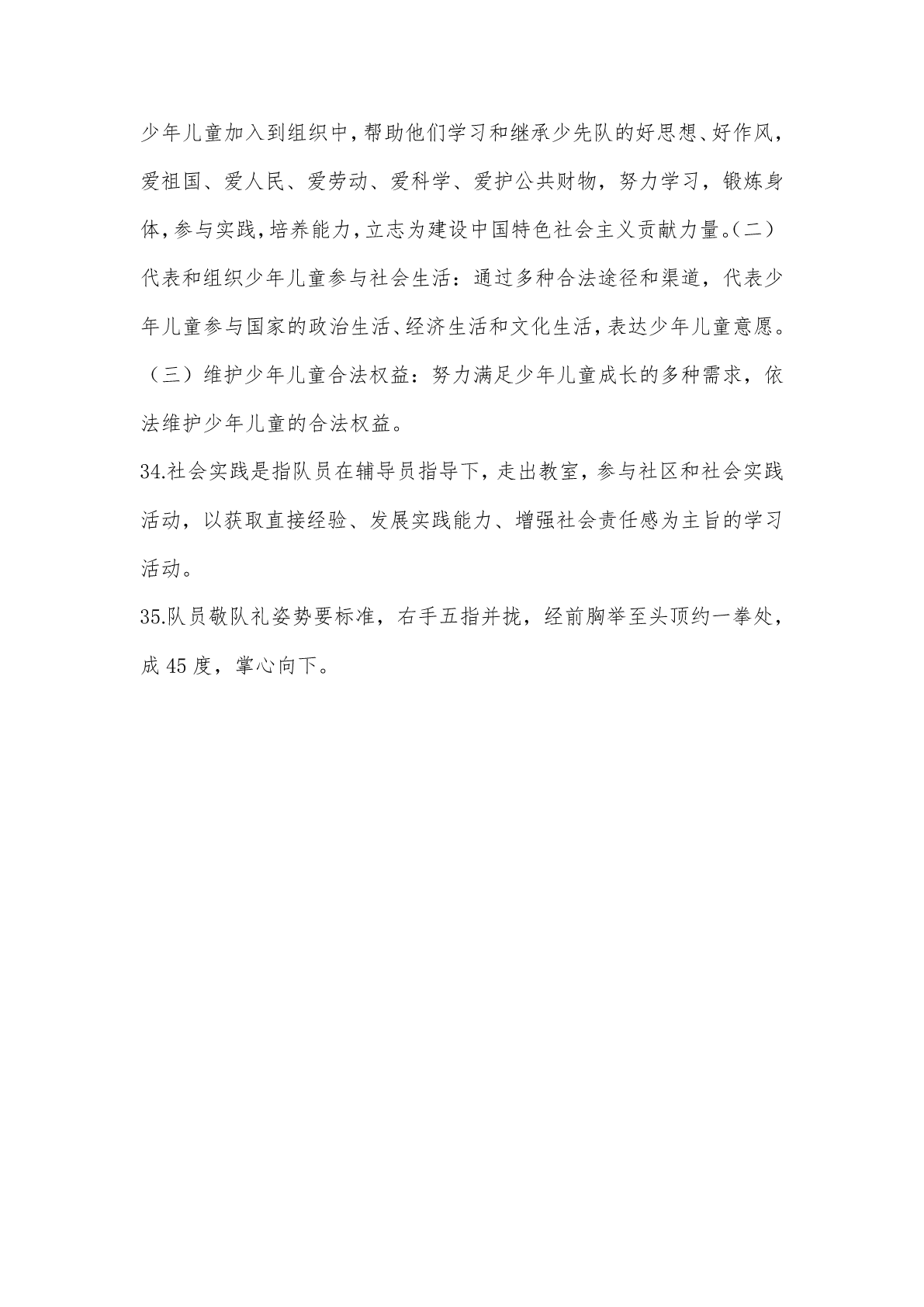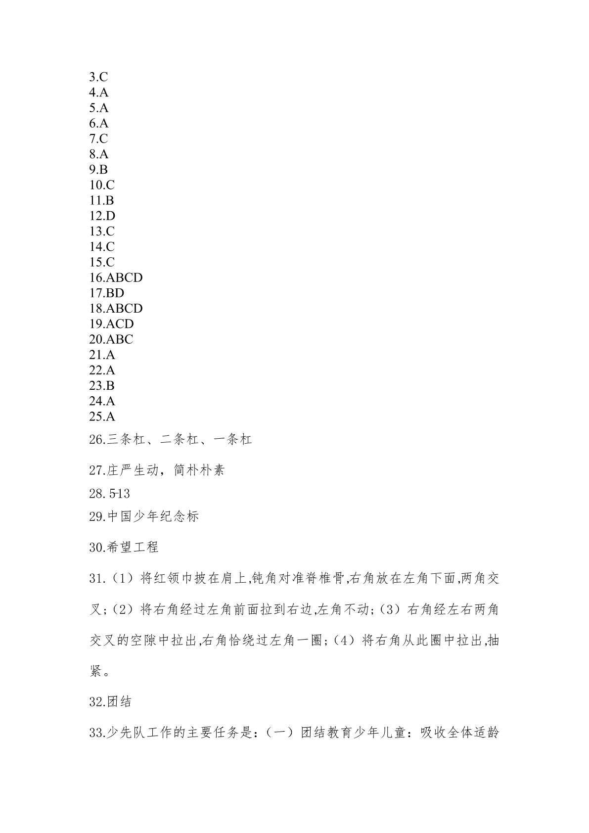 2024年度少先队知识竞赛题(含答案)学校:________班级:________姓名:________考号:________一、单选题(15题)1.现行《中国少年先锋队章程》是2020年7月24日经中国少年先锋队第()次全国代表大会部分修改后通过的。A.5次B.6次C.7次D.8次2.小甲A足球活动的基本理念是()。A.体验足球,快乐长大B.用心出智慧,配合有力量,顽强能进步C.激情欣赏,文明表达3.在少先队集会时,应由谁来带领队员呼号()A.大队长B.中队长C.辅导员D.小队长4.列队举持国旗和其他旗帜行进时,国旗应当在其他旗帜()。A.之前B.中间C.之上5.少先队呼号前后两句的含义:()。A.前一句:理想或目标后一句:决心与行动B.前一句:决心与行动后一句:理想或目标C.前一句:辅导员号召后一句:少先队员决心D.前一句:少先队员决心后一句:辅导员号召6.每天升旗手在升旗或降旗时,如果你正在操场上走动、玩耍、扫地或准备回家,此时你会怎么做?()A.立正敬礼B.装做没看见C.继续做自己的事情D.不知道7.少先队员应该在少先队活动中充分发挥()。A.配合作用B.帮助作用C.主人翁的作用D.榜样作用8.七年级少先队工作的基本目标是做好少先队与共青团的衔接,积极争取加入共青团。A.正确B.错误9.我们的队徽是()A.火炬B.五角星加火炬和写有“中国少先队”的红色绶带C.五角星加火炬D.五角星加火炬的红旗10.优秀的少先队员可以由队组织推荐作为()的发展对象。A.中国少先队B.中国儿童队C.共青团11.中队辅导员一般都由()兼任。A.任课老师B.班主任C.优秀团员12.每个队员都要(),服从队的决议,积极参加队的活动,做好队交给的工作,热心为大家服务。A.服从组织B.努力学习C.履行义务D.遵守纪律13.1924年到1927年北伐战争时期建立的儿童组织是:()。A.少年先锋队B.共产主义儿童团C.劳动童子团D.中国少年儿童队14.我们旳队名()A.中国少先队B.中国小朋友队C.中国少年先锋队D.中国少年小朋友队15.少先队员要为了人民的利益,敢于同敌人、同()、同困难做斗争。CA.犯罪B.坏人C.不良行为D.坏习惯二、多选题(5题)16.少先队员参加()活动,须佩戴红领巾。A.校内外少先队集会B.升国旗仪式C.开学典礼D.毕业典礼等重要仪式17.现行队章增加了()和()的条款A.入队宣誓B.入队年龄C.队歌D.对干部轮换制18.雏鹰争章旳程序包括()。A.定章B.争章C.颁章D.护章E.领章19.下列属于一年级争章活动旳是()。A.好朋友章B.自理章C.好习惯章D.健康安全章E.手拉手章20.我们的组织在()等校外场所建立大队或中队,中队下设小队。A.学校B.社区C.青少年宫D.社团三、判断题(5题)21.少先队正副小队长为一道杠,中队委员为二道杠,大队委员为三道杠。()A.正确B.错误22.队徽有五角星加火炬和写有“中国少先队”的红色缓冲带组成。A.正确B.错误23.少先队入队手续只要口头申请就可以。()A.正确B.错误24.把“举行队会”列为“我们的活动”第一类,说明了“举行队会”在少先队活动中的重要性()。A.正确B.错误25.少先队员要勇于批评和自我批评,对自身存在的缺点和错误,要敢于承认并下决心去克服和改正()。A.正确B.错误四、填空题(5题)26.队长和队委会委员都应在左臂佩戴白底红条标志,大队长和大队委员会委员标志中间是(),中队长和中队委员会委员标志是(),小队是()。27.入队典礼要()。28.中队组织下设小队,小队一般由()人组成。29.全国少工委在中国南极长城科学考察站设立了什么?()30.为了帮助失学儿童重返校园,共青团中央、全国少工委、全国学联等单位联合开展了什么活动?()五、简答题(5题)31.请写出红领巾正确的佩戴方法?32.我们的作风是恳切,勇敢,活泼,()。33.少先队工作的主要任务是什么?34.什么是社会实践?35.请你简述敬队礼的要领?参考答案1.D2.A3.C4.A5.A6.A7.C8.A9.B10.C11.B12.D13.C14.C15.C16.ABCD17.BD18.ABCD19.ACD20.ABC21.A22.A23.B24.A25.A26.三条杠、二条杠、一条杠27
