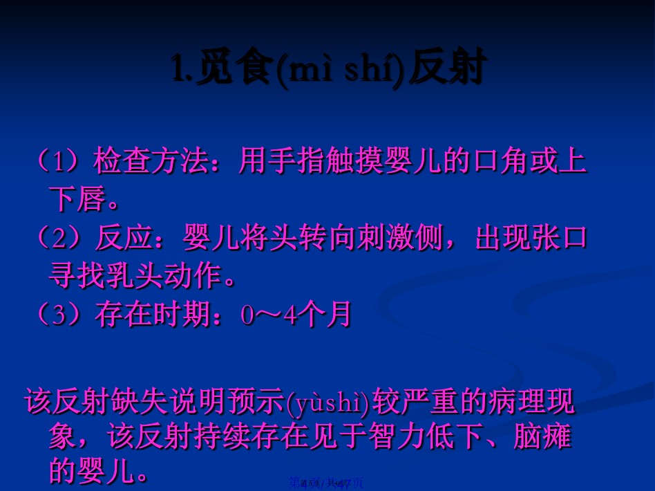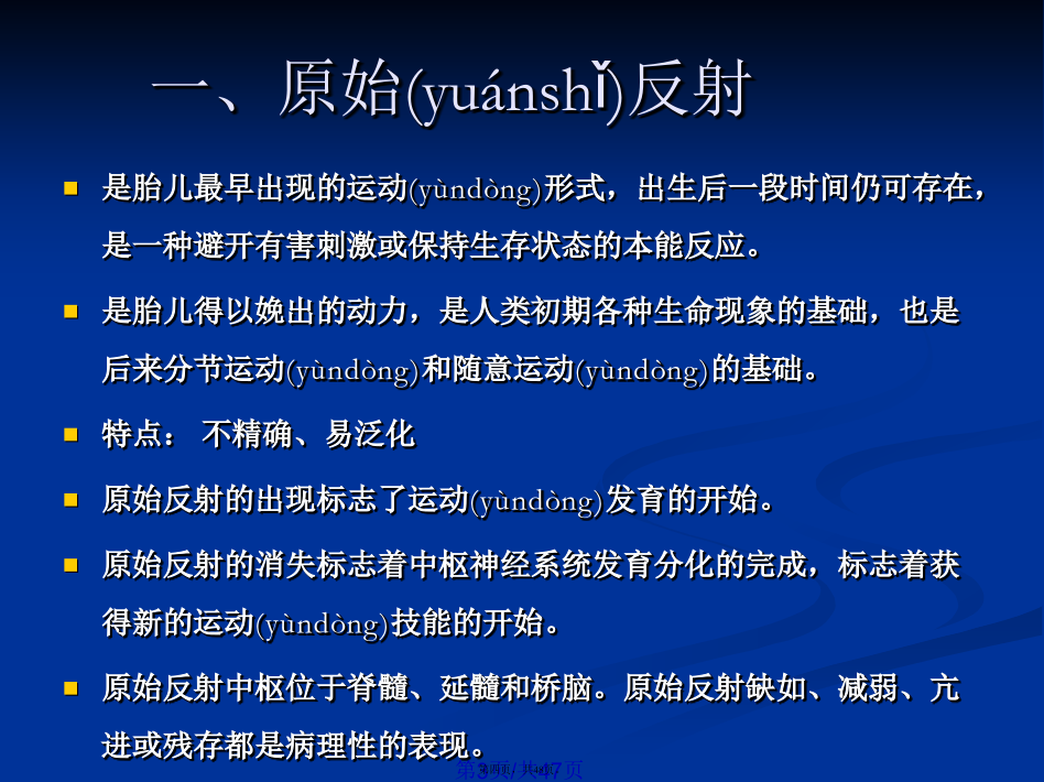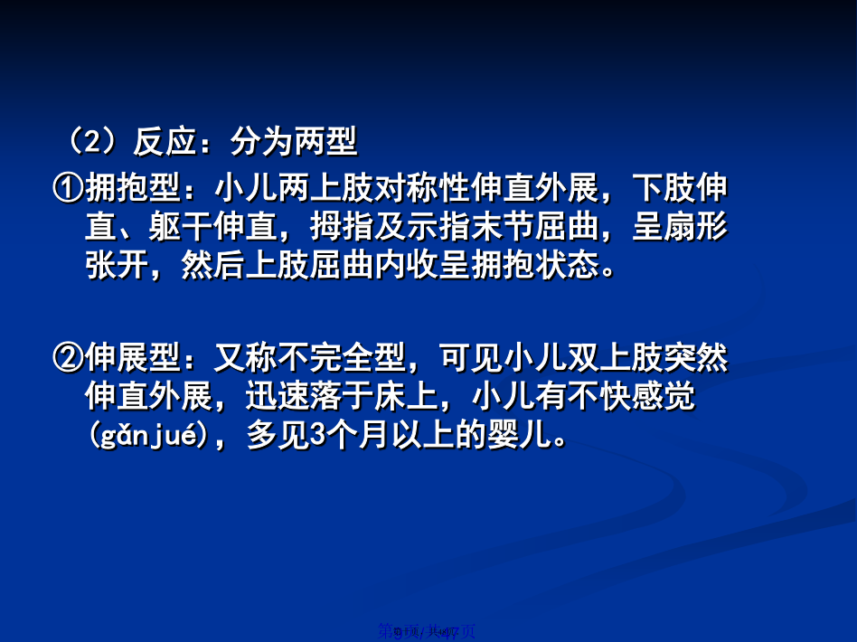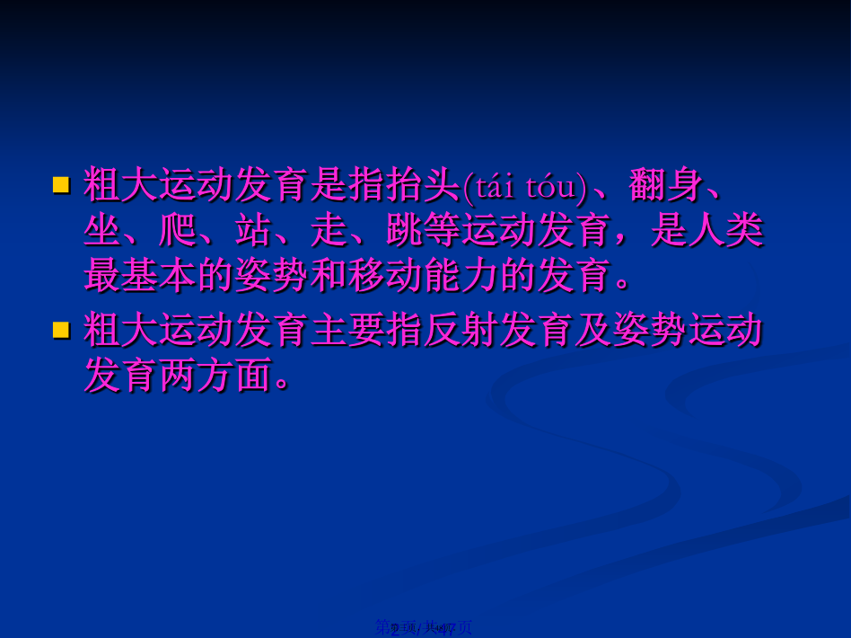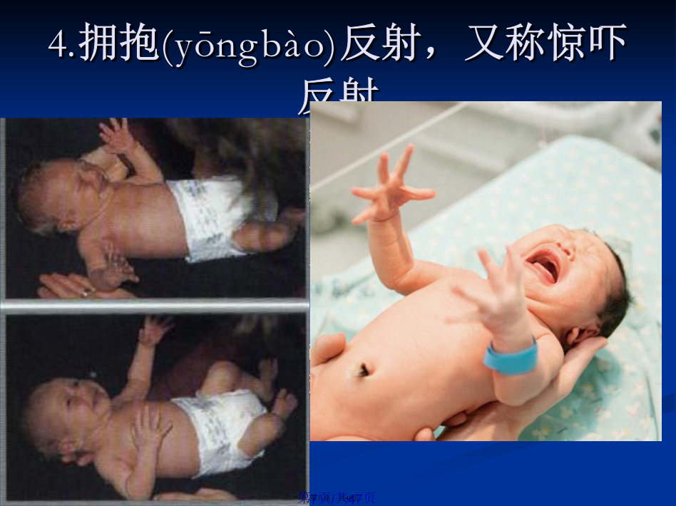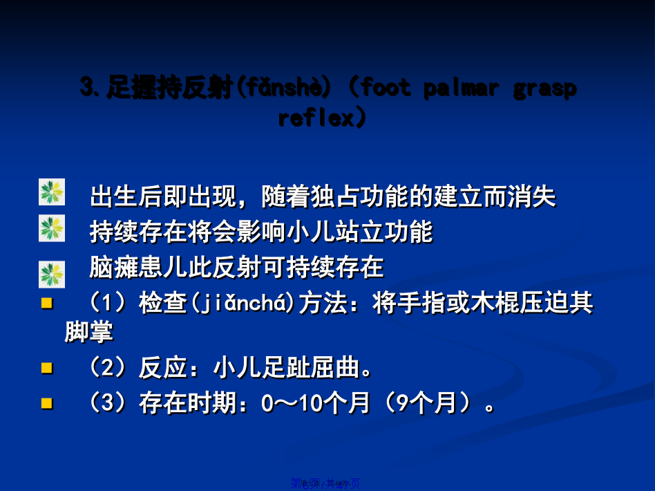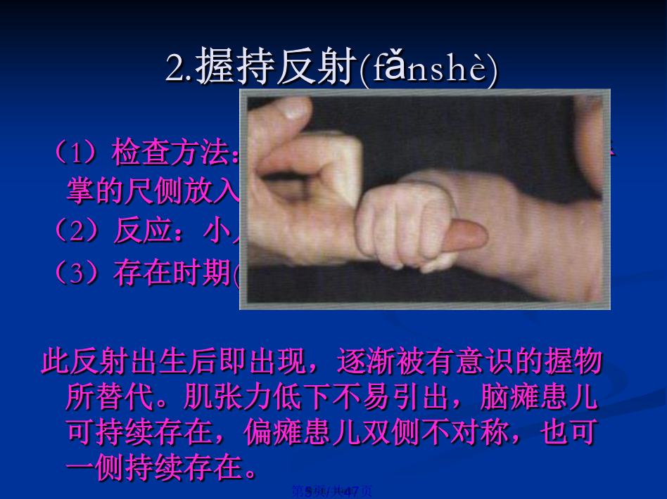 会计学教学要求:粗大运动发育是指抬头(táitóu)、翻身、坐、爬、站、走、跳等运动发育,是人类最基本的姿势和移动能力的发育。粗大运动发育主要指反射发育及姿势运动发育两方面。一、原始(yuánshǐ)反射1.觅食(mìshí)反射2.握持反射(fǎnshè)出生后即出现,随着独占功能的建立而消失持续存在将会影响小儿站立功能脑瘫患儿此反射可持续存在(1)检查(jiǎnchá)方法:将手指或木棍压迫其脚掌(2)反应:小儿足趾屈曲。(3)存在时期:0~10个月(9个月)。4.拥抱(yōngbào)反射,又称惊吓反射(1)检查方法:小儿(xiǎoér)呈仰卧位,5种引出的方法①声法:用力敲打床边附近发出声音②落法:抬高小儿(xiǎoér)头部15cm后下落③托法:平托起小儿(xiǎoér),令头部向后倾斜10°~15°④弹足法:用手指轻弹小儿(xiǎoér)足底⑤拉手法:拉小儿(xiǎoér)双手慢慢抬起,当肩部略微离开桌面(头并未离开桌面)时,突然将手抽出(2)反应:分为两型①拥抱型:小儿两上肢对称性伸直外展,下肢伸直、躯干伸直,拇指及示指末节屈曲,呈扇形张开,然后上肢屈曲内收呈拥抱状态。②伸展型:又称不完全型,可见小儿双上肢突然伸直外展,迅速落于床上,小儿有不快感觉(gǎnjué),多见3个月以上的婴儿。(3)存在时期:拥抱(yōngbào)型0~3个月伸展型4~6个月仰卧位紧张性迷路(mílù)反射(TLR-S)俯卧位紧张性迷路(mílù)反射(TLR-P)6、非对称性紧张性颈反射(fǎnshè)(ATNR)对称性紧张性颈反射(fǎnshè)(symmetricaltonicneckreflex,STNR)7、躯干(qūgàn)内弯反射(侧弯反射)8、自动站立和行走(xíngzǒu)反射(踏步反射)9、咬合(yǎohé)反射10、交叉伸展(shēnzhǎn)反射11、颈部(jǐnɡbù)翻正反射张口(zhāngkǒu)反射(Babkin)上肢移位(yíwèi)反射(armpassagereflex)阳性(yángxìng)支持反射(positivesupportingreflex)原始反射出现及存在(cúnzài)时间二、姿势(zīshì)与移动运动发育姿势与移动(yídòng)运动发育1.姿势(zīshì)维持期2.移动(yídòng)准备期3.屈膝(qūxī)坐位期4.屈膝(qūxī)站立期姿势运动发育(fāyù)的特点1.头向一侧或正中、屈曲(1个月)2.头向一侧或回旋、伸展(shēnzhǎn)(2个月)3.非对称伸展(shēnzhǎn)、翻身(3~4个月)4.屈曲、手口眼协(5~6个月)5.四肢自由伸展(shēnzhǎn)(8~9个月)婴儿仰卧位运动(yùndòng)发育特点姿势运动(yùndòng)发育的特点1.TLR姿势,瞬间(shùnjiān)抬头(1个月)2.臀头同高,TLR姿势,瞬间(shùnjiān)抬头(2个月)3.抬头45度,两肘支撑(3个月)4.抬头45度~90度,胸离床(4个月)5.抬头90度两手支撑(5~6个月)6.腹爬(8个月)7.四爬(10个月)8.高爬(11个月)姿势运动(yùndòng)发育的特点1.全前倾(1个月)2.半前倾(2~3个月)3.扶腰坐(4~5个月)4.拱背坐(6个月)5.直腰坐(7个月)6.扭身坐(8个月)7.坐位(zuòwèi)自由玩(9个月)姿势运动发育(fāyù)的特点1.阳性支持反射(1个月)2.不支持(2个月)3.短暂(duǎnzàn)支持(3个月)4.尖足支持(4个月)5.立位跳跃(5~6个月)6.扶站(7~8个月)7.独站(10个月)8.牵手走(11个月)9.独走(12个月)6.双足步行(bùxíng)期(12个月后)姿势(zīshì)运动发育的特点姿势运动发育(fāyù)的顺序与特点6项1岁以后:上台阶手抓扶杆15个月脱离扶杆3岁连续双足交替(jiāotì)登楼梯5-6岁下楼梯上下楼梯:平地上的跑、跳(2岁)、下跳(3岁)、单足站立(3岁半)、跳着走(5岁)年龄婴幼儿粗大运动发育(fāyù)特点作业(zuòyè)感谢您的观看(guānkàn)。