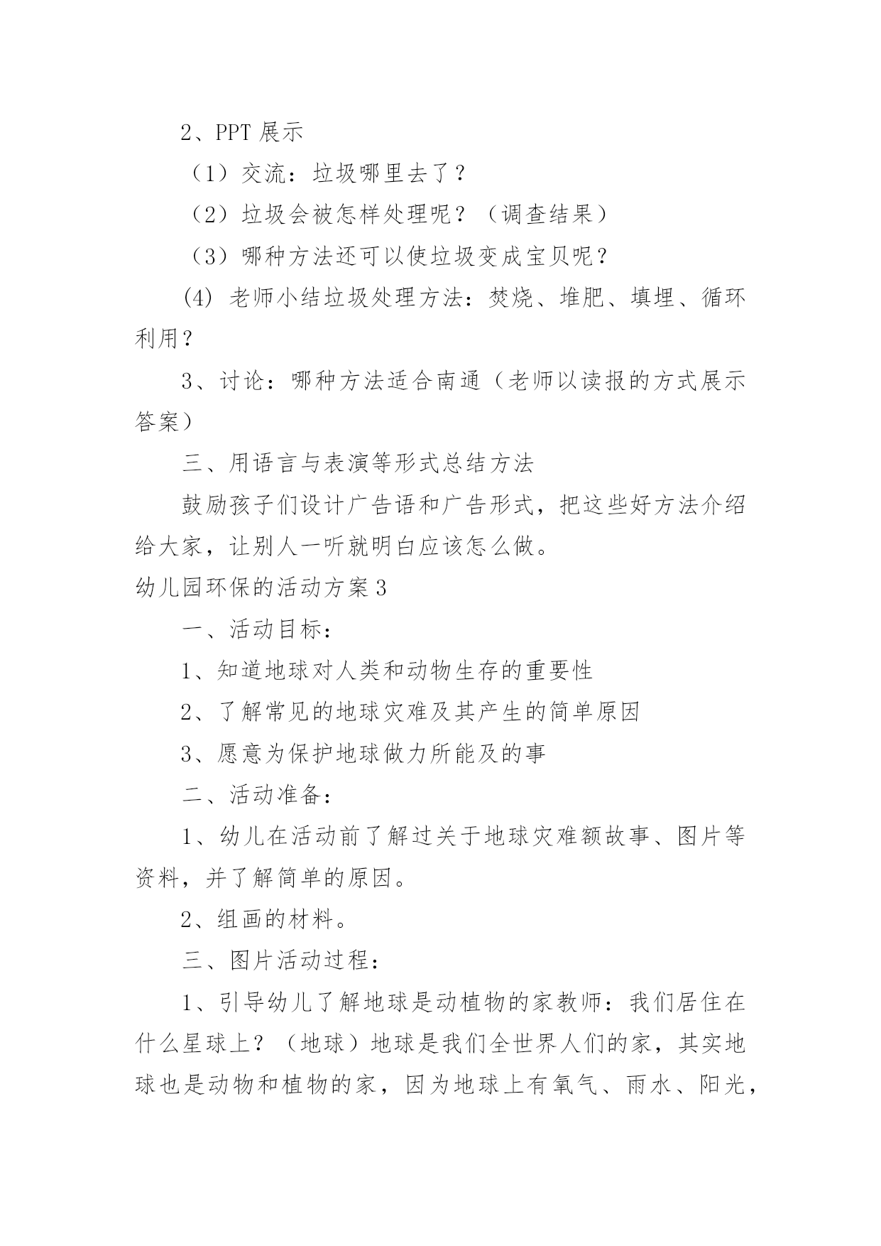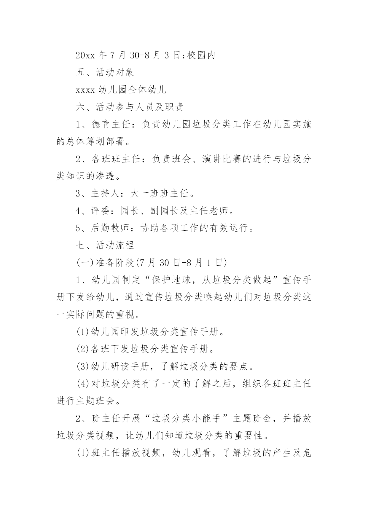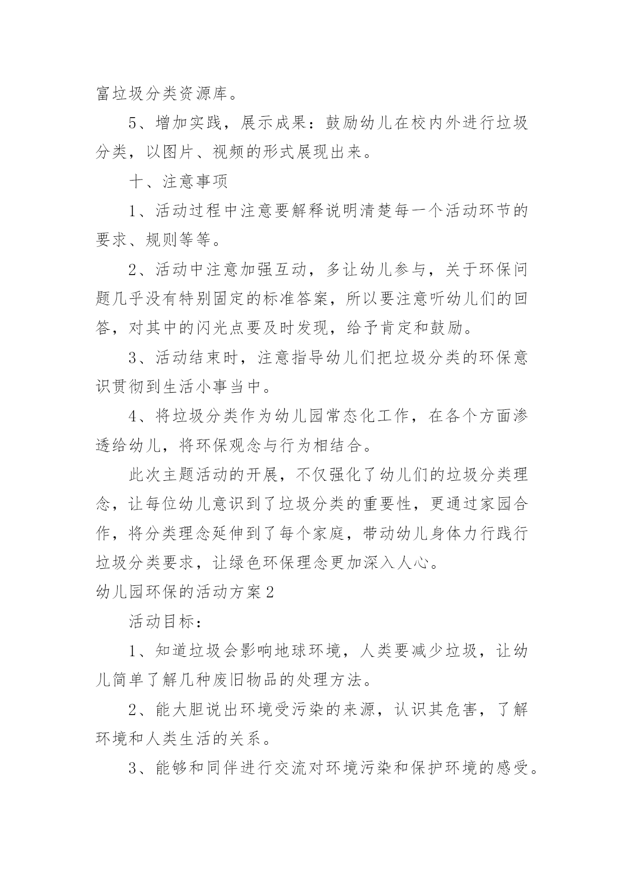 幼儿园环保的活动方案幼儿园环保的活动方案为了确保事情或工作扎实开展,常常需要预先准备方案,方案是阐明行动的时间,地点,目的,预期效果,预算及方法等的书面计划。我们应该怎么制定方案呢?下面是小编帮大家整理的幼儿园环保的活动方案,希望对大家有所帮助。幼儿园环保的活动方案1一、活动背景由于农村幼儿垃圾分类意识薄弱,乱扔垃圾现象频出,为树立幼儿的环保意识,以保护环境为目的,培养“垃圾分类,从我做起”的意识,根据本园实际情况,特制订垃圾分类实施方案。二、活动目的本实践活动通过幼儿亲身去参与到垃圾分类活动中,培养幼儿良好的生活习惯,通过宣传垃圾分类的意义提升幼儿们对垃圾分类这一实际问题的重视;宣传分类垃圾的具体做法,引导幼儿们正确地进行垃圾分类,保护环境;最后以标记垃圾桶等方式提醒幼儿们时刻注意垃圾分类回收问题。从而热爱周围环境,进而达到热爱大自然的目的。三、活动主题学会垃圾分类,争做环保卫士四、活动时间及地点20xx年7月30-8月3日;校园内五、活动对象xxxx幼儿园全体幼儿六、活动参与人员及职责1、德育主任:负责幼儿园垃圾分类工作在幼儿园实施的总体筹划部署。2、各班班主任:负责班会、演讲比赛的进行与垃圾分类知识的渗透。3、主持人:大一班班主任。4、评委:园长、副园长及主任老师。5、后勤教师:协助各项工作的有效运行。七、活动流程(一)准备阶段(7月30日-8月1日)1、幼儿园制定“保护地球,从垃圾分类做起”宣传手册下发给幼儿,通过宣传垃圾分类唤起幼儿们对垃圾分类这一实际问题的重视。(1)幼儿园印发垃圾分类宣传手册。(2)各班下发垃圾分类宣传手册。(3)幼儿研读手册,了解垃圾分类的要点。(4)对垃圾分类有了一定的了解之后,组织各班班主任进行主题班会。2、班主任开展“垃圾分类小能手”主题班会,并播放垃圾分类视频,让幼儿们知道垃圾分类的重要性。(1)班主任播放视频,幼儿观看,了解垃圾的产生及危害。(2)幼儿讨论:常见的垃圾有哪些?垃圾的种类有哪些?如何进行分类?(3)幼儿对垃圾分类有了进一步的了解之后,进行知识储备,为演讲比赛做准备。(二)实施阶段(8月2日-8月3日)1、全园范围内进行“垃圾分类我最棒”演讲,使幼儿们了解生活中有哪些垃圾,知道垃圾分类的意义和标准。(1)各班在本班内抽签决定演讲顺序。(2)各班在班级内角逐出演讲比赛前5名,进入全园演讲比赛。(3)德育主任讲话阐述进行垃圾分类的'意义。(4)比赛选手赛前抽签。(5)主持人讲话进行选手介绍。(6)后勤老师负责播放音乐。(7)评委打分,比赛结束。(8)主持人进行活动总结。2、幼儿园发动全体幼儿进行“清洁小行家”实践活动,检验准备活动阶段的效果,通过对校园内的垃圾回收和分类,并在日常生活中让垃圾分类逐渐成为一种习惯。(1)班主任带领本班幼儿进行本班担当区的垃圾回收。(2)各班幼儿将自己捡到的垃圾进行分类。(3)班主任带领全班幼儿进行“分类小专家”经验分享会,请各小组派代表轮流上讲台汇报各自小组的垃圾分类方法,在讨论中巩固垃圾分类的知识。(4)班主任总结垃圾分类的重要性。(5)各班下发垃圾分类活动宣誓书。八、活动延伸1、各班班主任高度重视“垃圾分类”教育教学,将环保意识融入到教育教学当中,把“垃圾分类”纳入到平时幼儿的学习中。并布置“居家小能手”课后作业,将垃圾分类的视频上传班级群。2、教师进行各领域教学互相渗透,在艺术领域编制“垃圾分类童谣”,绘制垃圾分类宣传海报等。3、各班幼儿根据活动主题,绘制“垃圾分类我先行”手抄报,布置班级文化墙,在潜移默化中向幼儿们渗透垃圾分类,了解可回收垃圾、生活垃圾和有害垃圾都包括哪些,从而引导幼儿重视环境保护。九、具体要求1、前期动员,形成氛围:幼儿园宣传通过红领巾广播站、国旗下讲话、课间小结的形式将垃圾分类的理念传达给幼儿。2、形成计划,及时反馈:每个学期做好班级“垃圾分类”计划、总结,在活动过程中反馈垃圾分类的效果,如出现问题及时调。3、隐性教育,日益熏陶:利用每期的幼儿园主题墙进行宣传,开辟相关“垃圾分类”板块。4、资料收集,整理共享:幼儿园、家长内外联动,丰富垃圾分类资源库。5、增加实践,展示成果:鼓励幼儿在校内外进行垃圾分类,以图片、视频的形式展现出来。十、注意事项1、活动过程中注意要解释说明清楚每一个活动环节的要求、规则等等。2、活动中注意加强互动,多让幼儿参与,关于环保问题几乎没有特别固定的标准答案,所以要注意听幼儿们的回答,对其中的闪光点要及时发现,给予肯定和鼓励。3、活动结束时,注意指导幼儿们把垃圾分类的环保意识贯彻到生活小事当中。4、将垃圾分类作为幼儿园常态化工作,在各个方面渗透给幼儿,将环保观念与行为相结合。此次主题活动的开展,不仅强化了幼儿们的垃圾分类理念,让每位幼儿意识到了垃圾分类的重要性,更通过家园合作,将分类理念延伸