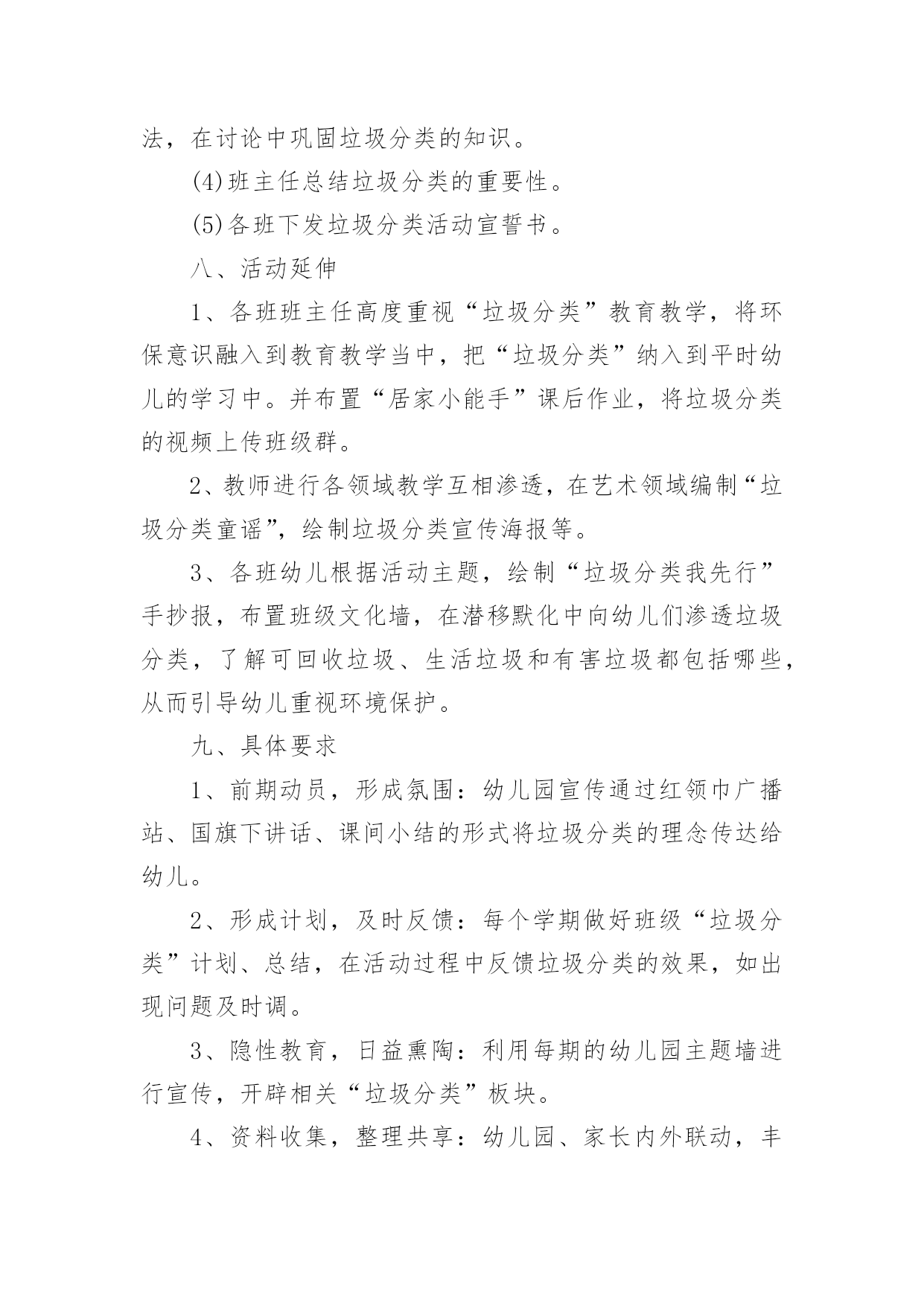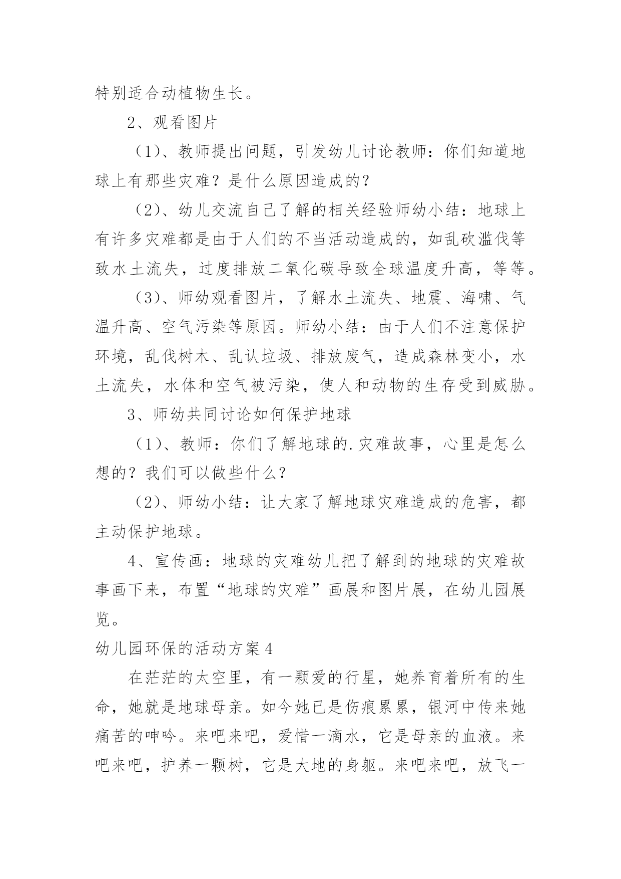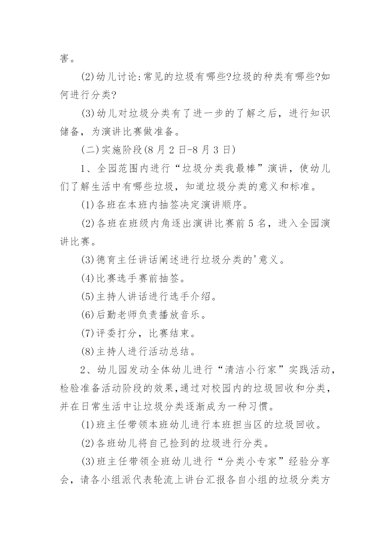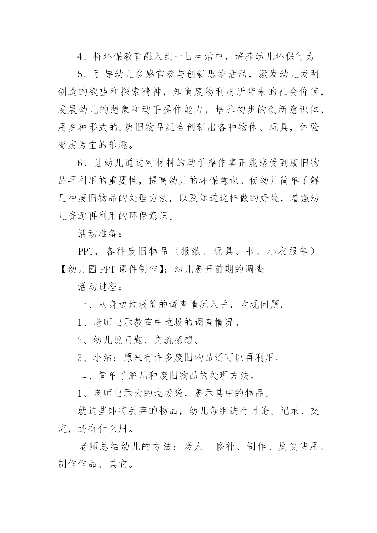 幼儿园环保的活动方案幼儿园环保的活动方案为了确保事情或工作扎实开展,常常需要预先准备方案,方案是阐明行动的时间,地点,目的,预期效果,预算及方法等的书面计划。我们应该怎么制定方案呢?下面是小编帮大家整理的幼儿园环保的活动方案,希望对大家有所帮助。幼儿园环保的活动方案1一、活动背景由于农村幼儿垃圾分类意识薄弱,乱扔垃圾现象频出,为树立幼儿的环保意识,以保护环境为目的,培养“垃圾分类,从我做起”的意识,根据本园实际情况,特制订垃圾分类实施方案。二、活动目的本实践活动通过幼儿亲身去参与到垃圾分类活动中,培养幼儿良好的生活习惯,通过宣传垃圾分类的意义提升幼儿们对垃圾分类这一实际问题的重视;宣传分类垃圾的具体做法,引导幼儿们正确地进行垃圾分类,保护环境;最后以标记垃圾桶等方式提醒幼儿们时刻注意垃圾分类回收问题。从而热爱周围环境,进而达到热爱大自然的目的。三、活动主题学会垃圾分类,争做环保卫士四、活动时间及地点20xx年7月30-8月3日;校园内五、活动对象xxxx幼儿园全体幼儿六、活动参与人员及职责1、德育主任:负责幼儿园垃圾分类工作在幼儿园实施的总体筹划部署。2、各班班主任:负责班会、演讲比赛的进行与垃圾分类知识的渗透。3、主持人:大一班班主任。4、评委:园长、副园长及主任老师。5、后勤教师:协助各项工作的有效运行。七、活动流程(一)准备阶段(7月30日-8月1日)1、幼儿园制定“保护地球,从垃圾分类做起”宣传手册下发给幼儿,通过宣传垃圾分类唤起幼儿们对垃圾分类这一实际问题的重视。(1)幼儿园印发垃圾分类宣传手册。(2)各班下发垃圾分类宣传手册。(3)幼儿研读手册,了解垃圾分类的要点。(4)对垃圾分类有了一定的了解之后,组织各班班主任进行主题班会。2、班主任开展“垃圾分类小能手”主题班会,并播放垃圾分类视频,让幼儿们知道垃圾分类的重要性。(1)班主任播放视频,幼儿观看,了解垃圾的产生及危害。(2)幼儿讨论:常见的垃圾有哪些?垃圾的种类有哪些?如何进行分类?(3)幼儿对垃圾分类有了进一步的了解之后,进行知识储备,为演讲比赛做准备。(二)实施阶段(8月2日-8月3日)1、全园范围内进行“垃圾分类我最棒”演讲,使幼儿们了解生活中有哪些垃圾,知道垃圾分类的意义和标准。(1)各班在本班内抽签决定演讲顺序。(2)各班在班级内角逐出演讲比赛前5名,进入全园演讲比赛。(3)德育主任讲话阐述进行垃圾分类的'意义。(4)比赛选手赛前抽签。(5)主持人讲话进行选手介绍。(6)后勤老师负责播放音乐。(7)评委打分,比赛结束。(8)主持人进行活动总结。2、幼儿园发动全体幼儿进行“清洁小行家”实践活动,检验准备活动阶段的效果,通过对校园内的垃圾回收和分类,并在日常生活中让垃圾分类逐渐成为一种习惯。(1)班主任带领本班幼儿进行本班担当区的垃圾回收。(2)各班幼儿将自己捡到的垃圾进行分类。(3)班主任带领全班幼儿进行“分类小专家”经验分享会,请各小组派代表轮流上讲台汇报各自小组的垃圾分类方法,在讨论中巩固垃圾分类的知识。(4)班主任总结垃圾分类的重要性。(5)各班下发垃圾分类活动宣誓书。八、活动延伸1、各班班主任高度重视“垃圾分类”教育教学,将环保意识融入到教育教学当中,把“垃圾分类”纳入到平时幼儿的学习中。并布置“居家小能手”课后作业,将垃圾分类的视频上传班级群。2、教师进行各领域教学互相渗透,在艺术领域编制“垃圾分类童谣”,绘制垃圾分类宣传海报等。3、各班幼儿根据活动主题,绘制“垃圾分类我先行”手抄报,布置班级文化墙,在潜移默化中向幼儿们渗透垃圾分类,了解可回收垃圾、生活垃圾和有害垃圾都包括哪些,从而引导幼儿重视环境保护。九、具体要求1、前期动员,形成氛围:幼儿园宣传通过红领巾广播站、国旗下讲话、课间小结的形式将垃圾分类的理念传达给幼儿。2、形成计划,及时反馈:每个学期做好班级“垃圾分类”计划、总结,在活动过程中反馈垃圾分类的效果,如出现问题及时调。3、隐性教育,日益熏陶:利用每期的幼儿园主题墙进行宣传,开辟相关“垃圾分类”板块。4、资料收集,整理共享:幼儿园、家长内外联动,丰富垃圾分类资源库。5、增加实践,展示成果:鼓励幼儿在校内外进行垃圾分类,以图片、视频的形式展现出来。十、注意事项1、活动过程中注意要解释说明清楚每一个活动环节的要求、规则等等。2、活动中注意加强互动,多让幼儿参与,关于环保问题几乎没有特别固定的标准答案,所以要注意听幼儿们的回答,对其中的闪光点要及时发现,给予肯定和鼓励。3、活动结束时,注意指导幼儿们把垃圾分类的环保意识贯彻到生活小事当中。4、将垃圾分类作为幼儿园常态化工作,在各个方面渗透给幼儿,将环保观念与行为相结合。此次主题活动的开展,不仅强化了幼儿们的垃圾分类理念,让每位幼儿意识到了垃圾分类的重要性,更通过家园合作,将分类理念延伸