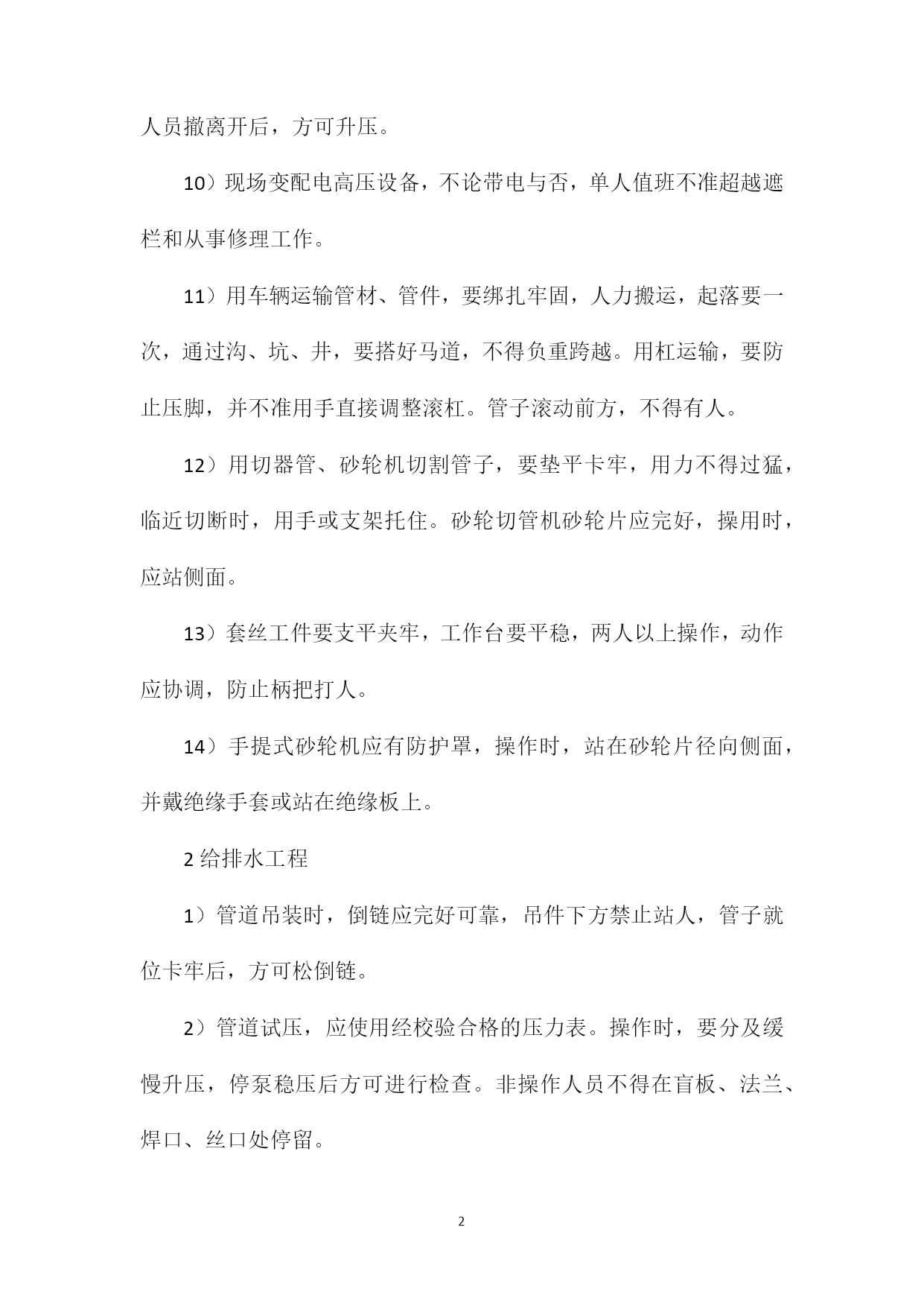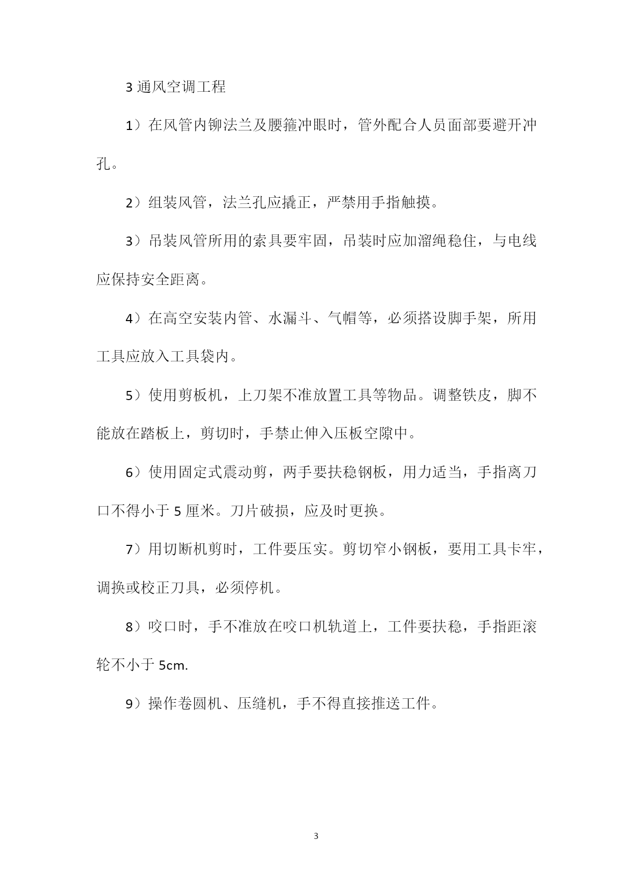 PAGEPAGE3建筑施工机电安装工程安全控制方法1电气工程1)所有绝缘、检验工具,应妥善保管,严禁他用,并应定期检查、校验。2)现场施工用高低压设备及线路,应按照施工设计及有关电气安全技术规程安装和架设。3)线路上禁止带负荷接电或断电,并禁止带电操作。4)有人触电,立即切断电源,进行急救;电气着火,应立即将有关电源切断,使用泡沫或干砂灭火。5)多台配电箱(盘)列安装时,手指不得放在两盘的接处,也不得触摸连接螺孔。6)剔槽打眼时,锤头不得松动,铲子应无卷边、裂纹、戴好防护眼镜。楼板、砖墙打透眼时,板下、墙后不得有人靠近。7)人力弯管器弯管,应选好场地,防止滑倒和附落,操作时面部要避开。8)安装照明线路不准直接在板条天棚或隔音板上通行及堆放材料。必须通行时,应在大楞上铺设脚手板。9)进行耐压试验装置的金属外壳须接地。被试设备或电缆两端,如不在同一地点另一端应有人看守或加锁。并对仪表、接线等查无误,人员撤离开后,方可升压。10)现场变配电高压设备,不论带电与否,单人值班不准超越遮栏和从事修理工作。11)用车辆运输管材、管件,要绑扎牢固,人力搬运,起落要一次,通过沟、坑、井,要搭好马道,不得负重跨越。用杠运输,要防止压脚,并不准用手直接调整滚杠。管子滚动前方,不得有人。12)用切器管、砂轮机切割管子,要垫平卡牢,用力不得过猛,临近切断时,用手或支架托住。砂轮切管机砂轮片应完好,操用时,应站侧面。13)套丝工件要支平夹牢,工作台要平稳,两人以上操作,动作应协调,防止柄把打人。14)手提式砂轮机应有防护罩,操作时,站在砂轮片径向侧面,并戴绝缘手套或站在绝缘板上。2给排水工程1)管道吊装时,倒链应完好可靠,吊件下方禁止站人,管子就位卡牢后,方可松倒链。2)管道试压,应使用经校验合格的压力表。操作时,要分及缓慢升压,停泵稳压后方可进行检查。非操作人员不得在盲板、法兰、焊口、丝口处停留。3通风空调工程1)在风管内铆法兰及腰箍冲眼时,管外配合人员面部要避开冲孔。2)组装风管,法兰孔应撬正,严禁用手指触摸。3)吊装风管所用的索具要牢固,吊装时应加溜绳稳住,与电线应保持安全距离。4)在高空安装内管、水漏斗、气帽等,必须搭设脚手架,所用工具应放入工具袋内。5)使用剪板机,上刀架不准放置工具等物品。调整铁皮,脚不能放在踏板上,剪切时,手禁止伸入压板空隙中。6)使用固定式震动剪,两手要扶稳钢板,用力适当,手指离刀口不得小于5厘米。刀片破损,应及时更换。7)用切断机剪时,工件要压实。剪切窄小钢板,要用工具卡牢,调换或校正刀具,必须停机。8)咬口时,手不准放在咬口机轨道上,工件要扶稳,手指距滚轮不小于5cm.9)操作卷圆机、压缝机,手不得直接推送工件。