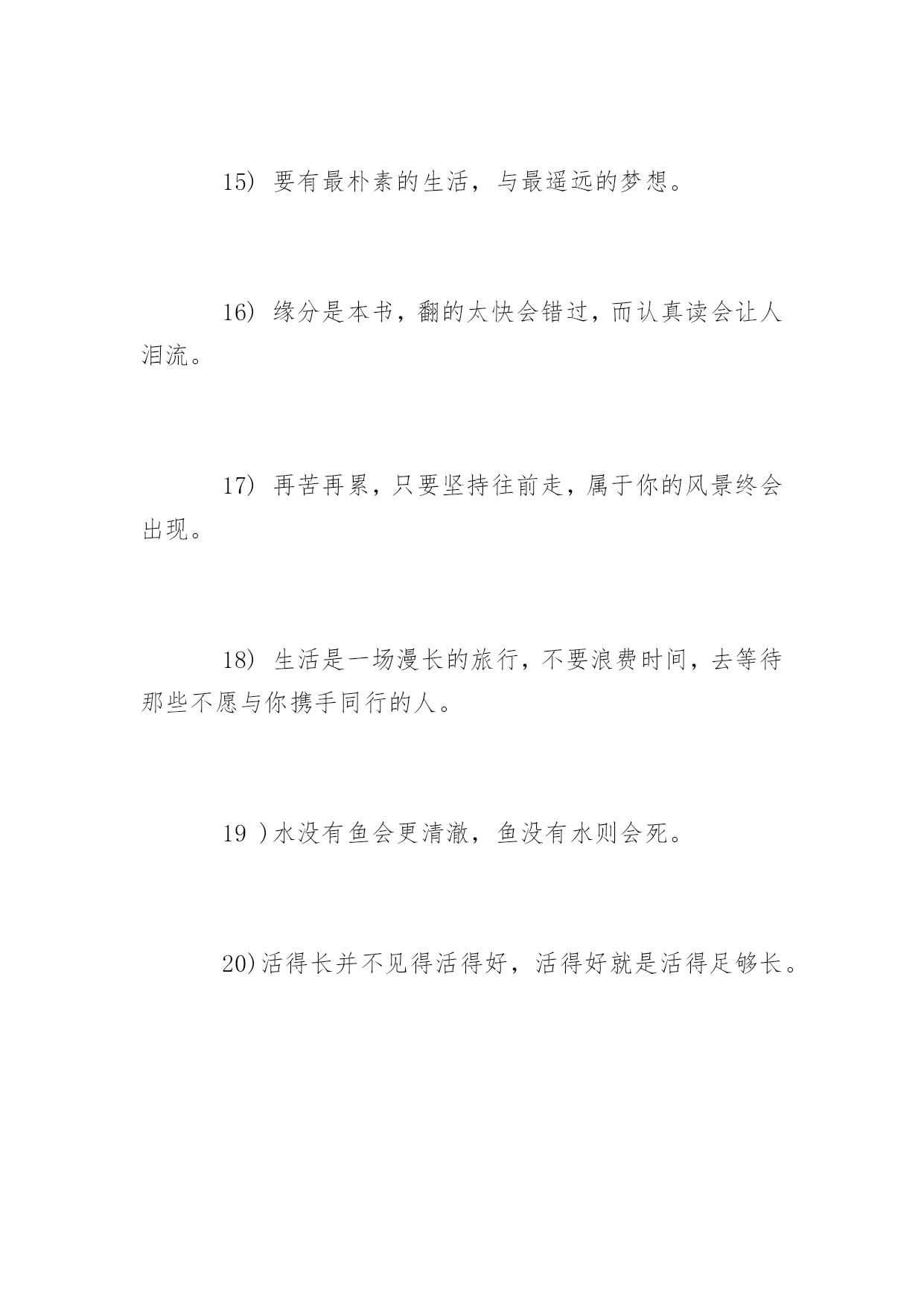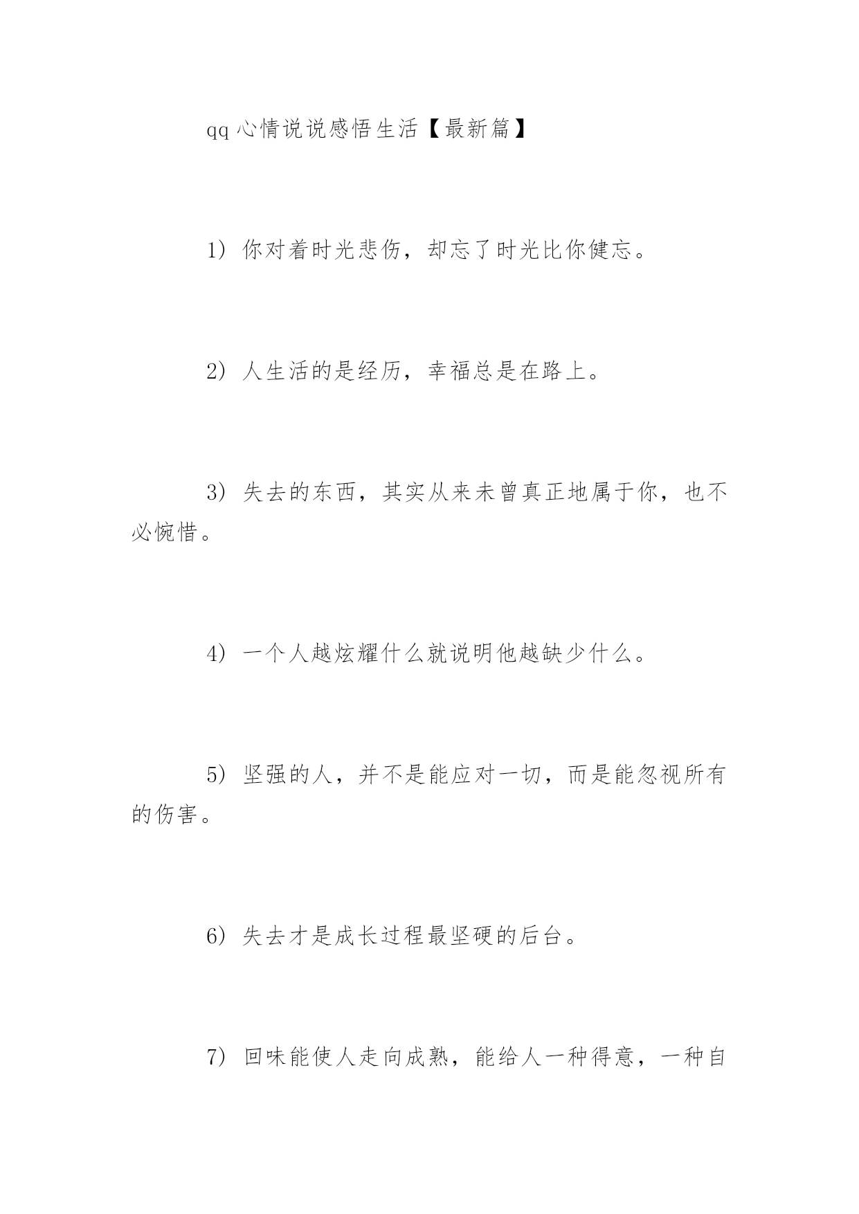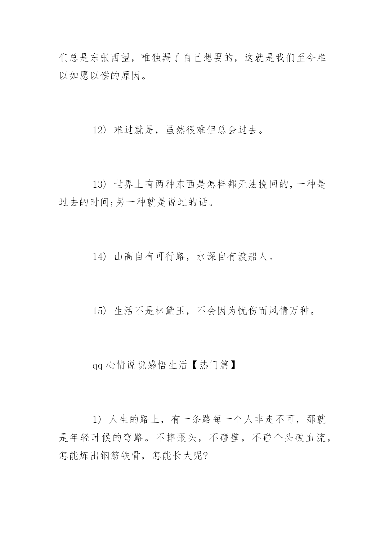 qq心情说说感悟生活qq心情说说感悟生活不少人通过用心情说说把自己对生活的感悟用文字表达出来,下面是由阳光网小编为大家分享的qq心情说说感悟生活,希望大家喜欢。qq心情说说感悟生活【经典篇】1)生活就像骑自行车,不会自己倒,除非你不往前蹬。2)莫做无情之人,莫行绝情之事!3)规则是一种约束,更是一种自由。4)把弯路走直是聪明的,因为找到了捷径;把直路走弯是豁达的,因为可以多看了几道风景。5)有时候一句微不足道的话可以让一个人感动半天。6)关于明天的事情,后天我们就都知道了。7)试着把光芒留给别人,不用太在意那些有的没的,你会更快乐。8)用你的笑容去改变这个世界,别让这个世界改变了你的笑容!9)自由不是做你想做的事,而是可以不做你不想做的。10)谁没有错过谁不贪新厌旧。11)我们一直寻找的,却是自己原本早已拥有的;我们总是东张西望,唯独漏了自己想要的,这就是我们至今难以如愿以偿的原因。12)难过就是,虽然很难但总会过去。13)世界上有两种东西是怎样都无法挽回的,一种是过去的时间;另一种就是说过的话。14)山高自有可行路,水深自有渡船人。15)生活不是林黛玉,不会因为忧伤而风情万种。qq心情说说感悟生活【热门篇】1)人生的路上,有一条路每一个人非走不可,那就是年轻时候的弯路。不摔跟头,不碰壁,不碰个头破血流,怎能炼出钢筋铁骨,怎能长大呢?2)脑袋决定口袋,心态决定成败。3)时间是单行道,过去了,回不来。4)虚心的人用文凭来鞭策自己,心虚的人用文凭来炫耀自己。5)青春是打开合不上的书,人生是踏上了回不了头的路。6)惟愿:现世安稳,岁月静好。7)最后的措手不及是因为当初游刃有余的自己。8)属于自己的,不要放弃;别人得到的,切莫妒忌。9)细心把握身边每份感动,逝去的已逝去,不会再追忆。10)直觉会因为听觉视觉触觉产生错觉。11)人生就像一场电影,回忆终究是回忆,永远回不去。12)放好心态,失去的东西,不要悲伤,你就当,他本身就不属于你。13)烦恼是自己制造自己享用的一种精神。14)岁月禁不起太长的等待。15)想要别人尊重你,首先就要学会尊重别人。qq心情说说感悟生活【最新篇】1)你对着时光悲伤,却忘了时光比你健忘。2)人生活的是经历,幸福总是在路上。3)失去的东西,其实从来未曾真正地属于你,也不必惋惜。4)一个人越炫耀什么就说明他越缺少什么。5)坚强的人,并不是能应对一切,而是能忽视所有的伤害。6)失去才是成长过程最坚硬的后台。7)回味能使人走向成熟,能给人一种得意,一种自豪,多一份力量,能使人知足长乐。8)学会珍惜,才会拥有。9)最大的悲剧,恰是善与善的冲突。10)望来已是几千载,只似当时初望时。11)人心无底洞,填不满,掏不空。12)人一简单就快乐,一世故就变老。13)总有些事放不下,让人忘了时间。总有些事必须放下,因为还有明天。14)生活也许欺骗了你,但你绝对不能欺骗生活。15)要有最朴素的生活,与最遥远的梦想。16)缘分是本书,翻的太快会错过,而认真读会让人泪流。17)再苦再累,只要坚持往前走,属于你的风景终会出现。18)生活是一场漫长的旅行,不要浪费时间,去等待那些不愿与你携手同行的人。19)水没有鱼会更清澈,鱼没有水则会死。20)活得长并不见得活得好,活得好就是活得足够长。