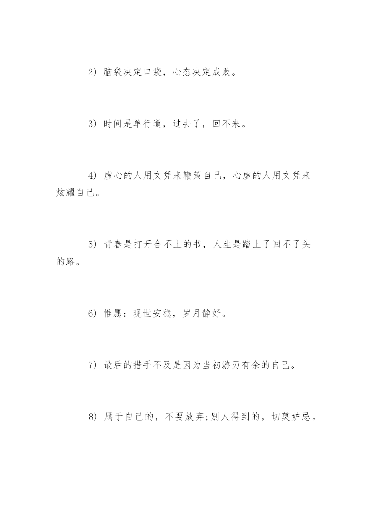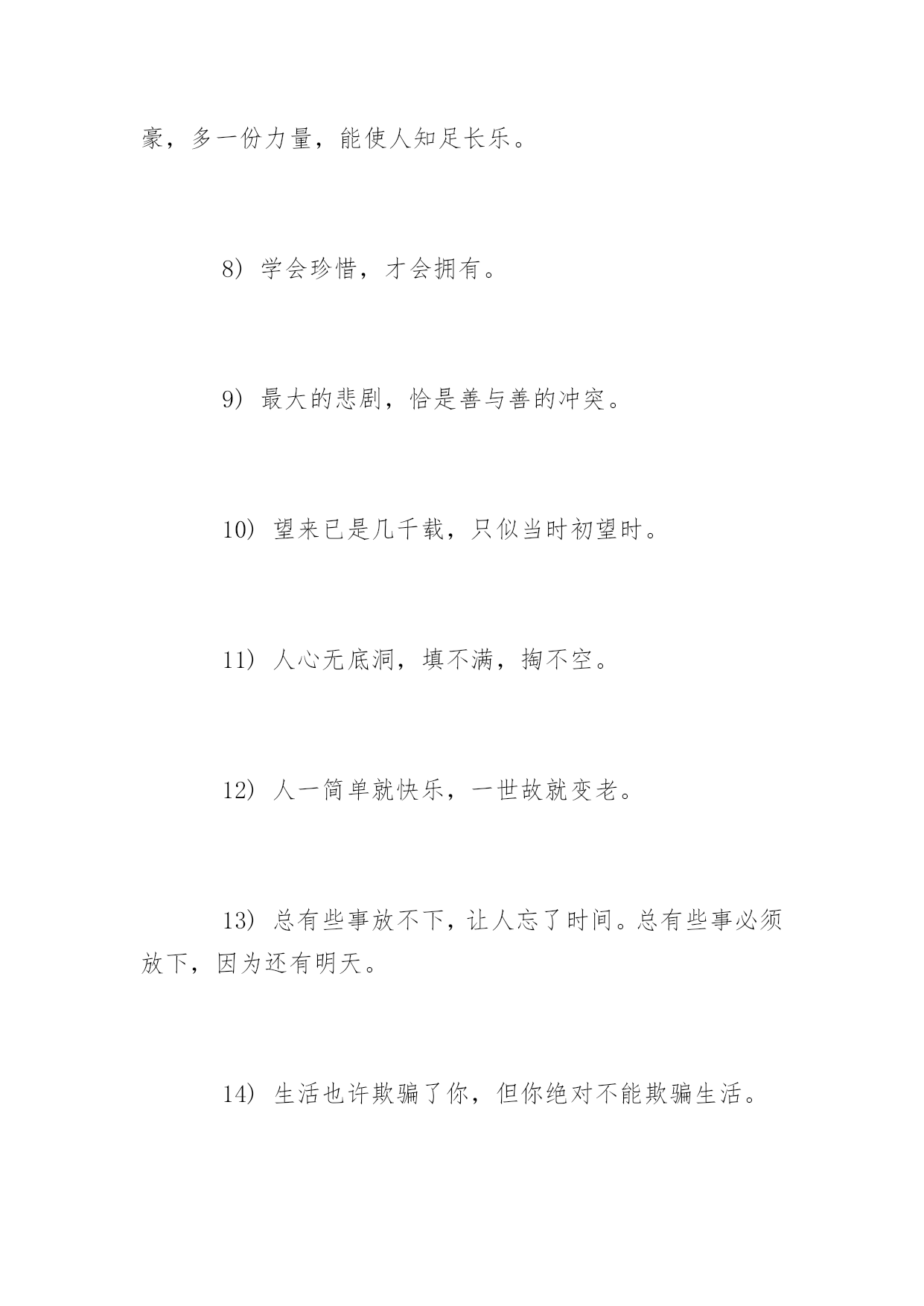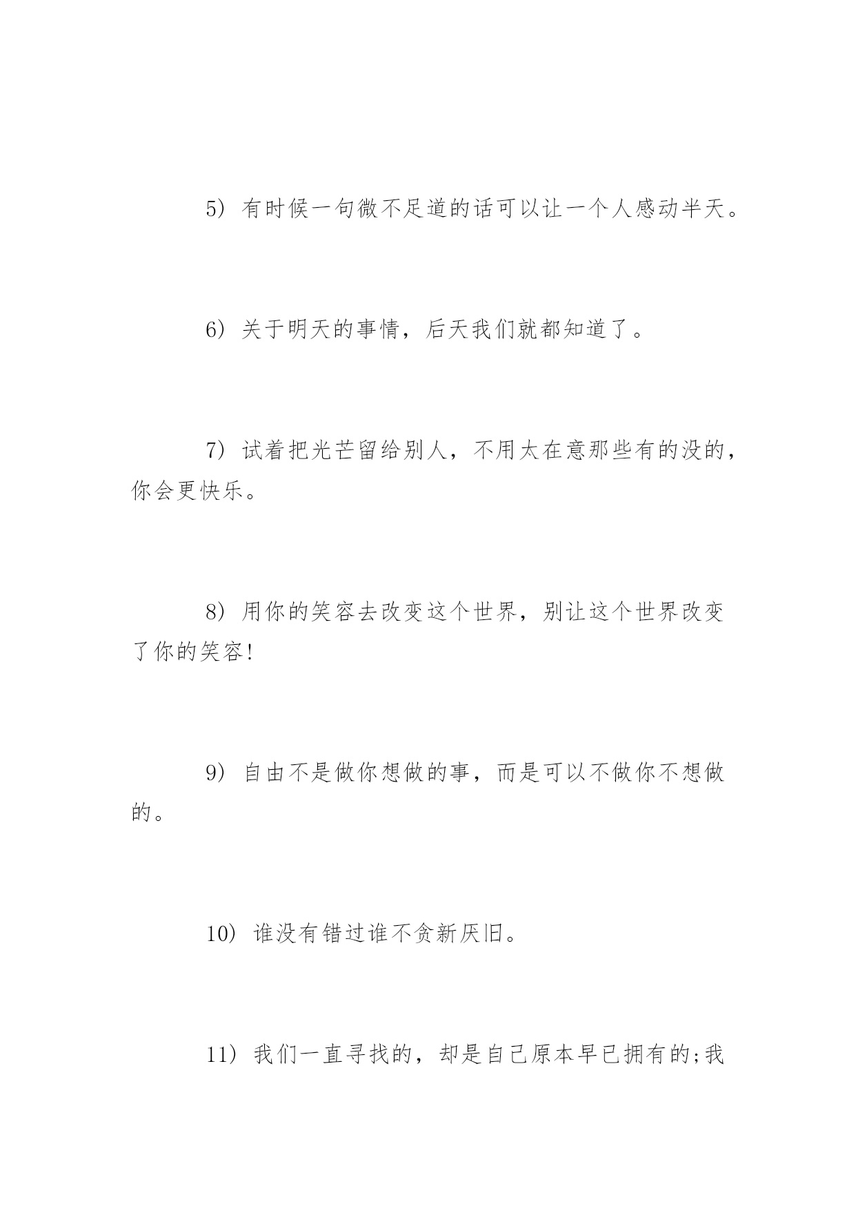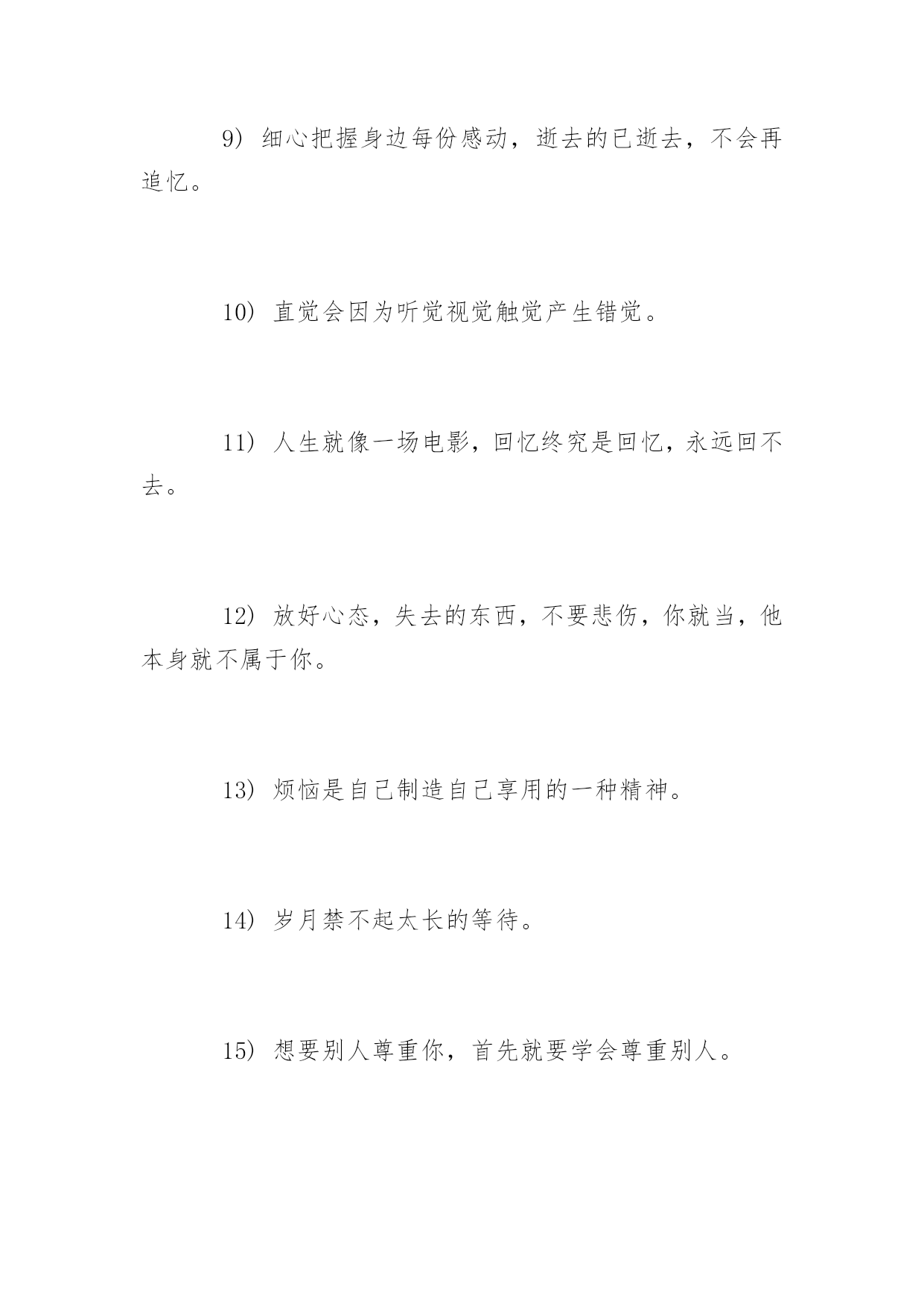 qq心情说说感悟生活qq心情说说感悟生活不少人通过用心情说说把自己对生活的感悟用文字表达出来,下面是由阳光网小编为大家分享的qq心情说说感悟生活,希望大家喜欢。qq心情说说感悟生活【经典篇】1)生活就像骑自行车,不会自己倒,除非你不往前蹬。2)莫做无情之人,莫行绝情之事!3)规则是一种约束,更是一种自由。4)把弯路走直是聪明的,因为找到了捷径;把直路走弯是豁达的,因为可以多看了几道风景。5)有时候一句微不足道的话可以让一个人感动半天。6)关于明天的事情,后天我们就都知道了。7)试着把光芒留给别人,不用太在意那些有的没的,你会更快乐。8)用你的笑容去改变这个世界,别让这个世界改变了你的笑容!9)自由不是做你想做的事,而是可以不做你不想做的。10)谁没有错过谁不贪新厌旧。11)我们一直寻找的,却是自己原本早已拥有的;我们总是东张西望,唯独漏了自己想要的,这就是我们至今难以如愿以偿的原因。12)难过就是,虽然很难但总会过去。13)世界上有两种东西是怎样都无法挽回的,一种是过去的时间;另一种就是说过的话。14)山高自有可行路,水深自有渡船人。15)生活不是林黛玉,不会因为忧伤而风情万种。qq心情说说感悟生活【热门篇】1)人生的路上,有一条路每一个人非走不可,那就是年轻时候的弯路。不摔跟头,不碰壁,不碰个头破血流,怎能炼出钢筋铁骨,怎能长大呢?2)脑袋决定口袋,心态决定成败。3)时间是单行道,过去了,回不来。4)虚心的人用文凭来鞭策自己,心虚的人用文凭来炫耀自己。5)青春是打开合不上的书,人生是踏上了回不了头的路。6)惟愿:现世安稳,岁月静好。7)最后的措手不及是因为当初游刃有余的自己。8)属于自己的,不要放弃;别人得到的,切莫妒忌。9)细心把握身边每份感动,逝去的已逝去,不会再追忆。10)直觉会因为听觉视觉触觉产生错觉。11)人生就像一场电影,回忆终究是回忆,永远回不去。12)放好心态,失去的东西,不要悲伤,你就当,他本身就不属于你。13)烦恼是自己制造自己享用的一种精神。14)岁月禁不起太长的等待。15)想要别人尊重你,首先就要学会尊重别人。qq心情说说感悟生活【最新篇】1)你对着时光悲伤,却忘了时光比你健忘。2)人生活的是经历,幸福总是在路上。3)失去的东西,其实从来未曾真正地属于你,也不必惋惜。4)一个人越炫耀什么就说明他越缺少什么。5)坚强的人,并不是能应对一切,而是能忽视所有的伤害。6)失去才是成长过程最坚硬的后台。7)回味能使人走向成熟,能给人一种得意,一种自豪,多一份力量,能使人知足长乐。8)学会珍惜,才会拥有。9)最大的悲剧,恰是善与善的冲突。10)望来已是几千载,只似当时初望时。11)人心无底洞,填不满,掏不空。12)人一简单就快乐,一世故就变老。13)总有些事放不下,让人忘了时间。总有些事必须放下,因为还有明天。14)生活也许欺骗了你,但你绝对不能欺骗生活。15)要有最朴素的生活,与最遥远的梦想。16)缘分是本书,翻的太快会错过,而认真读会让人泪流。17)再苦再累,只要坚持往前走,属于你的风景终会出现。18)生活是一场漫长的旅行,不要浪费时间,去等待那些不愿与你携手同行的人。19)水没有鱼会更清澈,鱼没有水则会死。20)活得长并不见得活得好,活得好就是活得足够长。