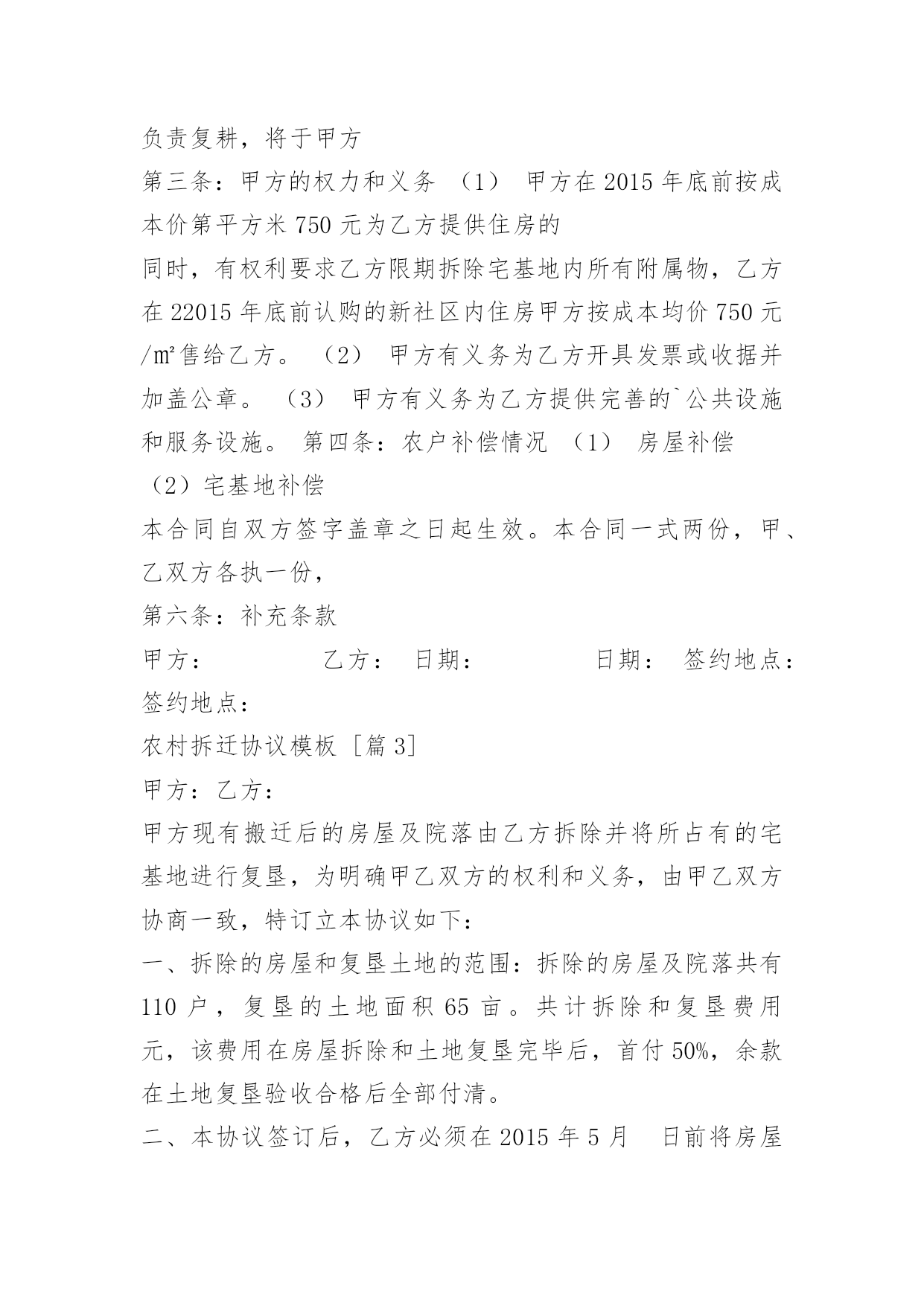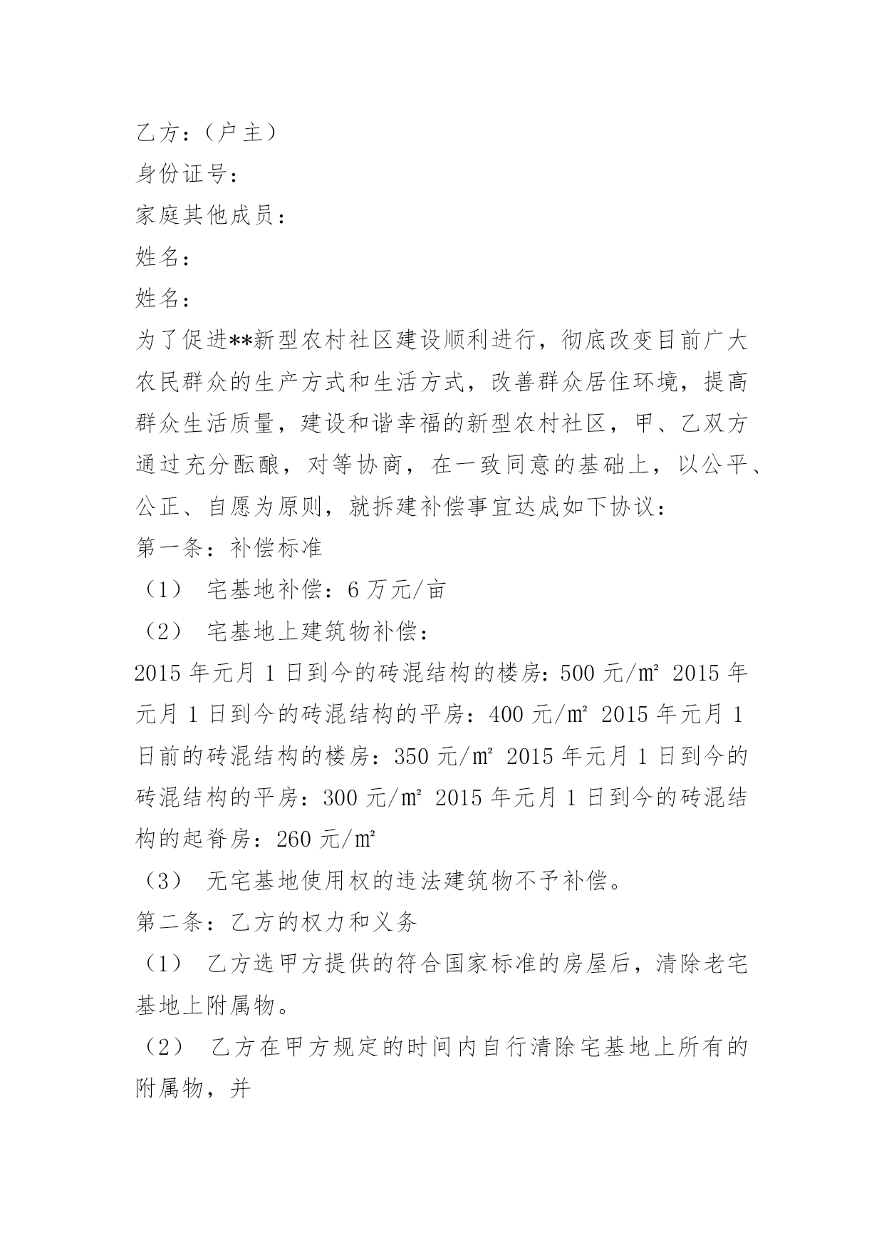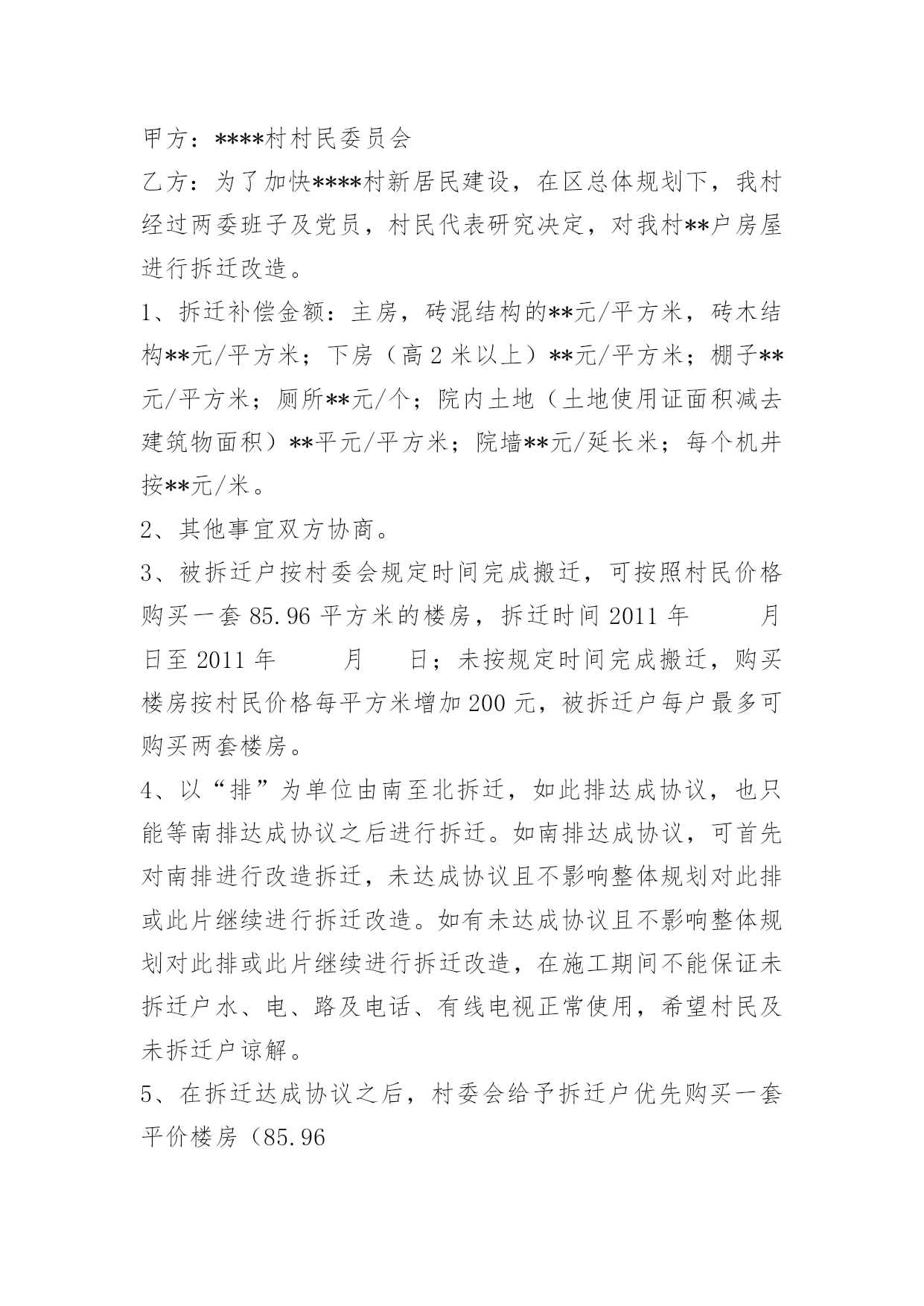 农村拆迁协议农村拆迁协议模板为搞好老村庄土地复垦,增扩土地面积,XX将XX生产组原老庄房进行改造复垦,现XXX与拆迁户XXXX就房屋拆迁相关事宜达成如下协议:一、拆迁项目:乙方将自己老庄房XX间主房、XXX间附属房;XXX间猪圈、XX间厕所,XXX座水井;XXXX棵银杏树等地上物进行拆除让地。二、补尝标准:甲方将参照有关拆迁标准给乙方补尝,其标准如下:(一)房屋补偿金额XXXX元/平方米;(二)猪圈补偿金额XXXX元/间;(三)厕所补偿金额XXXX元/间;(四)水井补偿金额XXXX元/座;(五)银杏树补偿金额XXXX元/棵。三、拆迁时间:XXX对本建筑物的拆除期间为年月日至年月日,拆除后应将所拆除的物料全部运走,将土地按约定时间交由XXXX。四、安全责任:XXX在组织房屋拆迁过程中,应注重安全,对拆迁过程中出现不安全因素造成后果,由XXX自行负责,与XXXX无任何因果关系。五、拆迁补偿金额:(1)房屋拆迁面积XXX平方米,按建筑面积每平方米XXX元,小(2)附属物:猪圈XX间,按补偿金额XXX元,小计XXX元;厕计XXXX元。所XXX间,按补偿金额XXX元,小计XXX元;水井XXX座,按补偿金额XXX元,小计XXX元;银杏树XXX棵,按补偿金额XXX元,小计XXX元.(3)拆迁补助费XXXX元。合计:XXXXXX元。六、结算方法:拆迁费用结算与镇费用结算同步。七、相关事宜:因XXX申请需要重新安排房屋宅基,经XXXXXX双方商量,甲方原则同意在原基地给予定位,其条件:(一)经上级国土部门验收后;(2)XXXX具备开工条件,XXXXX方可负责安排。本协议正本一式二份,双方各执一份,签字后具有法律效力。甲方:XXX乙方:XXX年月日农村拆迁协议模板[篇2]***新型农村社区拆迁、补偿、安置协议书(协议书编号:第**村民组第**号)甲方:村委法人代表:乙方:(户主)身份证号:家庭其他成员:姓名:姓名:为了促进**新型农村社区建设顺利进行,彻底改变目前广大农民群众的生产方式和生活方式,改善群众居住环境,提高群众生活质量,建设和谐幸福的新型农村社区,甲、乙双方通过充分酝酿,对等协商,在一致同意的基础上,以公平、公正、自愿为原则,就拆建补偿事宜达成如下协议:第一条:补偿标准(1)宅基地补偿:6万元/亩(2)宅基地上建筑物补偿:2015年元月1日到今的砖混结构的楼房:500元/㎡2015年元月1日到今的砖混结构的平房:400元/㎡2015年元月1日前的砖混结构的楼房:350元/㎡2015年元月1日到今的砖混结构的平房:300元/㎡2015年元月1日到今的砖混结构的起脊房:260元/㎡(3)无宅基地使用权的违法建筑物不予补偿。第二条:乙方的权力和义务(1)乙方选甲方提供的符合国家标准的房屋后,清除老宅基地上附属物。(2)乙方在甲方规定的时间内自行清除宅基地上所有的附属物,并负责复耕,将于甲方第三条:甲方的权力和义务(1)甲方在2015年底前按成本价第平方米750元为乙方提供住房的同时,有权利要求乙方限期拆除宅基地内所有附属物,乙方在22015年底前认购的新社区内住房甲方按成本均价750元/㎡售给乙方。(2)甲方有义务为乙方开具发票或收据并加盖公章。(3)甲方有义务为乙方提供完善的`公共设施和服务设施。第四条:农户补偿情况(1)房屋补偿(2)宅基地补偿本合同自双方签字盖章之日起生效。本合同一式两份,甲、乙双方各执一份,第六条:补充条款甲方:乙方:日期:日期:签约地点:签约地点:农村拆迁协议模板[篇3]甲方:乙方:甲方现有搬迁后的房屋及院落由乙方拆除并将所占有的宅基地进行复垦,为明确甲乙双方的权利和义务,由甲乙双方协商一致,特订立本协议如下:一、拆除的房屋和复垦土地的范围:拆除的房屋及院落共有110户,复垦的土地面积65亩。共计拆除和复垦费用元,该费用在房屋拆除和土地复垦完毕后,首付50%,余款在土地复垦验收合格后全部付清。二、本协议签订后,乙方必须在2015年5月日前将房屋及院落拆除,并将土地复垦完毕。协议终止时间为土地复垦验收合格之日止。三、在协议期限内,乙方拆除的梁、檩、门窗、砖瓦、钢筋等归乙方所有,剩余的建筑垃圾由甲方负责清理,清理完后由乙方负责土地复垦,土地复垦完毕后由甲方报请有关部门进行验收。四、在拆除和复垦过程中,由甲方负责维持拆除和复垦的秩序,如遇乙方自己人员或给他人造成人员伤亡时,其责任全部归乙方,甲方不承担任何责任。五、在本协议签订时,乙方须向甲方交纳保证金伍万元整,该保证金在甲方及有关部门对土地复垦验收合格(标准为基本农田)后予以退回,如乙方违约,则该保证金不退回,归甲方所有。本协议自签订之日起生效,任何一方不得违约,如一方违约,违约方要承担违约金元。本协议一式三份,甲乙双方及安丘景芝法律服务所各存一份。甲方:(盖章)法