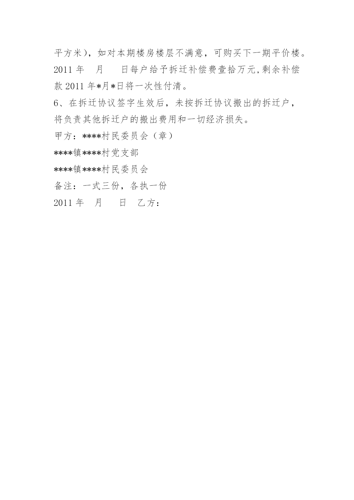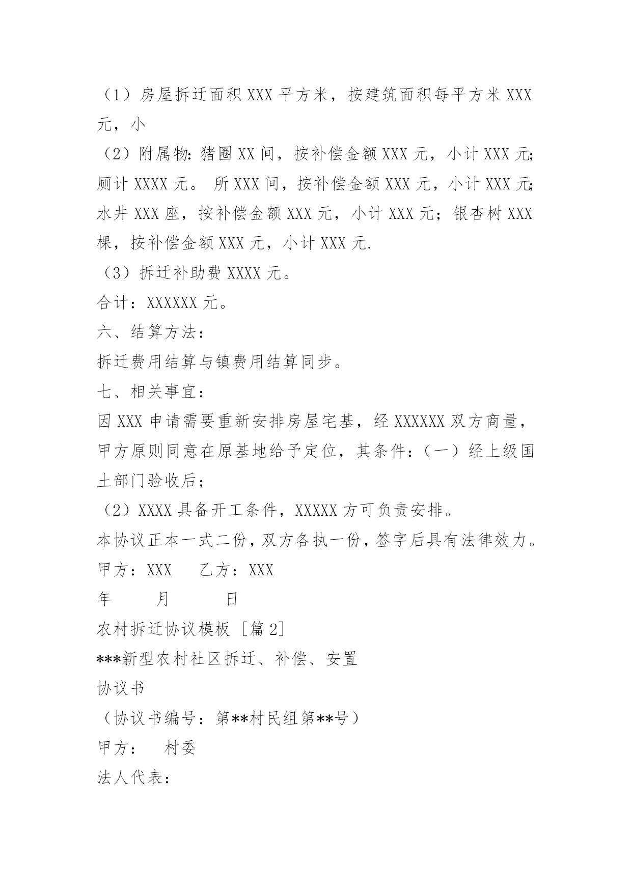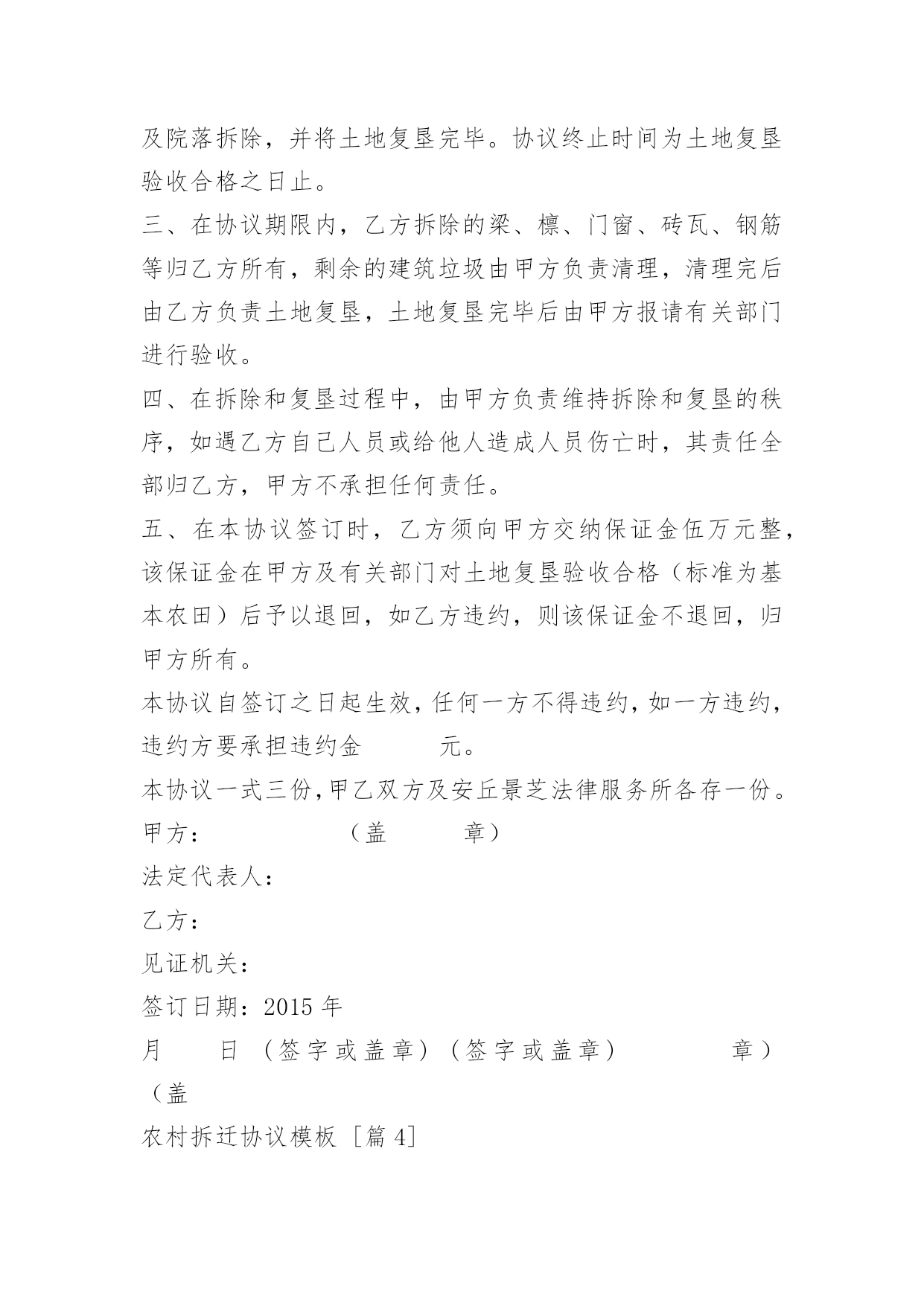 农村拆迁协议农村拆迁协议模板为搞好老村庄土地复垦,增扩土地面积,XX将XX生产组原老庄房进行改造复垦,现XXX与拆迁户XXXX就房屋拆迁相关事宜达成如下协议:一、拆迁项目:乙方将自己老庄房XX间主房、XXX间附属房;XXX间猪圈、XX间厕所,XXX座水井;XXXX棵银杏树等地上物进行拆除让地。二、补尝标准:甲方将参照有关拆迁标准给乙方补尝,其标准如下:(一)房屋补偿金额XXXX元/平方米;(二)猪圈补偿金额XXXX元/间;(三)厕所补偿金额XXXX元/间;(四)水井补偿金额XXXX元/座;(五)银杏树补偿金额XXXX元/棵。三、拆迁时间:XXX对本建筑物的拆除期间为年月日至年月日,拆除后应将所拆除的物料全部运走,将土地按约定时间交由XXXX。四、安全责任:XXX在组织房屋拆迁过程中,应注重安全,对拆迁过程中出现不安全因素造成后果,由XXX自行负责,与XXXX无任何因果关系。五、拆迁补偿金额:(1)房屋拆迁面积XXX平方米,按建筑面积每平方米XXX元,小(2)附属物:猪圈XX间,按补偿金额XXX元,小计XXX元;厕计XXXX元。所XXX间,按补偿金额XXX元,小计XXX元;水井XXX座,按补偿金额XXX元,小计XXX元;银杏树XXX棵,按补偿金额XXX元,小计XXX元.(3)拆迁补助费XXXX元。合计:XXXXXX元。六、结算方法:拆迁费用结算与镇费用结算同步。七、相关事宜:因XXX申请需要重新安排房屋宅基,经XXXXXX双方商量,甲方原则同意在原基地给予定位,其条件:(一)经上级国土部门验收后;(2)XXXX具备开工条件,XXXXX方可负责安排。本协议正本一式二份,双方各执一份,签字后具有法律效力。甲方:XXX乙方:XXX年月日农村拆迁协议模板[篇2]***新型农村社区拆迁、补偿、安置协议书(协议书编号:第**村民组第**号)甲方:村委法人代表:乙方:(户主)身份证号:家庭其他成员:姓名:姓名:为了促进**新型农村社区建设顺利进行,彻底改变目前广大农民群众的生产方式和生活方式,改善群众居住环境,提高群众生活质量,建设和谐幸福的新型农村社区,甲、乙双方通过充分酝酿,对等协商,在一致同意的基础上,以公平、公正、自愿为原则,就拆建补偿事宜达成如下协议:第一条:补偿标准(1)宅基地补偿:6万元/亩(2)宅基地上建筑物补偿:2015年元月1日到今的砖混结构的楼房:500元/㎡2015年元月1日到今的砖混结构的平房:400元/㎡2015年元月1日前的砖混结构的楼房:350元/㎡2015年元月1日到今的砖混结构的平房:300元/㎡2015年元月1日到今的砖混结构的起脊房:260元/㎡(3)无宅基地使用权的违法建筑物不予补偿。第二条:乙方的权力和义务(1)乙方选甲方提供的符合国家标准的房屋后,清除老宅基地上附属物。(2)乙方在甲方规定的时间内自行清除宅基地上所有的附属物,并负责复耕,将于甲方第三条:甲方的权力和义务(1)甲方在2015年底前按成本价第平方米750元为乙方提供住房的同时,有权利要求乙方限期拆除宅基地内所有附属物,乙方在22015年底前认购的新社区内住房甲方按成本均价750元/㎡售给乙方。(2)甲方有义务为乙方开具发票或收据并加盖公章。(3)甲方有义务为乙方提供完善的`公共设施和服务设施。第四条:农户补偿情况(1)房屋补偿(2)宅基地补偿本合同自双方签字盖章之日起生效。本合同一式两份,甲、乙双方各执一份,第六条:补充条款甲方:乙方:日期:日期:签约地点:签约地点:农村拆迁协议模板[篇3]甲方:乙方:甲方现有搬迁后的房屋及院落由乙方拆除并将所占有的宅基地进行复垦,为明确甲乙双方的权利和义务,由甲乙双方协商一致,特订立本协议如下:一、拆除的房屋和复垦土地的范围:拆除的房屋及院落共有110户,复垦的土地面积65亩。共计拆除和复垦费用元,该费用在房屋拆除和土地复垦完毕后,首付50%,余款在土地复垦验收合格后全部付清。二、本协议签订后,乙方必须在2015年5月日前将房屋及院落拆除,并将土地复垦完毕。协议终止时间为土地复垦验收合格之日止。三、在协议期限内,乙方拆除的梁、檩、门窗、砖瓦、钢筋等归乙方所有,剩余的建筑垃圾由甲方负责清理,清理完后由乙方负责土地复垦,土地复垦完毕后由甲方报请有关部门进行验收。四、在拆除和复垦过程中,由甲方负责维持拆除和复垦的秩序,如遇乙方自己人员或给他人造成人员伤亡时,其责任全部归乙方,甲方不承担任何责任。五、在本协议签订时,乙方须向甲方交纳保证金伍万元整,该保证金在甲方及有关部门对土地复垦验收合格(标准为基本农田)后予以退回,如乙方违约,则该保证金不退回,归甲方所有。本协议自签订之日起生效,任何一方不得违约,如一方违约,违约方要承担违约金元。本协议一式三份,甲乙双方及安丘景芝法律服务所各存一份。甲方:(盖章)法