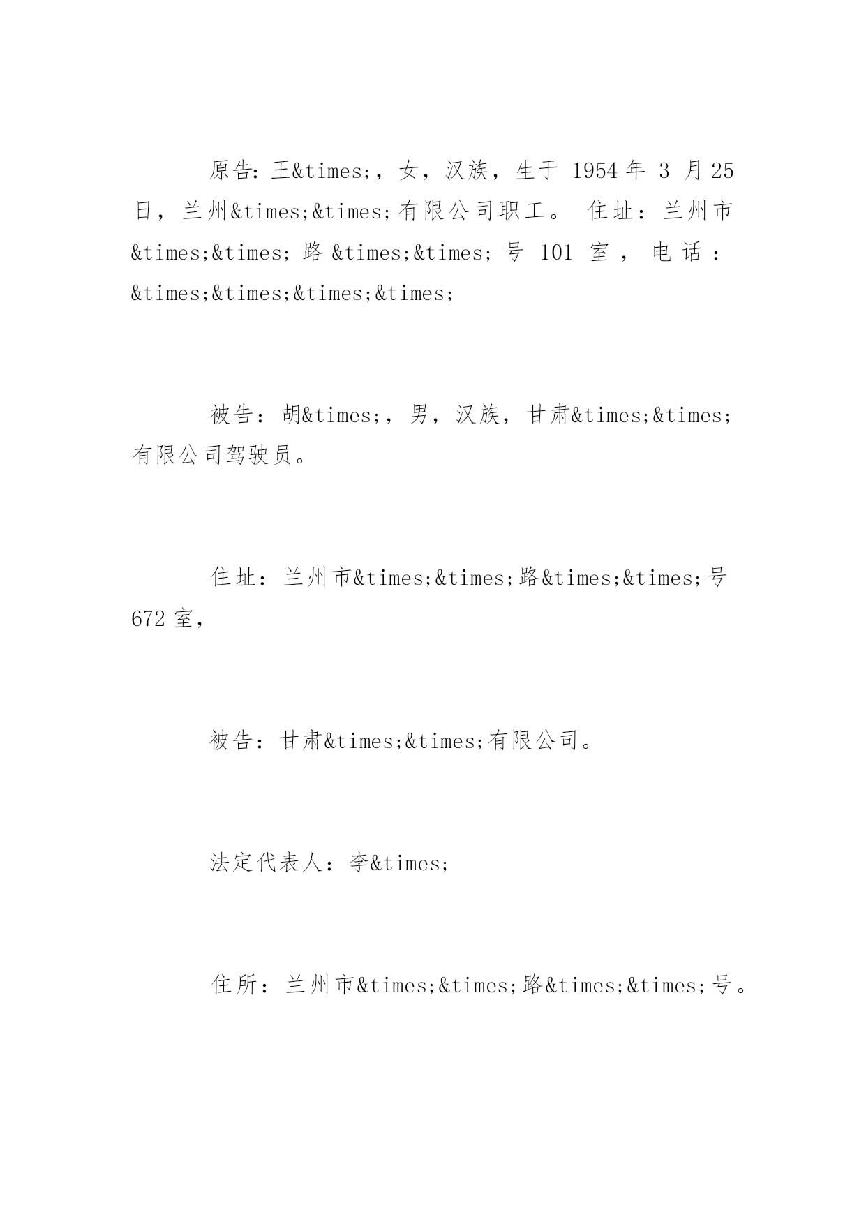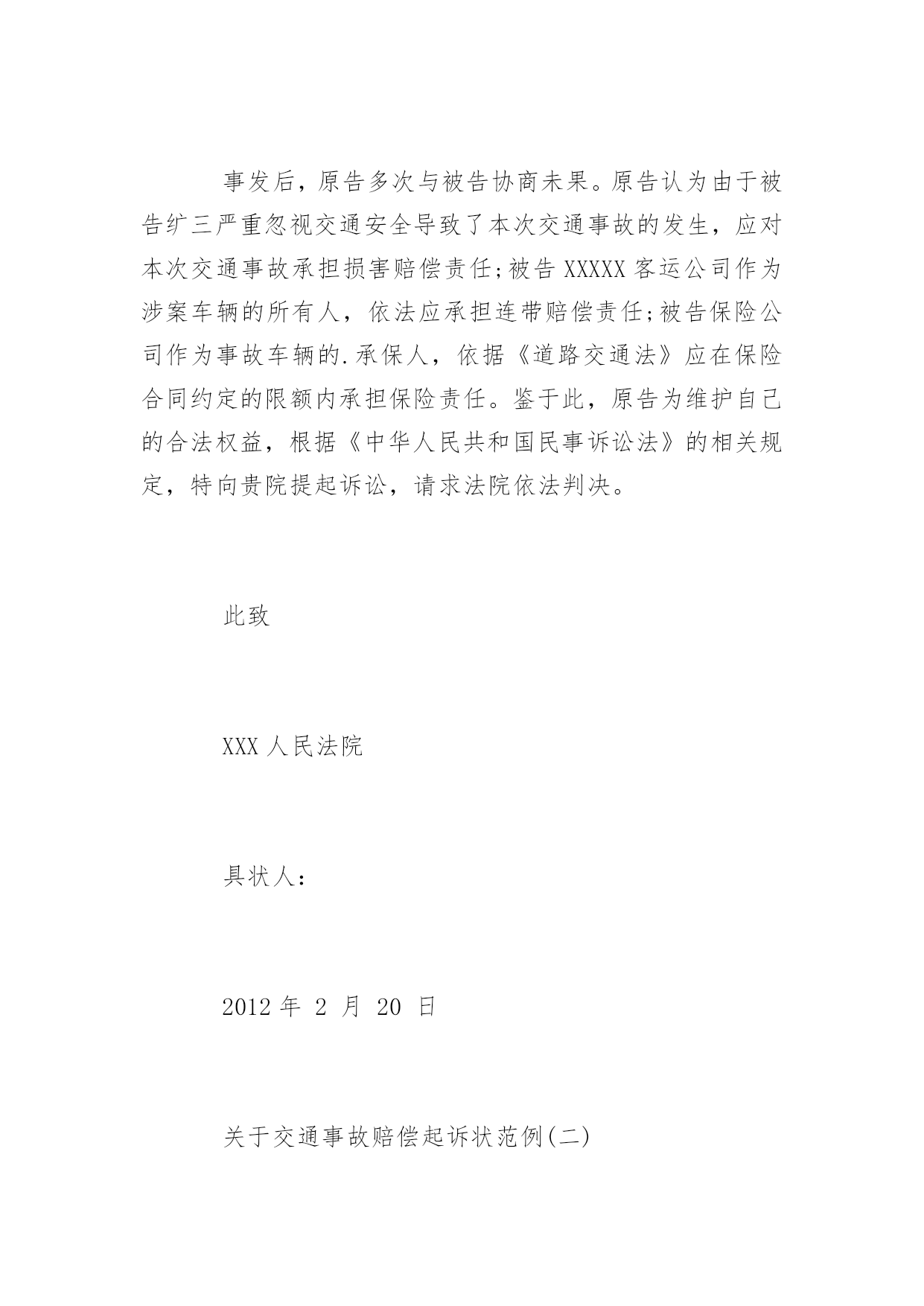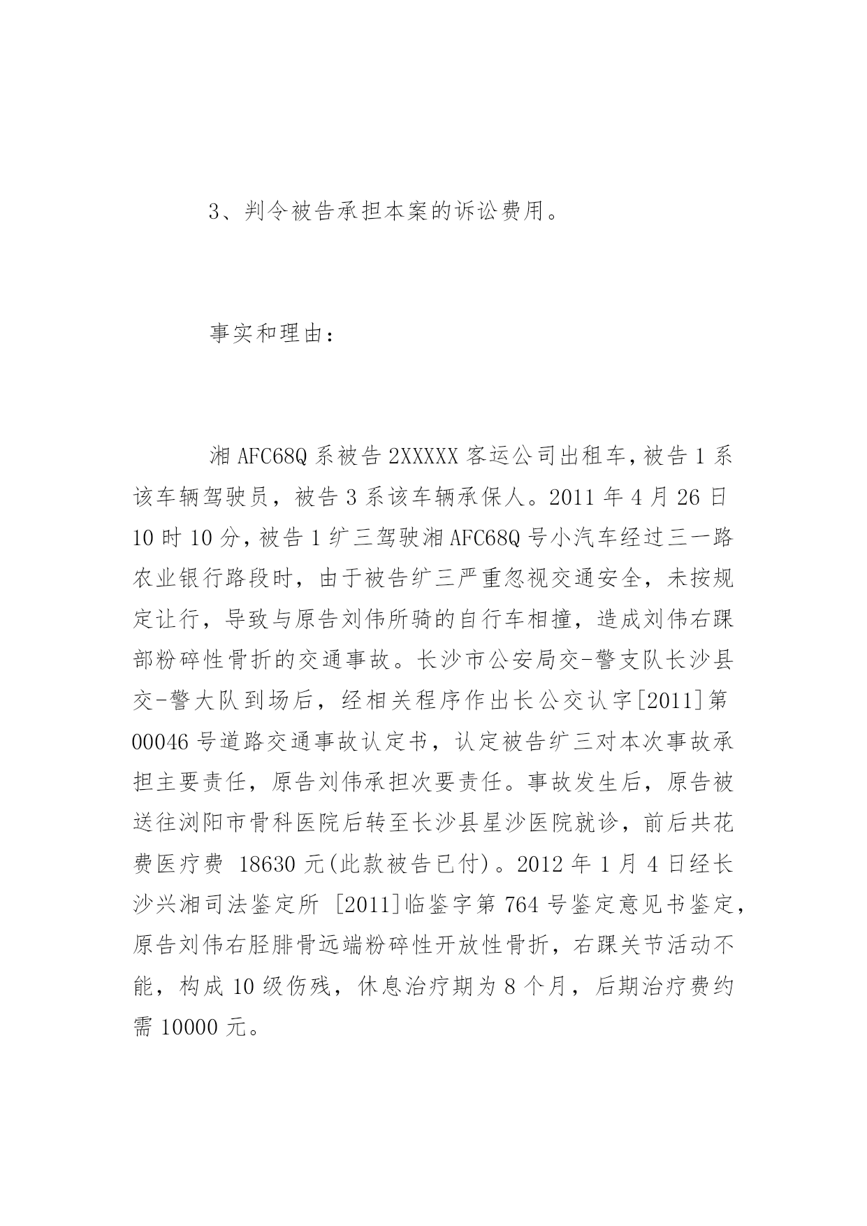 交通事故赔偿起诉状关于交通事故赔偿起诉状范例导语:交通事故赔偿无法协商解决,就只能通过法律手段解决。下面是小编收集的关于交通事故赔偿起诉状范例,欢迎阅读。关于交通事故赔偿起诉状范例(一)原告:刘伟,女,1988年7月8日出生,汉族,被告1:纩三,男,1978年1月8日出生,汉族,住湖南省长沙县星沙派出所星沙镇开元路社区长沙环宇石英砂有限公司特立路2号。联系电话:被告2:XXXXX客运公司。地址:XXXXXXXXXXXXXXXXX。法定代表人:黄永科。联系电话:被告3:中国太平洋财产保险股份有限公司地址:XXXXXXXXXXXXXXXXXXXXX。法定代表人:XXXXXXXXXXXXX。诉讼请求:1、判令被告1、被告2连带赔偿伤残补偿金33132元、住院伙食费1260元、营养费5640元、护理费12720元、交通费630元、误工费112504元、后续治疗费10000元、精神损害抚慰金8000元、鉴定费元、共计元;2、判令被告3在保险限额内承担保险赔偿责任;3、判令被告承担本案的诉讼费用。事实和理由:湘AFC68Q系被告2XXXXX客运公司出租车,被告1系该车辆驾驶员,被告3系该车辆承保人。2011年4月26日10时10分,被告1纩三驾驶湘AFC68Q号小汽车经过三一路农业银行路段时,由于被告纩三严重忽视交通安全,未按规定让行,导致与原告刘伟所骑的自行车相撞,造成刘伟右踝部粉碎性骨折的交通事故。长沙市公安局交-警支队长沙县交-警大队到场后,经相关程序作出长公交认字[2011]第00046号道路交通事故认定书,认定被告纩三对本次事故承担主要责任,原告刘伟承担次要责任。事故发生后,原告被送往浏阳市骨科医院后转至长沙县星沙医院就诊,前后共花费医疗费18630元(此款被告已付)。2012年1月4日经长沙兴湘司法鉴定所[2011]临鉴字第764号鉴定意见书鉴定,原告刘伟右胫腓骨远端粉碎性开放性骨折,右踝关节活动不能,构成10级伤残,休息治疗期为8个月,后期治疗费约需10000元。事发后,原告多次与被告协商未果。原告认为由于被告纩三严重忽视交通安全导致了本次交通事故的发生,应对本次交通事故承担损害赔偿责任;被告XXXXX客运公司作为涉案车辆的所有人,依法应承担连带赔偿责任;被告保险公司作为事故车辆的.承保人,依据《道路交通法》应在保险合同约定的限额内承担保险责任。鉴于此,原告为维护自己的合法权益,根据《中华人民共和国民事诉讼法》的相关规定,特向贵院提起诉讼,请求法院依法判决。此致XXX人民法院具状人:2012年2月20日关于交通事故赔偿起诉状范例(二)原告:王×,女,汉族,生于1954年3月25日,兰州××有限公司职工。住址:兰州市××路××号101室,电话:××××被告:胡×,男,汉族,甘肃××有限公司驾驶员。住址:兰州市××路××号672室,被告:甘肃××有限公司。法定代表人:李×住所:兰州市××路××号。邮编:730030电话:××××诉讼请求:一、判令被告向原告支付人身损害赔偿金80000元(具体详见清单);二、判令被告向原告支付精神损害赔偿费10000元;三、赔偿原告助动车损失费6000元;四、本案诉讼费由被告承担。事实与理由:2015年4月1日下午一时许,当原告在上班途中,骑助动车正常行经兰州市××路与××路交叉路口时,遭遇被告胡×驾驶的小客车(牌号为甘A×××××)右转弯撞击,致使原告头部直接坠地及身体多处受伤,并致使原告的助动车严重损坏。事故发生后原告被送往兰州市第二人民医院治疗,经门诊诊断,造成原告头部颅底骨折,左颞顶头皮下血肿、压痛、耳聋等。后经××公安分局交巡警支队认定,被告对上述事故承担全部责任,原告无责任(见证据1)。原告又于2015年6月18日,经甘肃××鉴定中心伤残评定,确认“路交通事故致颅底骨折,遗留头痛、头晕,左耳伟导功能障碍,属十级伤残”(见证据2)。又于2015年7月30日,双方不能达成一致意见,交-警出具了道路交通事故损害赔偿调解终结书。原告胪脑受伤,兰州市第二人民医院于2015年5月9日出曾出具