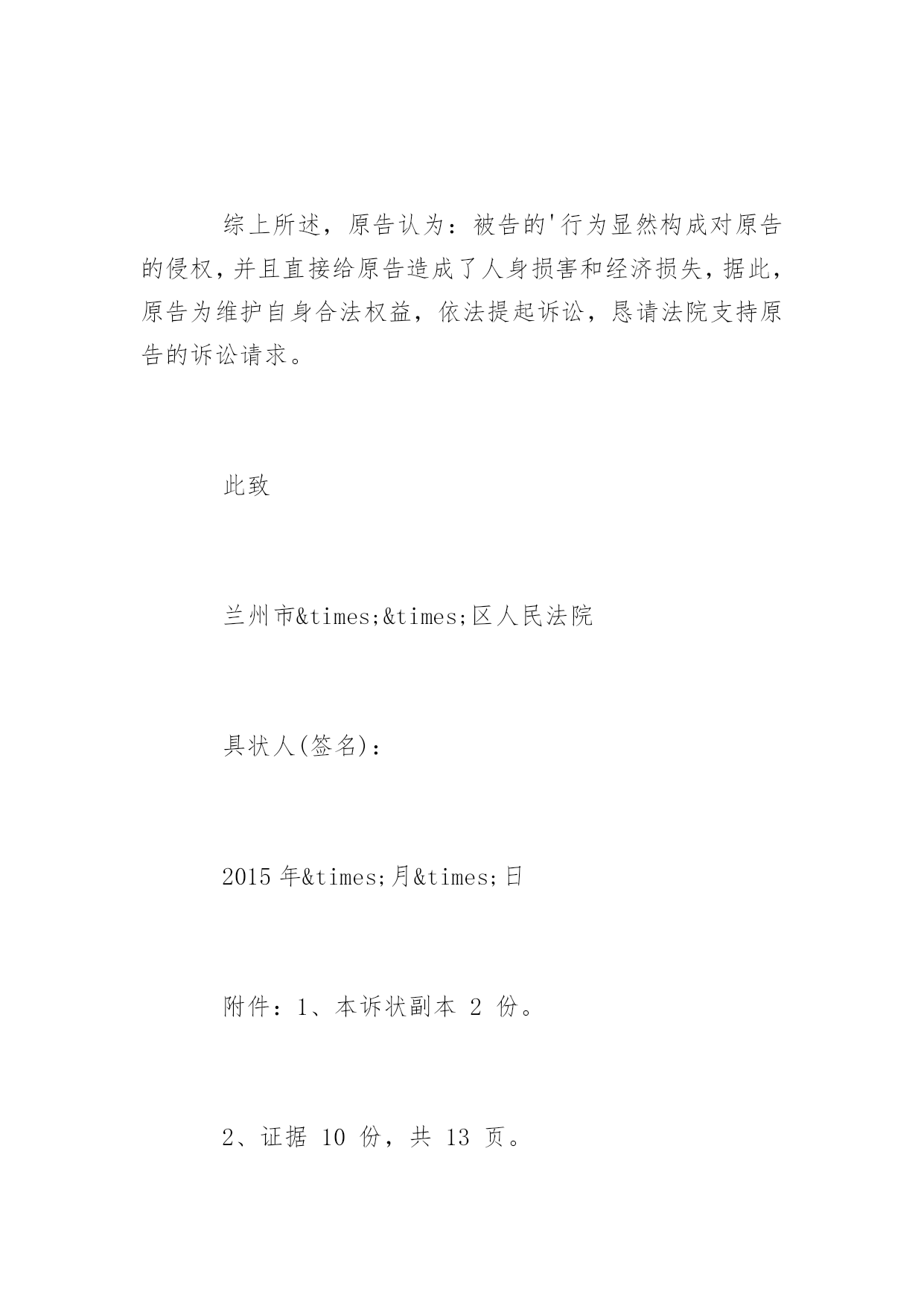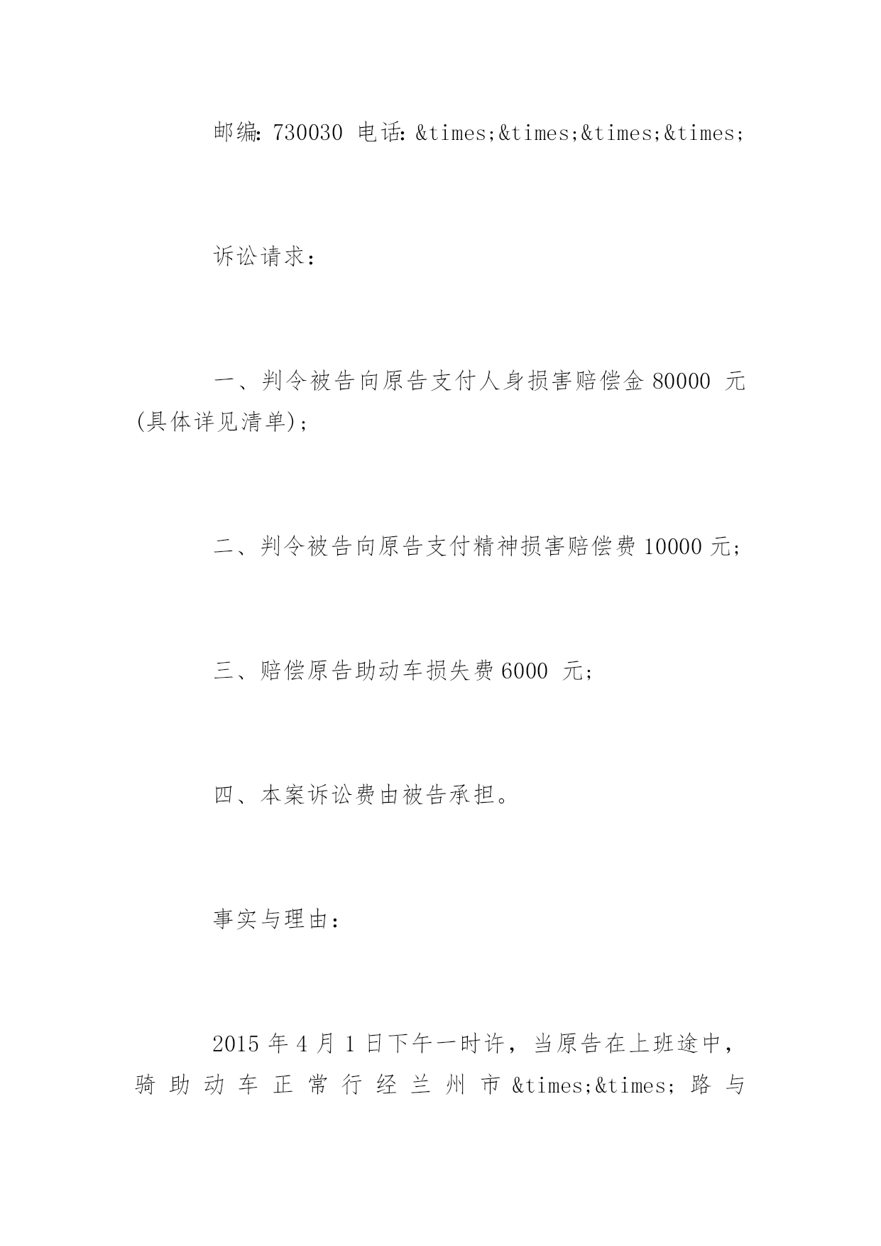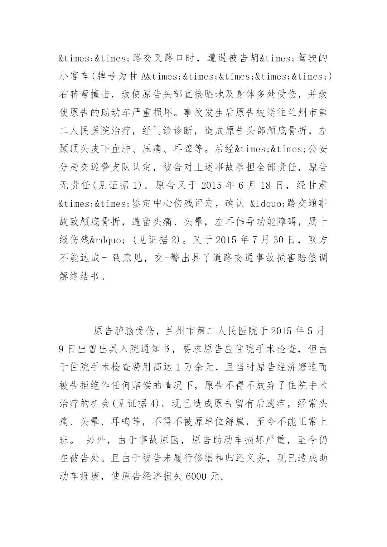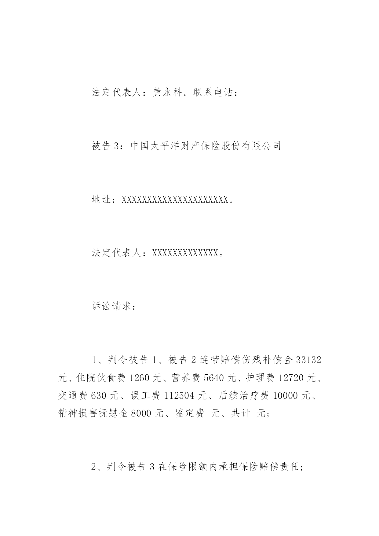 交通事故赔偿起诉状关于交通事故赔偿起诉状范例导语:交通事故赔偿无法协商解决,就只能通过法律手段解决。下面是小编收集的关于交通事故赔偿起诉状范例,欢迎阅读。关于交通事故赔偿起诉状范例(一)原告:刘伟,女,1988年7月8日出生,汉族,被告1:纩三,男,1978年1月8日出生,汉族,住湖南省长沙县星沙派出所星沙镇开元路社区长沙环宇石英砂有限公司特立路2号。联系电话:被告2:XXXXX客运公司。地址:XXXXXXXXXXXXXXXXX。法定代表人:黄永科。联系电话:被告3:中国太平洋财产保险股份有限公司地址:XXXXXXXXXXXXXXXXXXXXX。法定代表人:XXXXXXXXXXXXX。诉讼请求:1、判令被告1、被告2连带赔偿伤残补偿金33132元、住院伙食费1260元、营养费5640元、护理费12720元、交通费630元、误工费112504元、后续治疗费10000元、精神损害抚慰金8000元、鉴定费元、共计元;2、判令被告3在保险限额内承担保险赔偿责任;3、判令被告承担本案的诉讼费用。事实和理由:湘AFC68Q系被告2XXXXX客运公司出租车,被告1系该车辆驾驶员,被告3系该车辆承保人。2011年4月26日10时10分,被告1纩三驾驶湘AFC68Q号小汽车经过三一路农业银行路段时,由于被告纩三严重忽视交通安全,未按规定让行,导致与原告刘伟所骑的自行车相撞,造成刘伟右踝部粉碎性骨折的交通事故。长沙市公安局交-警支队长沙县交-警大队到场后,经相关程序作出长公交认字[2011]第00046号道路交通事故认定书,认定被告纩三对本次事故承担主要责任,原告刘伟承担次要责任。事故发生后,原告被送往浏阳市骨科医院后转至长沙县星沙医院就诊,前后共花费医疗费18630元(此款被告已付)。2012年1月4日经长沙兴湘司法鉴定所[2011]临鉴字第764号鉴定意见书鉴定,原告刘伟右胫腓骨远端粉碎性开放性骨折,右踝关节活动不能,构成10级伤残,休息治疗期为8个月,后期治疗费约需10000元。事发后,原告多次与被告协商未果。原告认为由于被告纩三严重忽视交通安全导致了本次交通事故的发生,应对本次交通事故承担损害赔偿责任;被告XXXXX客运公司作为涉案车辆的所有人,依法应承担连带赔偿责任;被告保险公司作为事故车辆的.承保人,依据《道路交通法》应在保险合同约定的限额内承担保险责任。鉴于此,原告为维护自己的合法权益,根据《中华人民共和国民事诉讼法》的相关规定,特向贵院提起诉讼,请求法院依法判决。此致XXX人民法院具状人:2012年2月20日关于交通事故赔偿起诉状范例(二)原告:王×,女,汉族,生于1954年3月25日,兰州××有限公司职工。住址:兰州市××路××号101室,电话:××××被告:胡×,男,汉族,甘肃××有限公司驾驶员。住址:兰州市××路××号672室,被告:甘肃××有限公司。法定代表人:李×住所:兰州市××路××号。邮编:730030电话:××××诉讼请求:一、判令被告向原告支付人身损害赔偿金80000元(具体详见清单);二、判令被告向原告支付精神损害赔偿费10000元;三、赔偿原告助动车损失费6000元;四、本案诉讼费由被告承担。事实与理由:2015年4月1日下午一时许,当原告在上班途中,骑助动车正常行经兰州市××路与××路交叉路口时,遭遇被告胡×驾驶的小客车(牌号为甘A×××××)右转弯撞击,致使原告头部直接坠地及身体多处受伤,并致使原告的助动车严重损坏。事故发生后原告被送往兰州市第二人民医院治疗,经门诊诊断,造成原告头部颅底骨折,左颞顶头皮下血肿、压痛、耳聋等。后经××公安分局交巡警支队认定,被告对上述事故承担全部责任,原告无责任(见证据1)。原告又于2015年6月18日,经甘肃××鉴定中心伤残评定,确认“路交通事故致颅底骨折,遗留头痛、头晕,左耳伟导功能障碍,属十级伤残”(见证据2)。又于2015年7月30日,双方不能达成一致意见,交-警出具了道路交通事故损害赔偿调解终结书。原告胪脑受伤,兰州市第二人民医院于2015年5月9日出曾出具