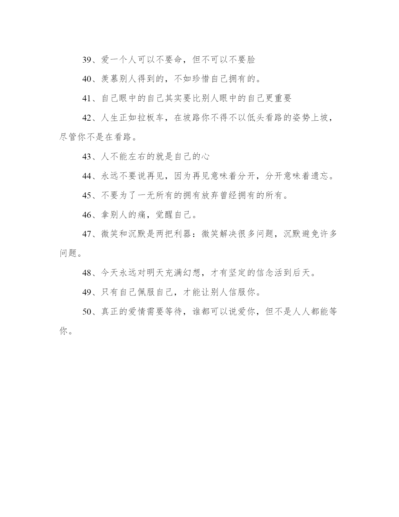 有关生活的哲理的快手签名2、细心把握身边每份感动,逝去的已逝去,不会再追忆。3、回味能使人走向成熟,能给人一种得意,一种自豪,多一份力量,能使人知足长乐。4、谁没有错过谁不贪新厌旧5、缘分是本书,翻的太快会错过,而认真读会让人泪流6、规则是一种约束,更是一种自由7、思想的偏激只会带来更偏激的答案。8、真正的满足来自你的内心,而不是外界的人和物。9、放弃想要的东西,才能够选择做正确的事情。10、其实每一条都通往阳光的大道,都充满坎坷。11、心绪比思维敏捷,语言比心绪理智。12、心中有爱,才会人见人爱!13、人发展的历程就象爬山,每登上一个高度都能看到更远更美的风景!14、把拳头收回来是为了更有力的还击。15、人生无非就是你笑笑人家,人家笑笑你。16、黑夜给了我黑色的眼睛,我却用它寻找光明17、家里的饭是为生活,学校的饭是为生存。18、疼痛是唯一可以让人瞬间清醒的东西19、成熟是一个很痛的词,它不一定会得到,却一定会失去20、杂草多的地方庄稼少,空话多的地方智慧少。21、做一个简单的人,踏实而务实。不沈溺幻想,不庸人自扰。22、懂得倾听别人的忠告,懂得分辨别人的赞美。23、因果不曾亏欠过我们什么,所以请不要抱怨。24、若要梦想实现,先从梦中醒来。25、人的一切痛苦,本质上都是对自己的无能的愤怒。26、虚无缥缈的东西向来不攻自破27、不要拿一个人的往事去怀疑一个人的本质。28、外在决定两个人在一起,内在决定两个人在一起多久!29、在这个浮躁的社会宁可装傻,也不要自作聪明30、有时不是世界太虚伪,只是我们太天真31、不是每次回头、都有人在原地静静的等待、这个道理、我们都要明白。32、是金子总会发光、是镜子总会反光、是人*最好死光33、你不跟着时间跑,就会跟丢。34、选择放弃可能是对的,但放弃选择必然是错德。35、人生是一趟旅行,只买单程票,不买回程票。36、偏见是迂腐,傲慢是精神上的自我高攀。37、你赐我万劫不复死而无葬38、拼搏就是为了得到想要的。39、爱一个人可以不要命,但不可以不要脸40、羡慕别人得到的,不如珍惜自己拥有的。41、自己眼中的自己其实要比别人眼中的自己更重要42、人生正如拉板车,在坡路你不得不以低头看路的姿势上坡,尽管你不是在看路。43、人不能左右的就是自己的心44、永远不要说再见,因为再见意味着分开,分开意味着遗忘。45、不要为了一无所有的拥有放弃曾经拥有的所有。46、拿别人的痛,觉醒自己。47、微笑和沉默是两把利器:微笑解决很多问题,沉默避免许多问题。48、今天永远对明天充满幻想,才有坚定的信念活到后天。49、只有自己佩服自己,才能让别人信服你。50、真正的爱情需要等待,谁都可以说爱你,但不是人人都能等你。