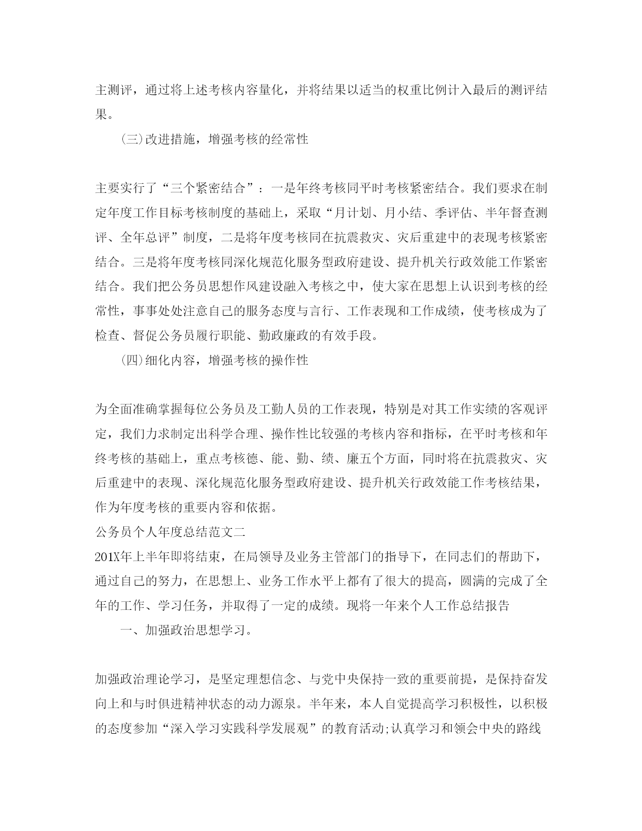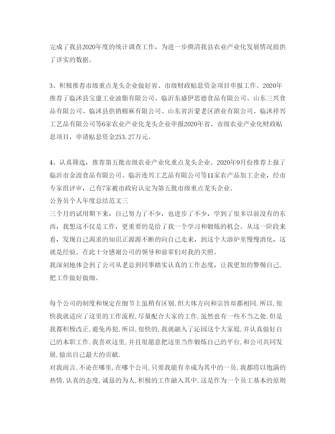 此资料由网络收集而来,如有侵权请告知上传者立即删除。资料共分享,我们负责传递知识。公务员个人年度总结范文当下我国公务员队伍管理中存在激励不足、管理混乱、腐败现象严重、专业性不强等问题,这些问题严重影响着公务员工作效率的提高。今天小编给大家整理了公务员个人年度总结,希望对大家有所帮助。公务员个人年度总结范文一201x年xx月xx日对全局人员进行了考核,现将考核情况汇报一、基本情况我局人员现有人员xx人,其中:公务员xx名,工勤人员x名,共有15人参加了年度国家公务员考核。通过走访、暗访、述职、投票,评出优秀公务员两名:钟泽民、李键同志,所占比例为13%,其余均为称职。二、主要做法(一)领导挂帅,突出考核的严肃性。在年度考核会议上,首先学习了彭人劳发[2020]227号文件精神,其次,党组书记、局长刘天奇同志就如何公平、公正、严肃、真实地搞好年度考核工作,发表了意见,明确了考核工作的方法、步骤、组织程序、报表填写等具体细节问题,由于领导重视,有力地保障了这次考核工作的顺利完成。(二)扩展层面,增加考核的参与性我们要求在开展年度考核工作时,要扩展公务员年度考核的触角,扩大考核层面。主要从以下三个方面考核测评:首先通过走访、暗访服务对象,了解其工作开展情况,了解服务对象的满意程度;其次通过与单位的干部职工谈话、测评,了解其在平时工作中的能力,了解干部职工的满意程度;最后,通过个人述职和领导评价,了解其一年来的重点工作和成效、个人年度岗位责任制工作完成情况、单位同事民主测评,通过将上述考核内容量化,并将结果以适当的权重比例计入最后的测评结果。(三)改进措施,增强考核的经常性主要实行了“三个紧密结合”:一是年终考核同平时考核紧密结合。我们要求在制定年度工作目标考核制度的基础上,采取“月计划、月小结、季评估、半年督查测评、全年总评”制度,二是将年度考核同在抗震救灾、灾后重建中的表现考核紧密结合。三是将年度考核同深化规范化服务型政府建设、提升机关行政效能工作紧密结合。我们把公务员思想作风建设融入考核之中,使大家在思想上认识到考核的经常性,事事处处注意自己的服务态度与言行、工作表现和工作成绩,使考核成为了检查、督促公务员履行职能、勤政廉政的有效手段。(四)细化内容,增强考核的操作性为全面准确掌握每位公务员及工勤人员的工作表现,特别是对其工作实绩的客观评定,我们力求制定出科学合理、操作性比较强的考核内容和指标,在平时考核和年终考核的基础上,重点考核德、能、勤、绩、廉五个方面,同时将在抗震救灾、灾后重建中的表现、深化规范化服务型政府建设、提升机关行政效能工作考核结果,作为年度考核的重要内容和依据。公务员个人年度总结范文二201X年上半年即将结束,在局领导及业务主管部门的指导下,在同志们的帮助下,通过自己的努力,在思想上、业务工作水平上都有了很大的提高,圆满的完成了全年的工作、学习任务,并取得了一定的成绩。现将一年来个人工作总结报告一、加强政治思想学习。加强政治理论学习,是坚定理想信念、与党中央保持一致的重要前提,是保持奋发向上和与时俱进精神状态的动力源泉。半年来,本人自觉提高学习积极性,以积极的态度参加“深入学习实践科学发展观”的教育活动;认真学习和领会中央的路线和各项方针政策,及时把思想认识统一到中央的精神上来,并以此指导个人的言行。树立了“讲工作、讲团结、讲奉献”,“只为成功找方法,不为失败找理由”的个人工作信念,成为自己“基础工作做牢、创新工作突破”的动力,不仅自己能认真学习、深刻领会,而且还利用多种渠道和途径,经常向工作对象作宣传引导工作。在学习中,能联系思想工作实际,努力做到围绕主题、把握灵魂、领会精髓。对全面建设小康社会的目标更加充满信心,同时增强了深入学习实践科学发展观活动,推进我县农业产业化纵深发展的主人翁责任感。二、完成本职岗位工作的情况。半年来,我以负责的态度努力完成个人承担的各项工作,积极协助有关部门完成年度部门全部工作任务:1、组织农产品加工企业参加各种农博会。今年5月份成功组织两家企业参加省政府在深圳举办的首届“山东名优农产品及食品在深圳展示订货会”。9月份又组织3家企业参加了“青岛国际农交会”11月份又参与筹备了在临沂举办的首届“中国农产品加工与流通博览会”并制定了《临沭县参加中国农产品加工与流通博览会筹展实施方案》。以及各项具体的会务准备工作。农博会参展期间共签约7个项目,金额1850万元,达成合作意向23个涉及金额5200多万元。通过参加农博会,为我县农业产业化龙头企业沟通信息、扩大宣传、寻找商机,提高了知名度,拓展了市场空间。2、认真做好我县农业产业化龙头企业和一村一品专业村(镇)的统计调查工作。今年2-3月份组织开展了2020年度销售收入500万元以上的龙头企业及202