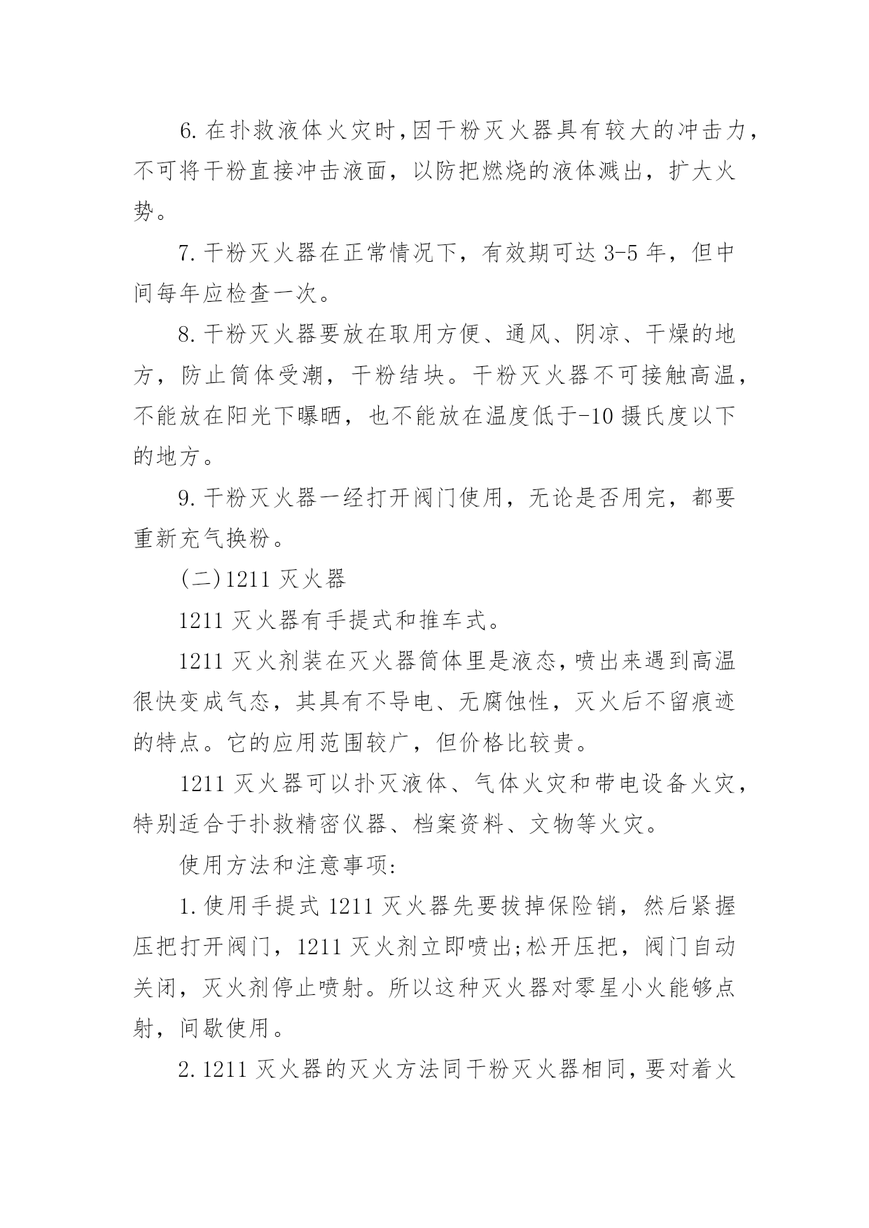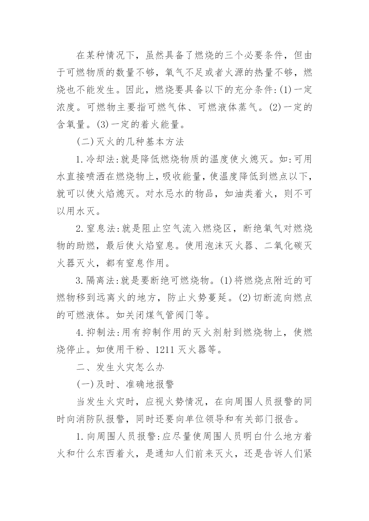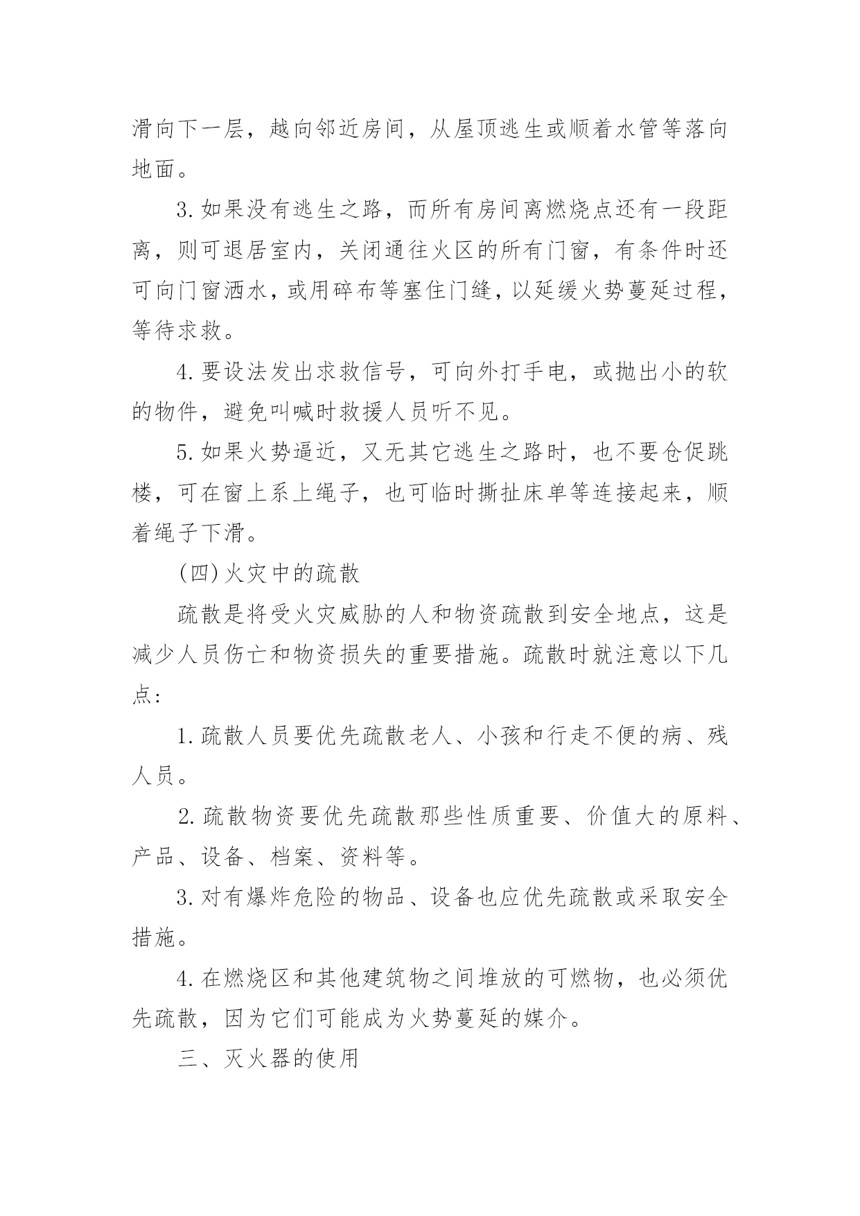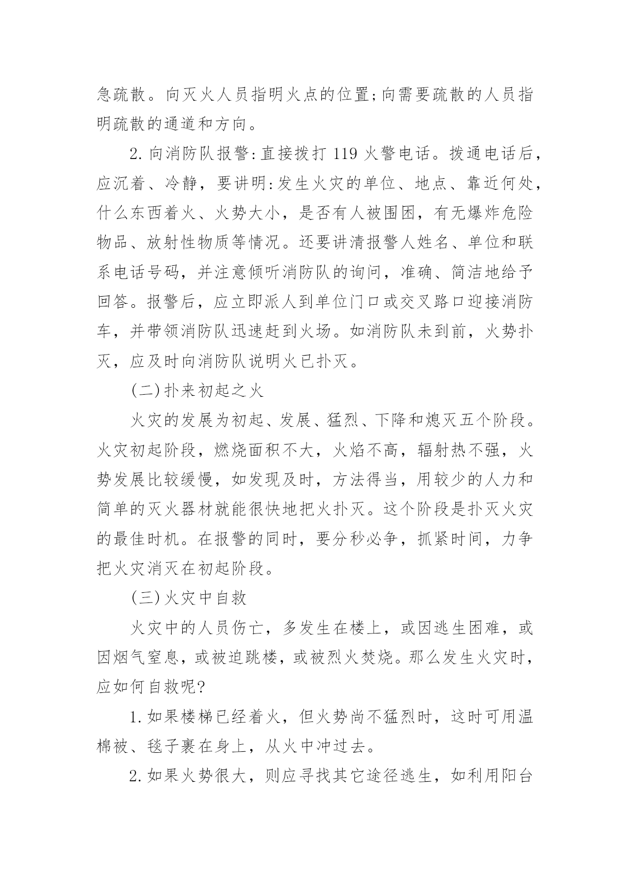 小学交通消防安全知识讲座2017年小学交通消防安全知识讲座安全,生命永恒的旗帜,一个重中之重的话题,它凝聚着千家万户的幸福与欢乐。下面是小编整理的关于小学交通消防安全知识讲座,欢迎参考!【1】小学交通消防安全知识讲座一、防火安全常识(一)燃烧的基本知识燃烧,俗称“起火”、“着火”,是一种发光、发热的化学反应,它需具备以下三个条件:1.要有可燃物。凡是能与空气中的氧或其他氧化剂起化学反应的物质称可燃物。可燃物按其物理状态分为气体、液体和固体。(1)可燃气体种类很多,如煤气、甲烷等。(2)可燃液体使用很广泛,如汽油、柴油、煤油、酒精等。(3)可燃固体种类极多,如木材、纸张等。2.要有助燃物。助燃物主要为氧气或空气,因为空气中含有21%的氧,其他助燃物有各类氧化剂,如过氧化物、硝酸及其盐类。3.要有着火源。着火源主要是热能,常见的有以下几种:(1)明火。如打火机火、蜡烛火、火柴火等。(2)高温物体。如白炽灯泡、汽车排气等。(3)电热能。如电阻发热、电流发热、电火花等。在某种情况下,虽然具备了燃烧的三个必要条件,但由于可燃物质的数量不够,氧气不足或者火源的热量不够,燃烧也不能发生。因此,燃烧要具备以下的充分条件:(1)一定浓度。可燃物主要指可燃气体、可燃液体蒸气。(2)一定的含氧量。(3)一定的着火能量。(二)灭火的几种基本方法1.冷却法:就是降低燃烧物质的温度使火熄灭。如:可用水直接喷洒在燃烧物上,吸收能量,使温度降低到燃点以下,就可以使火焰熄灭。对水忌水的物品,如油类着火,则不可以用水灭。2.窒息法:就是阻止空气流入燃烧区,断绝氧气对燃烧物的助燃,最后使火焰窒息。使用泡沫灭火器、二氧化碳灭火器灭火,都有窒息作用。3.隔离法:就是要断绝可燃烧物。(1)将燃烧点附近的可燃物移到远离火的地方,防止火势蔓延。(2)切断流向燃点的可燃液体。如关闭煤气管阀门等。4.抑制法:用有抑制作用的灭火剂射到燃烧物上,使燃烧停止。如使用干粉、1211灭火器等。二、发生火灾怎么办(一)及时、准确地报警当发生火灾时,应视火势情况,在向周围人员报警的同时向消防队报警,同时还要向单位领导和有关部门报告。1.向周围人员报警:应尽量使周围人员明白什么地方着火和什么东西着火,是通知人们前来灭火,还是告诉人们紧急疏散。向灭火人员指明火点的位置;向需要疏散的人员指明疏散的通道和方向。2.向消防队报警:直接拨打119火警电话。拨通电话后,应沉着、冷静,要讲明:发生火灾的单位、地点、靠近何处,什么东西着火、火势大小,是否有人被围困,有无爆炸危险物品、放射性物质等情况。还要讲清报警人姓名、单位和联系电话号码,并注意倾听消防队的询问,准确、简洁地给予回答。报警后,应立即派人到单位门口或交叉路口迎接消防车,并带领消防队迅速赶到火场。如消防队未到前,火势扑灭,应及时向消防队说明火已扑灭。(二)扑来初起之火火灾的发展为初起、发展、猛烈、下降和熄灭五个阶段。火灾初起阶段,燃烧面积不大,火焰不高,辐射热不强,火势发展比较缓慢,如发现及时,方法得当,用较少的人力和简单的灭火器材就能很快地把火扑灭。这个阶段是扑灭火灾的最佳时机。在报警的同时,要分秒必争,抓紧时间,力争把火灾消灭在初起阶段。(三)火灾中自救火灾中的人员伤亡,多发生在楼上,或因逃生困难,或因烟气窒息,或被迫跳楼,或被烈火焚烧。那么发生火灾时,应如何自救呢?1.如果楼梯已经着火,但火势尚不猛烈时,这时可用温棉被、毯子裹在身上,从火中冲过去。2.如果火势很大,则应寻找其它途径逃生,如利用阳台滑向下一层,越向邻近房间,从屋顶逃生或顺着水管等落向地面。3.如果没有逃生之路,而所有房间离燃烧点还有一段距离,则可退居室内,关闭通往火区的所有门窗,有条件时还可向门窗洒水,或用碎布等塞住门缝,以延缓火势蔓延过程,等待求救。4.要设法发出求救信号,可向外打手电,或抛出小的软的物件,避免叫喊时救援人员听不见。5.如果火势逼近,又无其它逃生之路时,也不要仓促跳楼,可在窗上系上绳子,也可临时撕扯床单等连接起来,顺着绳子下滑。(四)火灾中的疏散疏散是将受火灾威胁的人和物资疏散到安全地点,这是减少人员伤亡和物资损失的重要措施。疏散时就注意以下几点:1.疏散人员要优先疏散老人、小孩和行走不便的病、残人员。2.疏散物资要优先疏散那些性质重要、价值大的原料、产品、设备、档案、资料等。3.对有爆炸危险的物品、设备也应优先疏散或采取安全措施。4.在燃烧区和其他建筑物之间堆放的可燃物,也必须优先疏散,因为它们可能成为火势蔓延的媒介。三、灭火器的使用(一)干粉灭火器干粉灭火器有手提式、贮压式。其性能有普通(BC)和通用(ABC)干粉之分。干粉灭火器筒体内装的干粉,使用时在压力的驱动下从喷嘴内向外喷出。干粉灭火器适用扑救液体火灾、带电设备火灾,特别适用于扑救气体火灾。这