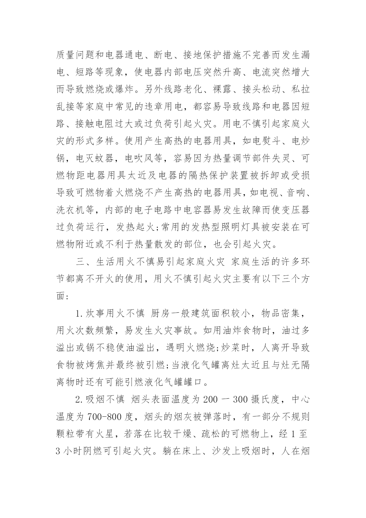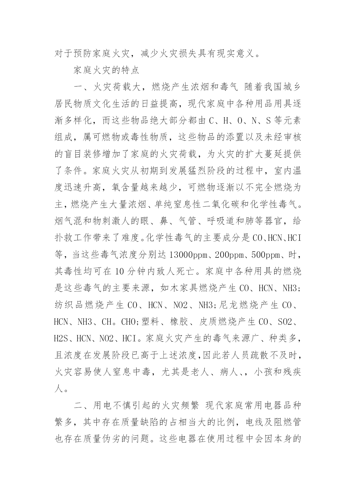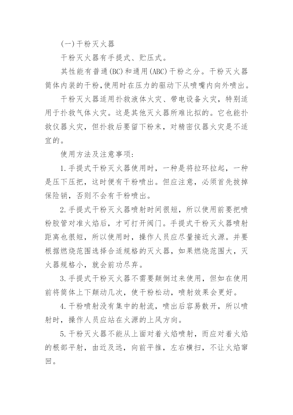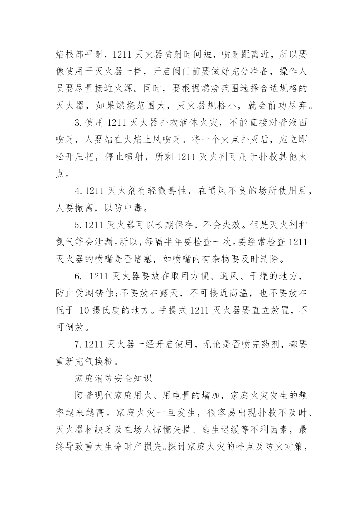 小学交通消防安全知识讲座2017年小学交通消防安全知识讲座安全,生命永恒的旗帜,一个重中之重的话题,它凝聚着千家万户的幸福与欢乐。下面是小编整理的关于小学交通消防安全知识讲座,欢迎参考!【1】小学交通消防安全知识讲座一、防火安全常识(一)燃烧的基本知识燃烧,俗称“起火”、“着火”,是一种发光、发热的化学反应,它需具备以下三个条件:1.要有可燃物。凡是能与空气中的氧或其他氧化剂起化学反应的物质称可燃物。可燃物按其物理状态分为气体、液体和固体。(1)可燃气体种类很多,如煤气、甲烷等。(2)可燃液体使用很广泛,如汽油、柴油、煤油、酒精等。(3)可燃固体种类极多,如木材、纸张等。2.要有助燃物。助燃物主要为氧气或空气,因为空气中含有21%的氧,其他助燃物有各类氧化剂,如过氧化物、硝酸及其盐类。3.要有着火源。着火源主要是热能,常见的有以下几种:(1)明火。如打火机火、蜡烛火、火柴火等。(2)高温物体。如白炽灯泡、汽车排气等。(3)电热能。如电阻发热、电流发热、电火花等。在某种情况下,虽然具备了燃烧的三个必要条件,但由于可燃物质的数量不够,氧气不足或者火源的热量不够,燃烧也不能发生。因此,燃烧要具备以下的充分条件:(1)一定浓度。可燃物主要指可燃气体、可燃液体蒸气。(2)一定的含氧量。(3)一定的着火能量。(二)灭火的几种基本方法1.冷却法:就是降低燃烧物质的温度使火熄灭。如:可用水直接喷洒在燃烧物上,吸收能量,使温度降低到燃点以下,就可以使火焰熄灭。对水忌水的物品,如油类着火,则不可以用水灭。2.窒息法:就是阻止空气流入燃烧区,断绝氧气对燃烧物的助燃,最后使火焰窒息。使用泡沫灭火器、二氧化碳灭火器灭火,都有窒息作用。3.隔离法:就是要断绝可燃烧物。(1)将燃烧点附近的可燃物移到远离火的地方,防止火势蔓延。(2)切断流向燃点的可燃液体。如关闭煤气管阀门等。4.抑制法:用有抑制作用的灭火剂射到燃烧物上,使燃烧停止。如使用干粉、1211灭火器等。二、发生火灾怎么办(一)及时、准确地报警当发生火灾时,应视火势情况,在向周围人员报警的同时向消防队报警,同时还要向单位领导和有关部门报告。1.向周围人员报警:应尽量使周围人员明白什么地方着火和什么东西着火,是通知人们前来灭火,还是告诉人们紧急疏散。向灭火人员指明火点的位置;向需要疏散的人员指明疏散的通道和方向。2.向消防队报警:直接拨打119火警电话。拨通电话后,应沉着、冷静,要讲明:发生火灾的单位、地点、靠近何处,什么东西着火、火势大小,是否有人被围困,有无爆炸危险物品、放射性物质等情况。还要讲清报警人姓名、单位和联系电话号码,并注意倾听消防队的询问,准确、简洁地给予回答。报警后,应立即派人到单位门口或交叉路口迎接消防车,并带领消防队迅速赶到火场。如消防队未到前,火势扑灭,应及时向消防队说明火已扑灭。(二)扑来初起之火火灾的发展为初起、发展、猛烈、下降和熄灭五个阶段。火灾初起阶段,燃烧面积不大,火焰不高,辐射热不强,火势发展比较缓慢,如发现及时,方法得当,用较少的人力和简单的灭火器材就能很快地把火扑灭。这个阶段是扑灭火灾的最佳时机。在报警的同时,要分秒必争,抓紧时间,力争把火灾消灭在初起阶段。(三)火灾中自救火灾中的人员伤亡,多发生在楼上,或因逃生困难,或因烟气窒息,或被迫跳楼,或被烈火焚烧。那么发生火灾时,应如何自救呢?1.如果楼梯已经着火,但火势尚不猛烈时,这时可用温棉被、毯子裹在身上,从火中冲过去。2.如果火势很大,则应寻找其它途径逃生,如利用阳台滑向下一层,越向邻近房间,从屋顶逃生或顺着水管等落向地面。3.如果没有逃生之路,而所有房间离燃烧点还有一段距离,则可退居室内,关闭通往火区的所有门窗,有条件时还可向门窗洒水,或用碎布等塞住门缝,以延缓火势蔓延过程,等待求救。4.要设法发出求救信号,可向外打手电,或抛出小的软的物件,避免叫喊时救援人员听不见。5.如果火势逼近,又无其它逃生之路时,也不要仓促跳楼,可在窗上系上绳子,也可临时撕扯床单等连接起来,顺着绳子下滑。(四)火灾中的疏散疏散是将受火灾威胁的人和物资疏散到安全地点,这是减少人员伤亡和物资损失的重要措施。疏散时就注意以下几点:1.疏散人员要优先疏散老人、小孩和行走不便的病、残人员。2.疏散物资要优先疏散那些性质重要、价值大的原料、产品、设备、档案、资料等。3.对有爆炸危险的物品、设备也应优先疏散或采取安全措施。4.在燃烧区和其他建筑物之间堆放的可燃物,也必须优先疏散,因为它们可能成为火势蔓延的媒介。三、灭火器的使用(一)干粉灭火器干粉灭火器有手提式、贮压式。其性能有普通(BC)和通用(ABC)干粉之分。干粉灭火器筒体内装的干粉,使用时在压力的驱动下从喷嘴内向外喷出。干粉灭火器适用扑救液体火灾、带电设备火灾,特别适用于扑救气体火灾。这