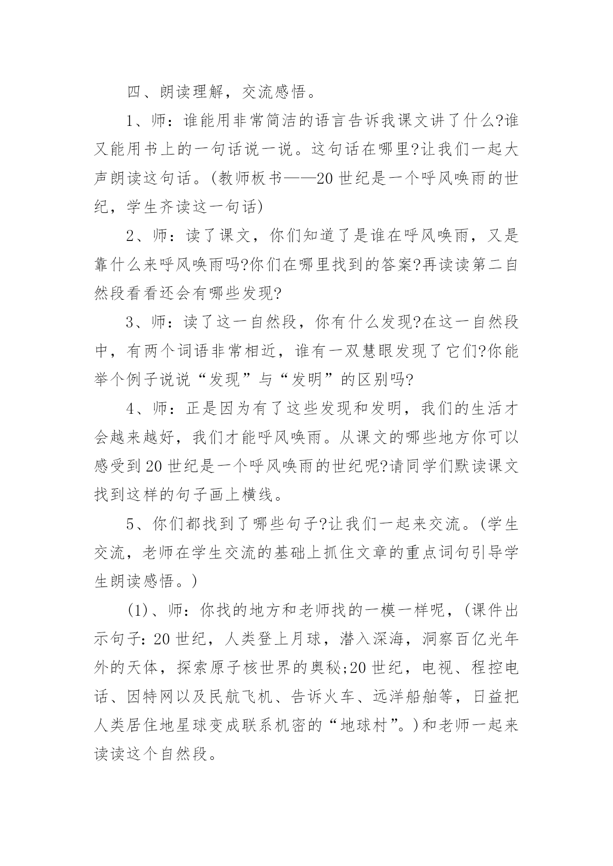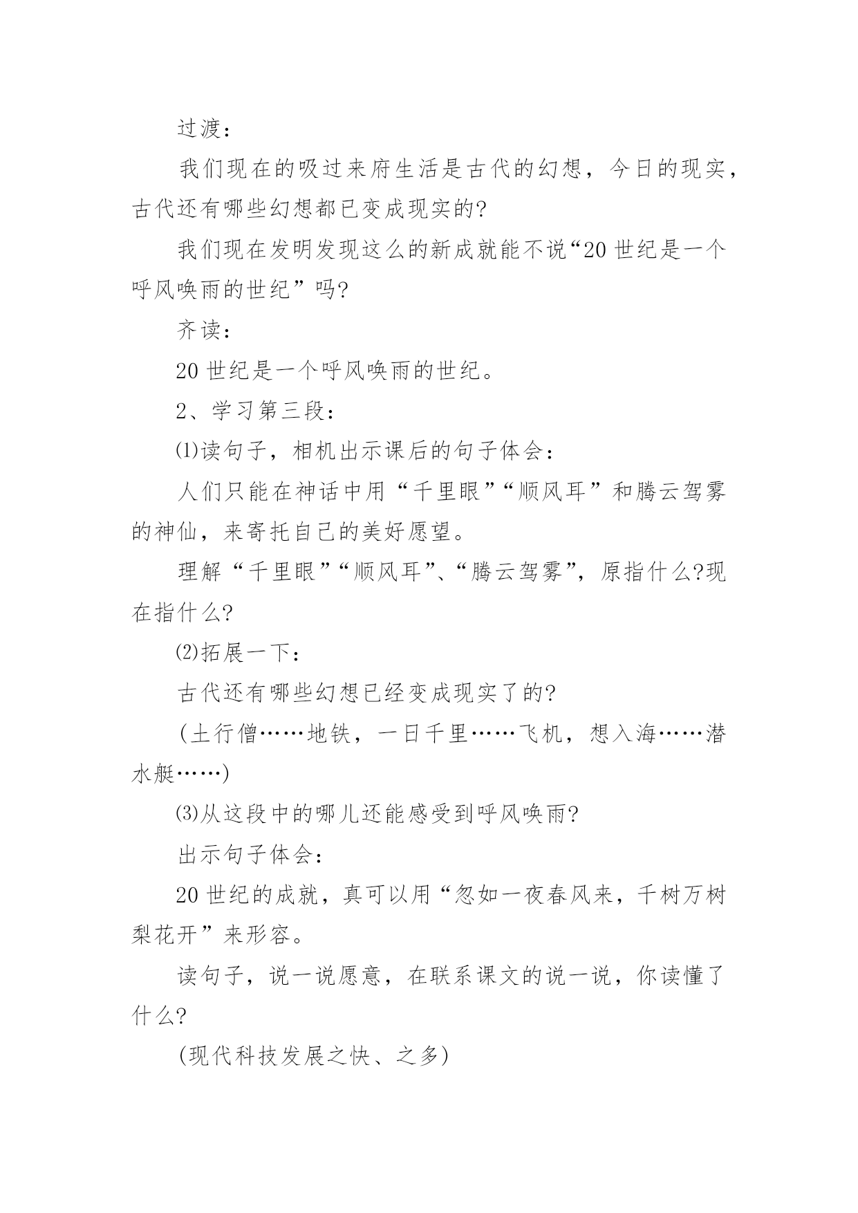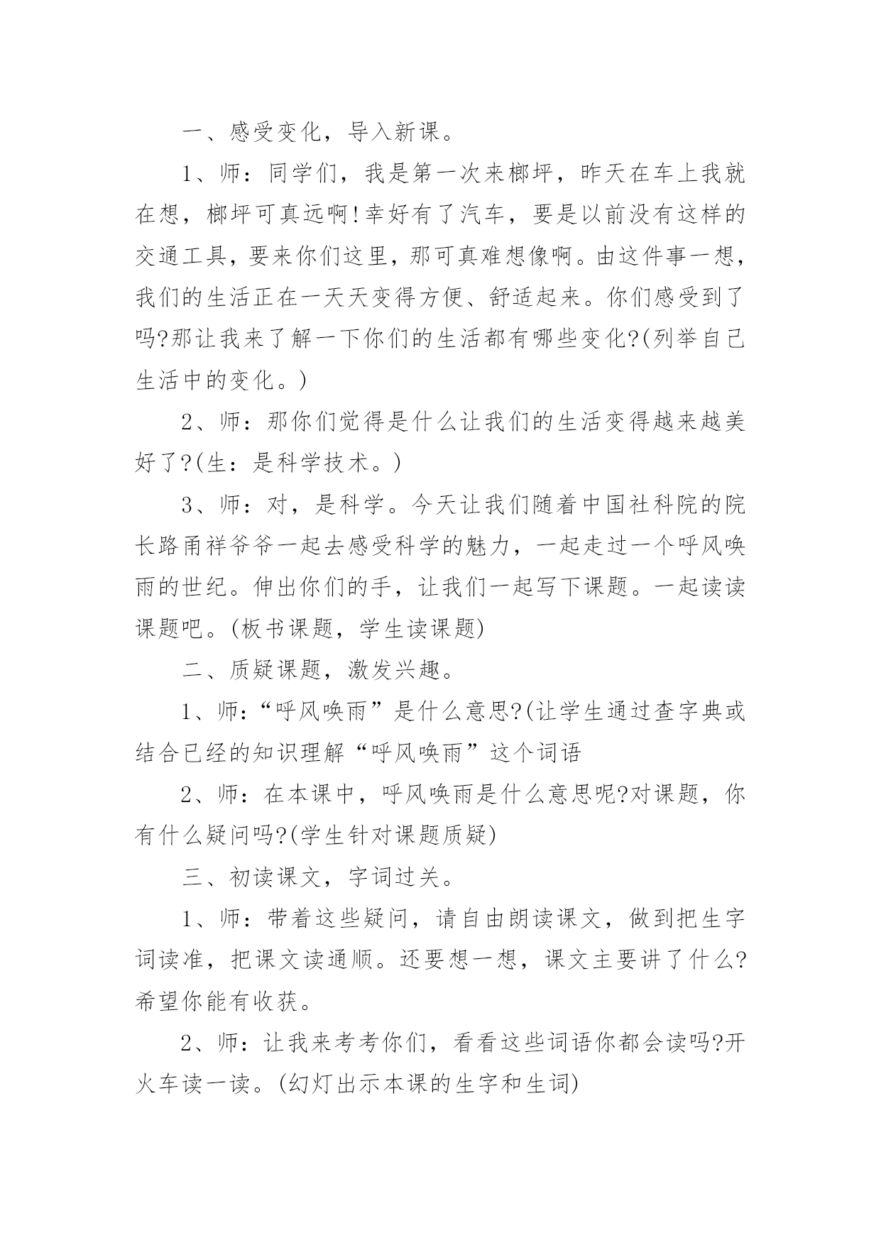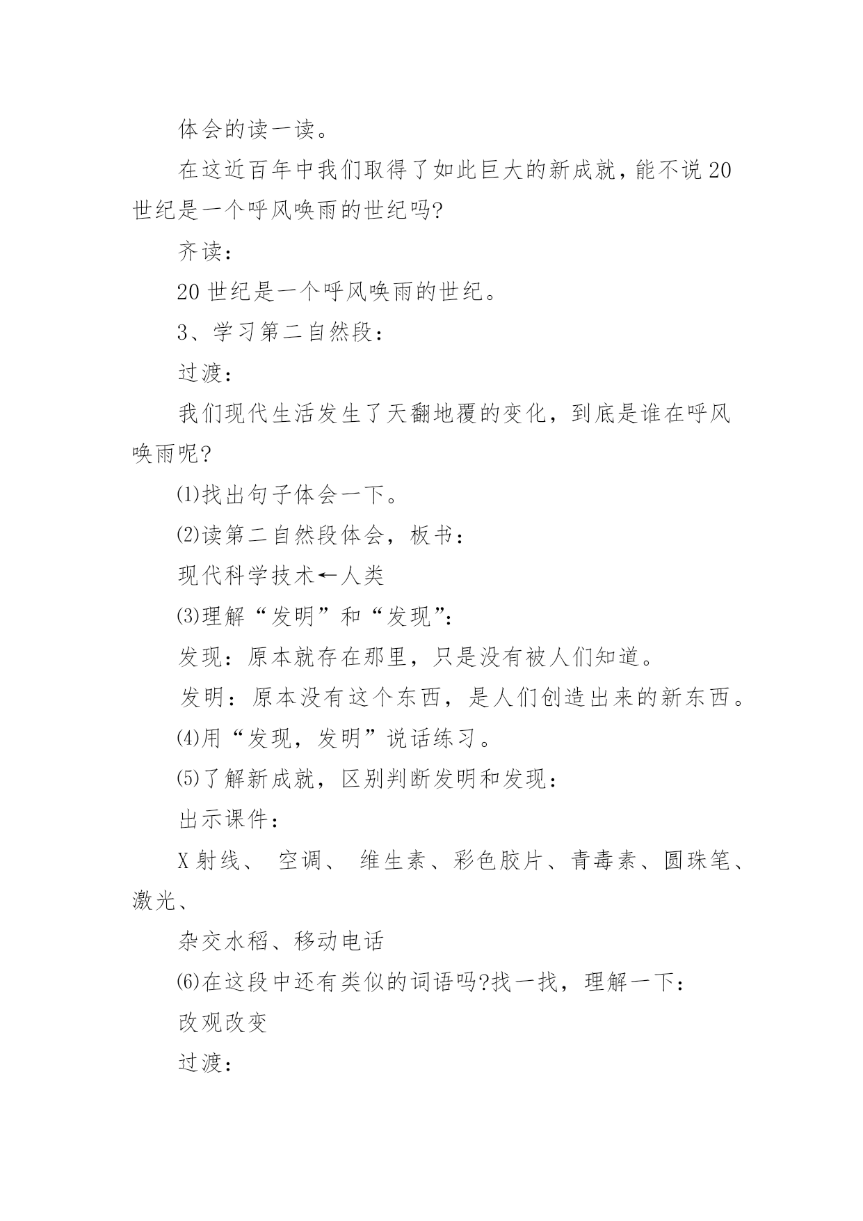 呼风唤雨的世纪教学设计呼风唤雨的世纪教学设计(精选15篇)教学设计是作为教者,基于对学生和教学任务的分析,而对教学目标、教学方法、教学材料、教学进度、课程评估等做出系统设计的一门学科。下面是小编精选的关于呼风唤雨的世纪教学设计,欢迎参考!呼风唤雨的世纪教学设计篇1【教学目的】1、认识生字,学会生词。2、读通课文,读懂课文,理解课文中的句子。3、教育学生从小爱科学,学科学,利用科学,了解现代的新科技和取得的新成就。【教学准备】1、课件,收集有关现代科技的新成就。2、小黑板。【教学过程】一、创设情景导入同学们,我向问问大家,和你们的爷爷、奶奶小时候相比,你们的生活有什么变化?今天我们就一起来学习一篇关于生活变化的课文,读题,理解课题,当看到呼风唤雨就想到谁?呼风唤雨:原指神仙利用法力能使天刮风下雨,现在引申为“能够支配自然的一种巨大力量”。现在我们就和路甬祥叔叔一起感受生活的精彩。简单介绍路甬祥。二、自读课文1、读准字音,看请字形。2、把读不好的多独几遍。三、检查自读情况1、出示生词读、理解,相机出示图片帮助理解词语:农耕社会、依赖、潜水艇、船舶、原子核、程控电话、因特网、腾云驾雾、归根到底、出乎意料2、读句子,把自己读不好的句子读出来给同学们听听,纠正字音和断句等。(长句不好读,外国人的名字不好读、多音字易错、翘舌音度不准……)四、默读课文课文围绕哪句话来写的?(找中心句)20世纪是一个呼风唤雨的世纪。五、自学课文把你能感受到20世纪呼风唤雨的句子勾画出来,体会体会。六、小组内交流自学结果七、全班交流,理解课文1、学习第四自然段:⑴找出句子体会:如:20世纪,人类登上月球,潜入深海,洞察百亿光年外的天体,探索原子核的奥秘;20世纪,电视、程控电话、因特网以及民航飞机、高速火车、远洋船舶等,日益把人类居住的星球变成联系紧密的“地球村”。作者是用什么样的表达方法来说明我们这个世纪是个呼风唤雨的'世纪的?(举例子)⑵拓展一下:你还知道哪些现代科技新成就?(生活、医疗、军事、航空、交通等方面)⑶出示收集的相关现代科技新成就的图片。⑷学习这段的后部分内容:过渡:人类取得了巨大的成就,使我们的生活怎样呢?读句子:人类生活的舒适和方便,是连过去的王公贵族也不敢想的。科学在改变着人类的精神文化生活、也在改变着人类的物质生活。体会作者是说明表达方法来说明我们这个世纪是个呼风唤雨的的世纪的?(做比较)体会物质生活和精神生活有哪些变化?过渡:我们现在的吸过来府生活是古代的幻想,今日的现实,古代还有哪些幻想都已变成现实的?我们现在发明发现这么的新成就能不说“20世纪是一个呼风唤雨的世纪”吗?齐读:20世纪是一个呼风唤雨的世纪。2、学习第三段:⑴读句子,相机出示课后的句子体会:人们只能在神话中用“千里眼”“顺风耳”和腾云驾雾的神仙,来寄托自己的美好愿望。理解“千里眼”“顺风耳”、“腾云驾雾”,原指什么?现在指什么?⑵拓展一下:古代还有哪些幻想已经变成现实了的?(土行僧……地铁,一日千里……飞机,想入海……潜水艇……)⑶从这段中的哪儿还能感受到呼风唤雨?出示句子体会:20世纪的成就,真可以用“忽如一夜春风来,千树万树梨花开”来形容。读句子,说一说愿意,在联系课文的说一说,你读懂了什么?(现代科技发展之快、之多)体会的读一读。在这近百年中我们取得了如此巨大的新成就,能不说20世纪是一个呼风唤雨的世纪吗?齐读:20世纪是一个呼风唤雨的世纪。3、学习第二自然段:过渡:我们现代生活发生了天翻地覆的变化,到底是谁在呼风唤雨呢?⑴找出句子体会一下。⑵读第二自然段体会,板书:现代科学技术←人类⑶理解“发明”和“发现”:发现:原本就存在那里,只是没有被人们知道。发明:原本没有这个东西,是人们创造出来的新东西。⑷用“发现,发明”说话练习。⑸了解新成就,区别判断发明和发现:出示课件:X射线、空调、维生素、彩色胶片、青毒素、圆珠笔、激光、杂交水稻、移动电话⑹在这段中还有类似的词语吗?找一找,理解一下:改观改变过渡:20世纪人们利用科学成就使我们实现了古代人那么多的幻想,使我们过上了幸福生活。是古代的幻想,今日的现实,是幻想让我们有了努力的目标,是努力让我们过上了今天的幸福生活。这时,你们也插上想像的翅膀,当一名小小设计师,描绘一下你明日美好的未来。(可以用文字描述,也可以用画图表现)你现在就是小小设计师,描绘一下你心中明日的美好前景吧!八、总结同学们从小爱科学,学科学,用科学,使你们的未来生活更精彩,只要你们大胆的想像就一定发现和发明更多的新成就。就用奇思妙想中董浩叔叔一句话来结束吧。齐读:不怕做不到,就怕想不到。呼风唤雨的世纪教学设计篇2教学目的:1、认读生字新词。2、有感情的朗读课文,体会科学小品的语言特点,联系自己的生活实际谈自己的阅读感受。3、了解20世纪科学技术给