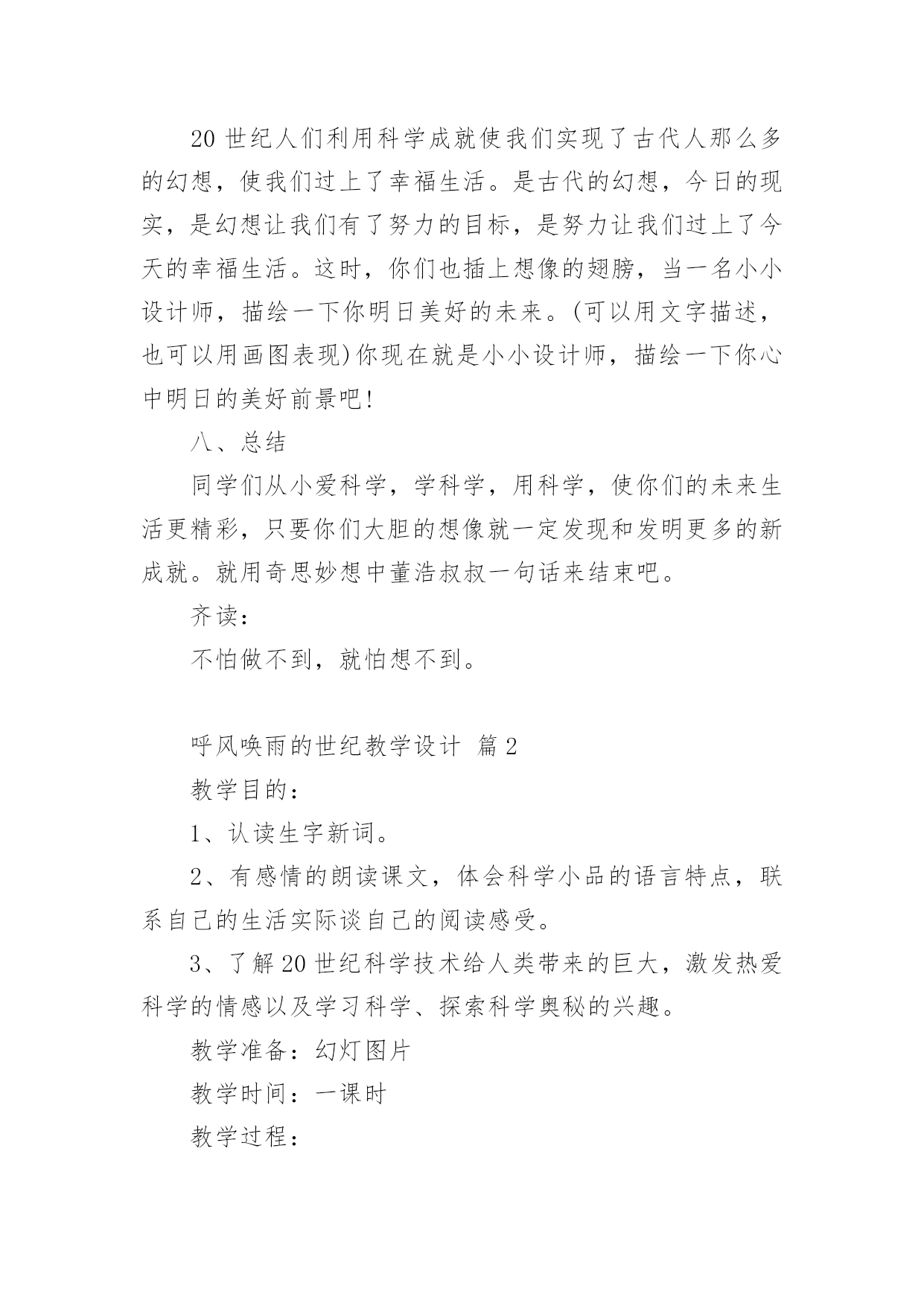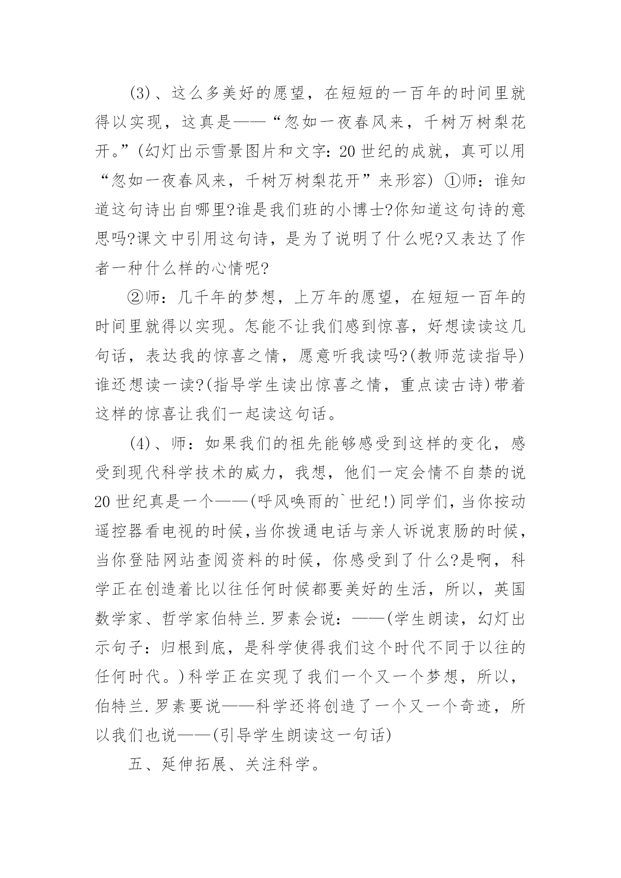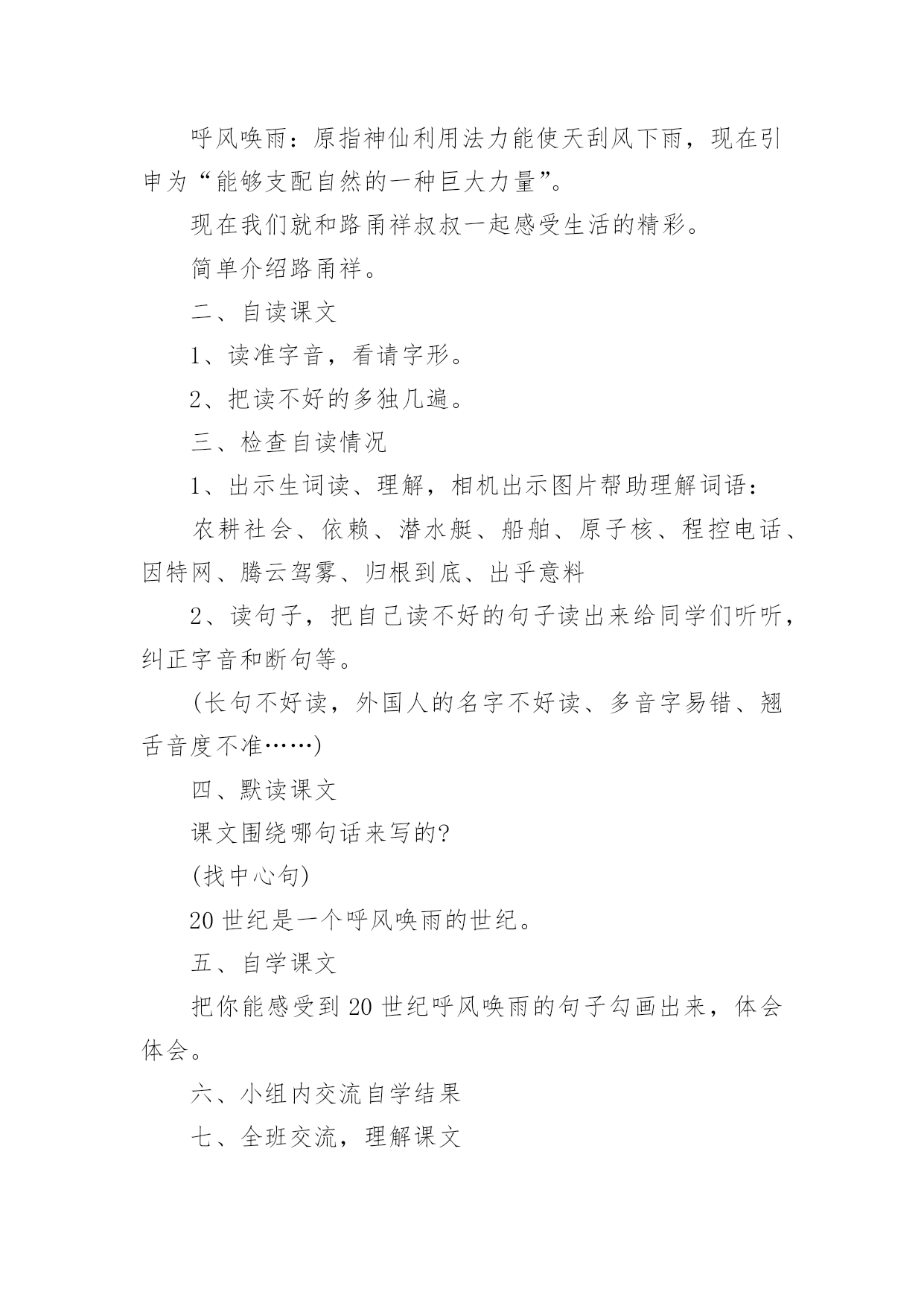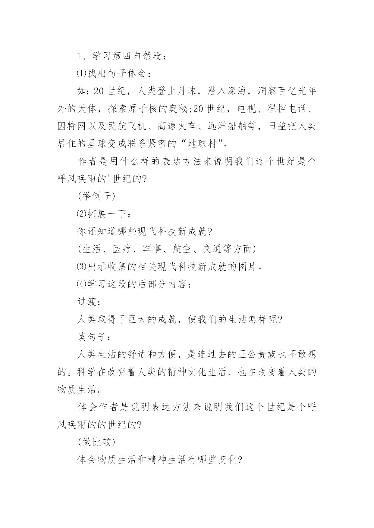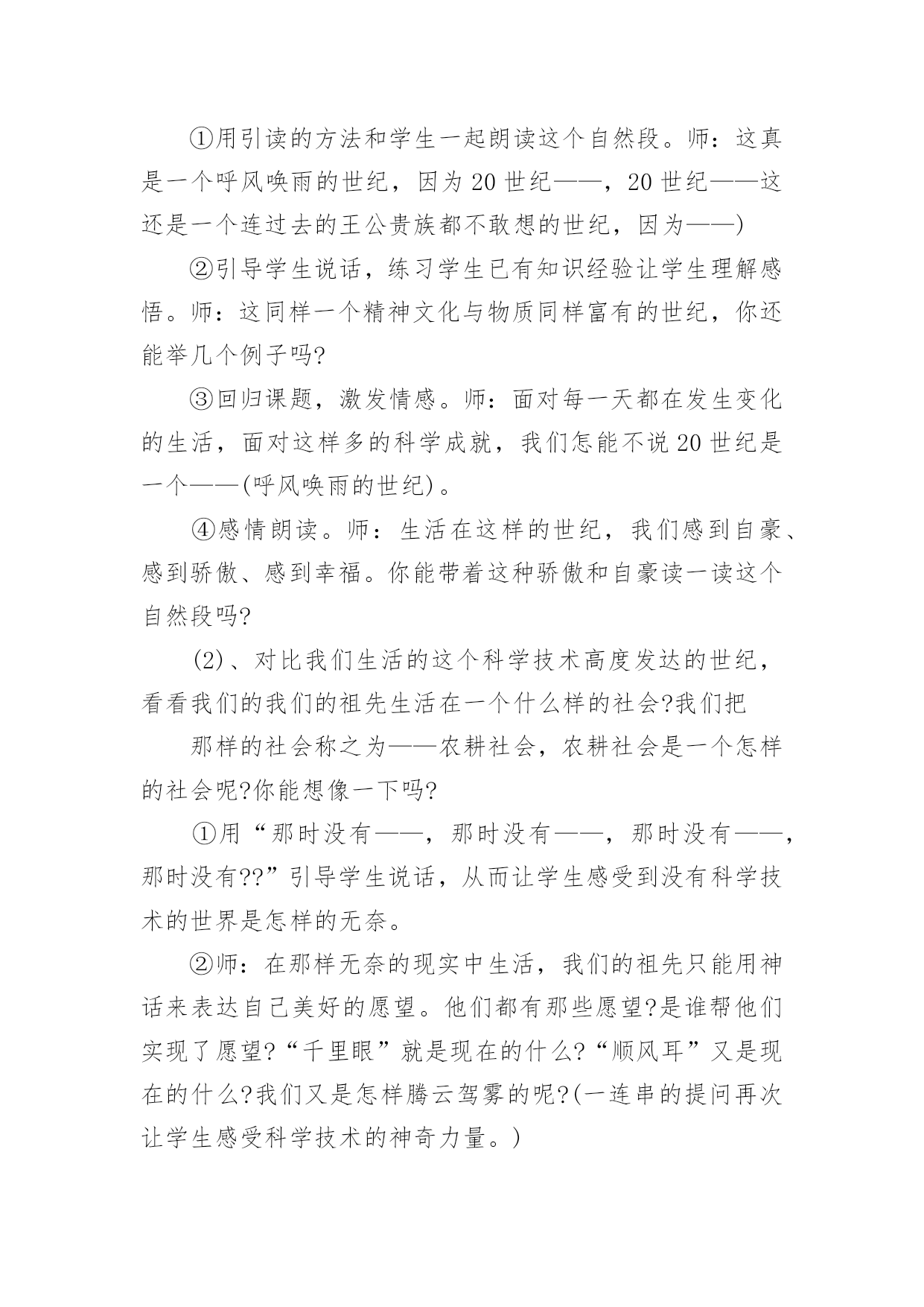 呼风唤雨的世纪教学设计呼风唤雨的世纪教学设计(精选15篇)教学设计是作为教者,基于对学生和教学任务的分析,而对教学目标、教学方法、教学材料、教学进度、课程评估等做出系统设计的一门学科。下面是小编精选的关于呼风唤雨的世纪教学设计,欢迎参考!呼风唤雨的世纪教学设计篇1【教学目的】1、认识生字,学会生词。2、读通课文,读懂课文,理解课文中的句子。3、教育学生从小爱科学,学科学,利用科学,了解现代的新科技和取得的新成就。【教学准备】1、课件,收集有关现代科技的新成就。2、小黑板。【教学过程】一、创设情景导入同学们,我向问问大家,和你们的爷爷、奶奶小时候相比,你们的生活有什么变化?今天我们就一起来学习一篇关于生活变化的课文,读题,理解课题,当看到呼风唤雨就想到谁?呼风唤雨:原指神仙利用法力能使天刮风下雨,现在引申为“能够支配自然的一种巨大力量”。现在我们就和路甬祥叔叔一起感受生活的精彩。简单介绍路甬祥。二、自读课文1、读准字音,看请字形。2、把读不好的多独几遍。三、检查自读情况1、出示生词读、理解,相机出示图片帮助理解词语:农耕社会、依赖、潜水艇、船舶、原子核、程控电话、因特网、腾云驾雾、归根到底、出乎意料2、读句子,把自己读不好的句子读出来给同学们听听,纠正字音和断句等。(长句不好读,外国人的名字不好读、多音字易错、翘舌音度不准……)四、默读课文课文围绕哪句话来写的?(找中心句)20世纪是一个呼风唤雨的世纪。五、自学课文把你能感受到20世纪呼风唤雨的句子勾画出来,体会体会。六、小组内交流自学结果七、全班交流,理解课文1、学习第四自然段:⑴找出句子体会:如:20世纪,人类登上月球,潜入深海,洞察百亿光年外的天体,探索原子核的奥秘;20世纪,电视、程控电话、因特网以及民航飞机、高速火车、远洋船舶等,日益把人类居住的星球变成联系紧密的“地球村”。作者是用什么样的表达方法来说明我们这个世纪是个呼风唤雨的'世纪的?(举例子)⑵拓展一下:你还知道哪些现代科技新成就?(生活、医疗、军事、航空、交通等方面)⑶出示收集的相关现代科技新成就的图片。⑷学习这段的后部分内容:过渡:人类取得了巨大的成就,使我们的生活怎样呢?读句子:人类生活的舒适和方便,是连过去的王公贵族也不敢想的。科学在改变着人类的精神文化生活、也在改变着人类的物质生活。体会作者是说明表达方法来说明我们这个世纪是个呼风唤雨的的世纪的?(做比较)体会物质生活和精神生活有哪些变化?过渡:我们现在的吸过来府生活是古代的幻想,今日的现实,古代还有哪些幻想都已变成现实的?我们现在发明发现这么的新成就能不说“20世纪是一个呼风唤雨的世纪”吗?齐读:20世纪是一个呼风唤雨的世纪。2、学习第三段:⑴读句子,相机出示课后的句子体会:人们只能在神话中用“千里眼”“顺风耳”和腾云驾雾的神仙,来寄托自己的美好愿望。理解“千里眼”“顺风耳”、“腾云驾雾”,原指什么?现在指什么?⑵拓展一下:古代还有哪些幻想已经变成现实了的?(土行僧……地铁,一日千里……飞机,想入海……潜水艇……)⑶从这段中的哪儿还能感受到呼风唤雨?出示句子体会:20世纪的成就,真可以用“忽如一夜春风来,千树万树梨花开”来形容。读句子,说一说愿意,在联系课文的说一说,你读懂了什么?(现代科技发展之快、之多)体会的读一读。在这近百年中我们取得了如此巨大的新成就,能不说20世纪是一个呼风唤雨的世纪吗?齐读:20世纪是一个呼风唤雨的世纪。3、学习第二自然段:过渡:我们现代生活发生了天翻地覆的变化,到底是谁在呼风唤雨呢?⑴找出句子体会一下。⑵读第二自然段体会,板书:现代科学技术←人类⑶理解“发明”和“发现”:发现:原本就存在那里,只是没有被人们知道。发明:原本没有这个东西,是人们创造出来的新东西。⑷用“发现,发明”说话练习。⑸了解新成就,区别判断发明和发现:出示课件:X射线、空调、维生素、彩色胶片、青毒素、圆珠笔、激光、杂交水稻、移动电话⑹在这段中还有类似的词语吗?找一找,理解一下:改观改变过渡:20世纪人们利用科学成就使我们实现了古代人那么多的幻想,使我们过上了幸福生活。是古代的幻想,今日的现实,是幻想让我们有了努力的目标,是努力让我们过上了今天的幸福生活。这时,你们也插上想像的翅膀,当一名小小设计师,描绘一下你明日美好的未来。(可以用文字描述,也可以用画图表现)你现在就是小小设计师,描绘一下你心中明日的美好前景吧!八、总结同学们从小爱科学,学科学,用科学,使你们的未来生活更精彩,只要你们大胆的想像就一定发现和发明更多的新成就。就用奇思妙想中董浩叔叔一句话来结束吧。齐读:不怕做不到,就怕想不到。呼风唤雨的世纪教学设计篇2教学目的:1、认读生字新词。2、有感情的朗读课文,体会科学小品的语言特点,联系自己的生活实际谈自己的阅读感受。3、了解20世纪科学技术给