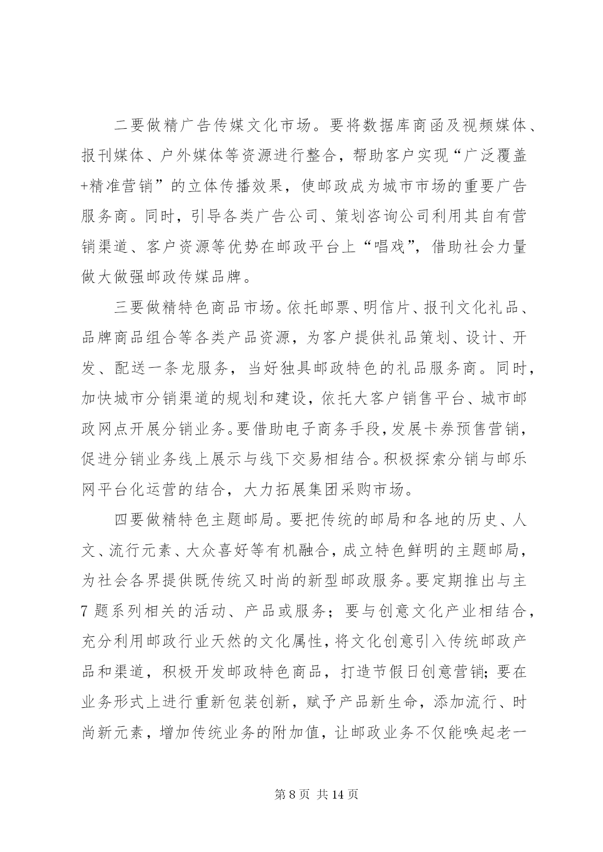 第PAGE\*Arabic\*MERGEFORMAT14页共NUMPAGES\*MERGEFORMAT14页乡村邮政物流发展意见城市邮政发展指导意见(讨论稿)为贯彻全国邮政工作会议精神,加快城市邮政业务(特指地级以上城市市区的邮政业务)发展,提高城市邮政对全网的贡献度,现提出以下指导意见。一、充分认清城市邮政业务发展的重要性城市市场集中了大量的非农业人口和第二、第三产业,具有高端客户集中、消费能力强、公共服务要求高、市场潜力大等特点。随着我国城镇化进程的加快,城市地区的范围将进一步扩大,上述特点将更加明显,市场竞争也将更为激烈。加快城市邮政业务发展,提高在城市地区的市场占有率的重要战略意义日益突出。而从近年来邮政业务发展情况看,部分城市、特别是一些省会城市发展速度持续落后于全国整体水平,主要表现在:核心业务增长乏力、成本压力持续加大、盈利水平不断下降等方面。除了邮银、邮速分业经营对城市邮政业务发展产生一定影响外,城市邮政的体制机制、营销水平、服务能力与城市地区较高的生产力发展水平还不适应,产品和服务不能很好地适XX县区市场需求,制约了业务发展。如果这种情况不能够得到改观,将对中国邮政的可持续发展造成极为不利的影响。各级邮政企业要切实将城市地区作为邮政1业务发展的主战场,千方百计加快发展。二、工作思路和目标(一)主要思路城市邮政发展的基本思路是。坚持以客户为中心,以市场为导向,依托金融业务转型发展带动,依靠两包业务规模发展推动,坚持传统业务精耕细作联动,推进增值业务快速增长拉动,试水电子邮政创新发展驱动,强化持续发展能力提升促动,夯实管理基础,提高队伍素质,优化窗口服务,促进城市邮政可持续发展。(二)工作目标通过2-3年的努力,推动城市邮政业务收入在全国总收入中的占比逐年提升,业务结构不断优化。三、工作措施措施之一:依托转型发展,做好金融业务代理金融业务要确立“以客户为中心”的发展理念,和“旺季拓规模,淡季调结构”的发展思路,以规模效益为目标,以合规经营为己任,构建“商业化+亲情化”的服务模式,拓展“专业化+信息化”的发展渠道,打造“职业化+高效化”的员工队伍,实施“流程化+制度化”的管控方式,实现代理金融业务规模效益化的发展。一要加快网点转型,推进“商业化+亲情化”的服务模式,提高金融网点核心竞争力。要结合现有网点资源状况,加快网点硬件环境改善升级,优化网点功能布局,完善网点服务流程,形成有效的整体联动销售机制,并同步实现网点物理条件和服务流程的商业化。2要推进亲情化服务,对标先进商业银行的客户服务手段,发挥邮政特有的亲情化服务理念,对客户实行分层分级维护管理,使不同层级的有效客户在网点获得相应层级标准的优质服务,不断拓展客户规模、提升客户质量,提高代理金融网点效益。二要加速渠道建设,拓展“专业化+信息化”的业务发展渠道,提高金融客户开发成功率。要加快自助渠道建设。结合市场环境及客户需求,扩大网点自助服务区域,增加atm、crs、补登折机等自助设备,有效分流客户,减轻窗口压力。在与同级邮储银行协商的基础上,科学选址,合理布放离行式atm和crs,加大布放商易通机具,延伸服务范围,与物理网点形成合理互补。要搭建电子化渠道。加快电话银行、网上银行、手机银行、电视银行的推广应用;对新建及网点面积较大的代理网点要设置网上银行、手机银行、电视银行等新业务体验区,引导客户体验。搭建起全方位、多层次的支付结算平台,提高业务的电子替代率。要开展数据库营销。树立以数据信息为基础、以专业分析为支撑的数据库营销理念,利用信息化技术,推行“网点金融数据库建设”,有针对性地开展数据库精准营销。同时,不断进行技术创新,提高数据收集、分析的及时性和准确性。三要加强人才引进和培养,打造“职业化+高效化”的金融从业人员队伍,夯实代理金融业务可持续发展的基础。通过多种方式实现人力资源优化配置,提高专业营销队伍素质。面向高等院校招募金融背景的大学生;面向社会引进具备银行、保险从业经验的人员;加快组建代理金融专兼职综合客户经3理队伍;建立银企内部优秀人才交流、挂职机制;通过开展金融管理人员转型发展培训、专职营销员金融营销技能培训、网点负责人经营管理知识培训、柜员业务操作技能培训,打造一支专业化、职业化的金融人才队伍。四要加大管控力度,实施“流程化+制度化”的风险管理,提高金融风险防范能力。要严格落实集团公司和邮储银行的有关文件要求,优化内部控制环节,完善风险管控运行机制,培育内部控制环境,全面提高员工风险意识和风险控制能力,提高风险管理效果。要强化监督指导,净化经营环境;要强化合规经营,杜绝误导销售。对于风险管理不力、发现问题整改不到位的,要严格依法依规问责。措施之二:推进规模拓展,做强两包业务在发展国际小包业务方面,要围绕“以客户为中心、