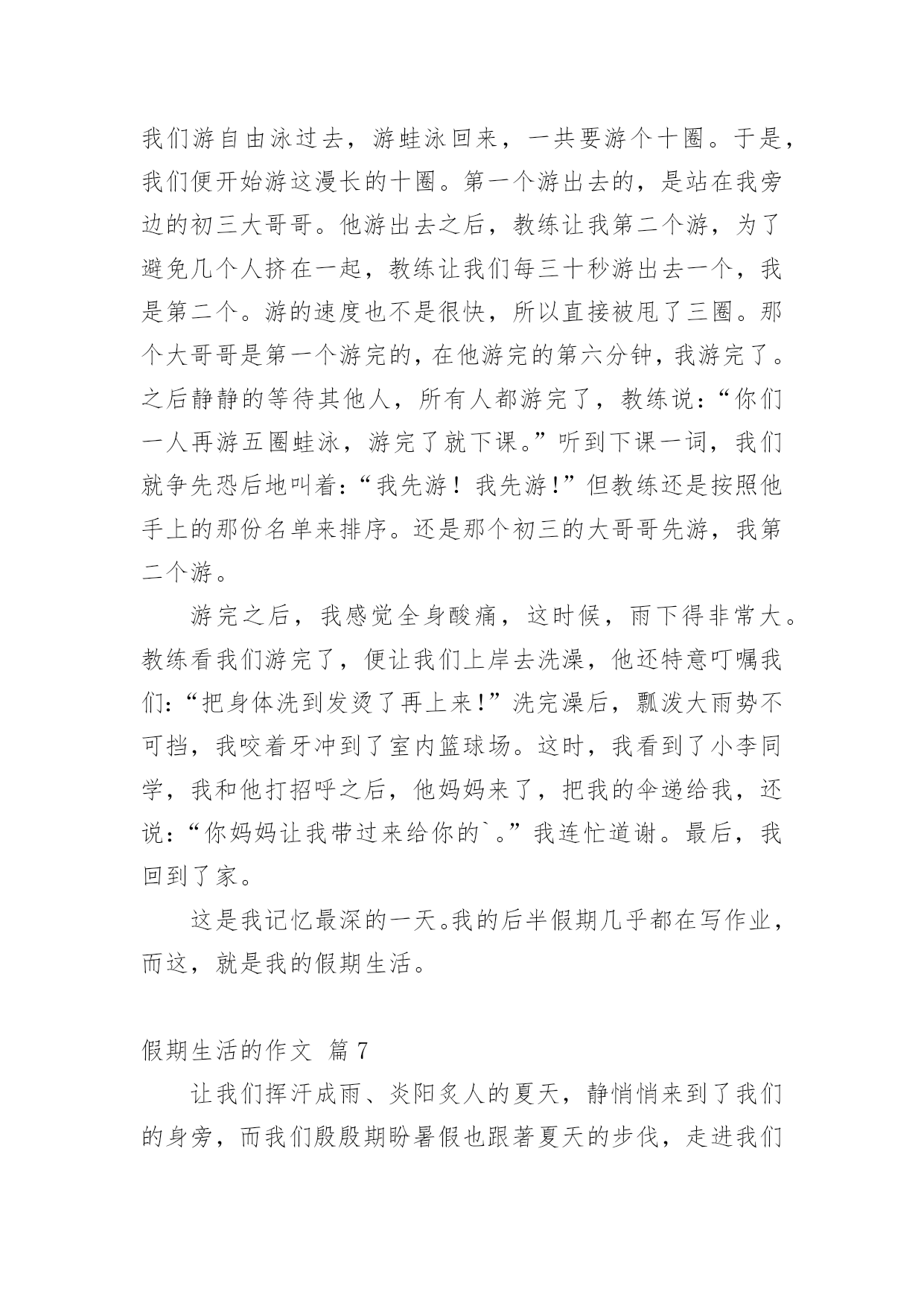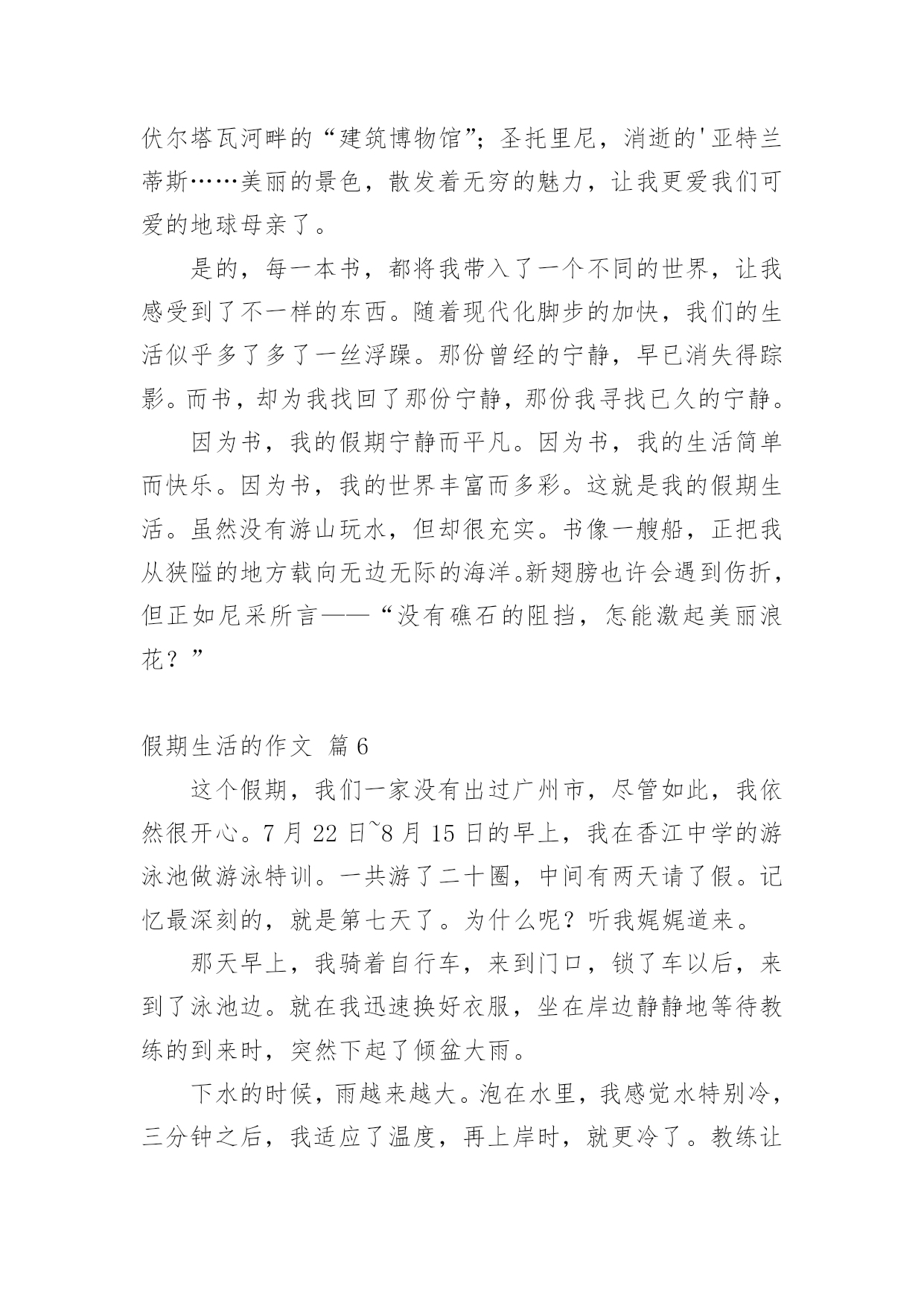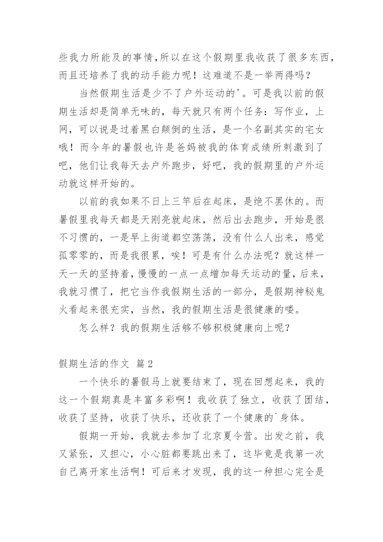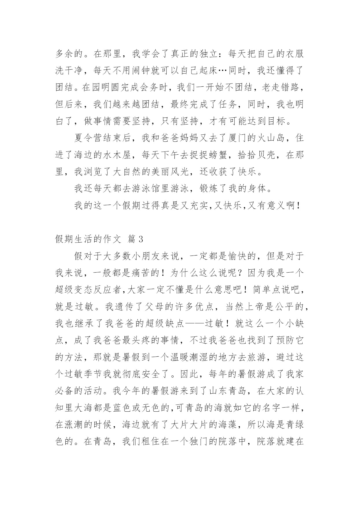 假期生活的作文[精]实用的假期生活的作文8篇在现实生活或工作学习中,大家都写过作文,肯定对各类作文都很熟悉吧,根据写作命题的特点,作文可以分为命题作文和非命题作文。相信很多朋友都对写作文感到非常苦恼吧,以下是小编为大家收集的假期生活的作文9篇,欢迎阅读与收藏。假期生活的作文篇1我的家是生活是健康向上的,和以往大不相同的。我的生活先是从书中开始的。利用假期这段时间去尽可能的阅读一些好书是必不可少的,而我以前是比较喜欢看一些杂志,一些小故事之类的,因为这些小故事简单,易懂,内容丰富,易懂,而且还分厂的有趣,而暑假里妈妈却要求我看一些中外的名著,我拗不过他,便答应她了,从开始的略懂到后来的了解本书的内涵,这真是一次不小的收获啊!所以我的假期生活是积极向上的。除此以外,我在假期里不只是只在电脑上玩游戏和看新闻,或者是看八卦了,而自己动起手来,帮助妈妈干家务,主动做一些我力所能及的事,这些也都是因为我在假期里看到的一遍文章所导致的,那个故事里的主人公比我还少,却早已担当起了生活的重任,当然,我知道他只众多和他一样有生活经历其中的一个人。所以我没有理由不帮家里不做一些我力所能及的事情,所以在这个假期里我收获了很多东西,而且还培养了我的动手能力呢!这难道不是一举两得吗?当然假期生活是少不了户外运动的'。可是我以前的假期生活却是简单无味的,每天就只有两个任务:写作业,上网,可以说是过着黑白颠倒的生活,是一个名副其实的宅女哦!而今年的暑假也许是爸妈被我的体育成绩所刺激到了吧,他们让我每天去户外跑步,好吧,我的假期里的户外运动就这样开始的。以前的我如果不日上三竿后在起床,是绝不罢休的。而暑假里我每天都是天刚亮就起床,然后出去跑步,开始是很不习惯的,一是早上街道都空荡荡,没有什么人出来,感觉孤零零的,而是我很累,唉!可是有什么办法呢?就这样一天一天的坚持着,慢慢的一点一点增加每天运动的量,后来,我就习惯了,把它当作我假期生活的一部分,是假期神秘鬼火看起来很充实,当然,我的假期生活是很健康的喽。怎么样?我的假期生活够不够积极健康向上呢?假期生活的作文篇2一个快乐的暑假马上就要结束了,现在回想起来,我的这一个假期真是丰富多彩啊!我收获了独立,收获了团结,收获了坚持,收获了快乐,还收获了一个健康的`身体。假期一开始,我就去参加了北京夏令营。出发之前,我又紧张,又担心,小心脏都要跳出来了,这毕竟是我第一次自己离开家生活啊!可后来才发现,我的这一种担心完全是多余的。在那里,我学会了真正的独立:每天把自己的衣服洗干净,每天不用闹钟就可以自己起床…同时,我还懂得了团结。在园明圆完成会务时,我们一开始不团结,老走错路,但后来,我们越来越团结,最终完成了任务,同时,我也明白了,做事情需要坚持,只有坚持,才有可能达到目标。夏令营结束后,我和爸爸妈妈又去了厦门的火山岛,住进了海边的水木屋,每天下午去捉捉螃蟹,拾拾贝壳,在那里,我浏览了大自然的美丽风光,还收获了快乐。我还每天都去游泳馆里游泳,锻炼了我的身体。我的这一个假期过得真是又充实,又快乐,又有意义啊!假期生活的作文篇3假对于大多数小朋友来说,一定都是愉快的,但是对于我来说,一般都是痛苦的!为什么这么说呢?因为我是一个超级变态反应者,大家一定不懂是什么意思吧!简单点说吧,就是过敏。我遗传了父母的许多优点,当然上帝是公平的,我也继承了我爸爸的超级缺点——过敏!就这么一个小缺点,成了我爸爸最头疼的事情,不过我爸爸也找到了预防它的方法,那就是暑假到一个温暖潮湿的地方去旅游,避过这个过敏季节我就彻底安全了。因此,每年的暑假游成了我家必备的活动。我今年的暑假游来到了山东青岛,在大家的认知里大海都是蓝色或无色的,可青岛的海就如它的名字一样,在涨潮的时候,海边就有了大片大片的海藻,所以海是青绿色的。在青岛,我们租住在一个独门的院落中,院落就建在著名的崂山脚下,抬眼就可以看到美丽的崂山。院子周围的山坡上种着许多茶树,院子里养着鸡鹅,种着无花果树、梨树、李子树、栗子树,是一个名副其实的农家院。房东阿姨每天给我们做好多种当地的特色海鲜,主食一直是当地的'特色——人脸一样大的馒头,每一顿都吃的流连忘返。房东阿姨家有一个好客的山东小弟弟,每次帮我们做饭、收拾碗筷,让我觉得做饭是一件快乐的事情。回到家中,我缠着爸爸教我做饭。在爸爸的指导下,我顺利的完成了我人生的第一道菜,色、香、味俱全,绝对有大厨风范。有一个上午,我一个人独自在家完成了作业,我觉得应该为爸爸、妈妈做一顿午餐了。我挥舞着硕大的菜刀,把菜变成了我想要的形状,倒油下锅、下菜翻炒,一开始都很顺利,可不久致命的问题出现了,妈妈把醋和酱油放在同样的两个小瓶中,我找不到想要的酱油,菜马上要糊了,我就猜了一个红色的小瓶点了几滴黑乎乎的液体,菜当然顺利的出锅了。妈妈回家后看到香喷喷的饭,激