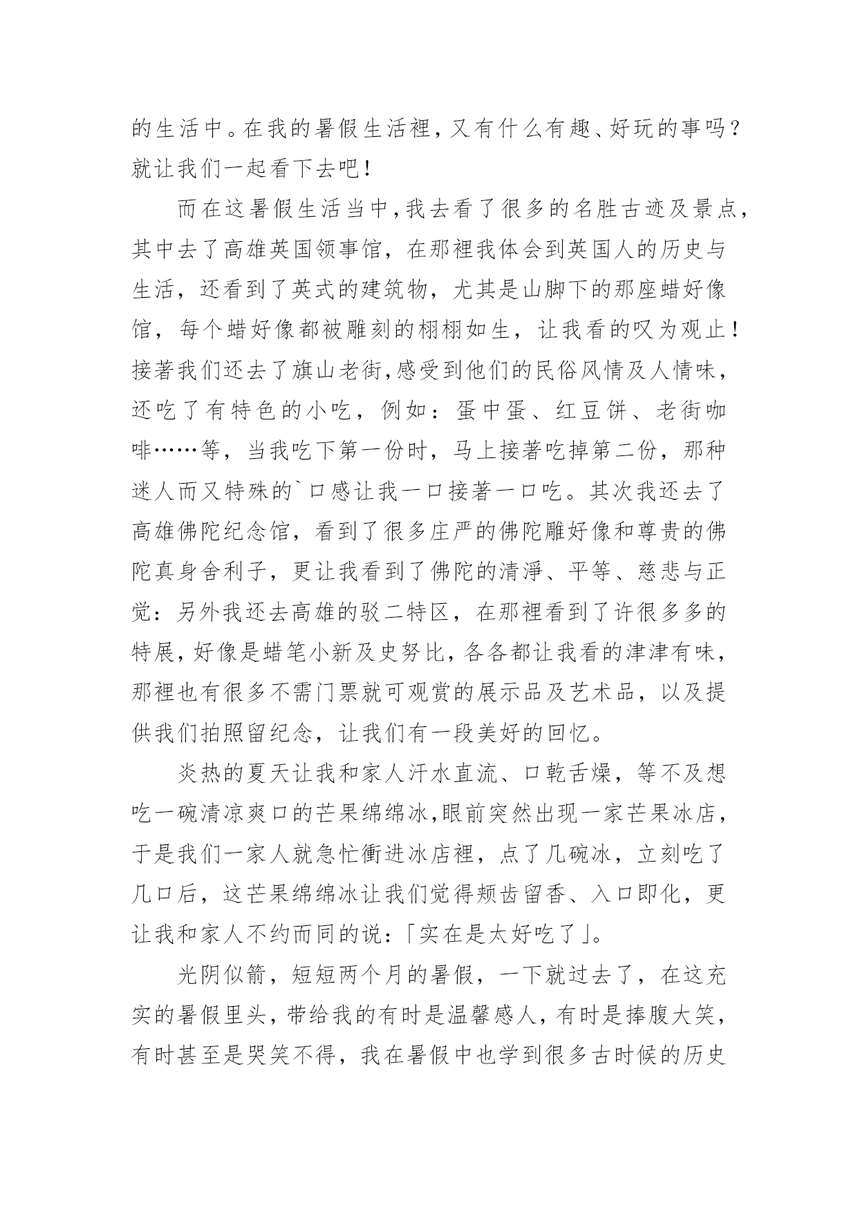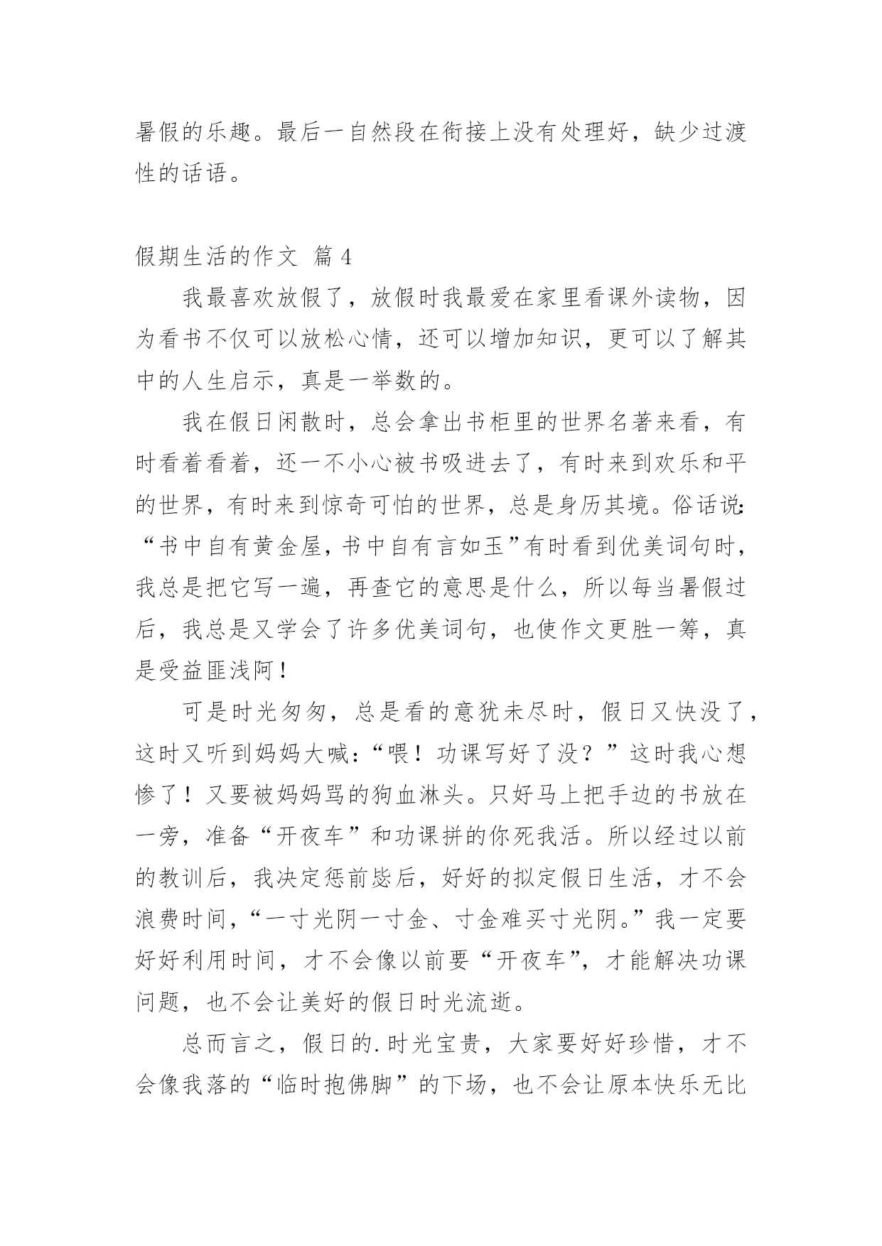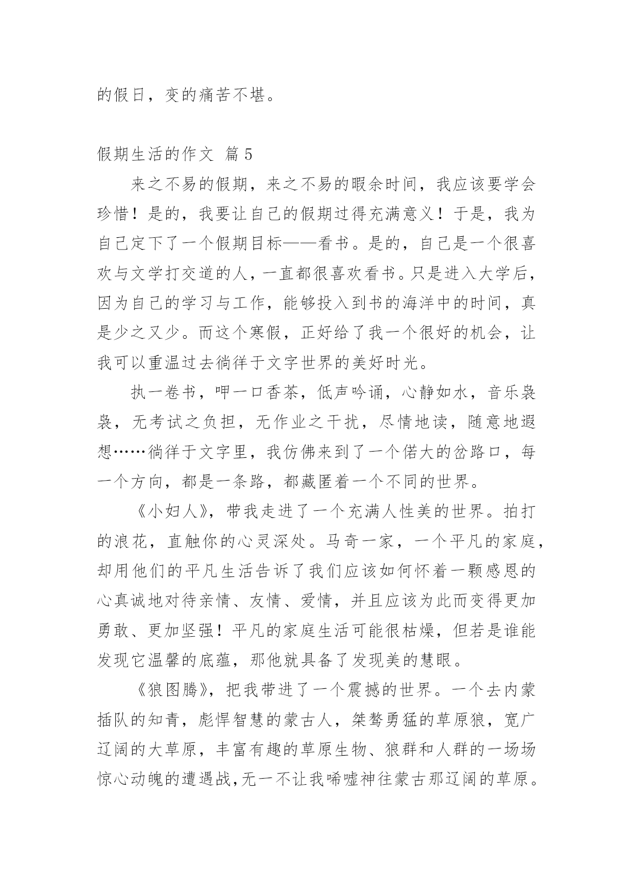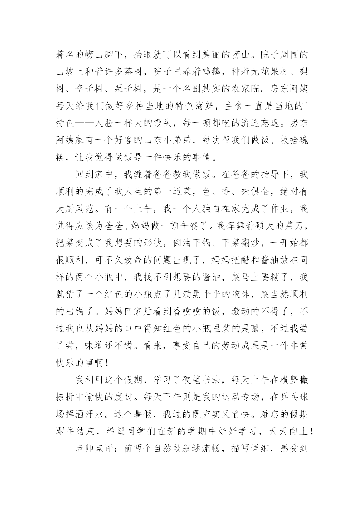 假期生活的作文[精]实用的假期生活的作文8篇在现实生活或工作学习中,大家都写过作文,肯定对各类作文都很熟悉吧,根据写作命题的特点,作文可以分为命题作文和非命题作文。相信很多朋友都对写作文感到非常苦恼吧,以下是小编为大家收集的假期生活的作文9篇,欢迎阅读与收藏。假期生活的作文篇1我的家是生活是健康向上的,和以往大不相同的。我的生活先是从书中开始的。利用假期这段时间去尽可能的阅读一些好书是必不可少的,而我以前是比较喜欢看一些杂志,一些小故事之类的,因为这些小故事简单,易懂,内容丰富,易懂,而且还分厂的有趣,而暑假里妈妈却要求我看一些中外的名著,我拗不过他,便答应她了,从开始的略懂到后来的了解本书的内涵,这真是一次不小的收获啊!所以我的假期生活是积极向上的。除此以外,我在假期里不只是只在电脑上玩游戏和看新闻,或者是看八卦了,而自己动起手来,帮助妈妈干家务,主动做一些我力所能及的事,这些也都是因为我在假期里看到的一遍文章所导致的,那个故事里的主人公比我还少,却早已担当起了生活的重任,当然,我知道他只众多和他一样有生活经历其中的一个人。所以我没有理由不帮家里不做一些我力所能及的事情,所以在这个假期里我收获了很多东西,而且还培养了我的动手能力呢!这难道不是一举两得吗?当然假期生活是少不了户外运动的'。可是我以前的假期生活却是简单无味的,每天就只有两个任务:写作业,上网,可以说是过着黑白颠倒的生活,是一个名副其实的宅女哦!而今年的暑假也许是爸妈被我的体育成绩所刺激到了吧,他们让我每天去户外跑步,好吧,我的假期里的户外运动就这样开始的。以前的我如果不日上三竿后在起床,是绝不罢休的。而暑假里我每天都是天刚亮就起床,然后出去跑步,开始是很不习惯的,一是早上街道都空荡荡,没有什么人出来,感觉孤零零的,而是我很累,唉!可是有什么办法呢?就这样一天一天的坚持着,慢慢的一点一点增加每天运动的量,后来,我就习惯了,把它当作我假期生活的一部分,是假期神秘鬼火看起来很充实,当然,我的假期生活是很健康的喽。怎么样?我的假期生活够不够积极健康向上呢?假期生活的作文篇2一个快乐的暑假马上就要结束了,现在回想起来,我的这一个假期真是丰富多彩啊!我收获了独立,收获了团结,收获了坚持,收获了快乐,还收获了一个健康的`身体。假期一开始,我就去参加了北京夏令营。出发之前,我又紧张,又担心,小心脏都要跳出来了,这毕竟是我第一次自己离开家生活啊!可后来才发现,我的这一种担心完全是多余的。在那里,我学会了真正的独立:每天把自己的衣服洗干净,每天不用闹钟就可以自己起床…同时,我还懂得了团结。在园明圆完成会务时,我们一开始不团结,老走错路,但后来,我们越来越团结,最终完成了任务,同时,我也明白了,做事情需要坚持,只有坚持,才有可能达到目标。夏令营结束后,我和爸爸妈妈又去了厦门的火山岛,住进了海边的水木屋,每天下午去捉捉螃蟹,拾拾贝壳,在那里,我浏览了大自然的美丽风光,还收获了快乐。我还每天都去游泳馆里游泳,锻炼了我的身体。我的这一个假期过得真是又充实,又快乐,又有意义啊!假期生活的作文篇3假对于大多数小朋友来说,一定都是愉快的,但是对于我来说,一般都是痛苦的!为什么这么说呢?因为我是一个超级变态反应者,大家一定不懂是什么意思吧!简单点说吧,就是过敏。我遗传了父母的许多优点,当然上帝是公平的,我也继承了我爸爸的超级缺点——过敏!就这么一个小缺点,成了我爸爸最头疼的事情,不过我爸爸也找到了预防它的方法,那就是暑假到一个温暖潮湿的地方去旅游,避过这个过敏季节我就彻底安全了。因此,每年的暑假游成了我家必备的活动。我今年的暑假游来到了山东青岛,在大家的认知里大海都是蓝色或无色的,可青岛的海就如它的名字一样,在涨潮的时候,海边就有了大片大片的海藻,所以海是青绿色的。在青岛,我们租住在一个独门的院落中,院落就建在著名的崂山脚下,抬眼就可以看到美丽的崂山。院子周围的山坡上种着许多茶树,院子里养着鸡鹅,种着无花果树、梨树、李子树、栗子树,是一个名副其实的农家院。房东阿姨每天给我们做好多种当地的特色海鲜,主食一直是当地的'特色——人脸一样大的馒头,每一顿都吃的流连忘返。房东阿姨家有一个好客的山东小弟弟,每次帮我们做饭、收拾碗筷,让我觉得做饭是一件快乐的事情。回到家中,我缠着爸爸教我做饭。在爸爸的指导下,我顺利的完成了我人生的第一道菜,色、香、味俱全,绝对有大厨风范。有一个上午,我一个人独自在家完成了作业,我觉得应该为爸爸、妈妈做一顿午餐了。我挥舞着硕大的菜刀,把菜变成了我想要的形状,倒油下锅、下菜翻炒,一开始都很顺利,可不久致命的问题出现了,妈妈把醋和酱油放在同样的两个小瓶中,我找不到想要的酱油,菜马上要糊了,我就猜了一个红色的小瓶点了几滴黑乎乎的液体,菜当然顺利的出锅了。妈妈回家后看到香喷喷的饭,激