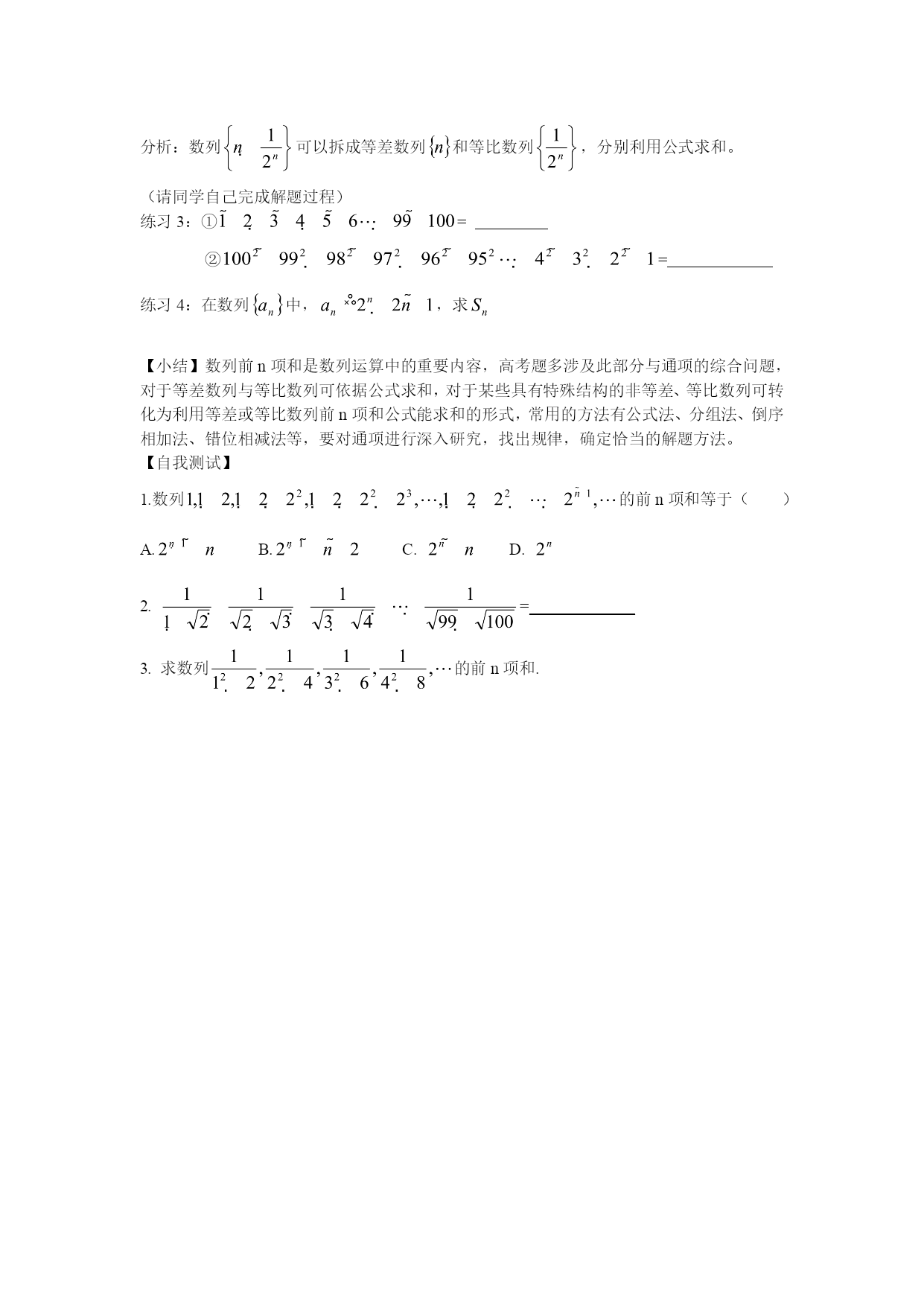 《数列的求和》学案数列的求和是数列的一个重要内容,它往往是数列知识的综合体现,求和题在试题中非常常见,它常常考查我们的基础知识,分析问题和解决问题的能力。本节课中将介绍几种求和方法,并采用讲练结合的形式达到熟练应用。【知识准备】(1)等差数列的前n项和公式:___________________;(2)等比数列的前n项和公式:=1\*GB3①___________________;=2\*GB3②___________________(3)___________________;(4)______________;____________;1.裂项相消法:将数列的每一项拆(裂开)成两项之差,除首尾两项(有时也可能是首尾若干项)外,其余各项均前后因正负项能互相抵消,剩下首尾若干项.适用于形如数列,其中的数列是一个等差数列.使用时先裂项后相消,并注意正负项相消时消去了哪些项,保留了哪些项,未被消去的项有前后对称的特点.例2:求数列前n项的和.分析:通项公式可以转化为()—()。(请同学自己完成解题过程)评析:这种方法在解决通项是分式形式的数列求和问题时经常用到,但裂项的方法有很多,解题时必须根据具体问题具体分析。常用裂项的技巧如:(1).(2)若数列是等差数列,公差是d,则练习1:求.练习2:求2.分组求和法:(拆项和并项)分组求和法是将一个数列拆成若干个简单数列(如等差数列、等比数列、常数数列等等),然后分别求和的方法.适用于形如的数列,其中数列和的前n项和均可求得。此外还可以根据数列的特点,将数列的相邻的两项(或若干项)并成一项(或一组)得到一个新的且更容易求和的数列.例3:求数列的前n项和分析:数列可以拆成等差数列和等比数列,分别利用公式求和。(请同学自己完成解题过程)练习3:=1\*GB3①==2\*GB3②=练习4:在数列中,,求【小结】数列前n项和是数列运算中的重要内容,高考题多涉及此部分与通项的综合问题,对于等差数列与等比数列可依据公式求和,对于某些具有特殊结构的非等差、等比数列可转化为利用等差或等比数列前n项和公式能求和的形式,常用的方法有公式法、分组法、倒序相加法、错位相减法等,要对通项进行深入研究,找出规律,确定恰当的解题方法。【自我测试】1.数列的前n项和等于()A.B.C.D.2.=_____________3.求数列的前n项和.