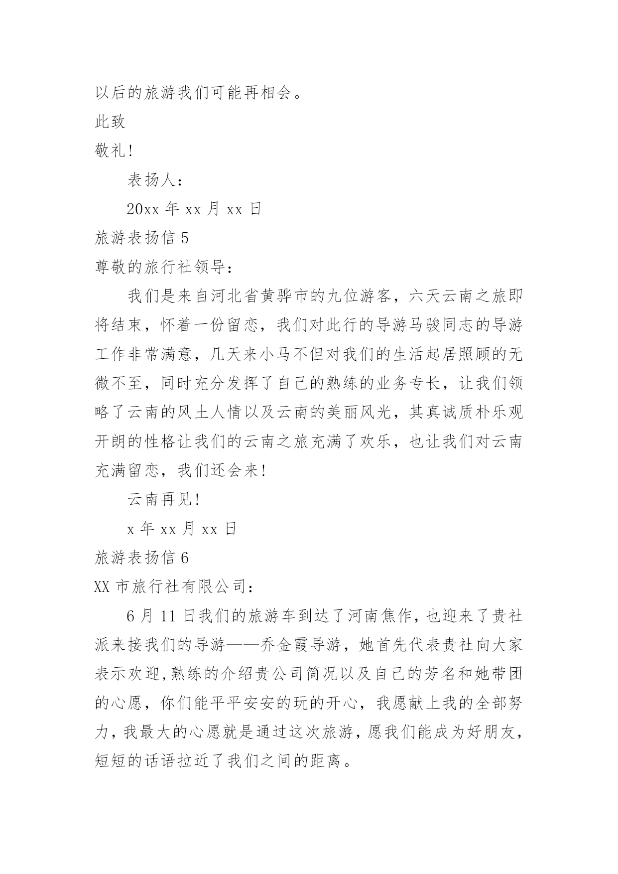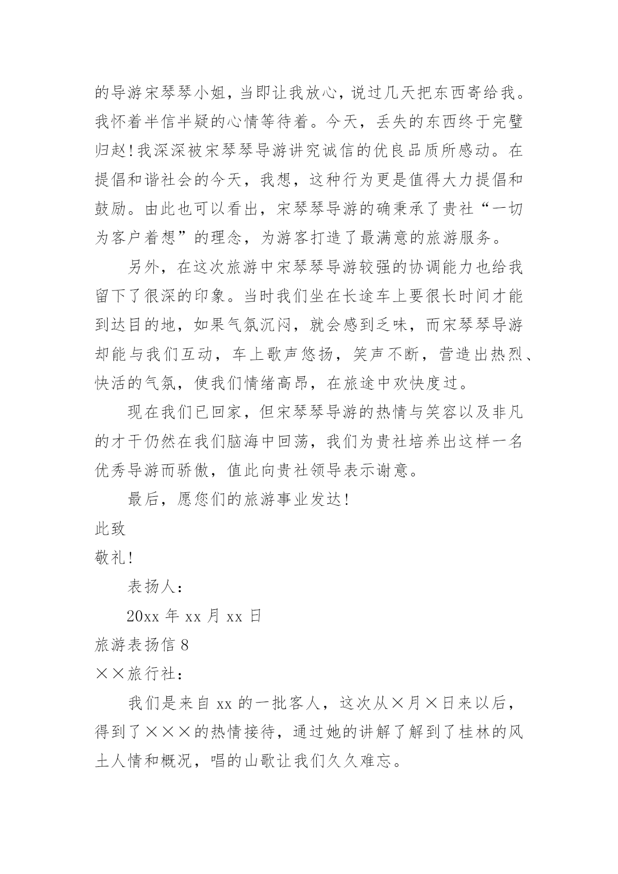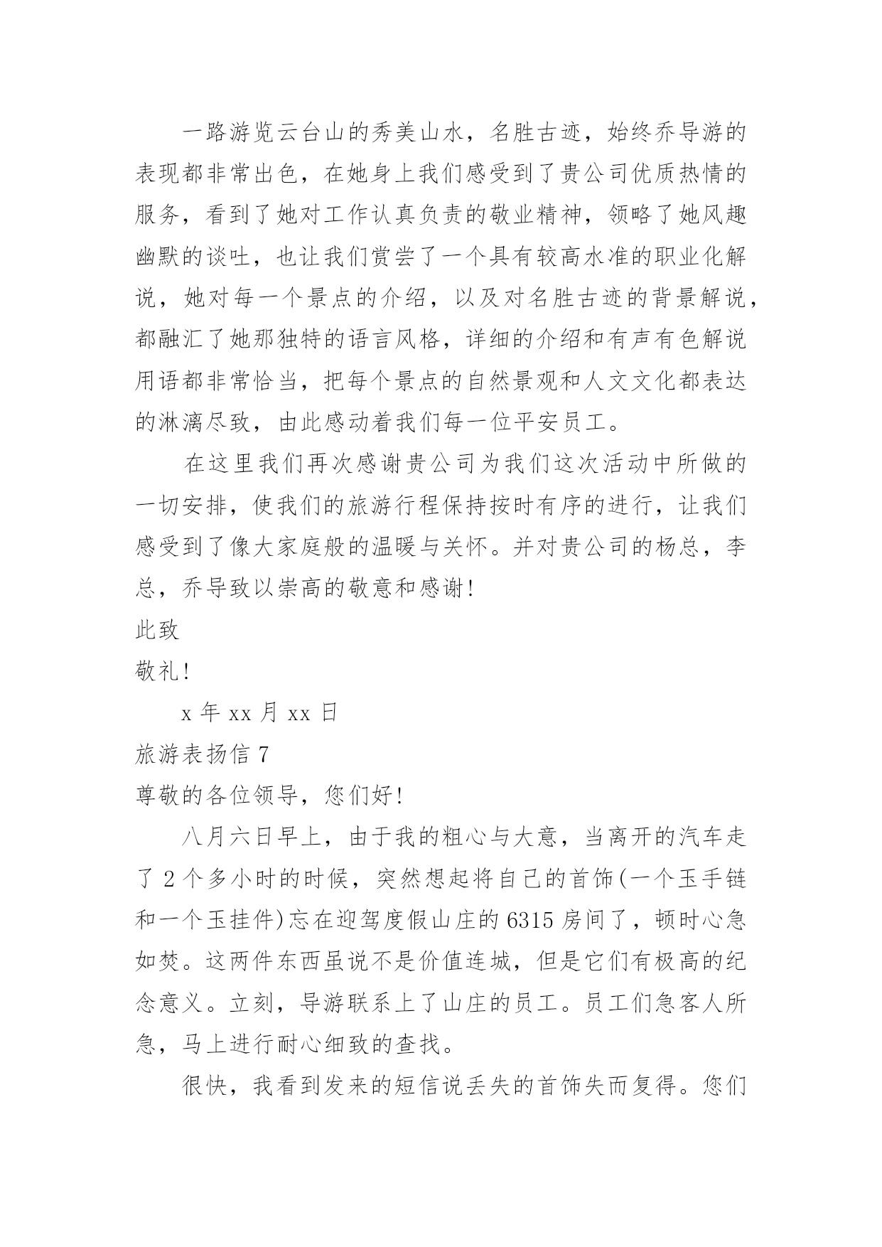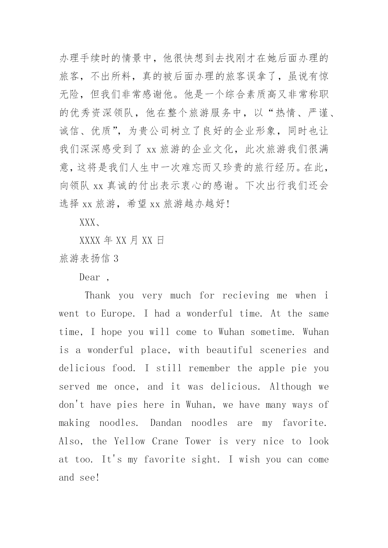 旅游表扬信旅游表扬信15篇我们眼下的社会,接触并使用表扬信的人越来越多,通过表扬信可以对他人的行为表示赞扬。你所见过的表扬信是什么样的呢?下面是小编为大家收集的旅游表扬信,希望能够帮助到大家。旅游表扬信1ThanksforLiu'sHospitalityAug.18,19xxDearBrown,I'mbackathomenow.IwishtoexpressmythankstoyouforthewonderfulvacationIspentwithyouandyourfamily.Duringthevacationyoutaughtmehowtoswim,boatandfish.Ireallyappreciateyourtakingtimeoffworktotakemeroundandshowmesomanyplaces.Yourwifeissuchaterrificcook!IthinkImusthavegained10poundsjustintheweekIspentwithyou.SurelyI'vespentahappyvacation,whichwillberememberedforlong.Ihopeyouwillbeabletovisitourschoolsometime.Thankyouagain.Let'skeepintouch.Love,旅游表扬信2尊敬的xx旅行社领导:您好!4月11日我们一行12人参加xx旅游的德法意瑞+新天鹅堡11日之旅,虽然已经结束,但在我们每个旅客心里都留下了许多美好的回忆。这次愉快的境外旅游,我们要特别感谢欧洲之旅的领队——xx,在整个旅游过程中,他以“真诚、热情、周到、细致”的优质服务给旅客留下深刻而美好的印象。他思路清晰,业务娴熟,操作规范,工作责任性强,在整个快乐的旅游过程中,他没有忘记时刻提醒旅客的注意安全,不厌其烦地强调在异国游玩时的防盗意识,在他的友情提示下,我们团队在整个行程中二次贴身碰到小偷,由于大家都有防范意识,互相照看,互相提醒,我们的游客很幸运二次躲过此劫,有惊无险,整个旅途由于他的努力负责,在这方面没有留下任何遗憾。在旅途中他全程陪同旅客,以“急客户所急,想客户所想”的高度的责任感和敬业精神,积极为旅客提供方便,当旅客语言沟通上碰到困难时,他会在第一时间在你身边当翻译,特别对晕车身体不舒服的旅客给予更多的关爱和帮助,他把自己的颈垫全程给了晕车的旅客使用而累着自己,让旅客倍感温暖,心存感恩。他把“真诚和热情”溶于服务的质和量中,把“敬爱、爱岗、敬业”化为一种服务精神,渗透到旅游过程的每一个方面。他工作主动,态度热情,服务周到,注重细节,与旅客的亲和力也很强,整个行程安排合理,体现较高的专业水准和综合业务能力,深受大家的信任和赞扬。我们至今忘记不了领队在大巴上对欧洲历史、人文、风俗滔滔不绝的讲述,从而让我们更多了解欧洲的历史;忘不了每到一个旅游景点他仔细讲述的注意事项和旅游攻略;由于春季欧洲早晚温差很大,每当当天行程结束后,他会预告第二天当地的天气和气温情况,建议旅客该穿什么样的衣服比较适合,由于他服务到位,让我们很享受这次旅行。特别对行程中碰到的二个意外小插曲,他都处理的非常让旅客满意,例1)我们在观看新天鹅堡外景时,有5个人因太投入拍照而忘了看表,当我们感到已超过了参观预约时间几分钟,那时我们很沮丧,难得来一次欧洲旅游,我们多么想参观一下新天鹅堡啊,当我们打电话给他时,我们也很清楚是在给领队xx出难题,虽不抱什么希望,但还是想争取机会试一试,照理他完全有理由拒绝旅客要求,但他没有责怪我们,而是用积极的态度跑上跑下与博物馆工作人员联系,取得他们的谅解,来满足旅客的参观要求,这让我们非常感动,因为他对旅客没有任何的抱怨,这让我们更感到非常内疚和自责。2)在意大利行程结束最后要出关时,我的同事在办理退税时护照和机票一块儿不见了,我同事急得快要“疯”了,领队是一个非常细心的人,每到行程的关键节点上,他总是很用心地关注着每个游客,当他知道我同事护照和机票遗失后,他非常冷静,不是责怪而是安慰,让她冷静回想刚才在办理手续时的情景中,他很快想到去找刚才在她后面办理的旅客,不出所料,真的被后面办理的旅客误拿了,虽说有惊无险,但我们非常感谢他。他是一个综合素质高又非常称职的优秀资深领队,他在整个旅游服务中,以“热情、严谨、诚信、优质”,为贵公司树立了良好的企业形象,同时也让我们深深感受到了xx旅游的企业文化,此次旅游我们很满意,这将是我们人生中一次难忘而又珍贵的旅行经历。在此,向领队xx真诚的付出表示衷心的感谢。下次出行我们还会选择xx旅游,希望xx旅游越办越好!XXX、XXXX年XX月XX日旅游表扬信3Dear,Thankyouverymuchforrecievingme
