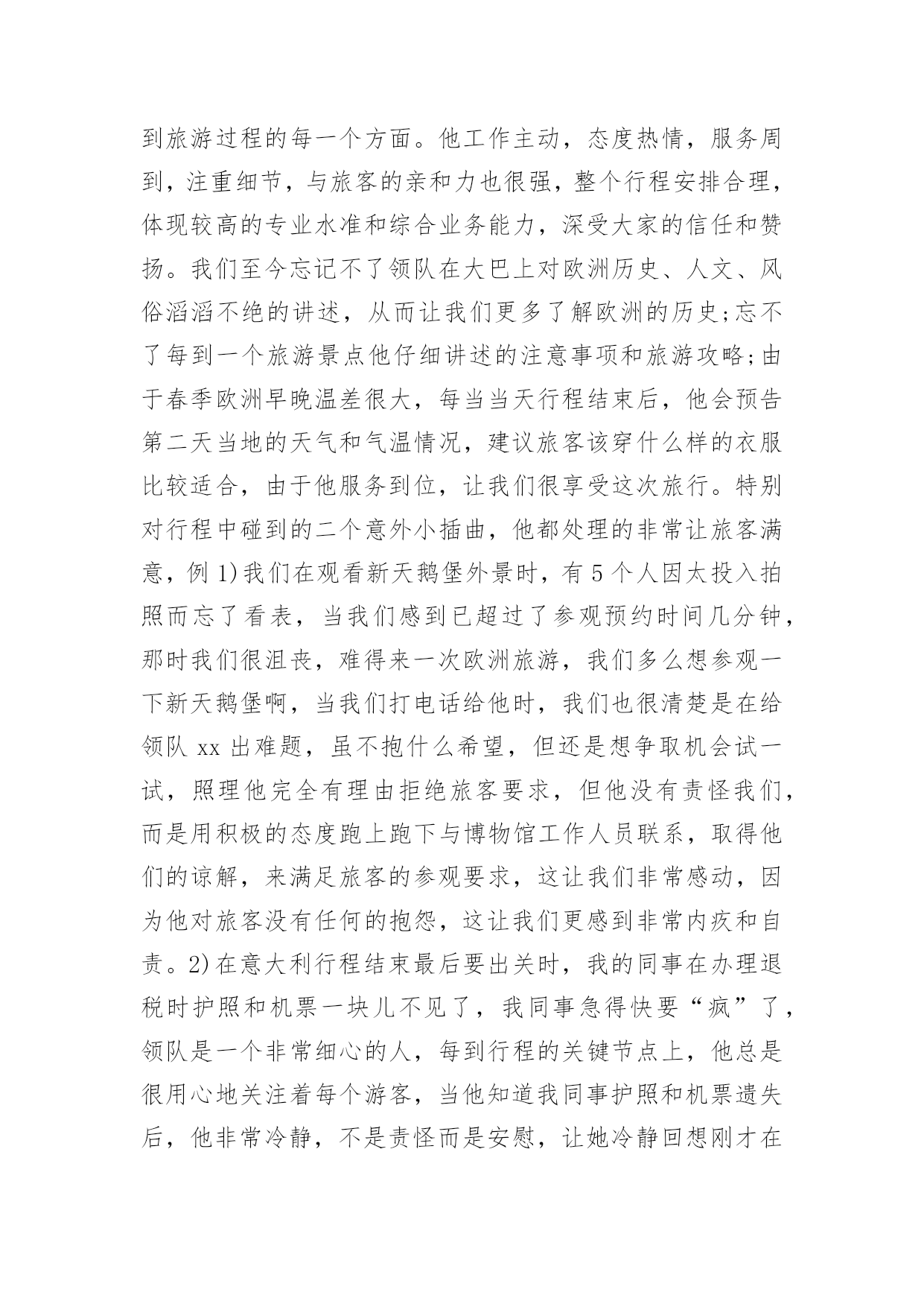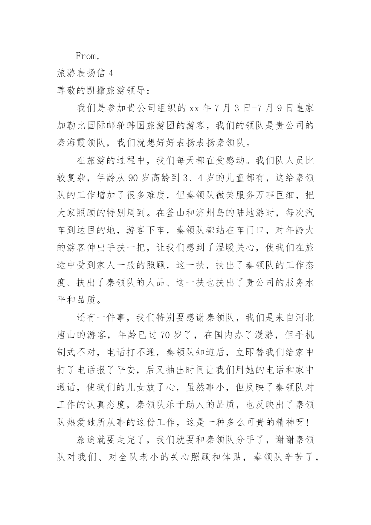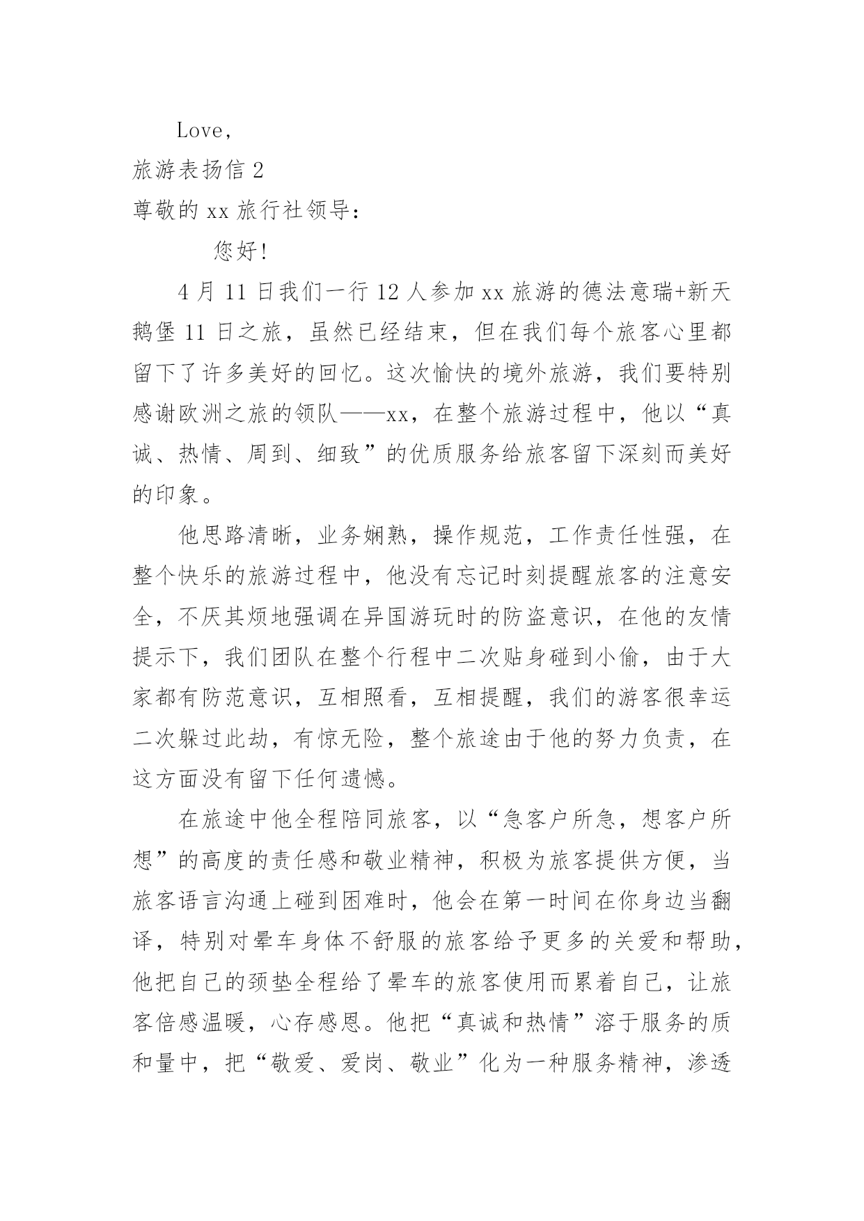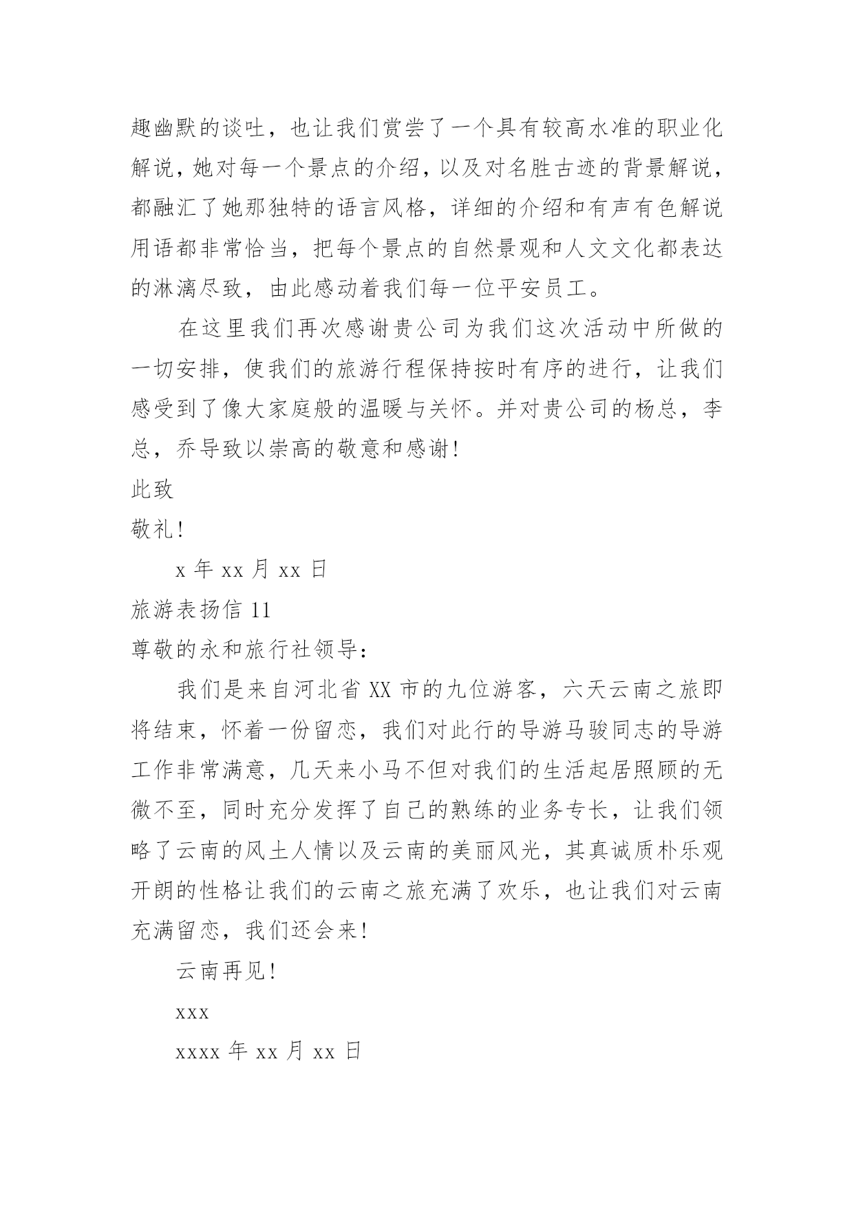 旅游表扬信旅游表扬信15篇我们眼下的社会,接触并使用表扬信的人越来越多,通过表扬信可以对他人的行为表示赞扬。你所见过的表扬信是什么样的呢?下面是小编为大家收集的旅游表扬信,希望能够帮助到大家。旅游表扬信1ThanksforLiu'sHospitalityAug.18,19xxDearBrown,I'mbackathomenow.IwishtoexpressmythankstoyouforthewonderfulvacationIspentwithyouandyourfamily.Duringthevacationyoutaughtmehowtoswim,boatandfish.Ireallyappreciateyourtakingtimeoffworktotakemeroundandshowmesomanyplaces.Yourwifeissuchaterrificcook!IthinkImusthavegained10poundsjustintheweekIspentwithyou.SurelyI'vespentahappyvacation,whichwillberememberedforlong.Ihopeyouwillbeabletovisitourschoolsometime.Thankyouagain.Let'skeepintouch.Love,旅游表扬信2尊敬的xx旅行社领导:您好!4月11日我们一行12人参加xx旅游的德法意瑞+新天鹅堡11日之旅,虽然已经结束,但在我们每个旅客心里都留下了许多美好的回忆。这次愉快的境外旅游,我们要特别感谢欧洲之旅的领队——xx,在整个旅游过程中,他以“真诚、热情、周到、细致”的优质服务给旅客留下深刻而美好的印象。他思路清晰,业务娴熟,操作规范,工作责任性强,在整个快乐的旅游过程中,他没有忘记时刻提醒旅客的注意安全,不厌其烦地强调在异国游玩时的防盗意识,在他的友情提示下,我们团队在整个行程中二次贴身碰到小偷,由于大家都有防范意识,互相照看,互相提醒,我们的游客很幸运二次躲过此劫,有惊无险,整个旅途由于他的努力负责,在这方面没有留下任何遗憾。在旅途中他全程陪同旅客,以“急客户所急,想客户所想”的高度的责任感和敬业精神,积极为旅客提供方便,当旅客语言沟通上碰到困难时,他会在第一时间在你身边当翻译,特别对晕车身体不舒服的旅客给予更多的关爱和帮助,他把自己的颈垫全程给了晕车的旅客使用而累着自己,让旅客倍感温暖,心存感恩。他把“真诚和热情”溶于服务的质和量中,把“敬爱、爱岗、敬业”化为一种服务精神,渗透到旅游过程的每一个方面。他工作主动,态度热情,服务周到,注重细节,与旅客的亲和力也很强,整个行程安排合理,体现较高的专业水准和综合业务能力,深受大家的信任和赞扬。我们至今忘记不了领队在大巴上对欧洲历史、人文、风俗滔滔不绝的讲述,从而让我们更多了解欧洲的历史;忘不了每到一个旅游景点他仔细讲述的注意事项和旅游攻略;由于春季欧洲早晚温差很大,每当当天行程结束后,他会预告第二天当地的天气和气温情况,建议旅客该穿什么样的衣服比较适合,由于他服务到位,让我们很享受这次旅行。特别对行程中碰到的二个意外小插曲,他都处理的非常让旅客满意,例1)我们在观看新天鹅堡外景时,有5个人因太投入拍照而忘了看表,当我们感到已超过了参观预约时间几分钟,那时我们很沮丧,难得来一次欧洲旅游,我们多么想参观一下新天鹅堡啊,当我们打电话给他时,我们也很清楚是在给领队xx出难题,虽不抱什么希望,但还是想争取机会试一试,照理他完全有理由拒绝旅客要求,但他没有责怪我们,而是用积极的态度跑上跑下与博物馆工作人员联系,取得他们的谅解,来满足旅客的参观要求,这让我们非常感动,因为他对旅客没有任何的抱怨,这让我们更感到非常内疚和自责。2)在意大利行程结束最后要出关时,我的同事在办理退税时护照和机票一块儿不见了,我同事急得快要“疯”了,领队是一个非常细心的人,每到行程的关键节点上,他总是很用心地关注着每个游客,当他知道我同事护照和机票遗失后,他非常冷静,不是责怪而是安慰,让她冷静回想刚才在办理手续时的情景中,他很快想到去找刚才在她后面办理的旅客,不出所料,真的被后面办理的旅客误拿了,虽说有惊无险,但我们非常感谢他。他是一个综合素质高又非常称职的优秀资深领队,他在整个旅游服务中,以“热情、严谨、诚信、优质”,为贵公司树立了良好的企业形象,同时也让我们深深感受到了xx旅游的企业文化,此次旅游我们很满意,这将是我们人生中一次难忘而又珍贵的旅行经历。在此,向领队xx真诚的付出表示衷心的感谢。下次出行我们还会选择xx旅游,希望xx旅游越办越好!XXX、XXXX年XX月XX日旅游表扬信3Dear,Thankyouverymuchforrecievingme