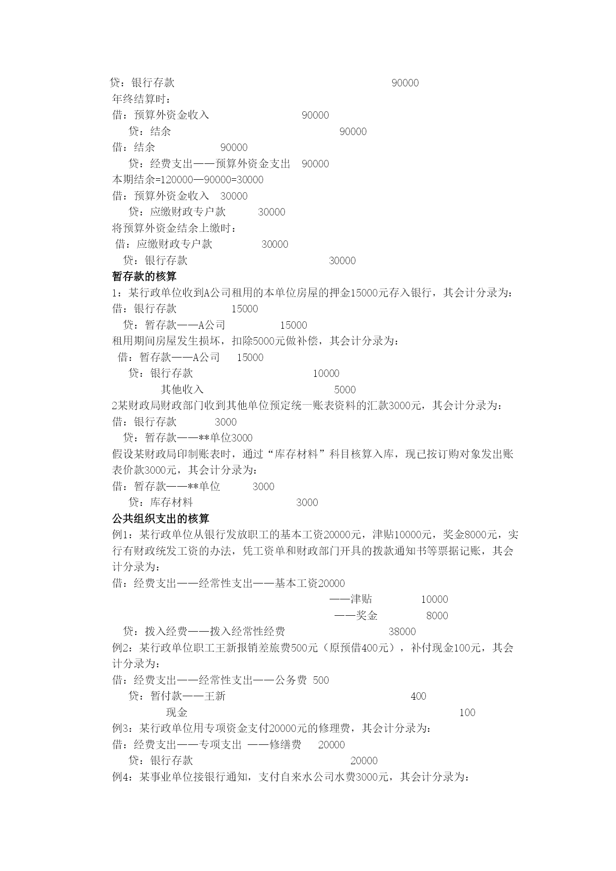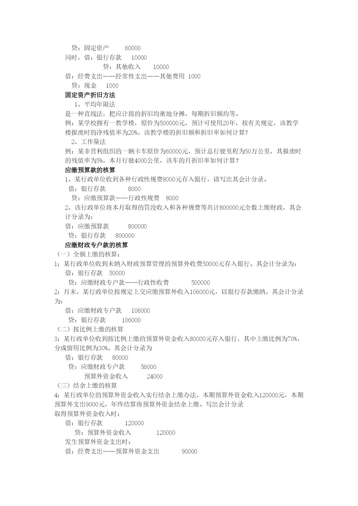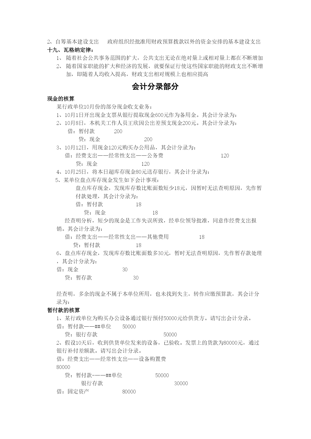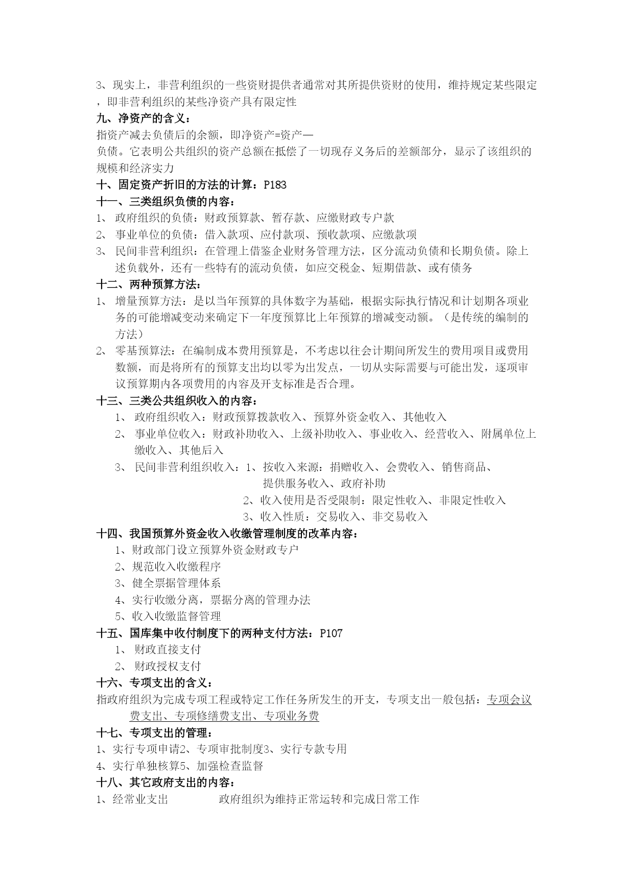 公共组织财务管理公共组织的含义:公共组织就是以管理社会公共事务,提供公共产品和公共服务,维护和实现社会公共利益为目的,拥有法定的活授予的公共权力的所有组织实体二、公共组织的特征:1、公共组织以管理社会公共事务,维护和实现公共利益为基本职责2、不以盈利为目的3、通过行使公共权力来管理公共事务4、公共组织的活动必须依法进行并受到高度监督5、政治性倾向以及行为的强制性和权威性6、公共组织的目标不易计量为责任的多元化公共组织的动机:加强服务、便民利民、以谋求公共利益三、三类公共组织的财务特征:政府组织:政府组织业务活动的目的是执行社会管理职能,并无直接经济目的资金供应渠道单一,不具有营业性,增值性,但具有限制性单位预算具有强制性资金管理受限制事业单位:事业单位一般不提供物质产,不以营利为目的出资者不要求投入资产的回报,也不准备收回资产,但对资金的使用有限制民间非营利组织:不以营利为目的资源提供者向该组织投入资源并非为了取得经济回报资源提供者不享有给该组织的所有权资金和财产的提供者特征是以民间的身份出现的业务活动以生产精神产品和从事社会服务活动为主四、预算外资金的含义:指国家机关、事业单位、社会团体和其他机构为履行或代行政府职能,依据国家法律、法规和具有法律效力的规章而收取、提取、募集和安排使用,未纳入财政预算管理的各种财政性资金。五、预算外资金的特征:财政性(所有权归国家、支配权和调控权归政府、管理权归财政、使用权归单位)六、财务清算的程序:1、成立财务清算机构、2、财务清算的实施、3、财务清算报告的审批七、成本核算的特点:1、从核算内容上看是不完全的成本核算2、从核算方法上看是不严格的成本核算3、从核算形式上看是内部的成本核算八、净资产与所有者权益的比较:1、非营利组织不存在现实的所有者,其净资产不体现企业那样的所有者权益、2、出资者是非营利性组织资产名义上的所有着,他们不要求出售、转让或索取其所提供的资财,也不要求凭借其所提供的资财获得经济上的利益、实际上,非营利组织由于不以营利为目的,客观上也无法为其资财的提供者带来经济上的利益、3、现实上,非营利组织的一些资财提供者通常对其所提供资财的使用,维持规定某些限定,即非营利组织的某些净资产具有限定性九、净资产的含义:指资产减去负债后的余额,即净资产=资产—负债。它表明公共组织的资产总额在抵偿了一切现存义务后的差额部分,显示了该组织的规模和经济实力十、固定资产折旧的方法的计算:P183十一、三类组织负债的内容:政府组织的负债:财政预算款、暂存款、应缴财政专户款事业单位的负债:借入款项、应付款项、预收款项、应缴款项民间非营利组织:在管理上借鉴企业财务管理方法,区分流动负债和长期负债。除上述负载外,还有一些特有的流动负债,如应交税金、短期借款、或有债务十二、两种预算方法:增量预算方法:是以当年预算的具体数字为基础,根据实际执行情况和计划期各项业务的可能增减变动来确定下一年度预算比上年预算的增减变动额。(是传统的编制的方法)零基预算法:在编制成本费用预算是,不考虑以往会计期间所发生的费用项目或费用数额,而是将所有的预算支出均以零为出发点,一切从实际需要与可能出发,逐项审议预算期内各项费用的内容及开支标准是否合理。十三、三类公共组织收入的内容:政府组织收入:财政预算拨款收入、预算外资金收入、其他收入事业单位收入:财政补助收入、上级补助收入、事业收入、经营收入、附属单位上缴收入、其他后入民间非营利组织收入:1、按收入来源:捐赠收入、会费收入、销售商品、提供服务收入、政府补助2、收入使用是否受限制:限定性收入、非限定性收入3、收入性质:交易收入、非交易收入十四、我国预算外资金收入收缴管理制度的改革内容:1、财政部门设立预算外资金财政专户2、规范收入收缴程序3、健全票据管理体系4、实行收缴分离,票据分离的管理办法5、收入收缴监督管理十五、国库集中收付制度下的两种支付方法:P107财政直接支付财政授权支付十六、专项支出的含义:指政府组织为完成专项工程或特定工作任务所发生的开支,专项支出一般包括:专项会议费支出、专项修缮费支出、专项业务费十七、专项支出的管理:1、实行专项申请2、专项审批制度3、实行专款专用4、实行单独核算5、加强检查监督十八、其它政府支出的内容:1、经常业支出政府组织为维持正常运转和完成日常工作2、自筹基本建设支出政府组织经批准用财政预算拨款以外的资金安排的基本建设支出十九、瓦格纳定律:随着社会公共事务范围的扩大,公共支出无论在绝对量上或相对量上都在不断增加随着国家职能的扩大和经济的发展,就要保证行使这些国家职能的财政支出不断增加,即随着