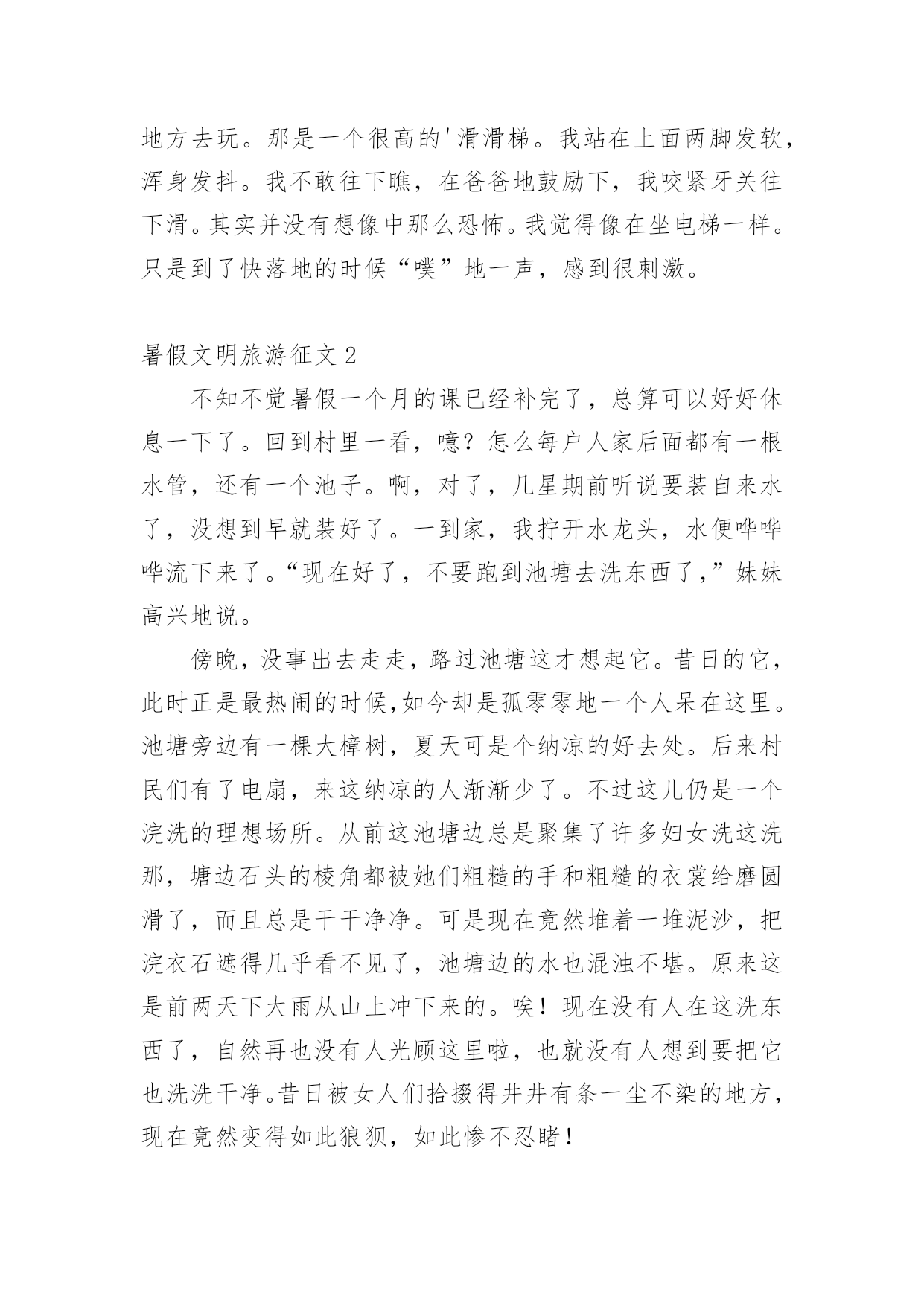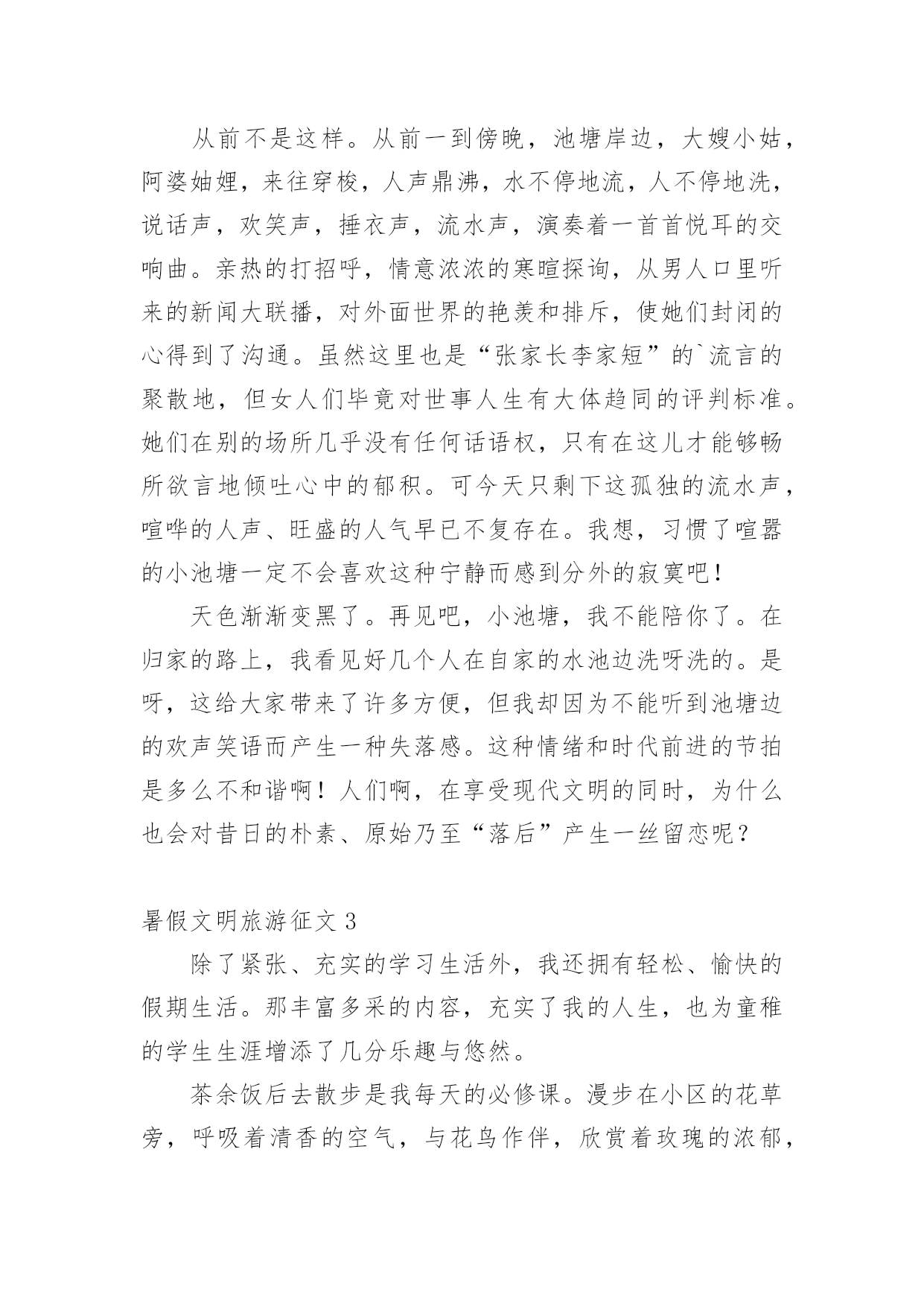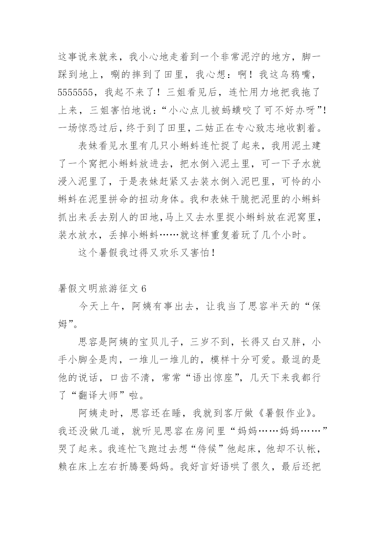 暑假文明旅游征文在平凡的学习、工作、生活中,大家都跟征文打过交道吧,征文是某个办事部门为了某个活动公开向社会征集的有关文章。怎么写征文才能避免踩雷呢?以下是小编整理的暑假文明旅游征文,欢迎阅读与收藏。暑假文明旅游征文1这个暑假,我经历了一件非常有趣的事。那天的天气格外炎热,火辣辣的太阳照射在皮肤上感到有点痛。我想,要是我像鱼一样生活在水中那该多好啊!这时,爸爸来了。我对爸爸说:“爸爸,你可不可以带我去游泳?”爸爸毫不犹豫地答应了。我心里乐开了花。我们到了西湖公园水上游乐场,看到这里人山人海。我们好不容易才买到两张票。我迫不及待地跑进更衣室迅速地换好泳衣。到了游泳池才发现忘了脱鞋。我想难道鞋子也想到水里去凉快凉快吗?哼!我偏不让你去,让你干着急。我悄悄地把鞋子藏在草里,然后去游泳。我们来到深水区,深水区的水可深了,已到爸爸的下巴上了。我害怕极了,双手紧紧地握着游泳圈。这时,我看到一个小女孩拿着一块潜水板轻松地游来游去,简直像水中的一条鱼。我看了羡慕极了。我很快地就和这个小女孩成了好朋友。在深水区玩了一会儿之后。爸爸说带我去一个很刺激的地方去玩。那是一个很高的'滑滑梯。我站在上面两脚发软,浑身发抖。我不敢往下瞧,在爸爸地鼓励下,我咬紧牙关往下滑。其实并没有想像中那么恐怖。我觉得像在坐电梯一样。只是到了快落地的时候“噗”地一声,感到很刺激。暑假文明旅游征文2不知不觉暑假一个月的课已经补完了,总算可以好好休息一下了。回到村里一看,噫?怎么每户人家后面都有一根水管,还有一个池子。啊,对了,几星期前听说要装自来水了,没想到早就装好了。一到家,我拧开水龙头,水便哗哗哗流下来了。“现在好了,不要跑到池塘去洗东西了,”妹妹高兴地说。傍晚,没事出去走走,路过池塘这才想起它。昔日的它,此时正是最热闹的时候,如今却是孤零零地一个人呆在这里。池塘旁边有一棵大樟树,夏天可是个纳凉的好去处。后来村民们有了电扇,来这纳凉的人渐渐少了。不过这儿仍是一个浣洗的理想场所。从前这池塘边总是聚集了许多妇女洗这洗那,塘边石头的棱角都被她们粗糙的手和粗糙的衣裳给磨圆滑了,而且总是干干净净。可是现在竟然堆着一堆泥沙,把浣衣石遮得几乎看不见了,池塘边的水也混浊不堪。原来这是前两天下大雨从山上冲下来的。唉!现在没有人在这洗东西了,自然再也没有人光顾这里啦,也就没有人想到要把它也洗洗干净。昔日被女人们拾掇得井井有条一尘不染的地方,现在竟然变得如此狼狈,如此惨不忍睹!从前不是这样。从前一到傍晚,池塘岸边,大嫂小姑,阿婆妯娌,来往穿梭,人声鼎沸,水不停地流,人不停地洗,说话声,欢笑声,捶衣声,流水声,演奏着一首首悦耳的交响曲。亲热的打招呼,情意浓浓的寒暄探询,从男人口里听来的新闻大联播,对外面世界的艳羡和排斥,使她们封闭的心得到了沟通。虽然这里也是“张家长李家短”的`流言的聚散地,但女人们毕竟对世事人生有大体趋同的评判标准。她们在别的场所几乎没有任何话语权,只有在这儿才能够畅所欲言地倾吐心中的郁积。可今天只剩下这孤独的流水声,喧哗的人声、旺盛的人气早已不复存在。我想,习惯了喧嚣的小池塘一定不会喜欢这种宁静而感到分外的寂寞吧!天色渐渐变黑了。再见吧,小池塘,我不能陪你了。在归家的路上,我看见好几个人在自家的水池边洗呀洗的。是呀,这给大家带来了许多方便,但我却因为不能听到池塘边的欢声笑语而产生一种失落感。这种情绪和时代前进的节拍是多么不和谐啊!人们啊,在享受现代文明的同时,为什么也会对昔日的朴素、原始乃至“落后”产生一丝留恋呢?暑假文明旅游征文3除了紧张、充实的学习生活外,我还拥有轻松、愉快的假期生活。那丰富多采的内容,充实了我的人生,也为童稚的学生生涯增添了几分乐趣与悠然。茶余饭后去散步是我每天的必修课。漫步在小区的花草旁,呼吸着清香的空气,与花鸟作伴,欣赏着玫瑰的浓郁,百合的高洁,晚饭花的.奇特,还有玉兰的娇美,美人蕉的绚丽,我会轻轻地对自己说:“生活真是美的。”我用真诚感受身边的五颜六色,用热情欣赏周围的姹紫嫣红。我不由自主地从内心发出:“我,属于大自然!”更多地,我会一头扎进书的海洋,呼吸着书店、图书馆特有的那种书香的气味,感受漫步书海的乐趣。钻进历史的海洋,我会为秦始皇焚书坑儒的举动而激愤,为霸王别姬的悲惨而落泪,为诸葛亮“出师未捷身先死”扼腕叹息;漫步文学的殿堂,我渐渐体会到宝钗的无奈、黛玉的才华,体会到玛丽的倔强、科林的孱弱,体会到余秋雨的“晨雨初听”、钱钟书的“围城”……我的暑假生活,是一首诗,一片绿叶,一支歌……暑假文明旅游征文4在我的暑假生活当中,总结起来就是3个字:忙,玩,睡。在我的暑假生活中,我很忙,在我爸妈的压制下,我不得不完成他们给我布置每天的任务,还要每天为他们做家务,当然,我也可以从中获得一些报酬。有一次,我下午看电视,可能是因为这个节目太好看了,我就