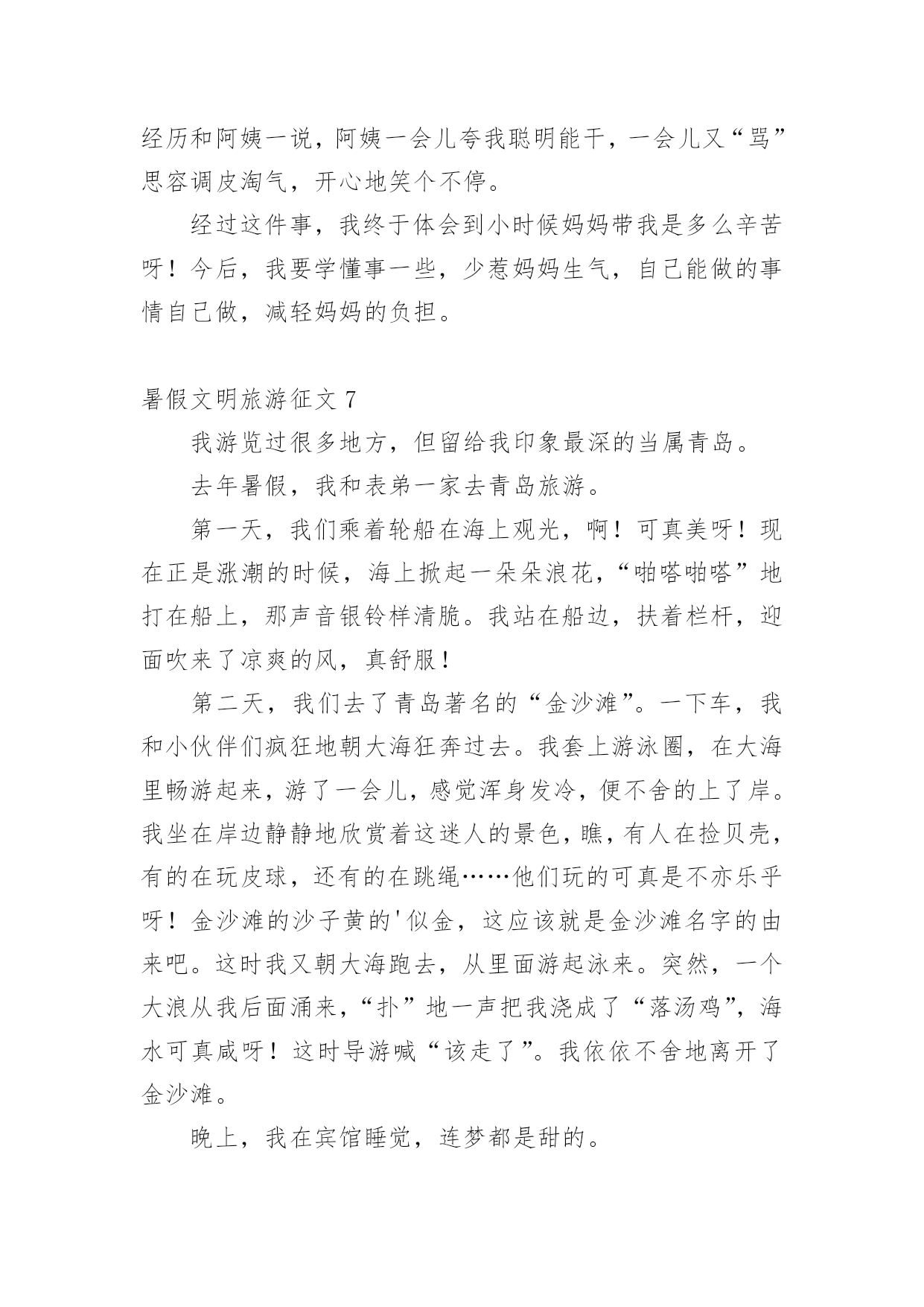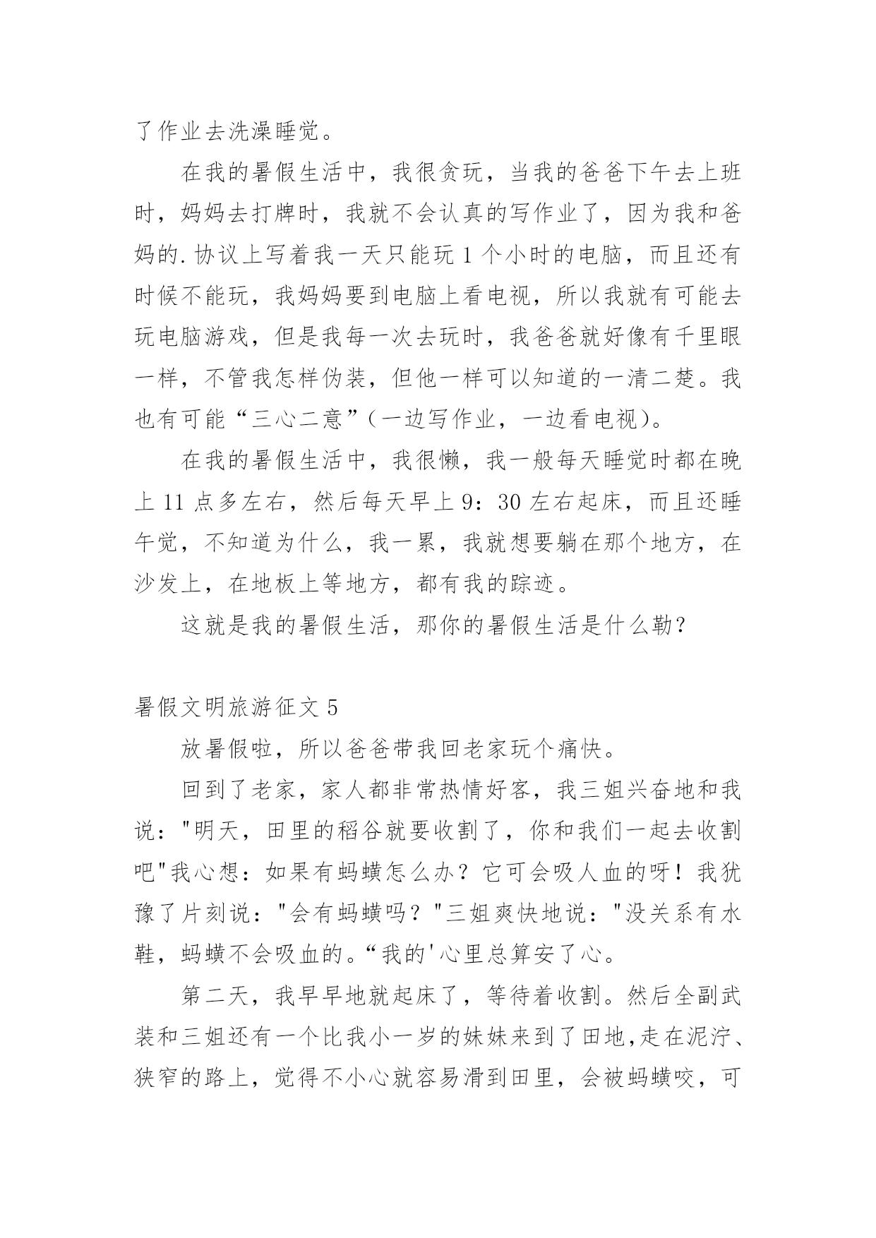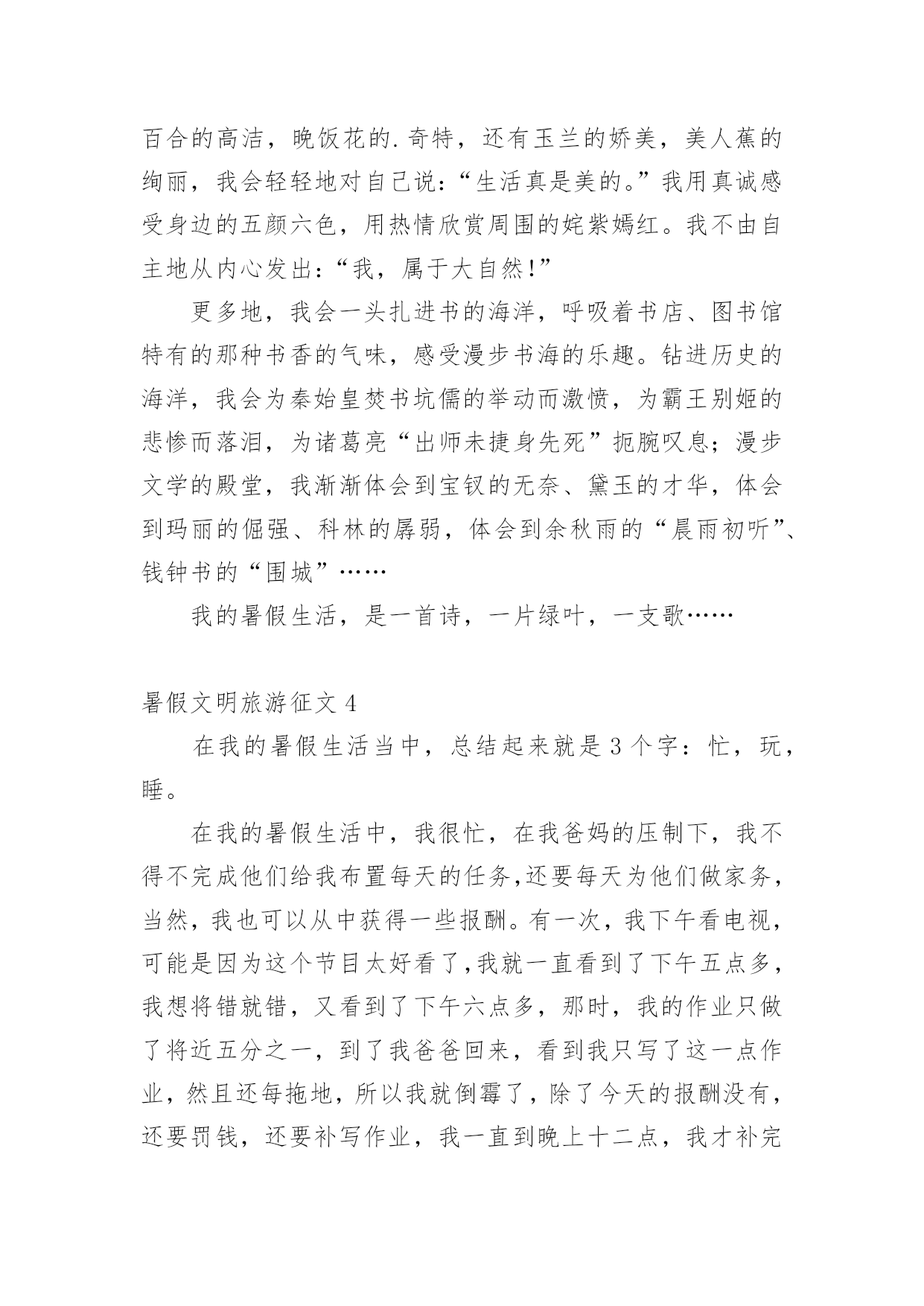 暑假文明旅游征文在平凡的学习、工作、生活中,大家都跟征文打过交道吧,征文是某个办事部门为了某个活动公开向社会征集的有关文章。怎么写征文才能避免踩雷呢?以下是小编整理的暑假文明旅游征文,欢迎阅读与收藏。暑假文明旅游征文1这个暑假,我经历了一件非常有趣的事。那天的天气格外炎热,火辣辣的太阳照射在皮肤上感到有点痛。我想,要是我像鱼一样生活在水中那该多好啊!这时,爸爸来了。我对爸爸说:“爸爸,你可不可以带我去游泳?”爸爸毫不犹豫地答应了。我心里乐开了花。我们到了西湖公园水上游乐场,看到这里人山人海。我们好不容易才买到两张票。我迫不及待地跑进更衣室迅速地换好泳衣。到了游泳池才发现忘了脱鞋。我想难道鞋子也想到水里去凉快凉快吗?哼!我偏不让你去,让你干着急。我悄悄地把鞋子藏在草里,然后去游泳。我们来到深水区,深水区的水可深了,已到爸爸的下巴上了。我害怕极了,双手紧紧地握着游泳圈。这时,我看到一个小女孩拿着一块潜水板轻松地游来游去,简直像水中的一条鱼。我看了羡慕极了。我很快地就和这个小女孩成了好朋友。在深水区玩了一会儿之后。爸爸说带我去一个很刺激的地方去玩。那是一个很高的'滑滑梯。我站在上面两脚发软,浑身发抖。我不敢往下瞧,在爸爸地鼓励下,我咬紧牙关往下滑。其实并没有想像中那么恐怖。我觉得像在坐电梯一样。只是到了快落地的时候“噗”地一声,感到很刺激。暑假文明旅游征文2不知不觉暑假一个月的课已经补完了,总算可以好好休息一下了。回到村里一看,噫?怎么每户人家后面都有一根水管,还有一个池子。啊,对了,几星期前听说要装自来水了,没想到早就装好了。一到家,我拧开水龙头,水便哗哗哗流下来了。“现在好了,不要跑到池塘去洗东西了,”妹妹高兴地说。傍晚,没事出去走走,路过池塘这才想起它。昔日的它,此时正是最热闹的时候,如今却是孤零零地一个人呆在这里。池塘旁边有一棵大樟树,夏天可是个纳凉的好去处。后来村民们有了电扇,来这纳凉的人渐渐少了。不过这儿仍是一个浣洗的理想场所。从前这池塘边总是聚集了许多妇女洗这洗那,塘边石头的棱角都被她们粗糙的手和粗糙的衣裳给磨圆滑了,而且总是干干净净。可是现在竟然堆着一堆泥沙,把浣衣石遮得几乎看不见了,池塘边的水也混浊不堪。原来这是前两天下大雨从山上冲下来的。唉!现在没有人在这洗东西了,自然再也没有人光顾这里啦,也就没有人想到要把它也洗洗干净。昔日被女人们拾掇得井井有条一尘不染的地方,现在竟然变得如此狼狈,如此惨不忍睹!从前不是这样。从前一到傍晚,池塘岸边,大嫂小姑,阿婆妯娌,来往穿梭,人声鼎沸,水不停地流,人不停地洗,说话声,欢笑声,捶衣声,流水声,演奏着一首首悦耳的交响曲。亲热的打招呼,情意浓浓的寒暄探询,从男人口里听来的新闻大联播,对外面世界的艳羡和排斥,使她们封闭的心得到了沟通。虽然这里也是“张家长李家短”的`流言的聚散地,但女人们毕竟对世事人生有大体趋同的评判标准。她们在别的场所几乎没有任何话语权,只有在这儿才能够畅所欲言地倾吐心中的郁积。可今天只剩下这孤独的流水声,喧哗的人声、旺盛的人气早已不复存在。我想,习惯了喧嚣的小池塘一定不会喜欢这种宁静而感到分外的寂寞吧!天色渐渐变黑了。再见吧,小池塘,我不能陪你了。在归家的路上,我看见好几个人在自家的水池边洗呀洗的。是呀,这给大家带来了许多方便,但我却因为不能听到池塘边的欢声笑语而产生一种失落感。这种情绪和时代前进的节拍是多么不和谐啊!人们啊,在享受现代文明的同时,为什么也会对昔日的朴素、原始乃至“落后”产生一丝留恋呢?暑假文明旅游征文3除了紧张、充实的学习生活外,我还拥有轻松、愉快的假期生活。那丰富多采的内容,充实了我的人生,也为童稚的学生生涯增添了几分乐趣与悠然。茶余饭后去散步是我每天的必修课。漫步在小区的花草旁,呼吸着清香的空气,与花鸟作伴,欣赏着玫瑰的浓郁,百合的高洁,晚饭花的.奇特,还有玉兰的娇美,美人蕉的绚丽,我会轻轻地对自己说:“生活真是美的。”我用真诚感受身边的五颜六色,用热情欣赏周围的姹紫嫣红。我不由自主地从内心发出:“我,属于大自然!”更多地,我会一头扎进书的海洋,呼吸着书店、图书馆特有的那种书香的气味,感受漫步书海的乐趣。钻进历史的海洋,我会为秦始皇焚书坑儒的举动而激愤,为霸王别姬的悲惨而落泪,为诸葛亮“出师未捷身先死”扼腕叹息;漫步文学的殿堂,我渐渐体会到宝钗的无奈、黛玉的才华,体会到玛丽的倔强、科林的孱弱,体会到余秋雨的“晨雨初听”、钱钟书的“围城”……我的暑假生活,是一首诗,一片绿叶,一支歌……暑假文明旅游征文4在我的暑假生活当中,总结起来就是3个字:忙,玩,睡。在我的暑假生活中,我很忙,在我爸妈的压制下,我不得不完成他们给我布置每天的任务,还要每天为他们做家务,当然,我也可以从中获得一些报酬。有一次,我下午看电视,可能是因为这个节目太好看了,我就