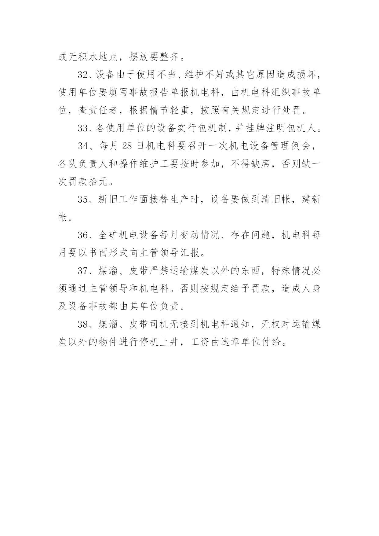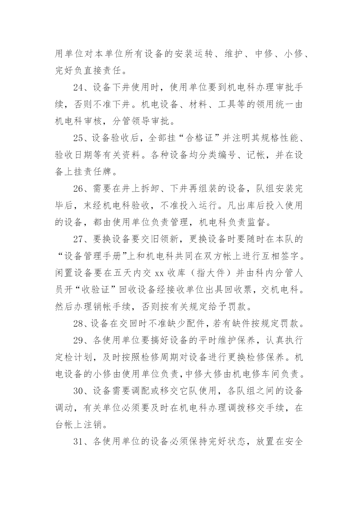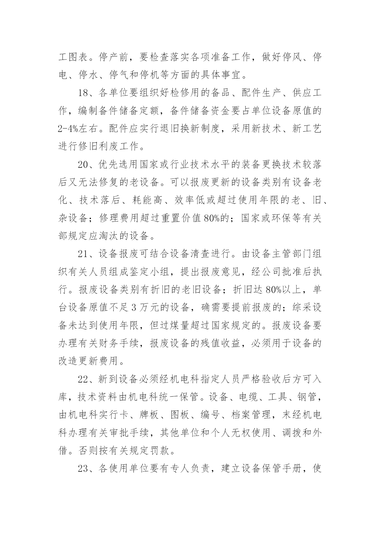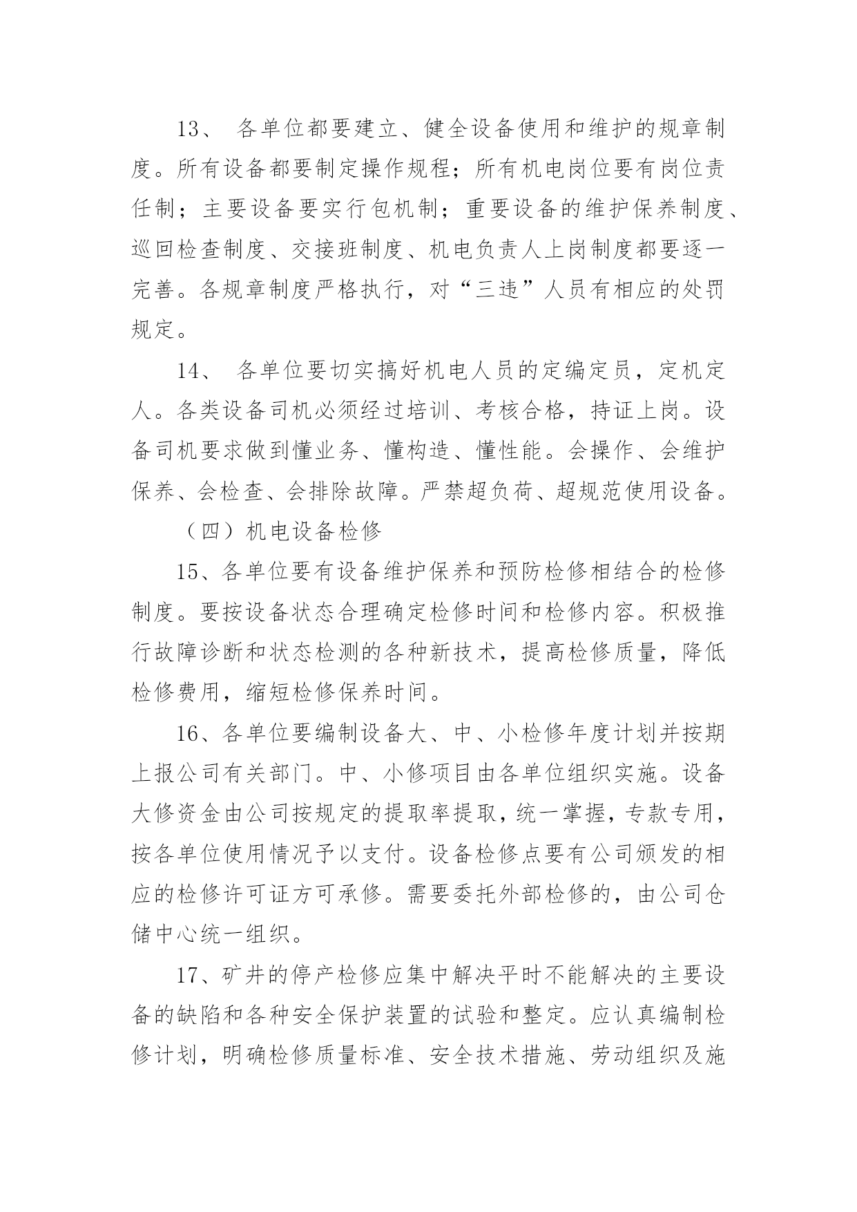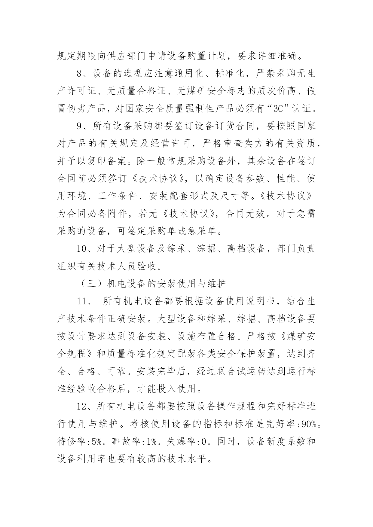 煤矿机电设备管理规定最新煤矿机电设备管理规定最新(一)总则1、为适应公司的快速发展,加强机电设备管理,提高生产装备水平和经济效益,保证安全生产和设备正常运行,根据国家有关规定,结合我矿特点,特制定本规定。2、机电设备管理要依靠科技进步,充分发挥设备效能和投资效益,坚持决策、研制、与使用相结合,维护、保养与计划检修相结合,修理、改造与更新相结合,技术管理与经济管理相结合的原则。3、公司采购中心是设备采购供应的专门机构,凡列入公司专用资金计划的设备,均由其统一组织采购供应;公司财务部负责设备固定资产的购入、折旧提取、大中修、报废、调拨等财务帐目及经济核算工作;公司生产技术部参与矿井技术改造机电设备部分的设计审核工作,参与主要机电设备的选型配套审定,参与机电工程的竣工投产验收工作。4、机电设备管理人员要自觉执行本规定,维护公司利益,面向基层、服务生产,热情周到地搞好本职工作。(二)机电设备的购置计划与采购5、机电管理部门应根据年度计划、月度计划或紧急情况下安全生产急需设备的指令、指示编制采购计划。6、各单位机电设备管理部门要根据设备需要时间,按规定期限向供应部门申请设备购置计划,要求详细准确。8、设备的选型应注意通用化、标准化,严禁采购无生产许可证、无质量合格证、无煤矿安全标志的质次价高、假冒伪劣产品,对国家安全质量强制性产品必须有“3C”认证。9、所有设备采购都要签订设备订货合同,要按照国家对产品的有关规定及经营许可,严格审查卖方的有关资质,并予以复印备案。除一般常规采购设备外,其余设备在签订合同前必须签订《技术协议》,以确定设备参数、性能、使用环境、工作条件、安装配套形式及尺寸等。《技术协议》为合同必备附件,若无《技术协议》,合同无效。对于急需采购的设备,可签定采购单或急采单。10、对于大型设备及综采、综掘、高档设备,部门负责组织有关技术人员验收。(三)机电设备的安装使用与维护11、所有机电设备都要根据设备使用说明书,结合生产技术条件正确安装。大型设备和综采、综掘、高档设备要按设计要求达到设备安装、设施布置合格。严格按《煤矿安全规程》和质量标准化规定配装各类安全保护装置,达到齐全、合格、可靠。安装完毕后,经过联合试运转达到运行标准经验收合格后,才能投入使用。12、所有机电设备都要按照设备操作规程和完好标准进行使用与维护。考核使用设备的指标和标准是完好率:90%。待修率:5%。事故率:1%。失爆率:0。同时,设备新度系数和设备利用率也要有较高的技术水平。13、各单位都要建立、健全设备使用和维护的规章制度。所有设备都要制定操作规程;所有机电岗位要有岗位责任制;主要设备要实行包机制;重要设备的维护保养制度、巡回检查制度、交接班制度、机电负责人上岗制度都要逐一完善。各规章制度严格执行,对“三违”人员有相应的处罚规定。14、各单位要切实搞好机电人员的定编定员,定机定人。各类设备司机必须经过培训、考核合格,持证上岗。设备司机要求做到懂业务、懂构造、懂性能。会操作、会维护保养、会检查、会排除故障。严禁超负荷、超规范使用设备。(四)机电设备检修15、各单位要有设备维护保养和预防检修相结合的检修制度。要按设备状态合理确定检修时间和检修内容。积极推行故障诊断和状态检测的各种新技术,提高检修质量,降低检修费用,缩短检修保养时间。16、各单位要编制设备大、中、小检修年度计划并按期上报公司有关部门。中、小修项目由各单位组织实施。设备大修资金由公司按规定的提取率提取,统一掌握,专款专用,按各单位使用情况予以支付。设备检修点要有公司颁发的相应的检修许可证方可承修。需要委托外部检修的,由公司仓储中心统一组织。17、矿井的停产检修应集中解决平时不能解决的主要设备的缺陷和各种安全保护装置的试验和整定。应认真编制检修计划,明确检修质量标准、安全技术措施、劳动组织及施工图表。停产前,要检查落实各项准备工作,做好停风、停电、停水、停气和停机等方面的具体事宜。18、各单位要组织好检修用的备品、配件生产、供应工作,编制备件储备定额,备件储备资金要占单位设备原值的2-4%左右。配件应实行退旧换新制度,采用新技术、新工艺进行修旧利废工作。20、优先选用国家或行业技术水平的装备更换技术较落后又无法修复的老设备。可以报废更新的设备类别有设备老化、技术落后、耗能高、效率低或超过使用年限的老、旧、杂设备;修理费用超过重置价值80%的;国家或环保等有关部规定应淘汰的设备。21、设备报废可结合设备清查进行。由设备主管部门组织有关人员组成鉴定小组,提出报废意见,经公司批准后执行。报废设备类别有折旧的老旧设备;折旧达80%以上,单台设备原值不足3万元的设备,确需要提前报废的;综采设备未达到使用年限,但过煤量超过国家规定的。报废设备要办理有关财务手续,报废设备的残值收益,必须用于设备的改造更