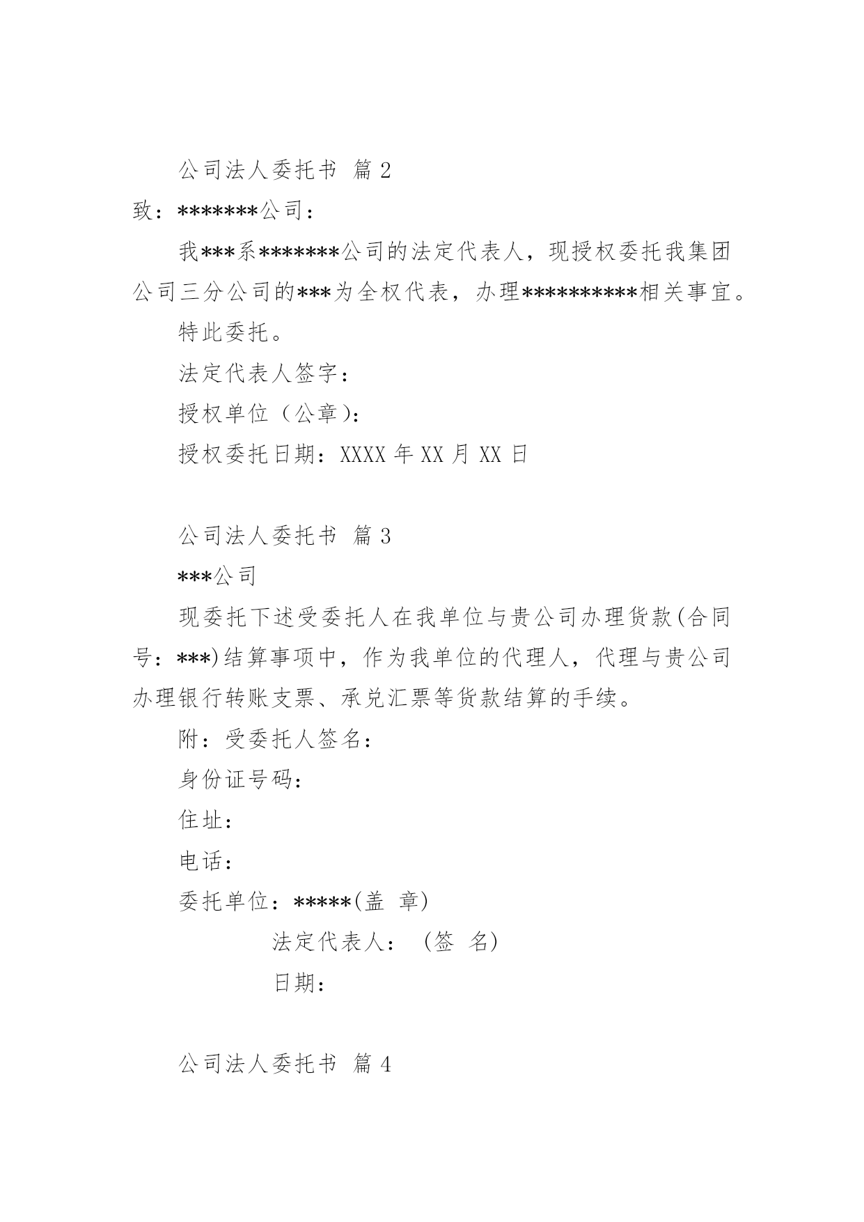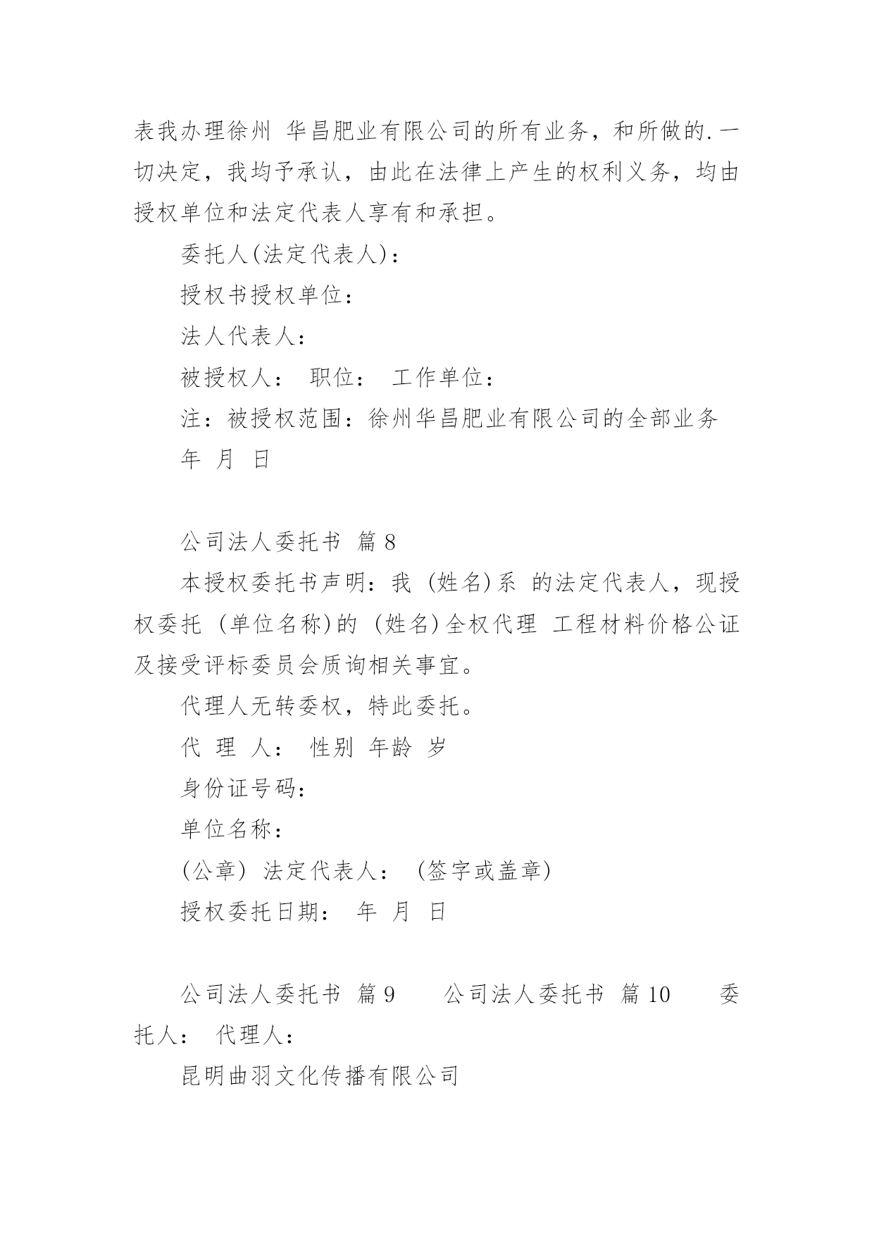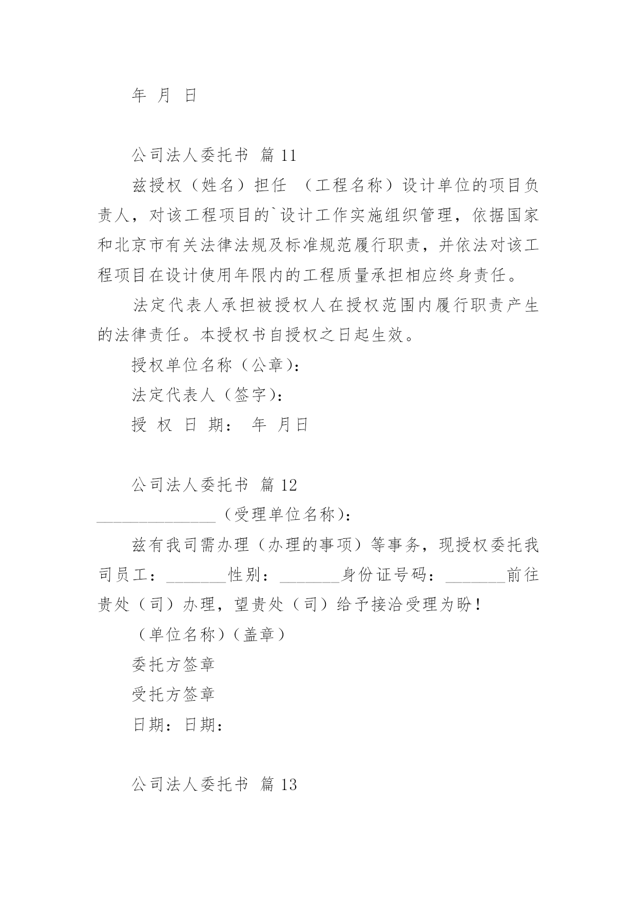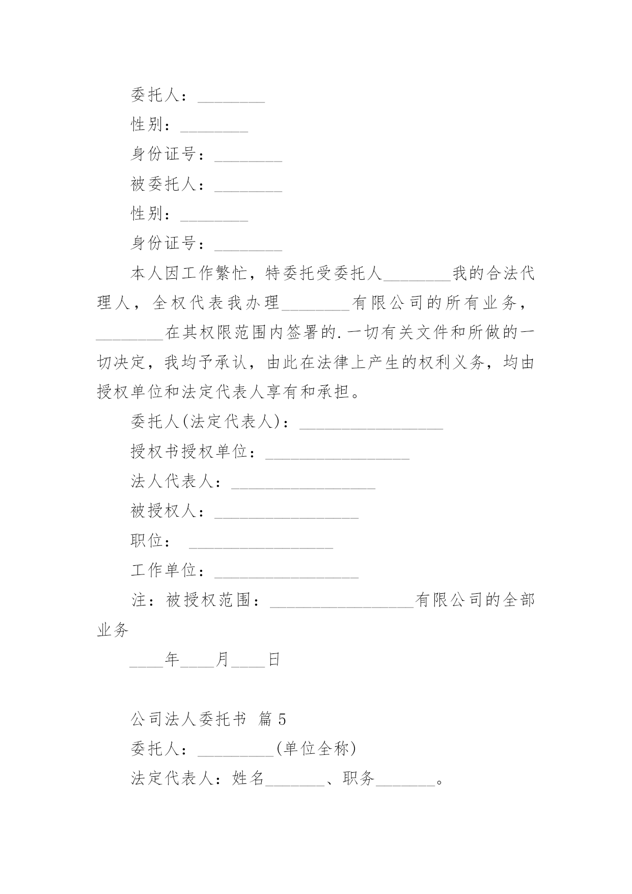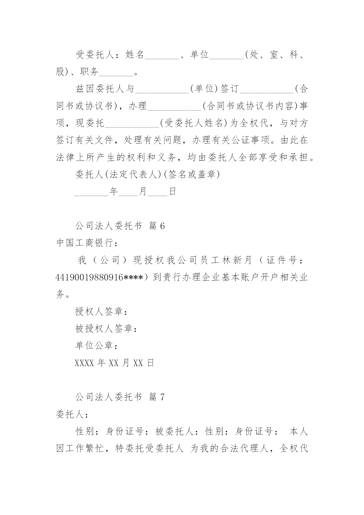 公司法人委托书(荐)公司法人委托书15篇委托书委托他人代表自己行使自己的合法权益时,委托人不得以任何理由反悔委托事项。在发展不断提速的社会中,在处理事务上需要使用委托书的情况越来越多,写起委托书来就毫无头绪?下面是小编整理的公司法人委托书,欢迎阅读与收藏。公司法人委托书篇1委托单位:__________________法人代表:__________________法人授权人姓名:____________联系电话:__________________身份证号码:__________________工作单位:__________________现委托上述委托人______在______广告费转账事宜:开户行:__________________开户人:____________帐号:__________________由此引起的一切责任均有我单位承担。委托单位:(盖章)法人代表人:(签名或盖章)法人授权人:(签名或盖章)年月日公司法人委托书篇2致:*******公司:我***系*******公司的法定代表人,现授权委托我集团公司三分公司的***为全权代表,办理**********相关事宜。特此委托。法定代表人签字:授权单位(公章):授权委托日期:XXXX年XX月XX日公司法人委托书篇3***公司现委托下述受委托人在我单位与贵公司办理货款(合同号:***)结算事项中,作为我单位的代理人,代理与贵公司办理银行转账支票、承兑汇票等货款结算的手续。附:受委托人签名:身份证号码:住址:电话:委托单位:*****(盖章)法定代表人:(签名)日期:公司法人委托书篇4委托人:________性别:________身份证号:________被委托人:________性别:________身份证号:________本人因工作繁忙,特委托受委托人________我的合法代理人,全权代表我办理________有限公司的所有业务,________在其权限范围内签署的.一切有关文件和所做的一切决定,我均予承认,由此在法律上产生的权利义务,均由授权单位和法定代表人享有和承担。委托人(法定代表人):_________________授权书授权单位:_________________法人代表人:_________________被授权人:_________________职位:_________________工作单位:_________________注:被授权范围:_________________有限公司的全部业务____年____月____日公司法人委托书篇5委托人:_________(单位全称)法定代表人:姓名_______、职务_______。受委托人:姓名_______、单位_______(处、室、科、股)、职务_______。兹因委托人与___________(单位)签订___________(合同书或协议书),办理___________(合同书或协议书内容)事项,现委托___________(受委托人姓名)为全权代,与对方签订有关文件,处理有关问题,办理有关公证事项。由此在法律上所产生的权利和义务,均由委托人全部享受和承担。委托人(法定代表人)(签名或盖章)_______年____月____日公司法人委托书篇6中国工商银行:我(公司)现授权我公司员工林新月(证件号:44190019880916****)到贵行办理企业基本账户开户相关业务。授权人签章:被授权人签章:单位公章:XXXX年XX月XX日公司法人委托书篇7委托人:性别:身份证号:被委托人:性别:身份证号:本人因工作繁忙,特委托受委托人为我的合法代理人,全权代表我办理徐州华昌肥业有限公司的所有业务,和所做的.一切决定,我均予承认,由此在法律上产生的权利义务,均由授权单位和法定代表人享有和承担。委托人(法定代表人):授权书授权单位:法人代表人:被授权人:职位:工作单位:注:被授权范围:徐州华昌肥业有限公司的全部业务年月日公司法人委托书篇8本授权委托书声明:我(姓名)系的法定代表人,现授权委托(单位名称)的(姓名)全权代理工程材料价格公证及接受评标委员会质询相关事宜。代理人无转委权,特此委托。代理人:性别年龄岁身份证号码:单位名称:(公章)法定代表人:(签字或盖章)授权委托日期:年月日公司法人委托书篇9公司法人委托书篇10委托人:代理人:昆明曲羽文化传播有限公司年月日公司法人委托书篇11兹授权(姓名)担任(工程名称)设计单位的项目负责人,对该工程项目的`设计工作实施组织管理,依据国家和北京市有关法律法规及标准规范履行职责,并依法对该工程项目在设计使用年限内的工程质量承担相应终身责任。法定代表人承担被授权人在授权范围内履行职责产生的法律责任。本授权书自授权之日起生效。授权单位名称(公章):法定代