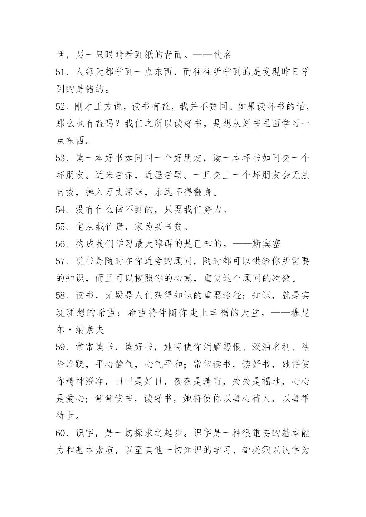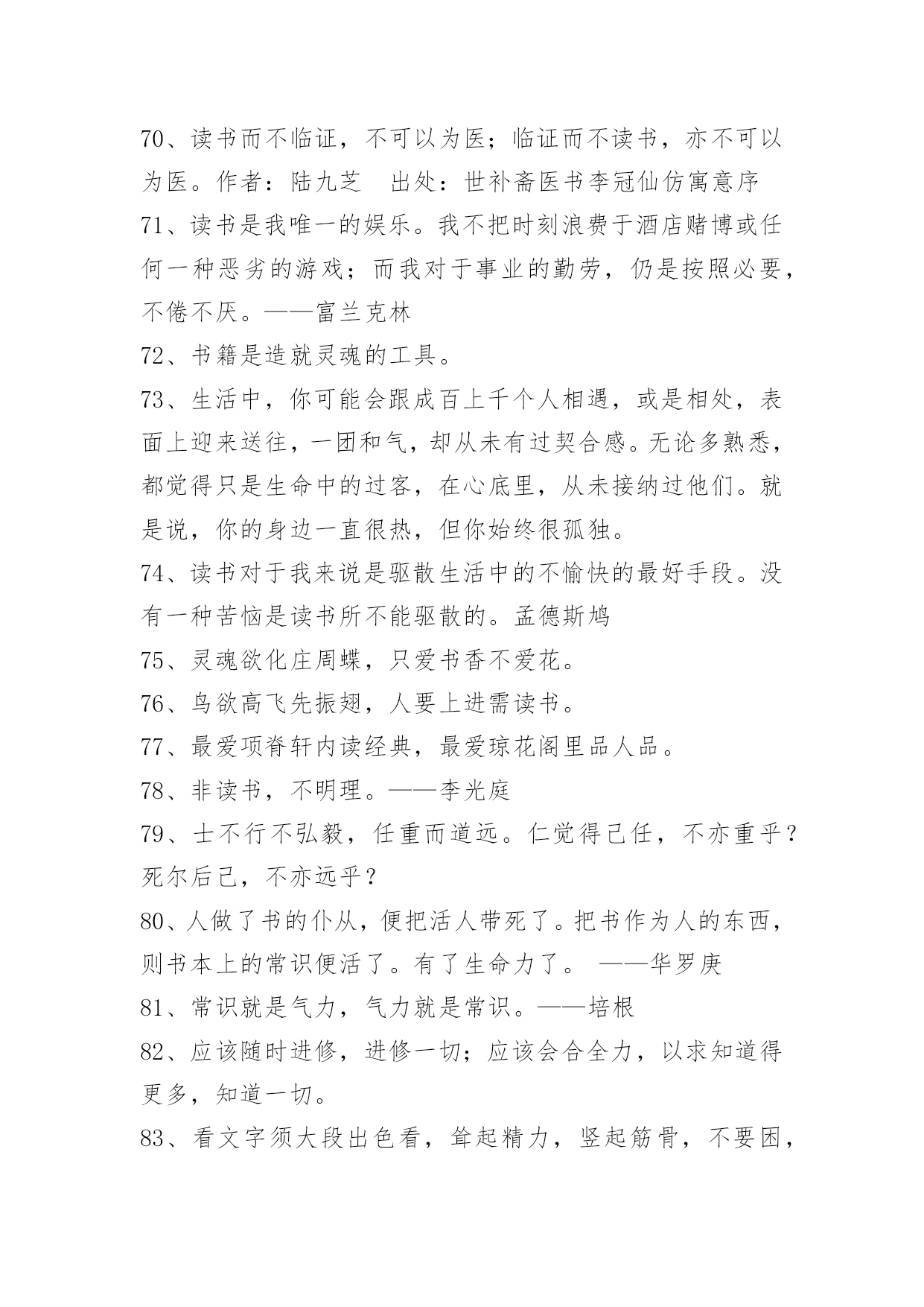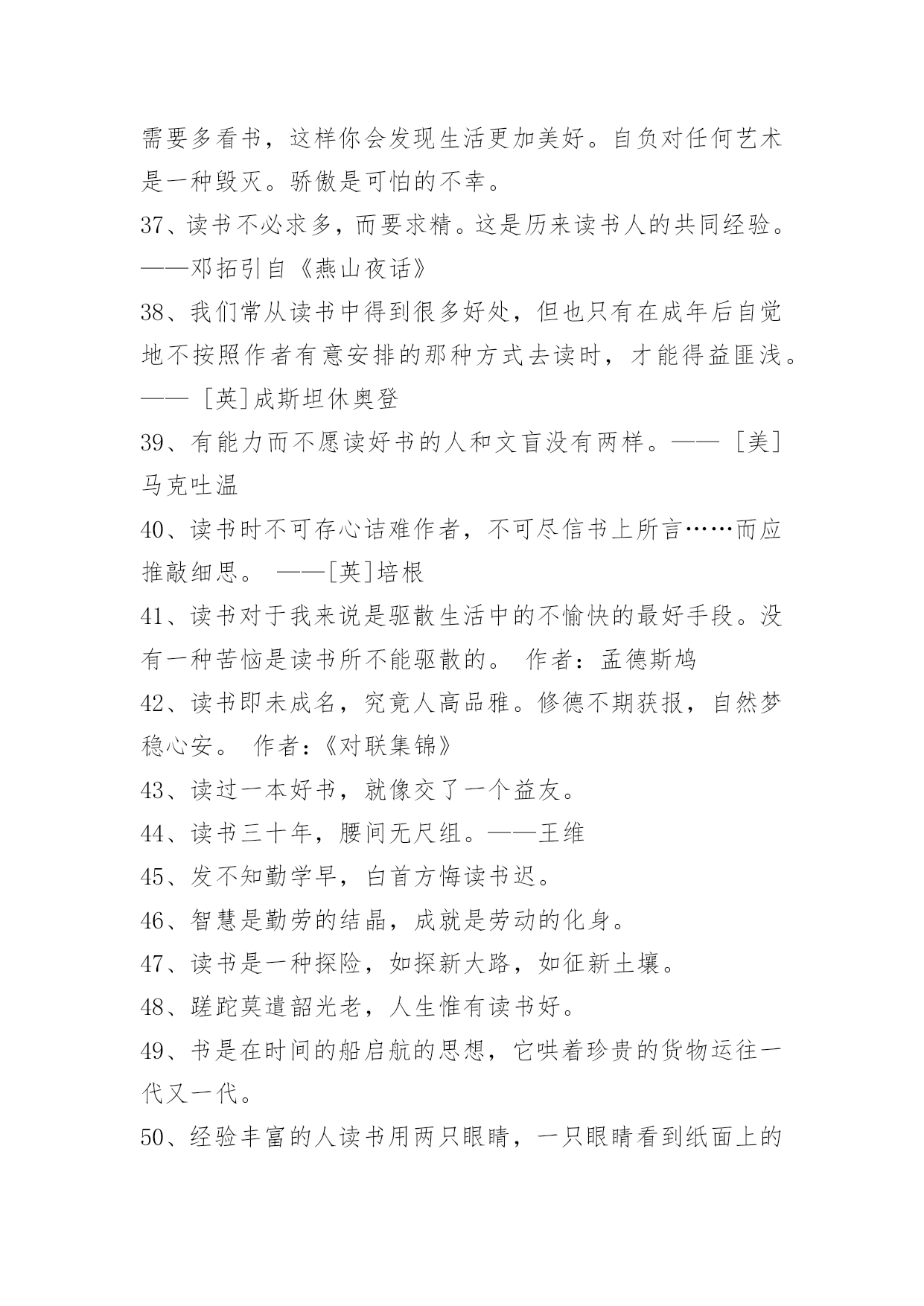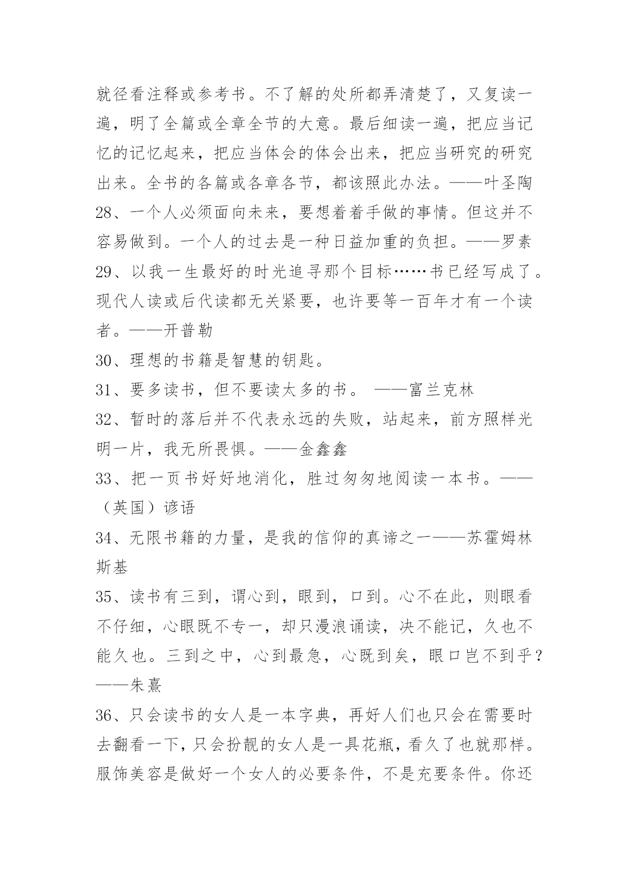 读书的名言警句88条2024年常用读书的名言警句合集88条书籍就像一盏神灯,它照亮人们最遥远最黯淡的生活道以下是小编为大家准备的读书的名言警句88条,欢迎阅读借鉴。1、奇文共赏识,疑义相如析。2、读书是万能的宝库,实践是万能的钥匙。3、读书提高精神文明,实践提高物质文明。4、读书不要贪多,而是要多加思索;这样的读书使我获益不少。——鲁索5、一本书像一艘船,带领咱们从狭隘的地方,驶向生活的无限广阔的海洋。——凯勒6、一个爱书的人,他必定不致于缺少一个忠实的兄弟姐妹,一个良好的老师,一个可爱的伴侣,一个温情的安慰者。——巴罗7、读书是学问之母,实践是学问之父。8、读书之乐乐无穷,拨琴一弄来熏风。9、读书举一反三博古通今,实践触类旁通改地换天。10、读书是人生起跑线,实践是人生加油站。11、当怒读则喜,当病读则痊。恃此用为命,纵横堆满前。——杨循吉《题书橱》12、读书患不多,思义患不明。患足己不学,既学患不行。——韩愈《劝学诗》13、草堂栖在灵山谷,勤读诗书向灯烛。——薛令之《草堂吟》14、读书是积累知识的重要途径,虽然现在出版的书已浩如瀚海,"于书无所不读"已不可能了。但是,读书还应该注意面广一些。——姚大均15、我们没有那么多时间,因此,选择书很重要。不加选择,如果读的是一本没有用处的书,或者是一本坏书,那就是浪费时间。不只是浪费时间,有时还接受些错误的东西。到底读什么不读什么?还要根据各人的专业来定。——王力16、诵《诗》三百,授之以政,不达;使于四方,不能专对;虽多、亦奚以为?——孔丘17、读书不专是务博,须是凑成一堆……有人力格数人。问之,渠云:"力兼二人,便敌得十人;力兼三四人,则三四十人不足道也。"以此见得,须是合并,若散开终是不济事。——李光地18、余幼时即嗜学,家贫,无从致书以观,每假借于藏书之家,手自笔录,计日以还。天大寒,砚冰坚,手指不可屈伸,弗之怠,录毕,走送之,不敢稍逾约。以是人多以书假余,余因得遍观群书。——明·宋濂《送东阳马生序》19、理论书籍、历史书籍和文学书籍等等,这类书的特点是对人的思想情操有着潜移默化的作用,它们对人的影响是巨大的,也是深刻的。热爱书,勤读书,是人的心灵丰富的折光,是人的精神向上的表现,因而也是一个社会文明程度的重要标志……多读书,读好书,一定会逐渐成为我国人民的持久的普遍的习惯。——吴欢章20、小朋友,愿你们用心读古书,他们常在一定的环境中说出你们心中要说的话。21、"史书"绝不是"死书"。历史是一门活的科学,没有过去,哪有现在,不了解现状,怎能展望将来。研究现状也就是研究当代史,古代史、近代史当然要研究,但现状更重要。——姚楠22、目录之学,学中第一要紧事,必从此问途,方能得其门而入。凡读书最切要者,目录之学;目录明,方可读书;不明,终是乱读。——王鸣盛23、读史须一气看过,则前后连贯,易于记忆。——陆世仪24、读书费时过多易惰,文采藻饰太盛则矫,全凭条文断事乃学究故态。——培根25、我们可以由读书而搜集知识,但必须利用思考把糠和谷子分开。——福雷斯特26、对于一个艺术家来说,重要的是如何阅读生活这本书和从中阅读什么。但为了阅读生活这部书,而不是在一大堆现象面前张皇失措,便需要有明确的目的性要方法。27、各种书籍因性质不同,阅读方法也不能一样。但是就一般说,总得像精读时候的阅读那样,就其中的一篇或一章一节,逐句循诵,摘出不了解的处所;然后应用平时阅读的经验,试把那些不了解的处所自求解答,得到了解答,再看注释或参考书,以检验解答的对不对;如果实在无法解答,那就径看注释或参考书。不了解的处所都弄清楚了,又复读一遍,明了全篇或全章全节的大意。最后细读一遍,把应当记忆的记忆起来,把应当体会的体会出来,把应当研究的研究出来。全书的各篇或各章各节,都该照此办法。——叶圣陶28、一个人必须面向未来,要想着着手做的事情。但这并不容易做到。一个人的过去是一种日益加重的负担。——罗素29、以我一生最好的时光追寻那个目标……书已经写成了。现代人读或后代读都无关紧要,也许要等一百年才有一个读者。——开普勒30、理想的书籍是智慧的钥匙。31、要多读书,但不要读太多的书。——富兰克林32、暂时的落后并不代表永远的失败,站起来,前方照样光明一片,我无所畏惧。——金鑫鑫33、把一页书好好地消化,胜过匆匆地阅读一本书。——(英国)谚语34、无限书籍的力量,是我的信仰的真谛之一——苏霍姆林斯基35、读书有三到,谓心到,眼到,口到。心不在此,则眼看不仔细,心眼既不专一,却只漫浪诵读,决不能记,久也不能久也。三到之中,心到最急,心既到矣,眼口岂不到乎?——朱熹36、只会读书的女人是一本字典,再好人们也只会在需要时去翻看一下,只会扮靓的女人是一具花瓶,看久了也就那样。服饰美容是做好一个女人的必要条件,不是充要条件