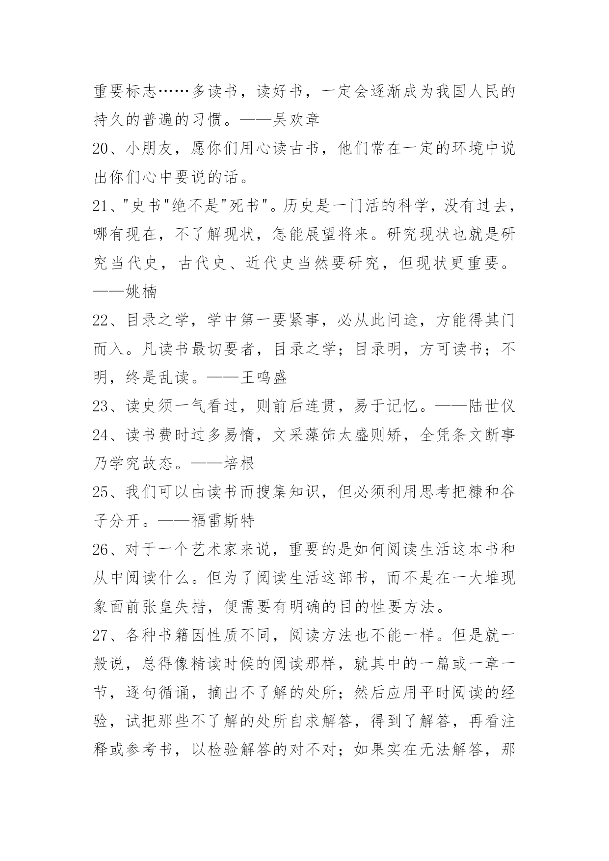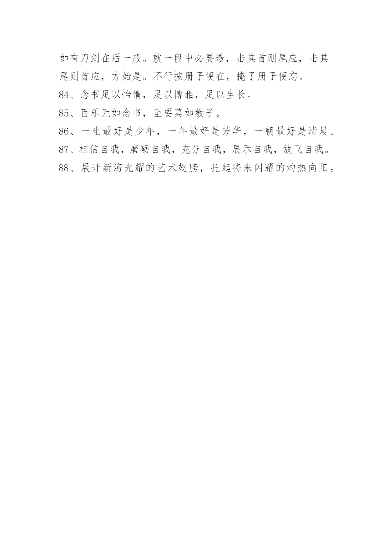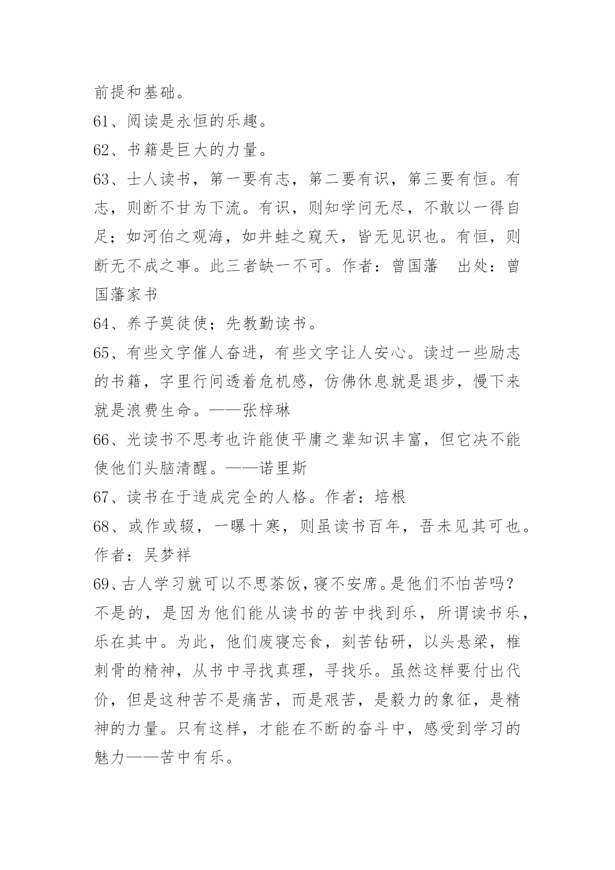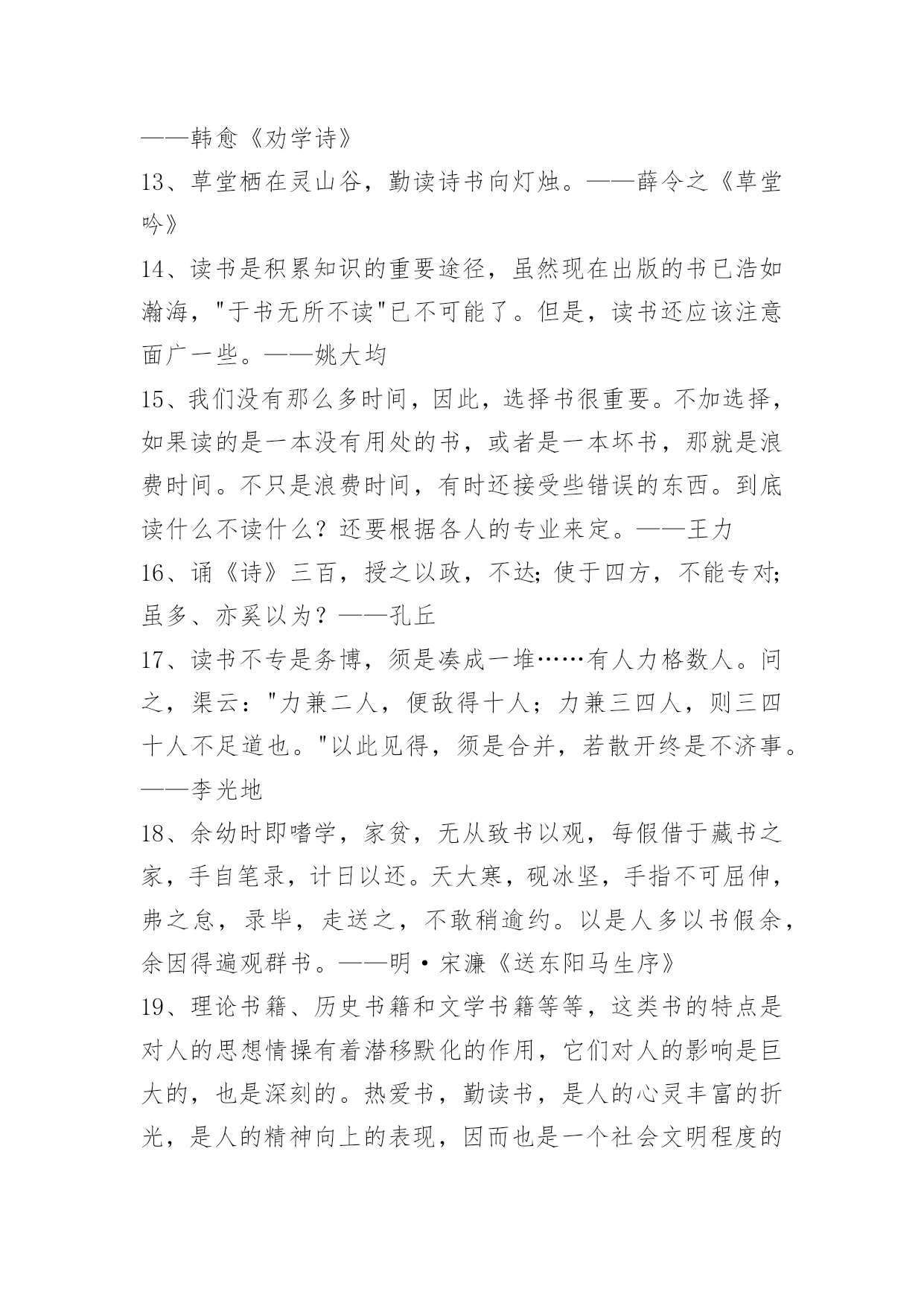 读书的名言警句88条2024年常用读书的名言警句合集88条书籍就像一盏神灯,它照亮人们最遥远最黯淡的生活道以下是小编为大家准备的读书的名言警句88条,欢迎阅读借鉴。1、奇文共赏识,疑义相如析。2、读书是万能的宝库,实践是万能的钥匙。3、读书提高精神文明,实践提高物质文明。4、读书不要贪多,而是要多加思索;这样的读书使我获益不少。——鲁索5、一本书像一艘船,带领咱们从狭隘的地方,驶向生活的无限广阔的海洋。——凯勒6、一个爱书的人,他必定不致于缺少一个忠实的兄弟姐妹,一个良好的老师,一个可爱的伴侣,一个温情的安慰者。——巴罗7、读书是学问之母,实践是学问之父。8、读书之乐乐无穷,拨琴一弄来熏风。9、读书举一反三博古通今,实践触类旁通改地换天。10、读书是人生起跑线,实践是人生加油站。11、当怒读则喜,当病读则痊。恃此用为命,纵横堆满前。——杨循吉《题书橱》12、读书患不多,思义患不明。患足己不学,既学患不行。——韩愈《劝学诗》13、草堂栖在灵山谷,勤读诗书向灯烛。——薛令之《草堂吟》14、读书是积累知识的重要途径,虽然现在出版的书已浩如瀚海,"于书无所不读"已不可能了。但是,读书还应该注意面广一些。——姚大均15、我们没有那么多时间,因此,选择书很重要。不加选择,如果读的是一本没有用处的书,或者是一本坏书,那就是浪费时间。不只是浪费时间,有时还接受些错误的东西。到底读什么不读什么?还要根据各人的专业来定。——王力16、诵《诗》三百,授之以政,不达;使于四方,不能专对;虽多、亦奚以为?——孔丘17、读书不专是务博,须是凑成一堆……有人力格数人。问之,渠云:"力兼二人,便敌得十人;力兼三四人,则三四十人不足道也。"以此见得,须是合并,若散开终是不济事。——李光地18、余幼时即嗜学,家贫,无从致书以观,每假借于藏书之家,手自笔录,计日以还。天大寒,砚冰坚,手指不可屈伸,弗之怠,录毕,走送之,不敢稍逾约。以是人多以书假余,余因得遍观群书。——明·宋濂《送东阳马生序》19、理论书籍、历史书籍和文学书籍等等,这类书的特点是对人的思想情操有着潜移默化的作用,它们对人的影响是巨大的,也是深刻的。热爱书,勤读书,是人的心灵丰富的折光,是人的精神向上的表现,因而也是一个社会文明程度的重要标志……多读书,读好书,一定会逐渐成为我国人民的持久的普遍的习惯。——吴欢章20、小朋友,愿你们用心读古书,他们常在一定的环境中说出你们心中要说的话。21、"史书"绝不是"死书"。历史是一门活的科学,没有过去,哪有现在,不了解现状,怎能展望将来。研究现状也就是研究当代史,古代史、近代史当然要研究,但现状更重要。——姚楠22、目录之学,学中第一要紧事,必从此问途,方能得其门而入。凡读书最切要者,目录之学;目录明,方可读书;不明,终是乱读。——王鸣盛23、读史须一气看过,则前后连贯,易于记忆。——陆世仪24、读书费时过多易惰,文采藻饰太盛则矫,全凭条文断事乃学究故态。——培根25、我们可以由读书而搜集知识,但必须利用思考把糠和谷子分开。——福雷斯特26、对于一个艺术家来说,重要的是如何阅读生活这本书和从中阅读什么。但为了阅读生活这部书,而不是在一大堆现象面前张皇失措,便需要有明确的目的性要方法。27、各种书籍因性质不同,阅读方法也不能一样。但是就一般说,总得像精读时候的阅读那样,就其中的一篇或一章一节,逐句循诵,摘出不了解的处所;然后应用平时阅读的经验,试把那些不了解的处所自求解答,得到了解答,再看注释或参考书,以检验解答的对不对;如果实在无法解答,那就径看注释或参考书。不了解的处所都弄清楚了,又复读一遍,明了全篇或全章全节的大意。最后细读一遍,把应当记忆的记忆起来,把应当体会的体会出来,把应当研究的研究出来。全书的各篇或各章各节,都该照此办法。——叶圣陶28、一个人必须面向未来,要想着着手做的事情。但这并不容易做到。一个人的过去是一种日益加重的负担。——罗素29、以我一生最好的时光追寻那个目标……书已经写成了。现代人读或后代读都无关紧要,也许要等一百年才有一个读者。——开普勒30、理想的书籍是智慧的钥匙。31、要多读书,但不要读太多的书。——富兰克林32、暂时的落后并不代表永远的失败,站起来,前方照样光明一片,我无所畏惧。——金鑫鑫33、把一页书好好地消化,胜过匆匆地阅读一本书。——(英国)谚语34、无限书籍的力量,是我的信仰的真谛之一——苏霍姆林斯基35、读书有三到,谓心到,眼到,口到。心不在此,则眼看不仔细,心眼既不专一,却只漫浪诵读,决不能记,久也不能久也。三到之中,心到最急,心既到矣,眼口岂不到乎?——朱熹36、只会读书的女人是一本字典,再好人们也只会在需要时去翻看一下,只会扮靓的女人是一具花瓶,看久了也就那样。服饰美容是做好一个女人的必要条件,不是充要条件