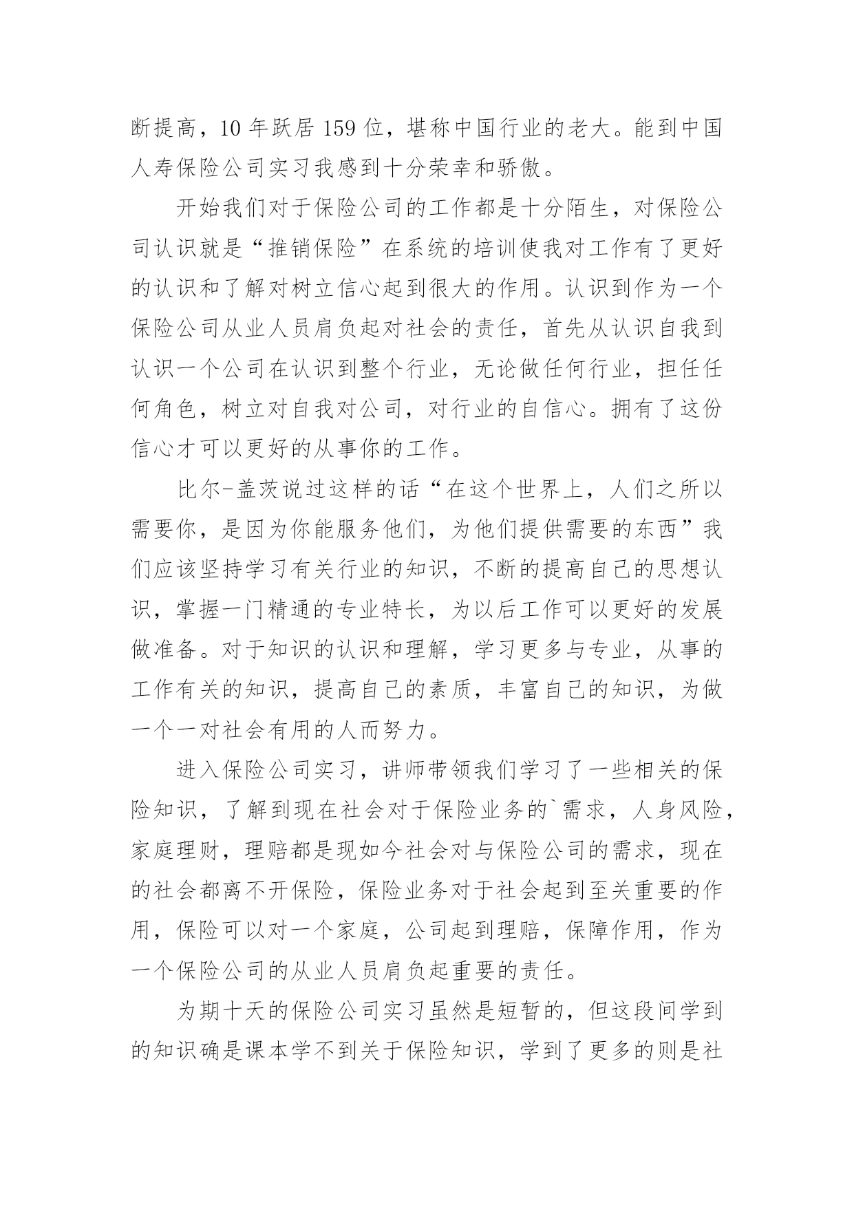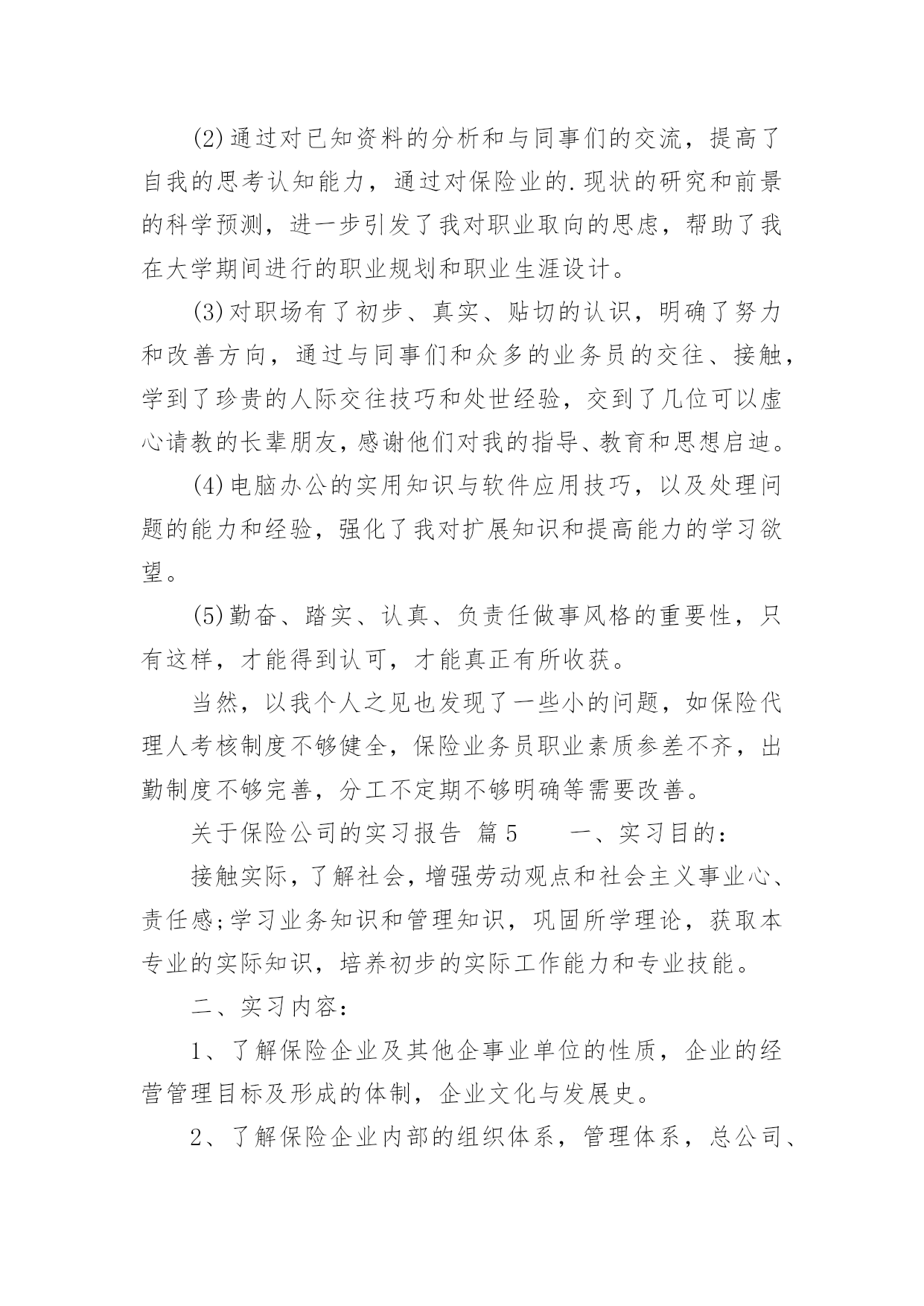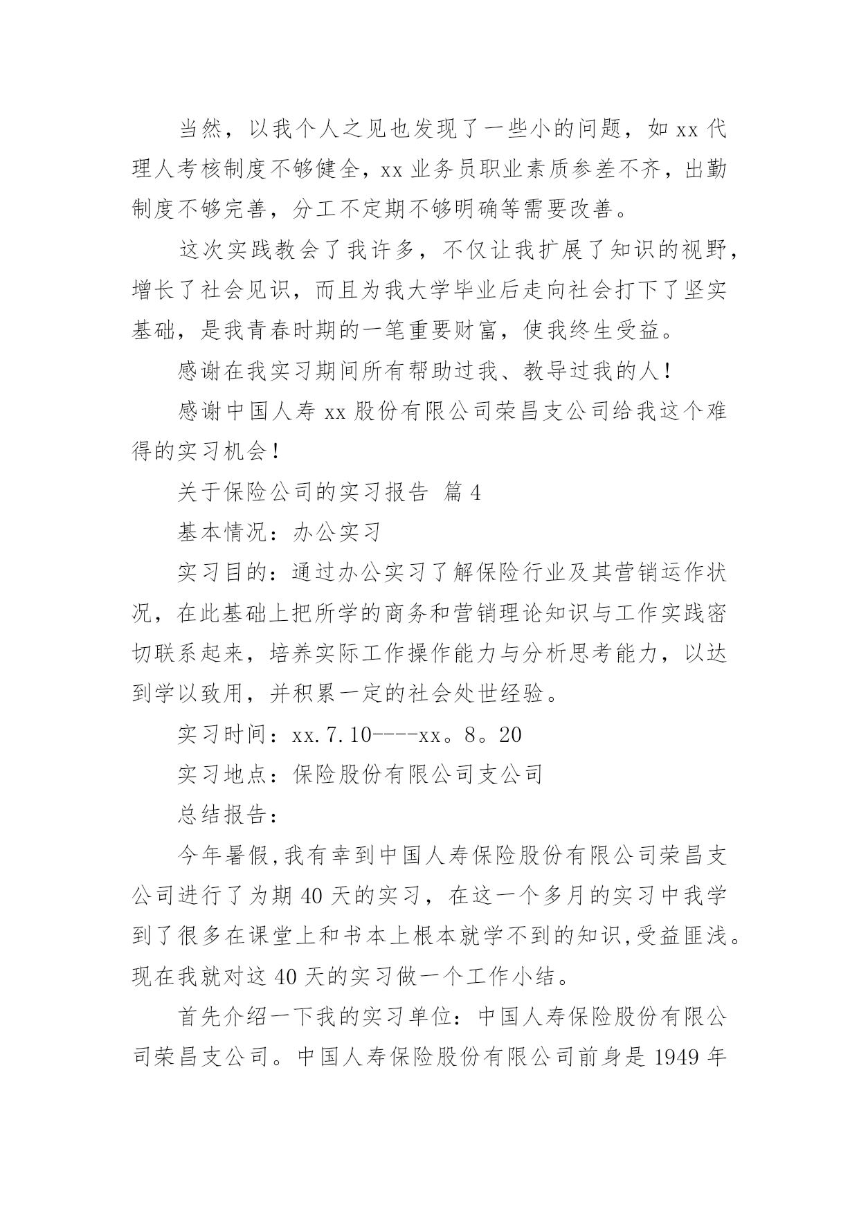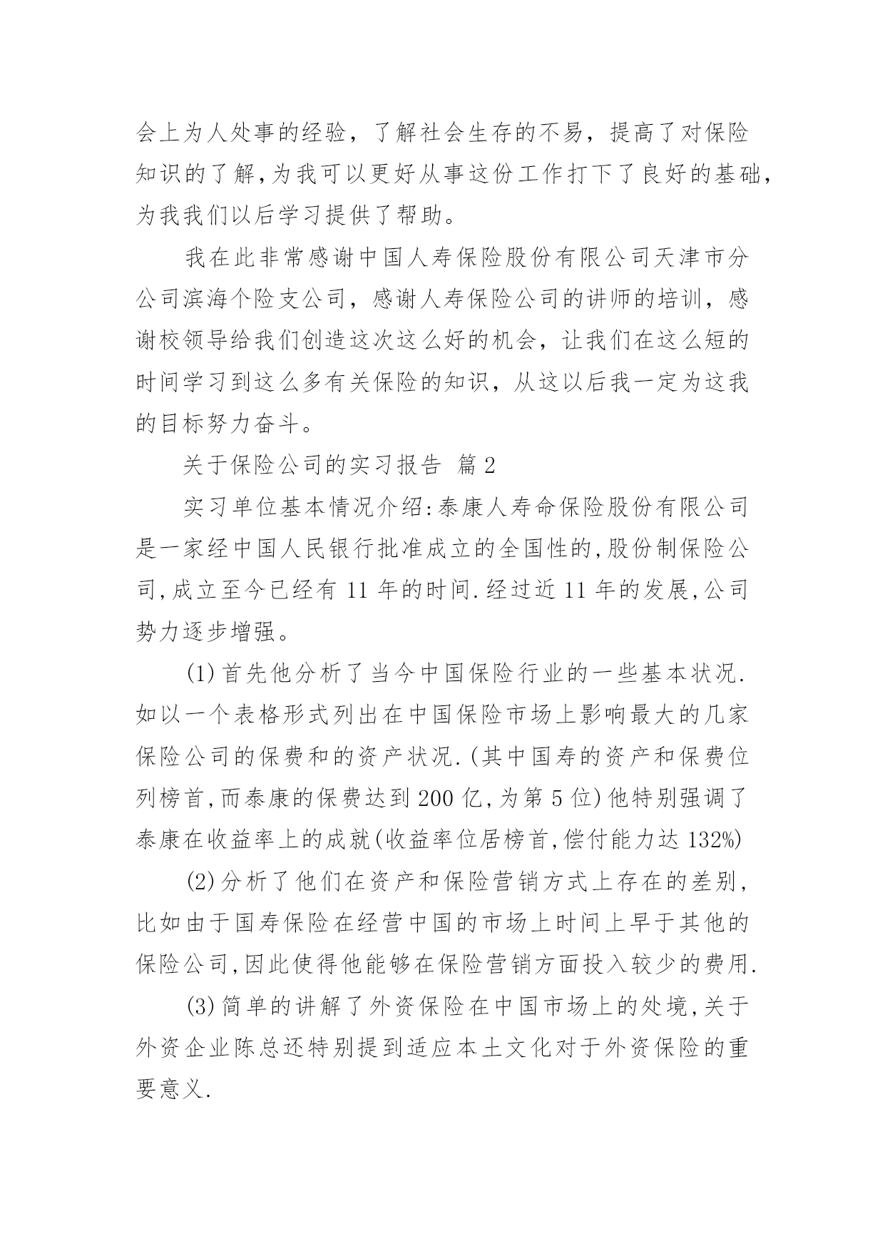 保险公司的实习报告关于保险公司的实习报告随着个人素质的提升,报告十分的重要,报告具有语言陈述性的特点。那么大家知道标准正式的报告格式吗?下面是小编帮大家整理的关于保险公司的实习报告,供大家参考借鉴,希望可以帮助到有需要的朋友。关于保险公司的实习报告篇1为期十天的实习生活转眼间已经即将画上圆满的句号,在人寿保险公司这段期间,我们充分感受到人寿保险公司“诚信为本,稳健经营”的宗旨。体会了作为一个保险公司人员的酸甜苦辣,也了解了作为一名保险公司人员的工作身上肩负的重任。这次实习是我们步入社会迈出的第一步,第一次真正意义上的接触保险有关的知识,学习了解保险的各种业务,为我们以后可以从事这份职业打下良好的基础,在这期间不仅仅是理论知识更多的是自我综合素质方面的认识。最主要的是不仅让我学会了做事还教会了我如何做人,对培养我的工作意识和提高我的综合素质有着特殊的意义。我特此由衷的感谢学校领导及人寿保险给我们提供这么好的一次机会。中国人寿保险股份有限公司成立于1949年,是我国目前最大的保险公司,是我国保险行业的第一品牌,占领我国市场份额的1/2,是我国寿险市场的领导者,多年以“成己为人,成人达己”的理念服务人群,在全世界500强排名不断提高,10年跃居159位,堪称中国行业的老大。能到中国人寿保险公司实习我感到十分荣幸和骄傲。开始我们对于保险公司的工作都是十分陌生,对保险公司认识就是“推销保险”在系统的培训使我对工作有了更好的认识和了解对树立信心起到很大的作用。认识到作为一个保险公司从业人员肩负起对社会的责任,首先从认识自我到认识一个公司在认识到整个行业,无论做任何行业,担任任何角色,树立对自我对公司,对行业的自信心。拥有了这份信心才可以更好的从事你的工作。比尔-盖茨说过这样的话“在这个世界上,人们之所以需要你,是因为你能服务他们,为他们提供需要的东西”我们应该坚持学习有关行业的知识,不断的提高自己的思想认识,掌握一门精通的专业特长,为以后工作可以更好的发展做准备。对于知识的认识和理解,学习更多与专业,从事的工作有关的知识,提高自己的素质,丰富自己的知识,为做一个一对社会有用的人而努力。进入保险公司实习,讲师带领我们学习了一些相关的保险知识,了解到现在社会对于保险业务的`需求,人身风险,家庭理财,理赔都是现如今社会对与保险公司的需求,现在的社会都离不开保险,保险业务对于社会起到至关重要的作用,保险可以对一个家庭,公司起到理赔,保障作用,作为一个保险公司的从业人员肩负起重要的责任。为期十天的保险公司实习虽然是短暂的,但这段间学到的知识确是课本学不到关于保险知识,学到了更多的则是社会上为人处事的经验,了解社会生存的不易,提高了对保险知识的了解,为我可以更好从事这份工作打下了良好的基础,为我我们以后学习提供了帮助。我在此非常感谢中国人寿保险股份有限公司天津市分公司滨海个险支公司,感谢人寿保险公司的讲师的培训,感谢校领导给我们创造这次这么好的机会,让我们在这么短的时间学习到这么多有关保险的知识,从这以后我一定为这我的目标努力奋斗。关于保险公司的实习报告篇2实习单位基本情况介绍:泰康人寿命保险股份有限公司是一家经中国人民银行批准成立的全国性的,股份制保险公司,成立至今已经有11年的时间.经过近11年的发展,公司势力逐步增强。(1)首先他分析了当今中国保险行业的一些基本状况.如以一个表格形式列出在中国保险市场上影响最大的几家保险公司的保费和的资产状况.(其中国寿的资产和保费位列榜首,而泰康的保费达到200亿,为第5位)他特别强调了泰康在收益率上的成就(收益率位居榜首,偿付能力达132%)(2)分析了他们在资产和保险营销方式上存在的差别,比如由于国寿保险在经营中国的市场上时间上早于其他的保险公司,因此使得他能够在保险营销方面投入较少的费用.(3)简单的讲解了外资保险在中国市场上的处境,关于外资企业陈总还特别提到适应本土文化对于外资保险的重要意义.(4)讲到目前中国保险行业和世界先进水平的差距.尤其是和日本和瑞士等国家的差距,如在日本每人有几分保单,而在中国每一百人中只有数十人卖友保险;而在瑞士对于保险行业的重视程度和中国存在的差别.但我们也了解到随着中国加入WTO,中国保险市场将对外开放,市场前景广阔.保险公司的偿付能力是什么保险公司的偿付能力的指保险公司对其承担的风险在发生超出正常年景的赔付款时的经济补偿能力.保险风险的随机性决定了保险损失的不确定性,从而对保险公司的偿付能力影响很大.如果保险公司的.偿付能力不足,人总行可以按照保险公司偿付比率差额,采取具体的措施.关于营销观念及行为的转变.其营销观念从传统的产品导向转变到客户导向,也就是从过去注重产品种类和功能的介绍转变到了解并满足客户需求的一个阶段.而要实现这种转变就需要对于客户的需求作出详细的