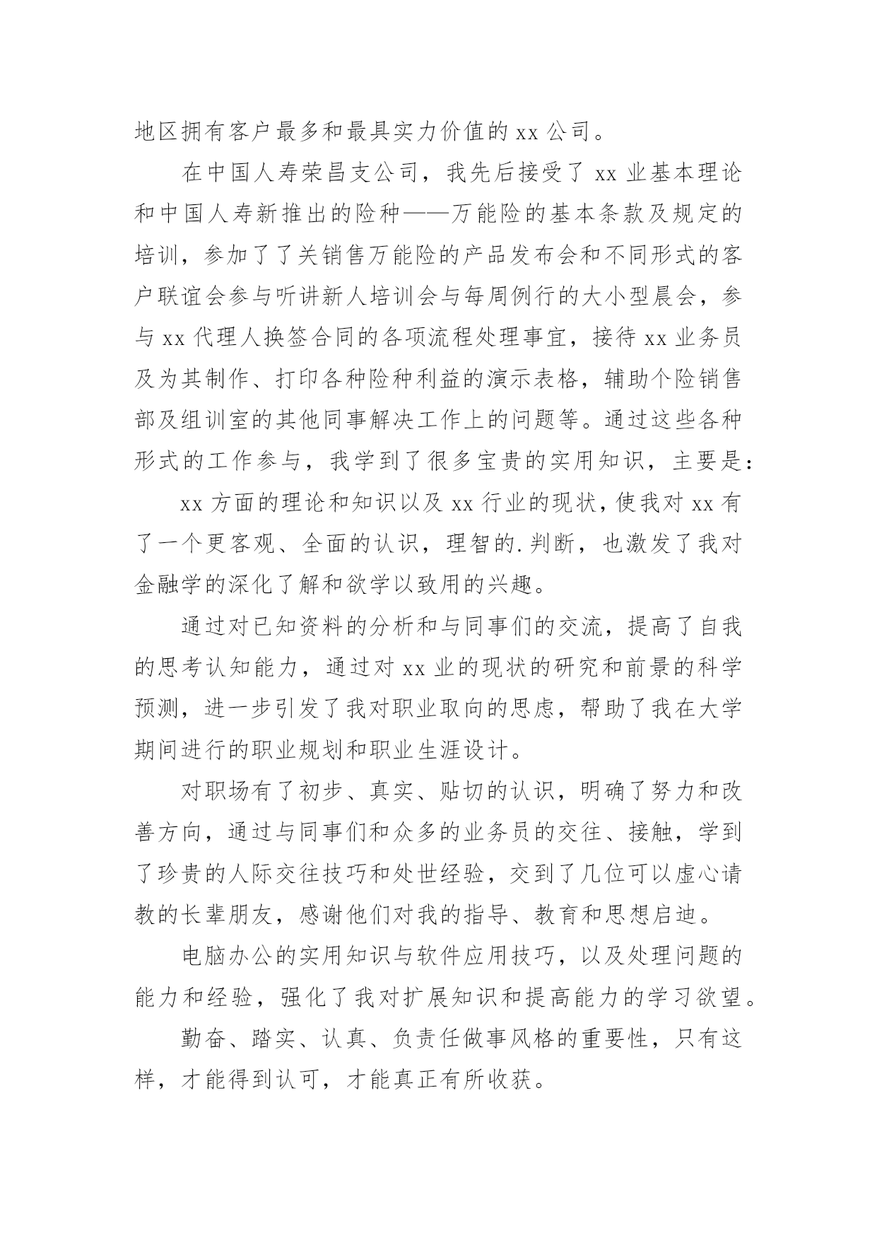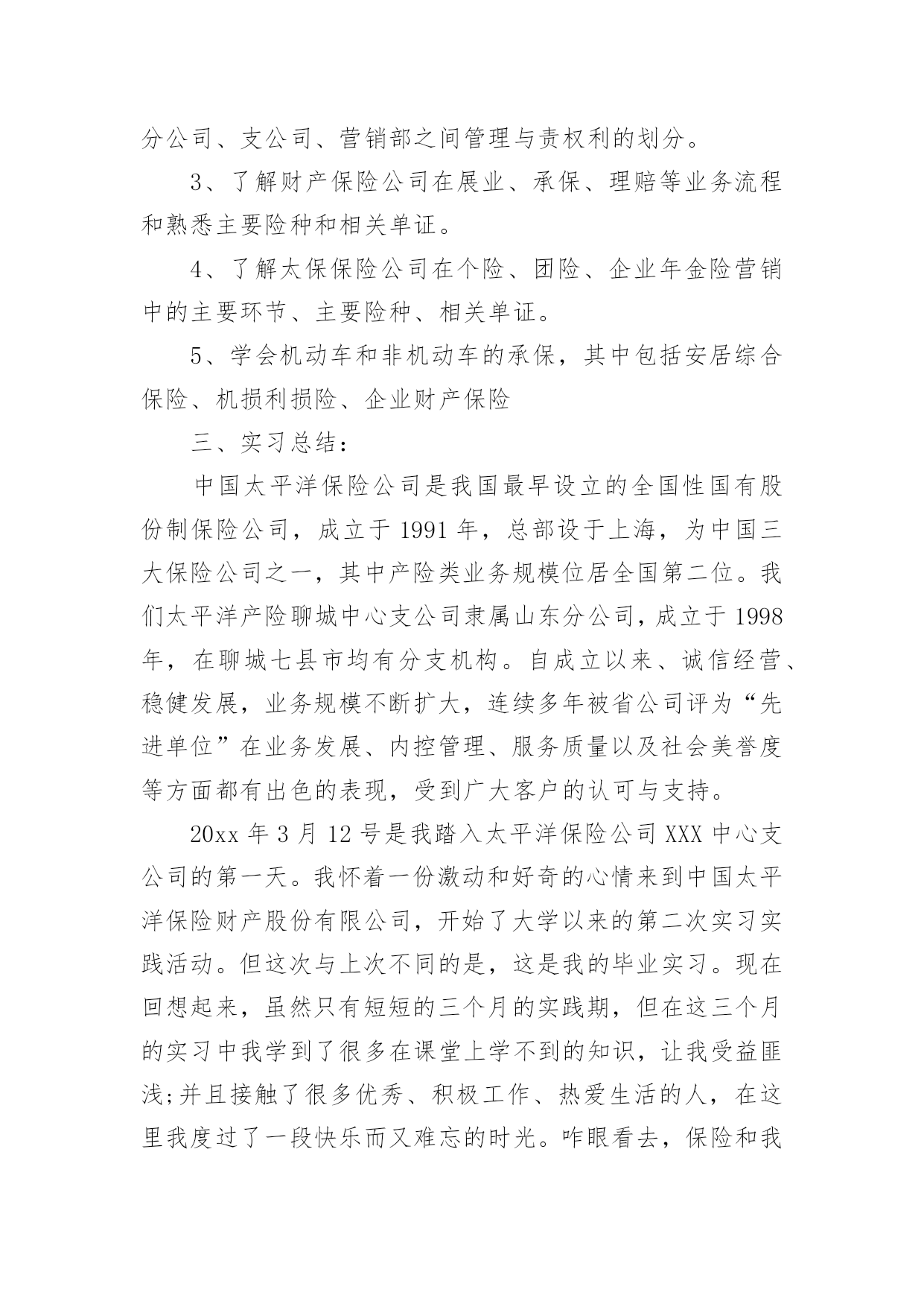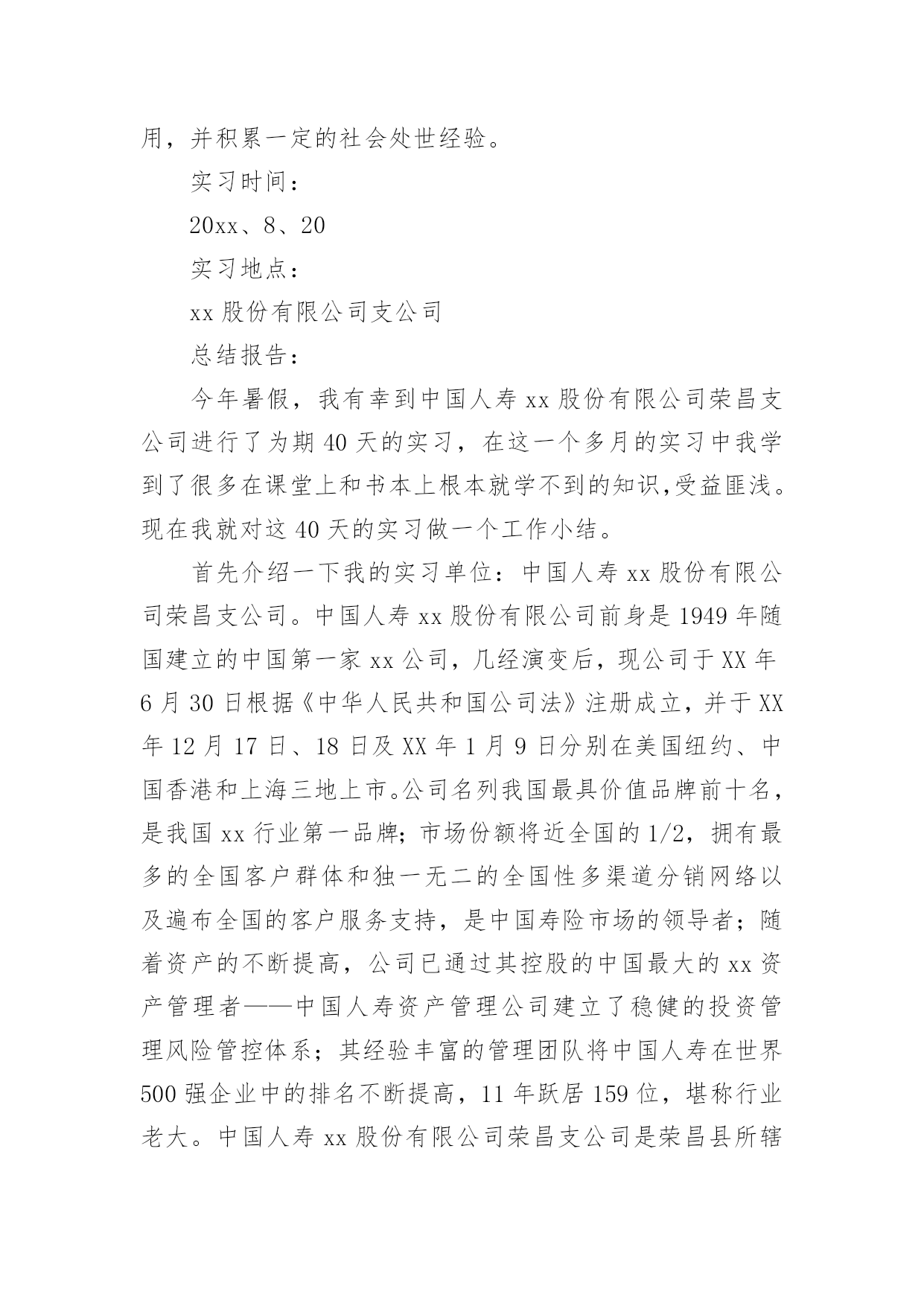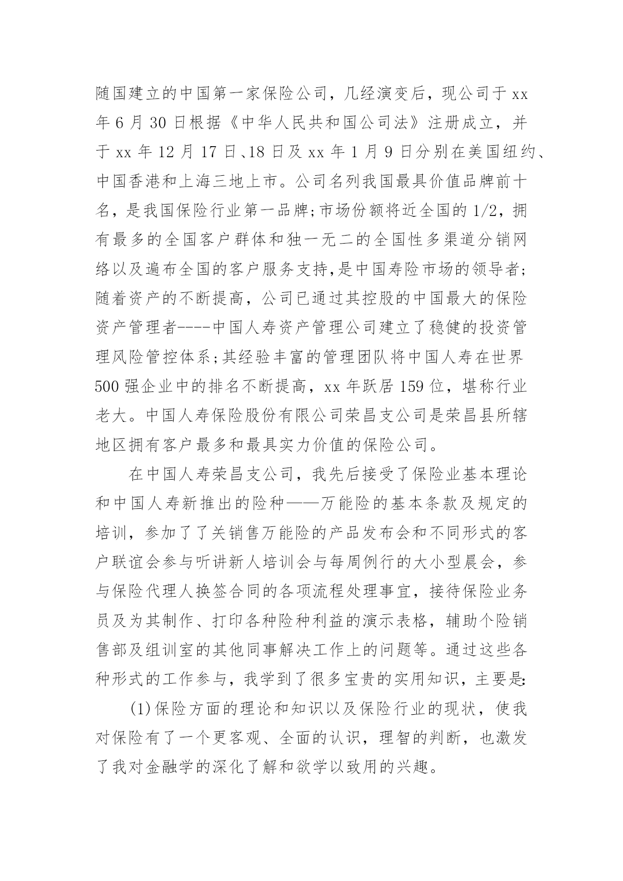 保险公司的实习报告关于保险公司的实习报告随着个人素质的提升,报告十分的重要,报告具有语言陈述性的特点。那么大家知道标准正式的报告格式吗?下面是小编帮大家整理的关于保险公司的实习报告,供大家参考借鉴,希望可以帮助到有需要的朋友。关于保险公司的实习报告篇1为期十天的实习生活转眼间已经即将画上圆满的句号,在人寿保险公司这段期间,我们充分感受到人寿保险公司“诚信为本,稳健经营”的宗旨。体会了作为一个保险公司人员的酸甜苦辣,也了解了作为一名保险公司人员的工作身上肩负的重任。这次实习是我们步入社会迈出的第一步,第一次真正意义上的接触保险有关的知识,学习了解保险的各种业务,为我们以后可以从事这份职业打下良好的基础,在这期间不仅仅是理论知识更多的是自我综合素质方面的认识。最主要的是不仅让我学会了做事还教会了我如何做人,对培养我的工作意识和提高我的综合素质有着特殊的意义。我特此由衷的感谢学校领导及人寿保险给我们提供这么好的一次机会。中国人寿保险股份有限公司成立于1949年,是我国目前最大的保险公司,是我国保险行业的第一品牌,占领我国市场份额的1/2,是我国寿险市场的领导者,多年以“成己为人,成人达己”的理念服务人群,在全世界500强排名不断提高,10年跃居159位,堪称中国行业的老大。能到中国人寿保险公司实习我感到十分荣幸和骄傲。开始我们对于保险公司的工作都是十分陌生,对保险公司认识就是“推销保险”在系统的培训使我对工作有了更好的认识和了解对树立信心起到很大的作用。认识到作为一个保险公司从业人员肩负起对社会的责任,首先从认识自我到认识一个公司在认识到整个行业,无论做任何行业,担任任何角色,树立对自我对公司,对行业的自信心。拥有了这份信心才可以更好的从事你的工作。比尔-盖茨说过这样的话“在这个世界上,人们之所以需要你,是因为你能服务他们,为他们提供需要的东西”我们应该坚持学习有关行业的知识,不断的提高自己的思想认识,掌握一门精通的专业特长,为以后工作可以更好的发展做准备。对于知识的认识和理解,学习更多与专业,从事的工作有关的知识,提高自己的素质,丰富自己的知识,为做一个一对社会有用的人而努力。进入保险公司实习,讲师带领我们学习了一些相关的保险知识,了解到现在社会对于保险业务的`需求,人身风险,家庭理财,理赔都是现如今社会对与保险公司的需求,现在的社会都离不开保险,保险业务对于社会起到至关重要的作用,保险可以对一个家庭,公司起到理赔,保障作用,作为一个保险公司的从业人员肩负起重要的责任。为期十天的保险公司实习虽然是短暂的,但这段间学到的知识确是课本学不到关于保险知识,学到了更多的则是社会上为人处事的经验,了解社会生存的不易,提高了对保险知识的了解,为我可以更好从事这份工作打下了良好的基础,为我我们以后学习提供了帮助。我在此非常感谢中国人寿保险股份有限公司天津市分公司滨海个险支公司,感谢人寿保险公司的讲师的培训,感谢校领导给我们创造这次这么好的机会,让我们在这么短的时间学习到这么多有关保险的知识,从这以后我一定为这我的目标努力奋斗。关于保险公司的实习报告篇2实习单位基本情况介绍:泰康人寿命保险股份有限公司是一家经中国人民银行批准成立的全国性的,股份制保险公司,成立至今已经有11年的时间.经过近11年的发展,公司势力逐步增强。(1)首先他分析了当今中国保险行业的一些基本状况.如以一个表格形式列出在中国保险市场上影响最大的几家保险公司的保费和的资产状况.(其中国寿的资产和保费位列榜首,而泰康的保费达到200亿,为第5位)他特别强调了泰康在收益率上的成就(收益率位居榜首,偿付能力达132%)(2)分析了他们在资产和保险营销方式上存在的差别,比如由于国寿保险在经营中国的市场上时间上早于其他的保险公司,因此使得他能够在保险营销方面投入较少的费用.(3)简单的讲解了外资保险在中国市场上的处境,关于外资企业陈总还特别提到适应本土文化对于外资保险的重要意义.(4)讲到目前中国保险行业和世界先进水平的差距.尤其是和日本和瑞士等国家的差距,如在日本每人有几分保单,而在中国每一百人中只有数十人卖友保险;而在瑞士对于保险行业的重视程度和中国存在的差别.但我们也了解到随着中国加入WTO,中国保险市场将对外开放,市场前景广阔.保险公司的偿付能力是什么保险公司的偿付能力的指保险公司对其承担的风险在发生超出正常年景的赔付款时的经济补偿能力.保险风险的随机性决定了保险损失的不确定性,从而对保险公司的偿付能力影响很大.如果保险公司的.偿付能力不足,人总行可以按照保险公司偿付比率差额,采取具体的措施.关于营销观念及行为的转变.其营销观念从传统的产品导向转变到客户导向,也就是从过去注重产品种类和功能的介绍转变到了解并满足客户需求的一个阶段.而要实现这种转变就需要对于客户的需求作出详细的