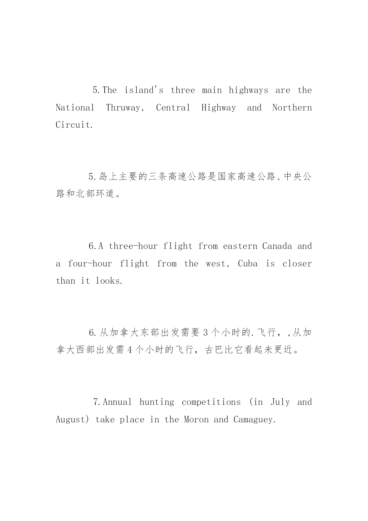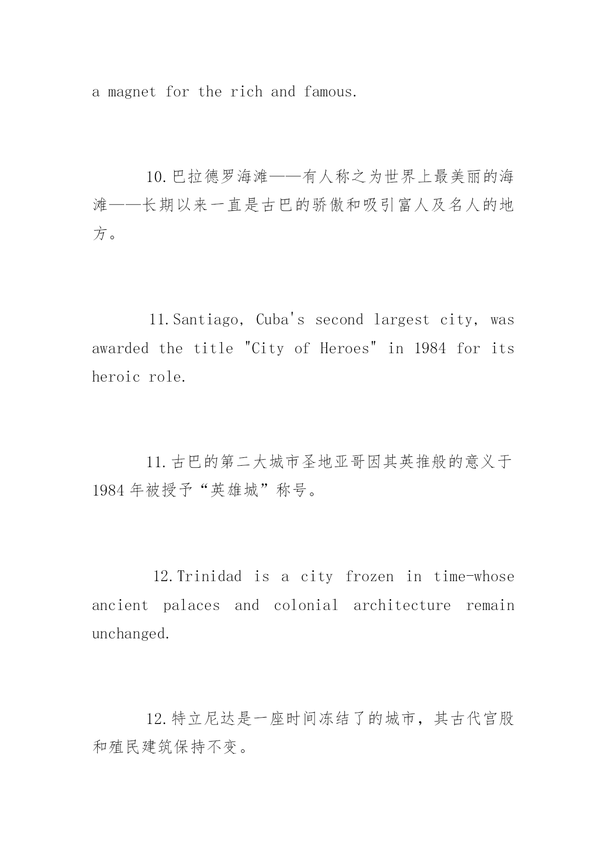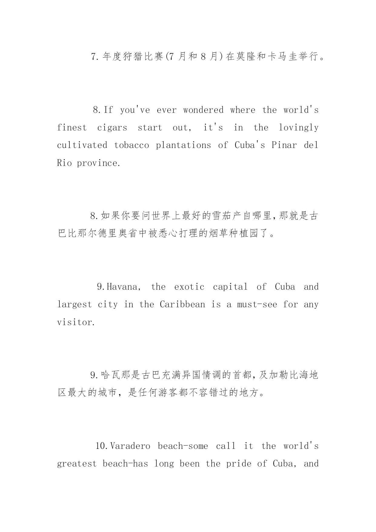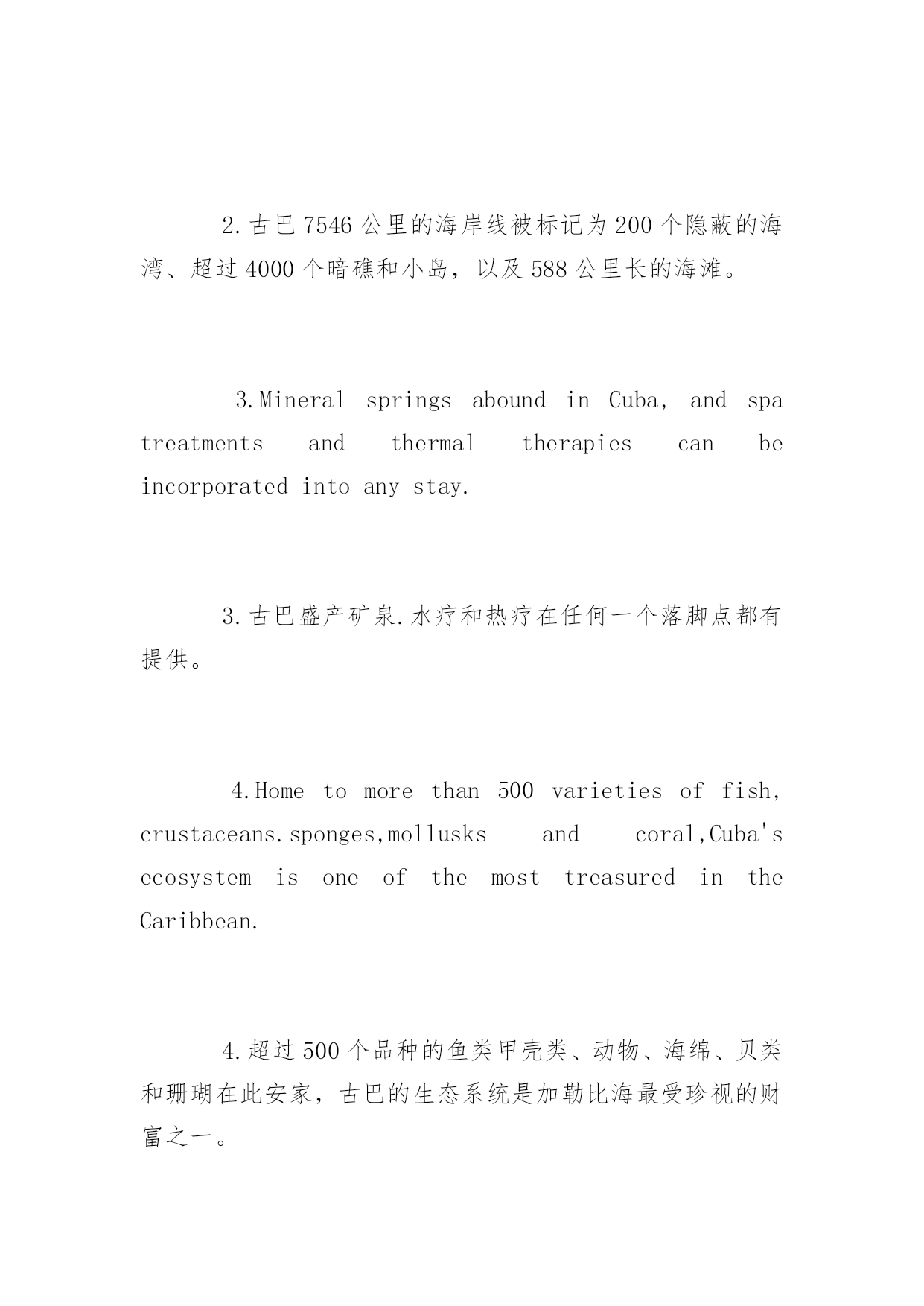 古巴旅游英语口语古巴是北美洲加勒比海北部的群岛国家,哈瓦那是古巴的经济、政治中心和首都。下面是小编整理的去古巴旅游的英语口语,希望能帮到大家!1.AmongCuba'scountlessgemstherearetheworld'ssmallestfrog(Eleutherodactyluslimbatus,only12millimetreslong)andtiniestbird(Mellisugahelenae-thebeehummingbird,some63millimetreslong).1.在古巴的无数珍宝中.有世界最小的青蛙,(黄纹侏儒蛙,只有12毫米长)和最小的鸟(吸蜂蜜鸟,大约63毫米长)。2.Cuba's5,746-kilometrecoastlineismarkedby200shelteredbays,morethan4,000keysandisletsand588kilometersofbeach.2.古巴7546公里的海岸线被标记为200个隐蔽的海湾、超过4000个暗礁和小岛,以及588公里长的海滩。3.MineralspringsaboundinCuba,andspatreatmentsandthermaltherapiescanbeincorporatedintoanystay.3.古巴盛产矿泉.水疗和热疗在任何一个落脚点都有提供。4.Hometomorethan500varietiesoffish,crustaceans.sponges,mollusksandcoral,Cuba'secosystemisoneofthemosttreasuredintheCaribbean.4.超过500个品种的鱼类甲壳类、动物、海绵、贝类和珊瑚在此安家,古巴的生态系统是加勒比海最受珍视的财富之一。5.Theisland'sthreemainhighwaysaretheNationalThruway,CentralHighwayandNorthernCircuit.5.岛上主要的三条高速公路是国家高速公路、中央公路和北部环道。6.Athree-hourflightfromeasternCanadaandafour-hourflightfromthewest,Cubaiscloserthanitlooks.6.从加拿大东部出发需要3个小时的.飞行,,从加拿大西部出发需4个小时的飞行,古巴比它看起未更近。7.Annualhuntingcompetitions(inJulyandAugust)takeplaceintheMoronandCamaguey.7.年度狩猎比赛(7月和8月)在莫隆和卡马圭举行。8.Ifyou'veeverwonderedwheretheworld'sfinestcigarsstartout,it'sinthelovinglycultivatedtobaccoplantationsofCuba'sPinardelRioprovince.8.如果你要问世界上最好的雪茄产自哪里,那就是古巴比那尔德里奥省中被悉心打理的烟草种植园了。9.Havana,theexoticcapitalofCubaandlargestcityintheCaribbeanisamust-seeforanyvisitor.9.哈瓦那是古巴充满异国情调的首都,及加勒比海地区最大的城市,是任何游客都不容错过的地方。10.Varaderobeach-somecallittheworld'sgreatestbeach-haslongbeentheprideofCuba,andamagnetfortherichandfamous.10.巴拉德罗海滩——有人称之为世界上最美丽的海滩——长期以来一直是古巴的骄傲和吸引富人及名人的地方。11.Santiago,Cuba'ssecondlargestcity,wasawardedthetitle"CityofHeroes"in1984foritsheroicrole.11.古巴的第二大城市圣地亚哥因其英推般的意义于1984年被授予“英雄城”称号。12.Trinidadisacityfrozenintime-whoseancientpalacesandcolonialarchitectureremainunchanged.12.特立尼达是一座时间冻结了的城市,其古代宫股和殖民建筑保持不变。