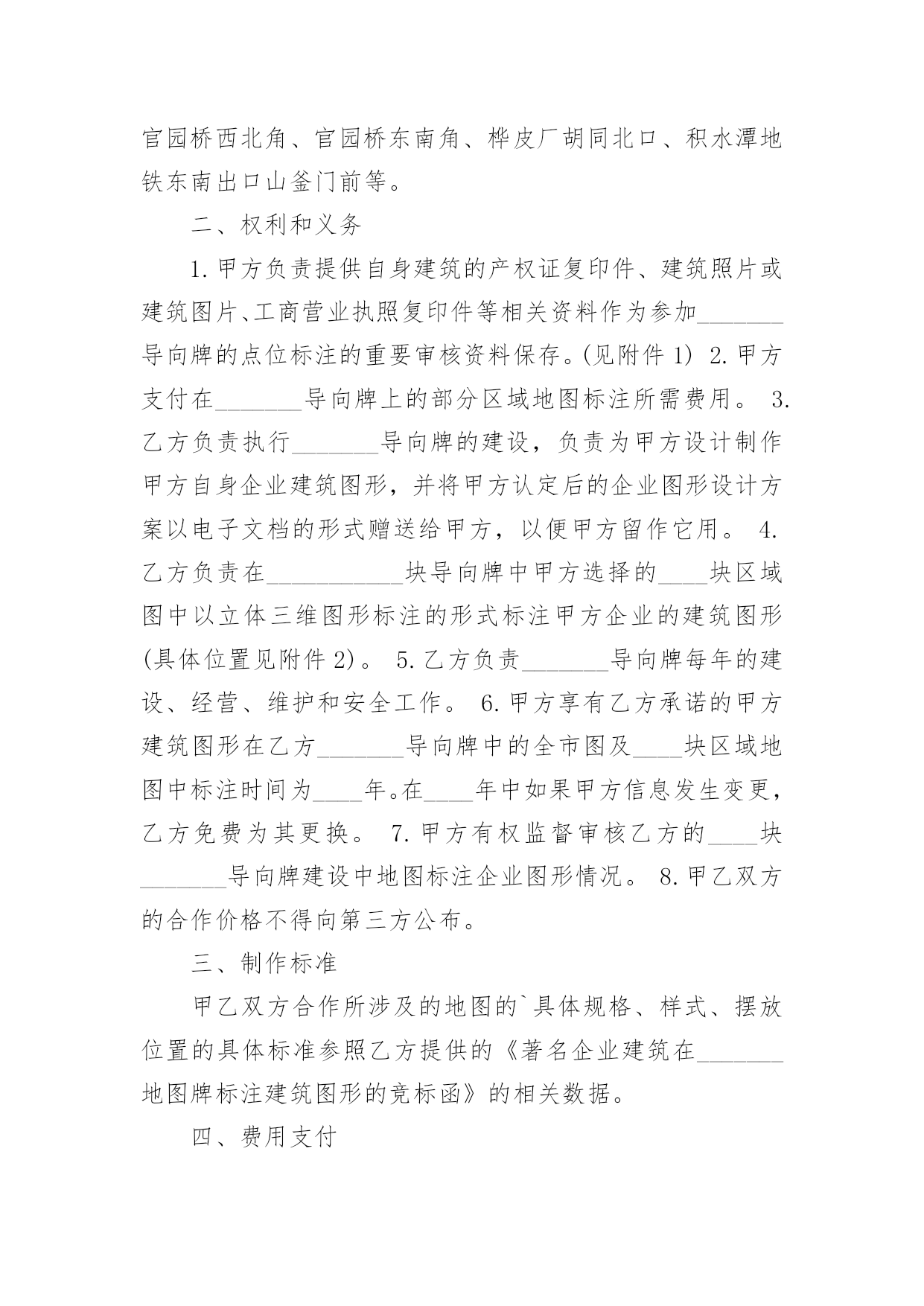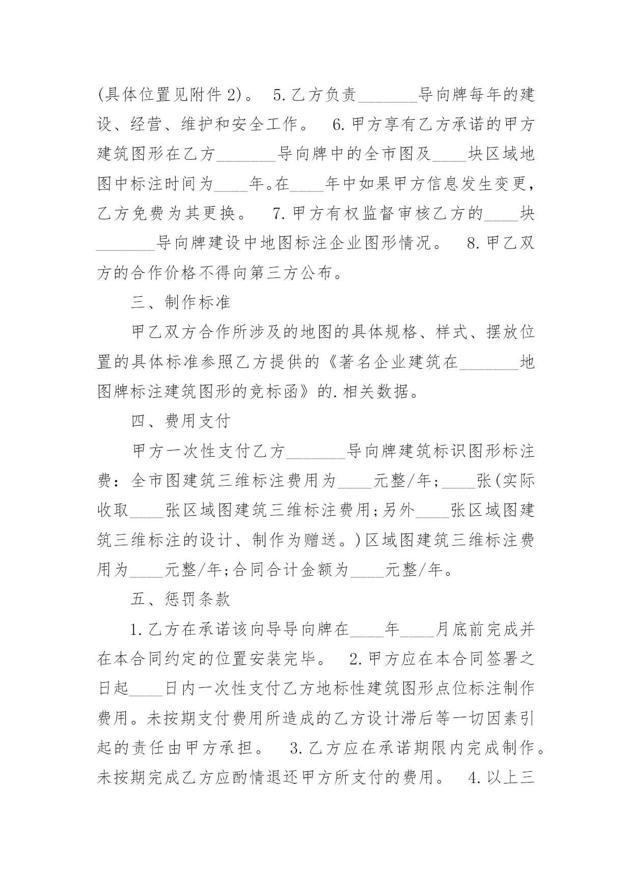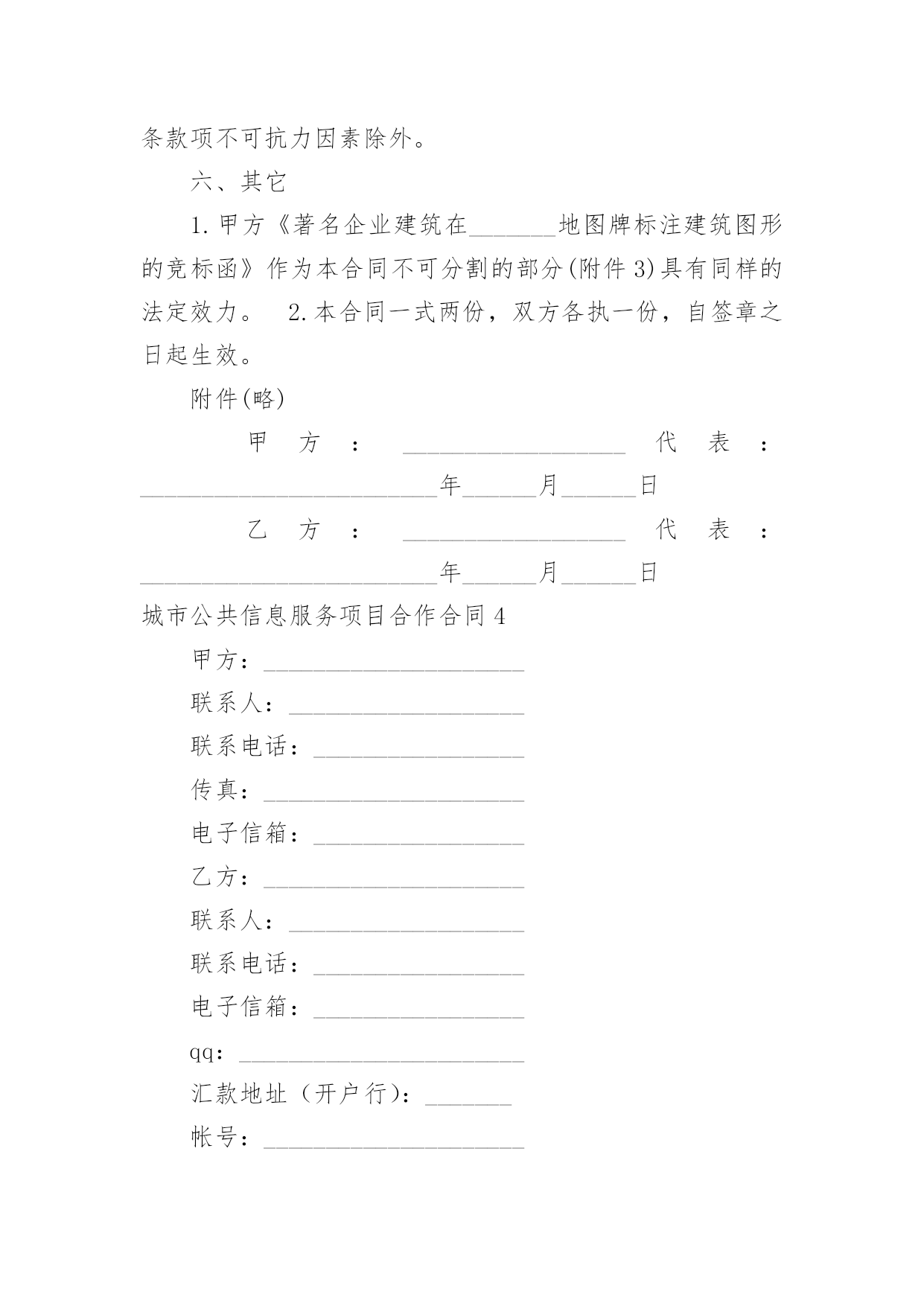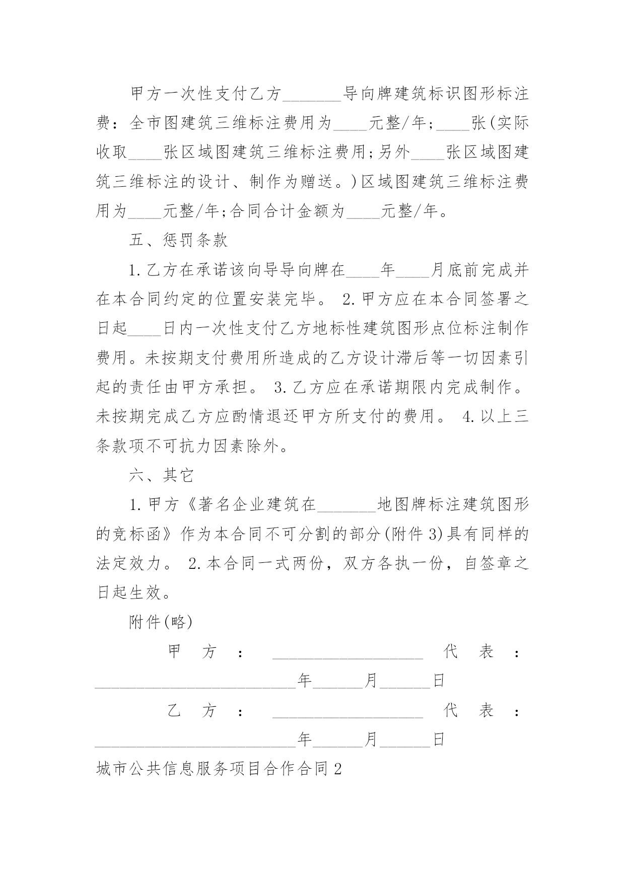 城市公共信息服务项目合作合同城市公共信息服务项目合作合同4篇在人们越来越相信法律的社会中,关于合同的利益纠纷越来越多,签订合同能平衡双方当事人的平等地位。你所见过的合同是什么样的呢?下面是小编为大家收集的城市公共信息服务项目合作合同,希望对大家有所帮助。城市公共信息服务项目合作合同1甲方:_____________________地址:_____________________邮编:_____________________乙方:_____________________地址:_____________________邮编:_____________________“_______导向牌”项目是经北京市政管理委员会批准(字〔23〕第6号)由乙方负责建设的城市公共信息服务项目,甲乙双方就此项目合作达成如下协议:一、合作项目乙方同意甲方在乙方首期建设的____块(其中____块为赠送)_______导向牌全市及____张区域图上标注甲方企业图文建筑三维标注,具体合作内容如下:1.由乙方负责在其所属的____块城市向导导向牌全市图部分为甲方制作企业图文建筑三维标注。2.乙方负责在其所属的____块向导牌的区域地图部分为甲方作图文建筑三维标注,具体位置如下:西直门地铁出口、北京展览馆门前西侧、北京天文馆门前、官园桥西北角、官园桥东南角、桦皮厂胡同北口、积水潭地铁东南出口山釜门前等。二、权利和义务1.甲方负责提供自身建筑的产权证复印件、建筑照片或建筑图片、工商营业执照复印件等相关资料作为参加_______导向牌的点位标注的重要审核资料保存。(见附件1)2.甲方支付在_______导向牌上的部分区域地图标注所需费用。3.乙方负责执行_______导向牌的建设,负责为甲方设计制作甲方自身企业建筑图形,并将甲方认定后的企业图形设计方案以电子文档的形式赠送给甲方,以便甲方留作它用。4.乙方负责在___________块导向牌中甲方选择的____块区域图中以立体三维图形标注的形式标注甲方企业的建筑图形(具体位置见附件2)。5.乙方负责_______导向牌每年的建设、经营、维护和安全工作。6.甲方享有乙方承诺的甲方建筑图形在乙方_______导向牌中的全市图及____块区域地图中标注时间为____年。在____年中如果甲方信息发生变更,乙方免费为其更换。7.甲方有权监督审核乙方的____块_______导向牌建设中地图标注企业图形情况。8.甲乙双方的合作价格不得向第三方公布。三、制作标准甲乙双方合作所涉及的地图的`具体规格、样式、摆放位置的具体标准参照乙方提供的《著名企业建筑在_______地图牌标注建筑图形的竞标函》的相关数据。四、费用支付甲方一次性支付乙方_______导向牌建筑标识图形标注费:全市图建筑三维标注费用为____元整/年;____张(实际收取____张区域图建筑三维标注费用;另外____张区域图建筑三维标注的设计、制作为赠送。)区域图建筑三维标注费用为____元整/年;合同合计金额为____元整/年。五、惩罚条款1.乙方在承诺该向导导向牌在____年____月底前完成并在本合同约定的位置安装完毕。2.甲方应在本合同签署之日起____日内一次性支付乙方地标性建筑图形点位标注制作费用。未按期支付费用所造成的乙方设计滞后等一切因素引起的责任由甲方承担。3.乙方应在承诺期限内完成制作。未按期完成乙方应酌情退还甲方所支付的费用。4.以上三条款项不可抗力因素除外。六、其它1.甲方《著名企业建筑在_______地图牌标注建筑图形的竞标函》作为本合同不可分割的部分(附件3)具有同样的法定效力。2.本合同一式两份,双方各执一份,自签章之日起生效。附件(略)甲方:__________________代表:________________________年______月______日乙方:__________________代表:________________________年______月______日城市公共信息服务项目合作合同2合同编号:甲方:地址:联系电话:乙方:地址:联系电话:为弘扬中华美食,甲乙双方经友好协商,就双方合作推广“__”事宜,达成如下协议,以资共同遵守。第一条:本协议中甲乙双方为各自独立的事业者,双方之间不存在任何(包括但不限于共同投资、代理、雇佣、承包)关系。第二条:本协议任何一方不具有代行对方任何行为的权利。任何一方的职员不是对方的雇员,也不是对方的代理人。任何一方对对方及其劳动关系和员工行为不承担任何责任。第三条:双方进行合作,甲方必须满足如下条件:1、认同格兰仕文化;2、能按照双方商定的装修方案进行装修,能按照乙方的要求制作门头、灯箱、喷绘等广告设施。3、能提供符合国家法律、法规、规章要求的开店手续和证明。第四条: