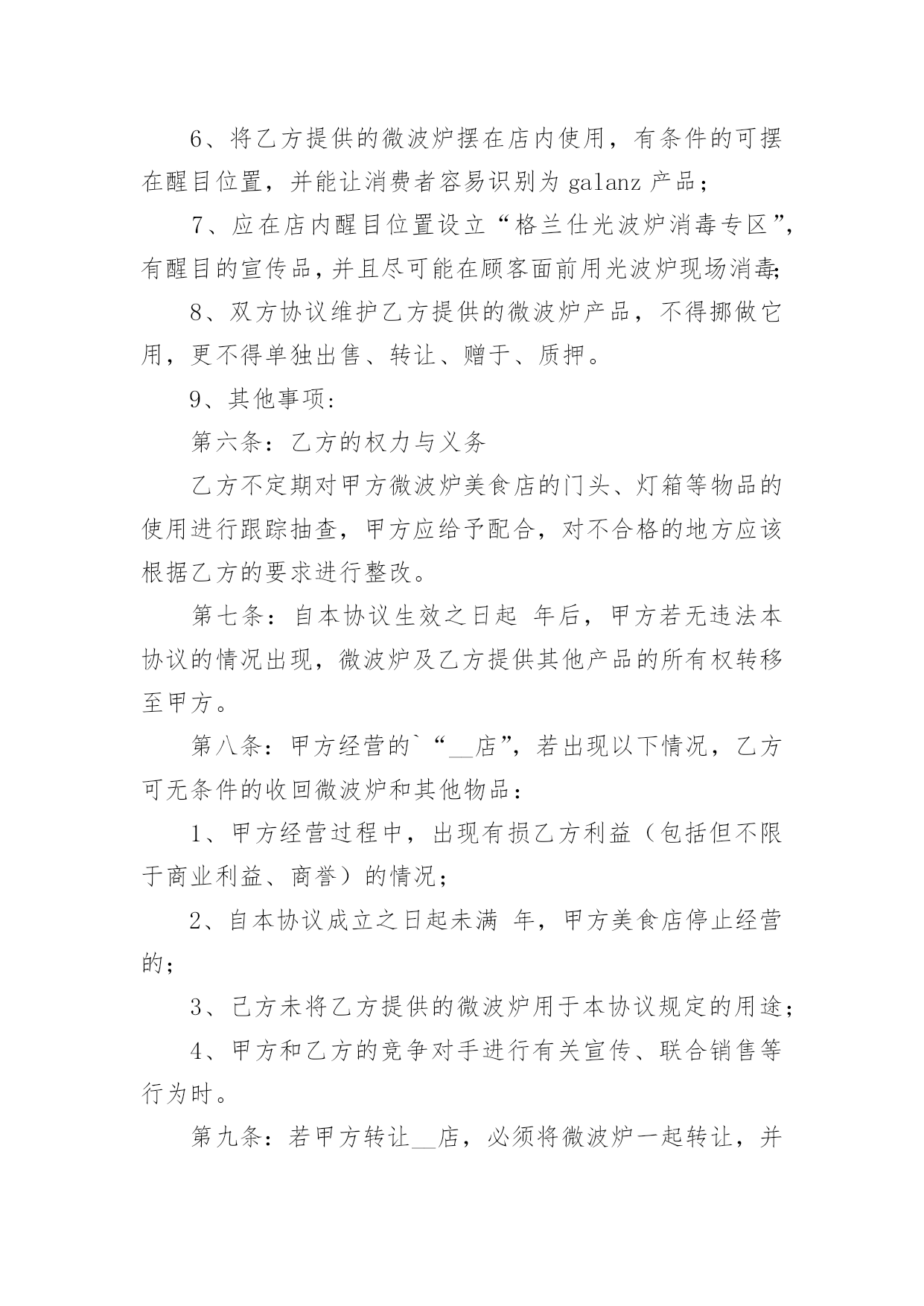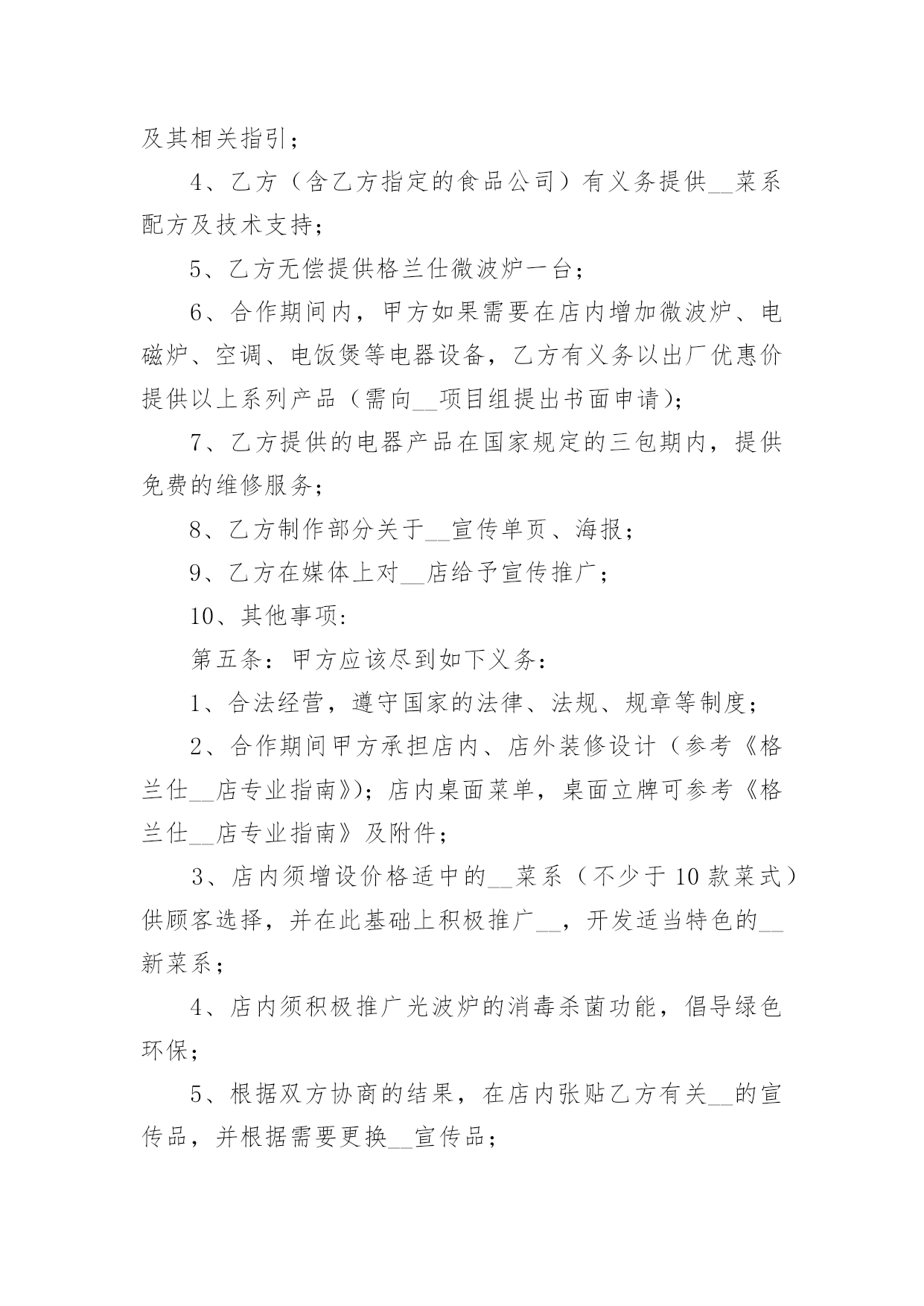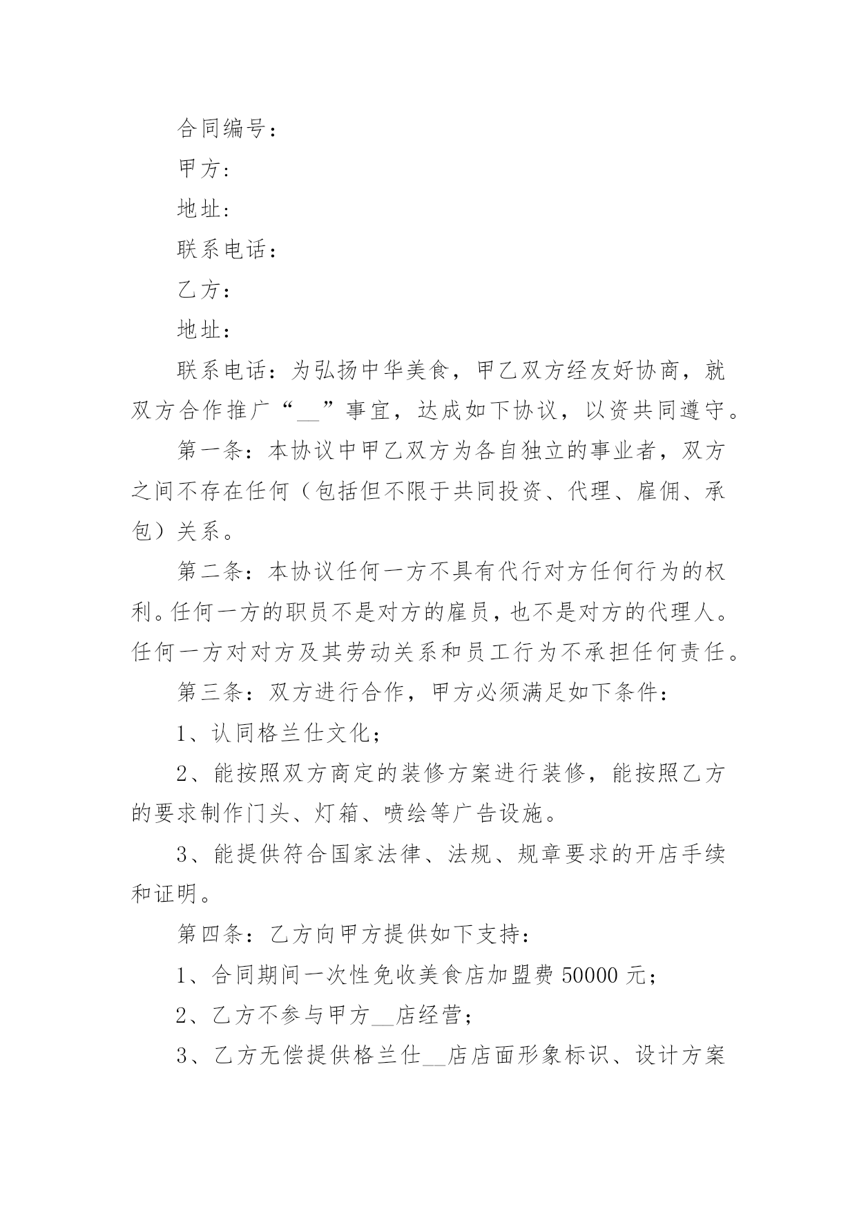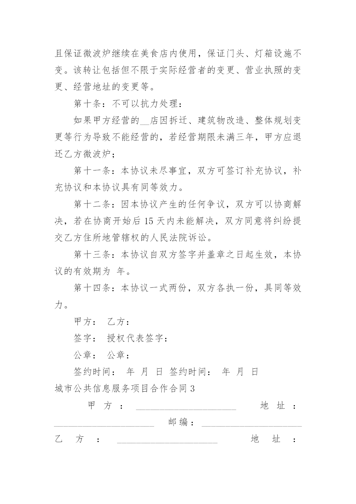 城市公共信息服务项目合作合同城市公共信息服务项目合作合同4篇在人们越来越相信法律的社会中,关于合同的利益纠纷越来越多,签订合同能平衡双方当事人的平等地位。你所见过的合同是什么样的呢?下面是小编为大家收集的城市公共信息服务项目合作合同,希望对大家有所帮助。城市公共信息服务项目合作合同1甲方:_____________________地址:_____________________邮编:_____________________乙方:_____________________地址:_____________________邮编:_____________________“_______导向牌”项目是经北京市政管理委员会批准(字〔23〕第6号)由乙方负责建设的城市公共信息服务项目,甲乙双方就此项目合作达成如下协议:一、合作项目乙方同意甲方在乙方首期建设的____块(其中____块为赠送)_______导向牌全市及____张区域图上标注甲方企业图文建筑三维标注,具体合作内容如下:1.由乙方负责在其所属的____块城市向导导向牌全市图部分为甲方制作企业图文建筑三维标注。2.乙方负责在其所属的____块向导牌的区域地图部分为甲方作图文建筑三维标注,具体位置如下:西直门地铁出口、北京展览馆门前西侧、北京天文馆门前、官园桥西北角、官园桥东南角、桦皮厂胡同北口、积水潭地铁东南出口山釜门前等。二、权利和义务1.甲方负责提供自身建筑的产权证复印件、建筑照片或建筑图片、工商营业执照复印件等相关资料作为参加_______导向牌的点位标注的重要审核资料保存。(见附件1)2.甲方支付在_______导向牌上的部分区域地图标注所需费用。3.乙方负责执行_______导向牌的建设,负责为甲方设计制作甲方自身企业建筑图形,并将甲方认定后的企业图形设计方案以电子文档的形式赠送给甲方,以便甲方留作它用。4.乙方负责在___________块导向牌中甲方选择的____块区域图中以立体三维图形标注的形式标注甲方企业的建筑图形(具体位置见附件2)。5.乙方负责_______导向牌每年的建设、经营、维护和安全工作。6.甲方享有乙方承诺的甲方建筑图形在乙方_______导向牌中的全市图及____块区域地图中标注时间为____年。在____年中如果甲方信息发生变更,乙方免费为其更换。7.甲方有权监督审核乙方的____块_______导向牌建设中地图标注企业图形情况。8.甲乙双方的合作价格不得向第三方公布。三、制作标准甲乙双方合作所涉及的地图的`具体规格、样式、摆放位置的具体标准参照乙方提供的《著名企业建筑在_______地图牌标注建筑图形的竞标函》的相关数据。四、费用支付甲方一次性支付乙方_______导向牌建筑标识图形标注费:全市图建筑三维标注费用为____元整/年;____张(实际收取____张区域图建筑三维标注费用;另外____张区域图建筑三维标注的设计、制作为赠送。)区域图建筑三维标注费用为____元整/年;合同合计金额为____元整/年。五、惩罚条款1.乙方在承诺该向导导向牌在____年____月底前完成并在本合同约定的位置安装完毕。2.甲方应在本合同签署之日起____日内一次性支付乙方地标性建筑图形点位标注制作费用。未按期支付费用所造成的乙方设计滞后等一切因素引起的责任由甲方承担。3.乙方应在承诺期限内完成制作。未按期完成乙方应酌情退还甲方所支付的费用。4.以上三条款项不可抗力因素除外。六、其它1.甲方《著名企业建筑在_______地图牌标注建筑图形的竞标函》作为本合同不可分割的部分(附件3)具有同样的法定效力。2.本合同一式两份,双方各执一份,自签章之日起生效。附件(略)甲方:__________________代表:________________________年______月______日乙方:__________________代表:________________________年______月______日城市公共信息服务项目合作合同2合同编号:甲方:地址:联系电话:乙方:地址:联系电话:为弘扬中华美食,甲乙双方经友好协商,就双方合作推广“__”事宜,达成如下协议,以资共同遵守。第一条:本协议中甲乙双方为各自独立的事业者,双方之间不存在任何(包括但不限于共同投资、代理、雇佣、承包)关系。第二条:本协议任何一方不具有代行对方任何行为的权利。任何一方的职员不是对方的雇员,也不是对方的代理人。任何一方对对方及其劳动关系和员工行为不承担任何责任。第三条:双方进行合作,甲方必须满足如下条件:1、认同格兰仕文化;2、能按照双方商定的装修方案进行装修,能按照乙方的要求制作门头、灯箱、喷绘等广告设施。3、能提供符合国家法律、法规、规章要求的开店手续和证明。第四条: