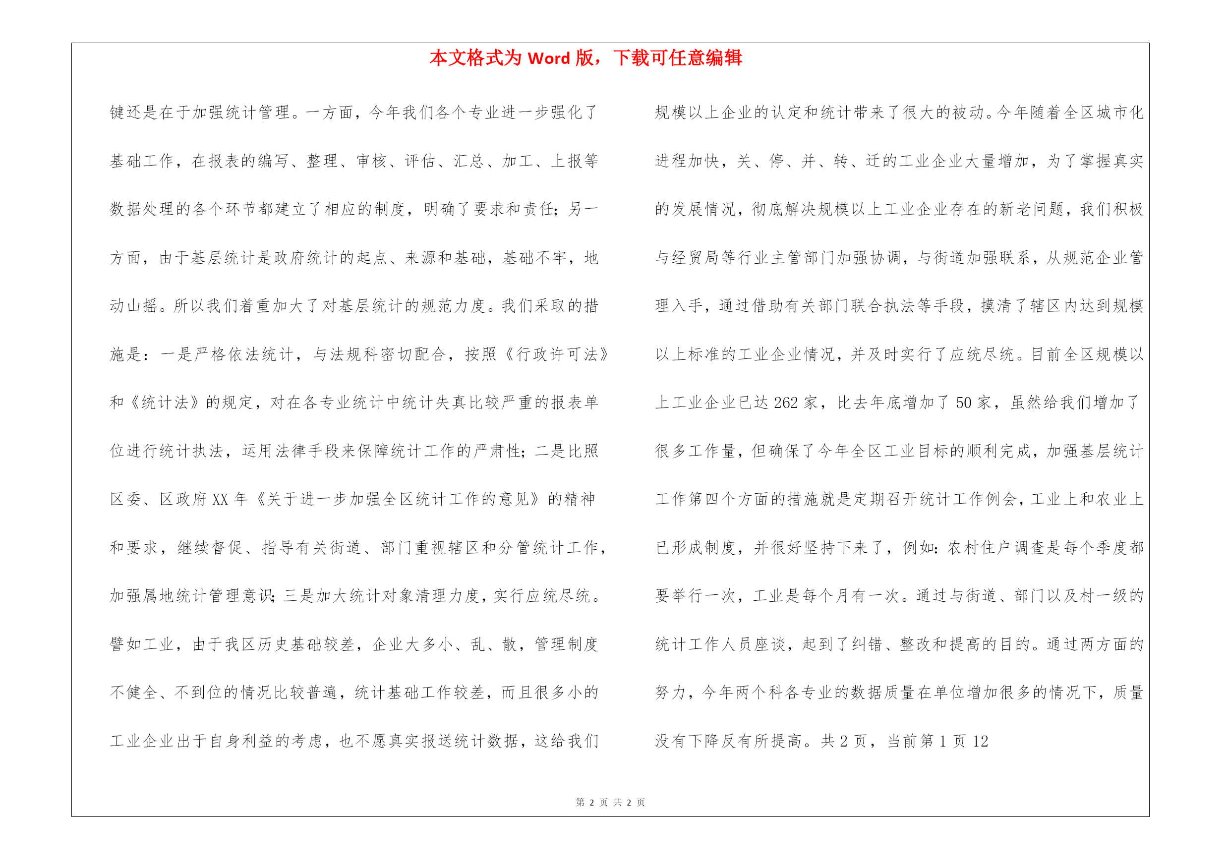 本文格式为Word版,下载可任意编辑第PAGE\*MERGEFORMAT2页共NUMPAGES\*MERGEFORMAT2页统计工作讲话_工商计生各位领导、统计战线的各位同仁:首先,我谨以个人的名义并代表区统计局专业一科、专业二科的全体同志对大家一年来对我们相关专业工作的支持表示诚挚的感谢,对大家付出的辛勤劳动表示由衷的敬意。我分管的专业一科和专业二科包括:农业、工业、批发和零售贸易业、住宿餐饮业、劳动工资等专业统计工作。在即将过去的XX年中,我们始终围绕区委、区政府的中心工作,以依法统计为基本点,以加强统计基础管理工作为出发点,以提高统计数据质量为着力点,以提供优质服务为着眼点,扎实工作,锐意进取,开拓创新,全面地完成了各项工作任务和既定的工作目标。在今年市局对全市各区(市)县的报表和专项工作考评中,上述专业共荣获三个一等奖、六个二等奖和一个三等奖。下面我就简要向大家介绍一下两个科完成的一些主要工作:一、积极参予并认真完成了有关专业经济普查工作经济普查是一项重要的国情、国力调查,涉及国民经济二、三产业的各个行业和门类,任务之艰巨前所未有。根据专业对口安排,一科和二科主要承担了工业、交通运输、邮电通信、批发零售业、住宿餐饮业的普查任务。这几个行业的普查对象共同特点是点多面广,门类众多,十分繁杂。我们两个科的同志在全区统一的安排和部署下,通过精心组织、周密运作,克服了重重困难,在坚持搞好常规统计业务的同时、全面、及时、准确地完成了上述行业的普查培训,指导、验收、审核、上报等任务。普查结果显示,这几个行业法人有4500个左右,个体户有接近四万户,光法人企业就占全区普查总数的60%左右。这对确保全区普查任务的顺利完成,摸清武侯的家庭起到了重要的作用。二、加强统计管理,规范统计行为,进一步提高报表质量统计数据质量是统计工作的生命线。要保证数据的客观真实,关键还是在于加强统计管理。一方面,今年我们各个专业进一步强化了基础工作,在报表的编写、整理、审核、评估、汇总、加工、上报等数据处理的各个环节都建立了相应的制度,明确了要求和责任;另一方面,由于基层统计是政府统计的起点、来源和基础,基础不牢,地动山摇。所以我们着重加大了对基层统计的规范力度。我们采取的措施是:一是严格依法统计,与法规科密切配合,按照《行政许可法》和《统计法》的规定,对在各专业统计中统计失真比较严重的报表单位进行统计执法,运用法律手段来保障统计工作的严肃性;二是比照区委、区政府XX年《关于进一步加强全区统计工作的意见》的精神和要求,继续督促、指导有关街道、部门重视辖区和分管统计工作,加强属地统计管理意识;三是加大统计对象清理力度,实行应统尽统。譬如工业,由于我区历史基础较差,企业大多小、乱、散,管理制度不健全、不到位的情况比较普遍,统计基础工作较差,而且很多小的工业企业出于自身利益的考虑,也不愿真实报送统计数据,这给我们规模以上企业的认定和统计带来了很大的被动。今年随着全区城市化进程加快,关、停、并、转、迁的工业企业大量增加,为了掌握真实的发展情况,彻底解决规模以上工业企业存在的新老问题,我们积极与经贸局等行业主管部门加强协调,与街道加强联系,从规范企业管理入手,通过借助有关部门联合执法等手段,摸清了辖区内达到规模以上标准的工业企业情况,并及时实行了应统尽统。目前全区规模以上工业企业已达262家,比去年底增加了50家,虽然给我们增加了很多工作量,但确保了今年全区工业目标的顺利完成,加强基层统计工作第四个方面的措施就是定期召开统计工作例会,工业上和农业上已形成制度,并很好坚持下来了,例如:农村住户调查是每个季度都要举行一次,工业是每个月有一次。通过与街道、部门以及村一级的统计工作人员座谈,起到了纠错、整改和提高的目的。通过两方面的努力,今年两个科各专业的数据质量在单位增加很多的情况下,质量没有下降反有所提高。,当前12