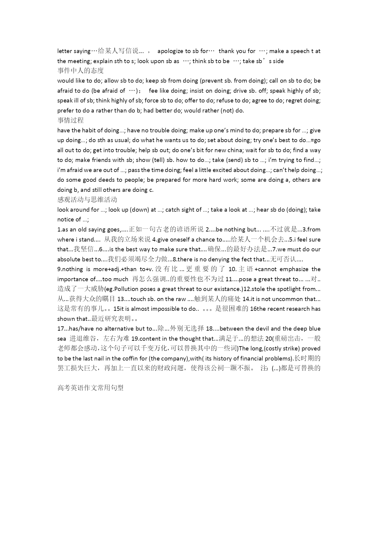 高考英语作文常用句型掌握常用在英语作文中的句型句式可以帮我们在高考作文中更流畅的写出好作文。下面是xx给大家带来的高考英语作文常用句型,欢迎大家阅读参考,我们一起来看看吧!高考英语作文常用句型1、Manypeopleinsistthat…很多人坚持认为……2、Withthedevelopmentofscienceandtechnology,moreandmorepeoplebelievethat…随着科技的发展,越来越多的人认为……3、Alotofpeopleseemtothinkthat…很多人似乎认为……4、Recently,theproblemof…hasarousedpeople#39;sconcern.最近,……问题已引起人们的关注.5、TheInternethasbeenplayinganincreasinglyimportantroleinourday-to-daylife.Ithasbroughtalotofbenefitsbuthascreatedsomeseriousproblemsaswell.互联网已在我们的生活中扮演着越来越重要的角色.它给我们带来了许多好处,但也产生了一些严重的问题.6、Nowadays,(overpopulation)hasbecomeaproblemwehavetoface.如今,(人口过剩)已成为我们不得不面对的问题了.7、Itiscommonlybelievedthat…/Itisacommonbeliefthat…人们一般认为……8、引出不同观点:People#39;sviewson…varyfrompersontoperson.Someholdthat….However,othersbelievethat….人们对……的观点因人而异.有些人认为……,然而其他人却认为……Peoplemayhavedifferentopinionson…人们对……可能会有不同的见解.Attitudestowards(drugs)varyfrompersontoperson.人们对待吸毒的态度因人而异.Therearedifferentopinionsamongpeopleasto…关于……,人们的观点大不相同.Differentpeopleholddifferentattitudestoward(failure).对(失败)人们的态度各不相同。9、结尾Takingallthesefactorsintoconsideration,wenaturallycometotheconclusionthat…把所有这些因素加以考虑,我们自然会得出结论……Takingintoaccountallthesefactors,wemayreasonablycometotheconclusionthat…考虑所有这些因素,我们可能会得出合理的结论……Hence/Therefore,we#39;dbettercometotheconclusionthat…因此,我们最好得出这样的结论……Thereisnodoubtthat(job-hopping)hasitsdrawbacksaswellasmerits.毫无疑问,跳槽有优点也有缺点.Allinall,wecannotlivewithout…Butatthesametimewemusttrytofindoutnewwaystocopewiththeproblemsthatwouldarise.总之,我们没有…是无法生活的.但同时,我们必须寻求新的解决办法来对付可能出现的新问题.10、提出建议:Itishightimethatweputanendtothe(trend).该是我们停止这一趋势的时候了.Itistimetotaketheadviceof…andtoputspecialemphasisonthe高考英语作文常用句型及短语geforsb;sendamessagetosb;hearfromsb;talkabout/ofsth;tellsbtodosth;getinformationabout…;expressone’sidea(feelings)inenglish用英语表达一个人的思想(感情);writesbalettersaying…给某人写信说...,apologizetosbfor…thankyoufor…;makeaspeechtatthemeeting;explainsthtos;lookuponsbas…;thinksbtobe…;takesb’sside事件中人的态度wouldliketodo;allowsbtodo;keepsbfromdoing(preventsb.f