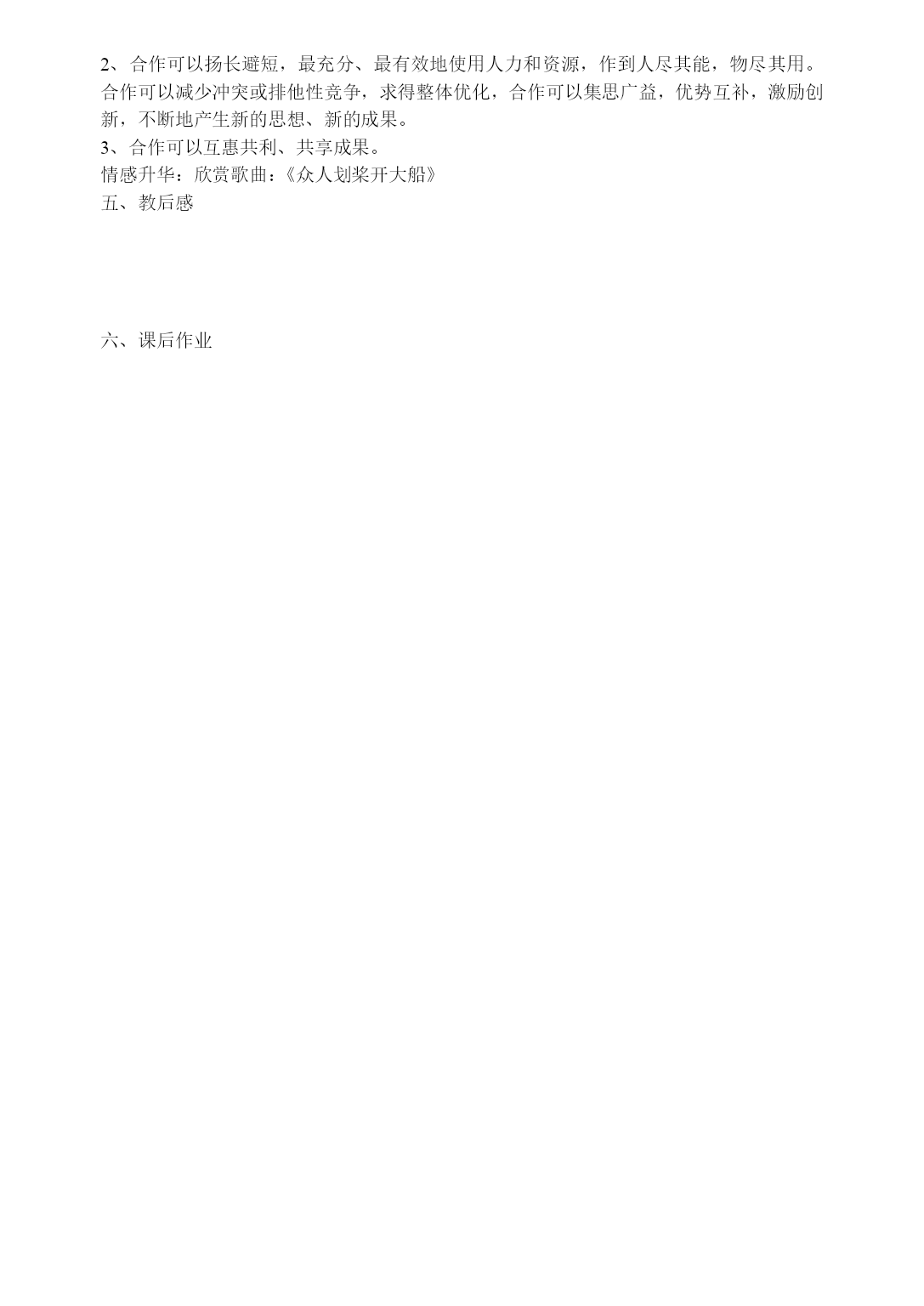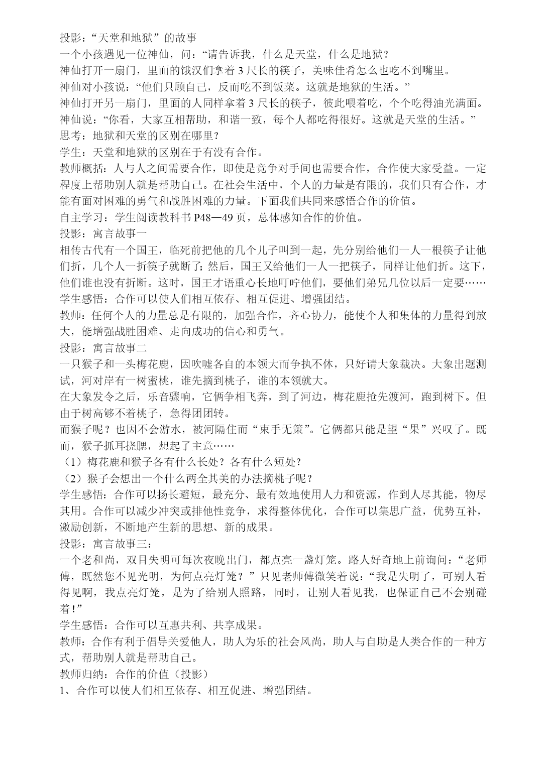 学科政治课题生活处处有合作第1课时教案序号:11主备人陈慧琴年级九备课时间9.22上课时间审核人一、教学目标1.了解合作的原因、含义。2.理解合作的作用和意义。二、教学重点感悟合作价值教学难点:合作产生的原因三、课前准备:课件四、教学过程导入:漫画赏析思考:这两幅漫画对你有什么启示?学生:回答,略教师:学会合作。乐于合作、善于合作是现代人应该具备的一种基本素质。投影:四幅图片思考:这四幅图片说明了什么?学生:回答,略教师:人是社会的人,总是生活在一定的社会关系中。每个人的成长、发展以及各种需要的满足都离不开与他人的交往与合作,生活处处有合作。讲授新课:一、生活处处有合作合作探究:学生阅读教科书P47材料“制针过程”,探究:1.制针工效提高的奥秘是什么?2.生活中这样的事例很多,请举一例说明。学生:讨论、交流,略。教师讲授:因为分工使每个人只从事自己相对熟悉的生产工序,便于积累经验、节省时间;同时在合作中又会形成你追我赶的竞争态势,这有利于提高劳动生产率,节省原材料,降低生产成本,提高市场竞争力。追问:请大家思考一下,如果中间少了一两个人,还行吗?学生:肯定不行,需要人加以合作。自主学习:学生阅读教科书P47页,解决下列问题:1.合作的原因是什么?2.合作与分工的关系怎样?3.合作的含义是什么?学生:阅读教科书,交流略。教师:讲解合作的含义,把握四层意思:第一,合作的目的(共同目标);第二,合作的要求(相互配合,相互协作);第三,合作的过程(进行的一种有意义的活动);第四,合作的结果(有利于合作的各方)。投影:“天堂和地狱”的故事一个小孩遇见一位神仙,问:“请告诉我,什么是天堂,什么是地狱?神仙打开一扇门,里面的饿汉们拿着3尺长的筷子,美味佳肴怎么也吃不到嘴里。神仙对小孩说:“他们只顾自己,反而吃不到饭菜。这就是地狱的生活。”神仙打开另一扇门,里面的人同样拿着3尺长的筷子,彼此喂着吃,个个吃得油光满面。神仙说:“你看,大家互相帮助,和谐一致,每个人都吃得很好。这就是天堂的生活。”思考:地狱和天堂的区别在哪里?学生:天堂和地狱的区别在于有没有合作。教师概括:人与人之间需要合作,即使是竞争对手间也需要合作,合作使大家受益。一定程度上帮助别人就是帮助自己。在社会生活中,个人的力量是有限的,我们只有合作,才能有面对困难的勇气和战胜困难的力量。下面我们共同来感悟合作的价值。自主学习:学生阅读教科书P48—49页,总体感知合作的价值。投影:寓言故事一相传古代有一个国王,临死前把他的几个儿子叫到一起,先分别给他们一人一根筷子让他们折,几个人一折筷子就断了;然后,国王又给他们一人一把筷子,同样让他们折。这下,他们谁也没有折断。这时,国王才语重心长地叮咛他们,要他们弟兄几位以后一定要……学生感悟:合作可以使人们相互依存、相互促进、增强团结。教师:任何个人的力量总是有限的,加强合作,齐心协力,能使个人和集体的力量得到放大,能增强战胜困难、走向成功的信心和勇气。投影:寓言故事二一只猴子和一头梅花鹿,因吹嘘各自的本领大而争执不休,只好请大象裁决。大象出题测试,河对岸有一树蜜桃,谁先摘到桃子,谁的本领就大。在大象发令之后,乐音骤响,它俩争相飞奔,到了河边,梅花鹿抢先渡河,跑到树下。但由于树高够不着桃子,急得团团转。而猴子呢?也因不会游水,被河隔住而“束手无策”。它俩都只能是望“果”兴叹了。既而,猴子抓耳挠腮,想起了主意……(1)梅花鹿和猴子各有什么长处?各有什么短处?(2)猴子会想出一个什么两全其美的办法摘桃子呢?学生感悟:合作可以扬长避短,最充分、最有效地使用人力和资源,作到人尽其能,物尽其用。合作可以减少冲突或排他性竞争,求得整体优化,合作可以集思广益,优势互补,激励创新,不断地产生新的思想、新的成果。投影:寓言故事三:一个老和尚,双目失明可每次夜晚出门,都点亮一盏灯笼。路人好奇地上前询问:“老师傅,既然您不见光明,为何点亮灯笼?”只见老师傅微笑着说:“我是失明了,可别人看得见啊,我点亮灯笼,是为了给别人照路,同时,让别人看见我,也保证自己不会别碰着!”学生感悟:合作可以互惠共利、共享成果。教师:合作有利于倡导关爱他人,助人为乐的社会风尚,助人与自助是人类合作的一种方式,帮助别人就是帮助自己。教师归纳:合作的价值(投影)1、合作可以使人们相互依存、相互促进、增强团结。2、合作可以扬长避短,最充分、最有效地使用人力和资源,作到人尽其能,物尽其用。合作可以减少冲突或排他性竞争,求得整体优化,合作可以集思广益,优势互补,激励创新,不断地产生新的思想、新的成果。3、合作可以互惠共利、共享成果。情感升华:欣赏歌曲:《众人划桨开大船》五、教