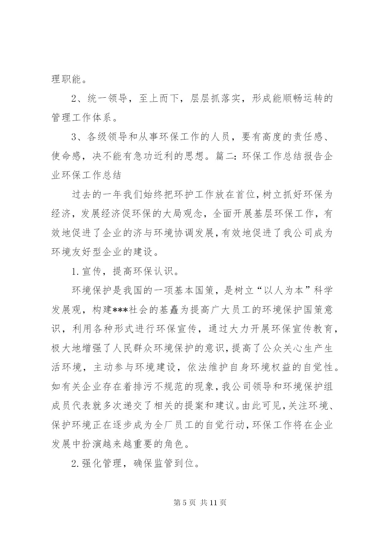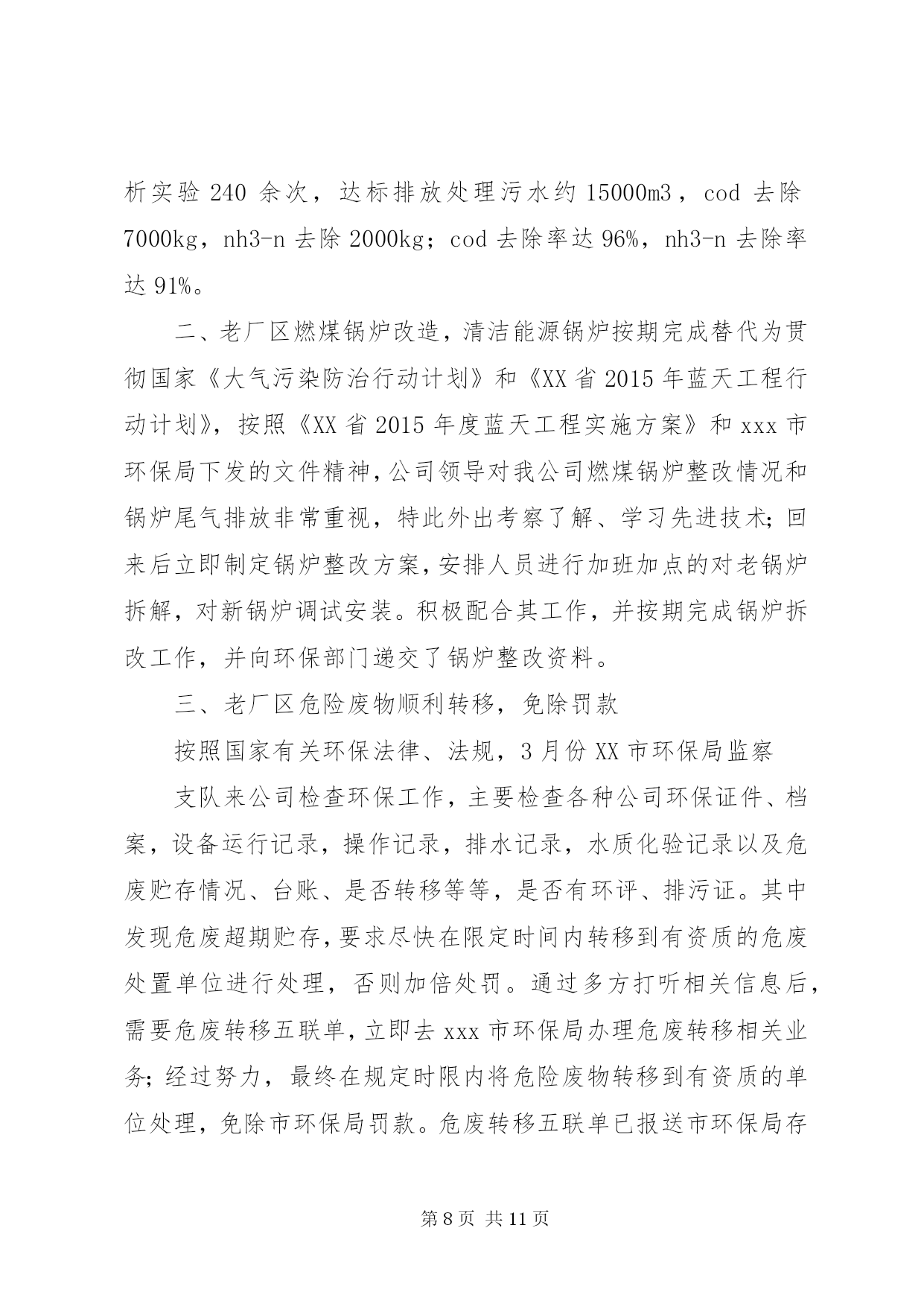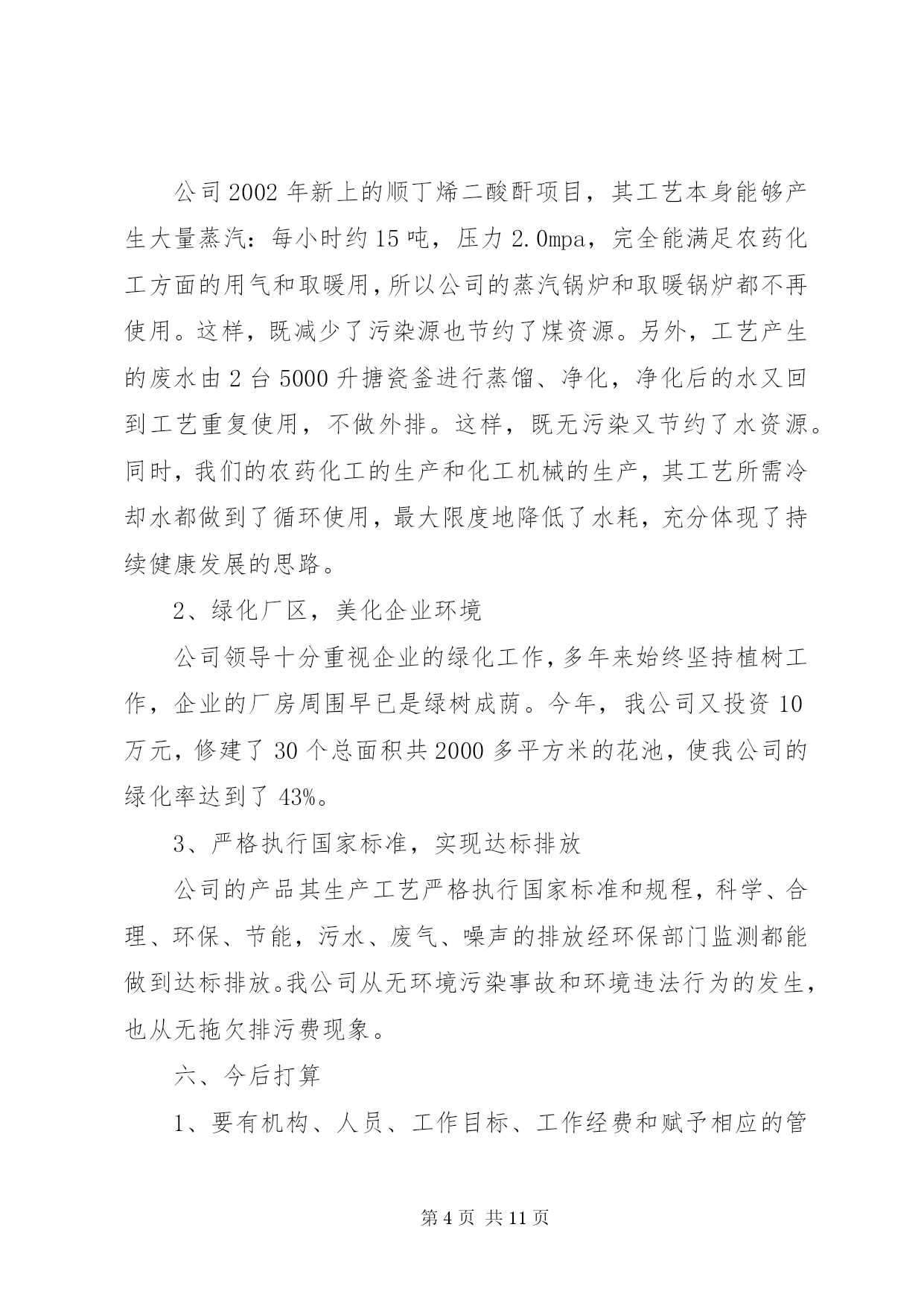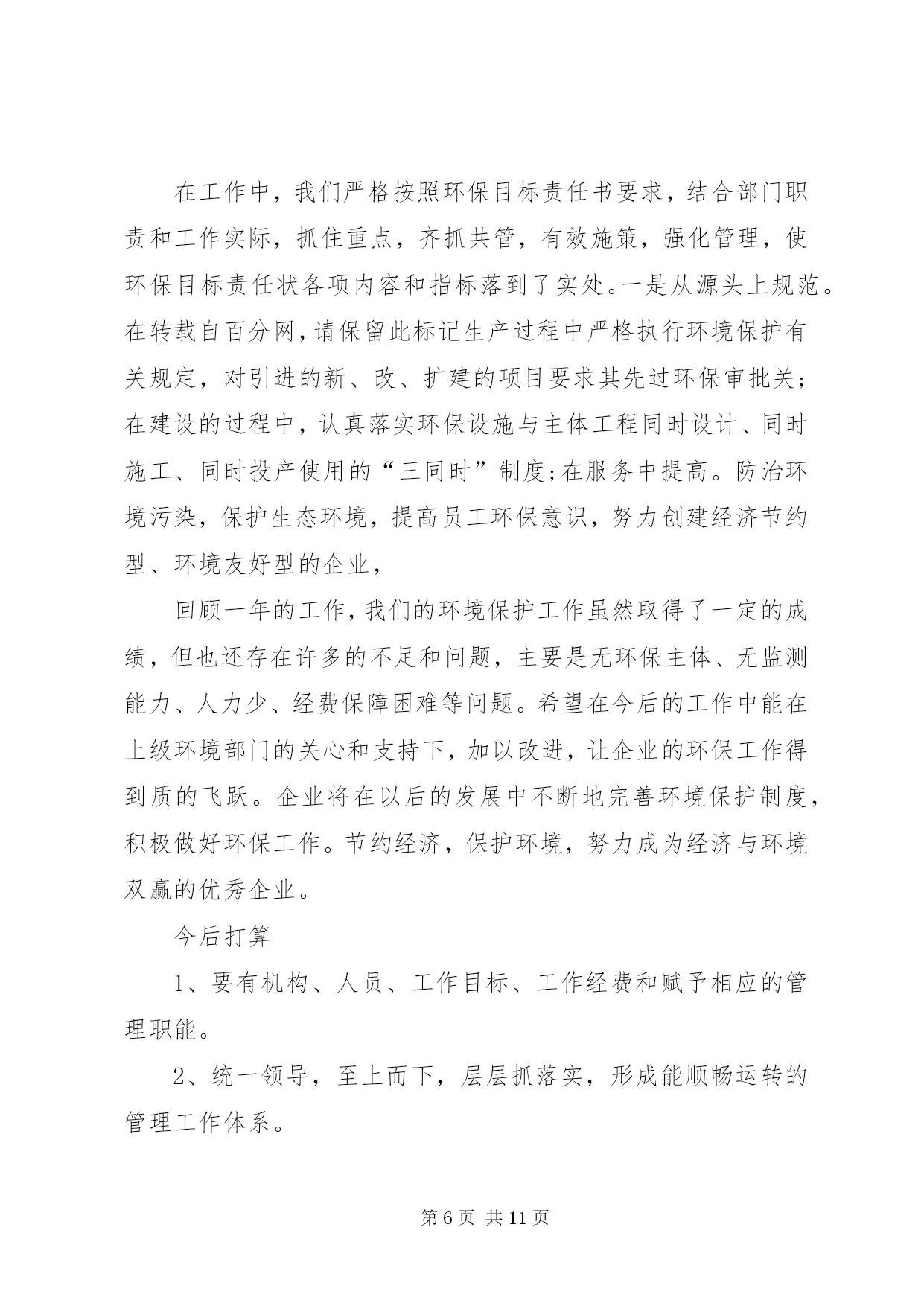 第PAGE\*Arabic\*MERGEFORMAT11页共NUMPAGES\*MERGEFORMAT11页企业年度环保工作总结篇一:公司环境保护工作总结公司环境保护工作总结严格遵守国家法律法规切实做好环境保护工作我们公司于1999年10月成立,其前身为XX县区司家河煤矿,主要生产原煤,生产规模45万吨/年,我们在狠抓经济建设的同时,更时刻没忘狠抓环保工作,下面把我们的环保工作做一总结汇报如下:一、组织机构我公司自1999年以来,就十分重视环保工作,当时虽没有成立正式的环保管理组织机构,但也明确了由主抓后勤工作的副厂长分管环保工作。随着企业的发展,于2011年1月正式司家河煤业有限公司环保领导小组,由公司办公室主任任组长,成员由各科室(队)等部门负责人以及技术员组成,并确定了相关职责。公司领导班子每季度组织召开一次环保工作调度会,听取环保工作汇报研究环保工作,并做出相应部署,使我们的环保工作能够有序进行。二、环保规划与规章制度1、在对公司的污染源进行调查明确的基础上,2011年由公司环保领导小组组织编制了司家河煤业有限公司环保2010年环保规划。各部门和有的制定了实施公司环保规划的行动计划,有的制定了本部门、本车间的中长期环保规划,有的在部门工作发展规划中专门编制了环保和可持续发展篇章。2、为深入贯彻实施国家和化工行业有关的环保法律法规,结合我公司环境保护管理的实际,在充分调查研究的基础上,制定了《XX县区鸿承企业有限公司环境保护管理暂行规定》,明确了职责,规范了管理。三、环境影响评价与“三同时”1、企业新上的重点建设项目的环境影响评价率达到100%。与此同时,在环评质量上,通过多次与环评单位交流、座谈,提出改进意见,在保护目标和保护重点的准确性、环保措施的针对性和实用性、环境监测监理和管理计划的科学性及可操作性等方面都得到明显提高。2、坚持环境保护从源头抓起,“三同时”管理中特别注重了建设在设计阶段和施工期的环境保护。在设计阶段,新上建设项目初步设计文件中均有环境保护篇。2002年公司新上的顺丁烯二酸酐项目还做了专项环保设计和施工图设计,并请专家多次评议、修改、完善,使顺酐项目的环境影响报告书顺利取得XX市环保局批复,运营期经XX市环境监测站监测后并顺利通过沧州环保局的关于环保设施的竣工验收。在项目的实施过程中,我们主要从以下几个方面落实环保规定:一是根据环保设计要求制定环境保护行动计划、培训计划、监测监督计划和管理计划。二是对参与环境监测监督和管理的人员进行培训,确保其业务熟练、基础扎实。三是落实环保措施和制定环保管理制度,责任到人,加强操作规程管理,确保污染治理设施的正常运转。四是在项目开工后,进一步细化了环保措施,其中顺酐项目指挥部按废气的处理、废水的处理等多方面制定了细化措施。以上内容充分保证了各项环保方案和措施(对策)的落实。四、环保宣传与培训1、关于环保宣传从1997年起,每年的“六X8226;五”环境日都采取各种形式开展环境保护宣传活动,如张贴宣传标语,组织讲座、座谈会和交叉检查。近几年,在宣传的规模和深度上又有了较大提高,从开始的中层领导到各基层班组长。通过以上活动的开展,我公司干部员工的资源意识、环境意环境保护意识和自学保护环境的意识普遍增强。2、开展了多种形式的环保培训,在环保培训方面,主要做法有:集中式培训和现场操作相结合,走出去培训和请进来培训相结合,普及性培训和专题培训相结合。通过各种形式的培训工作,切实提高了广大干部员工的环保业务知识和技能。五、环保工作的几点成绩1、合理利用资源,降低能耗、水耗公司2002年新上的顺丁烯二酸酐项目,其工艺本身能够产生大量蒸汽:每小时约15吨,压力2.0mpa,完全能满足农药化工方面的用气和取暖用,所以公司的蒸汽锅炉和取暖锅炉都不再使用。这样,既减少了污染源也节约了煤资源。另外,工艺产生的废水由2台5000升搪瓷釜进行蒸馏、净化,净化后的水又回到工艺重复使用,不做外排。这样,既无污染又节约了水资源。同时,我们的农药化工的生产和化工机械的生产,其工艺所需冷却水都做到了循环使用,最大限度地降低了水耗,充分体现了持续健康发展的思路。2、绿化厂区,美化企业环境公司领导十分重视企业的绿化工作,多年来始终坚持植树工作,企业的厂房周围早已是绿树成荫。今年,我公司又投资10万元,修建了30个总面积共2000多平方米的花池,使我公司的绿化率达到了43%。3、严格执行国家标准,实现达标排放公司的产品其生产工艺严格执行国家标准和规程,科学、合理、环保、节能,污水、废气、噪声的排放经环保部门监测都能做到达标排放。我公司从无环境污染事故和环境违法行为的发生,也从无拖欠排污费现象。六、今后打算1、要有机构、人员、工作目标、工作经费和赋予相应的管理职能。2、统一领导,至